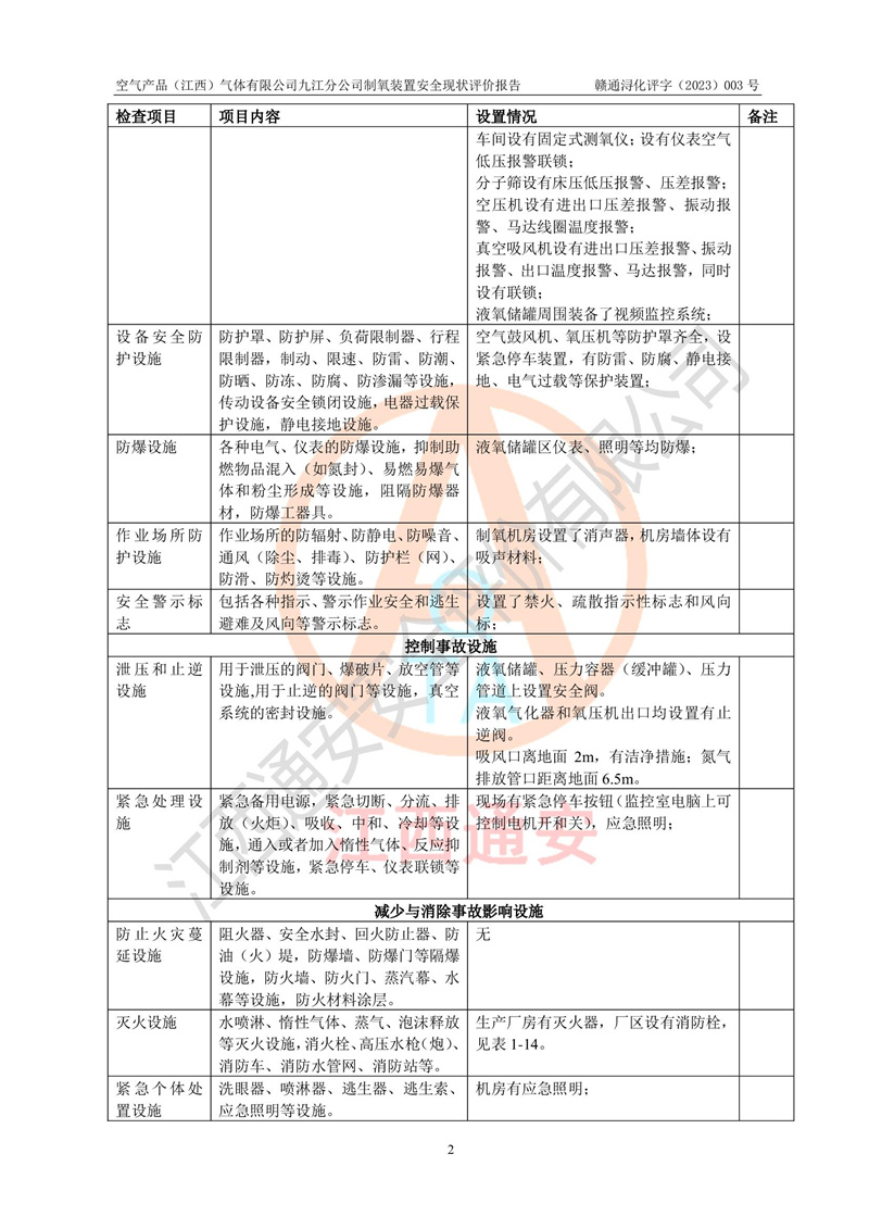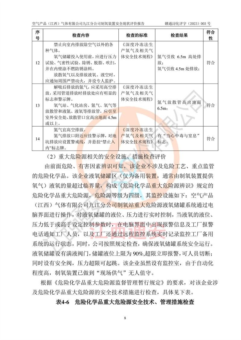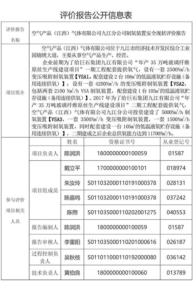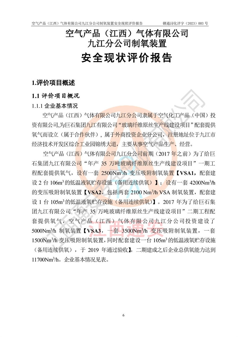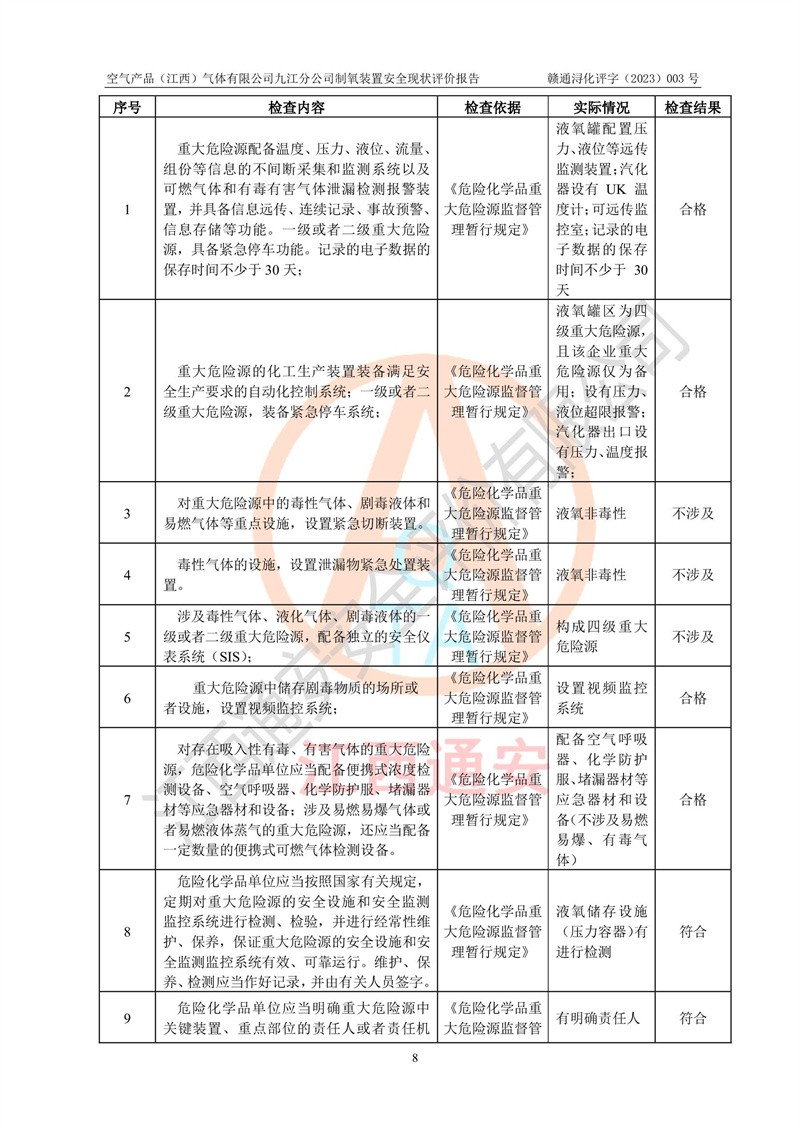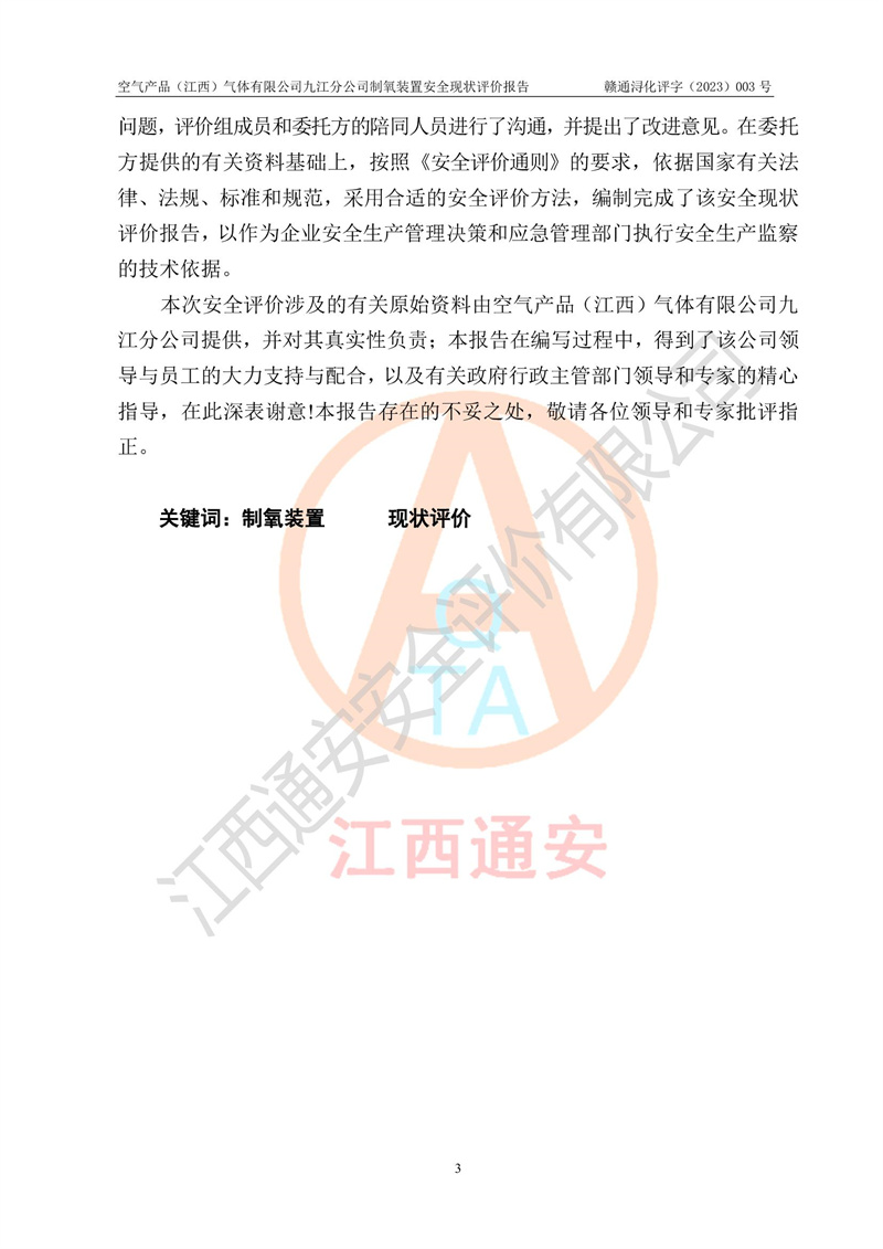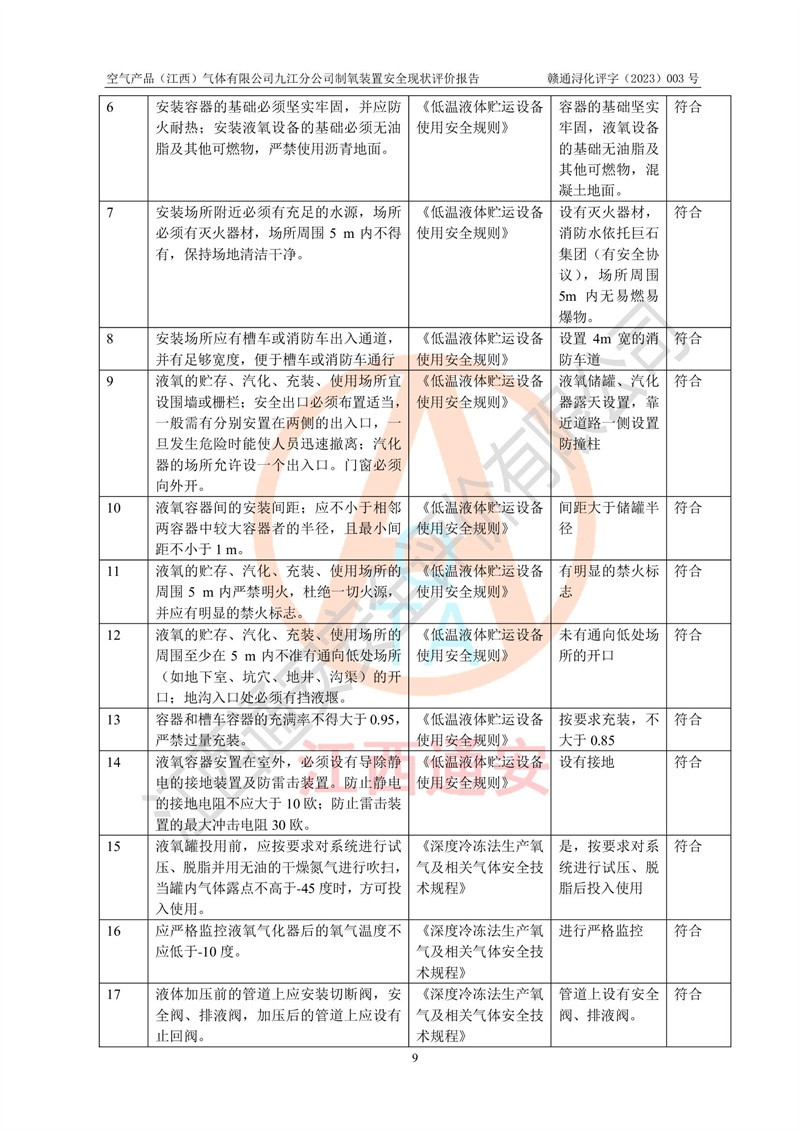 空氣產(chǎn)品(江西)氣體有限公司九江分公司制氧裝置安全現(xiàn)狀評價報告