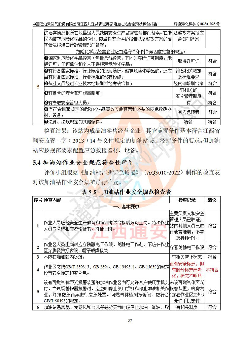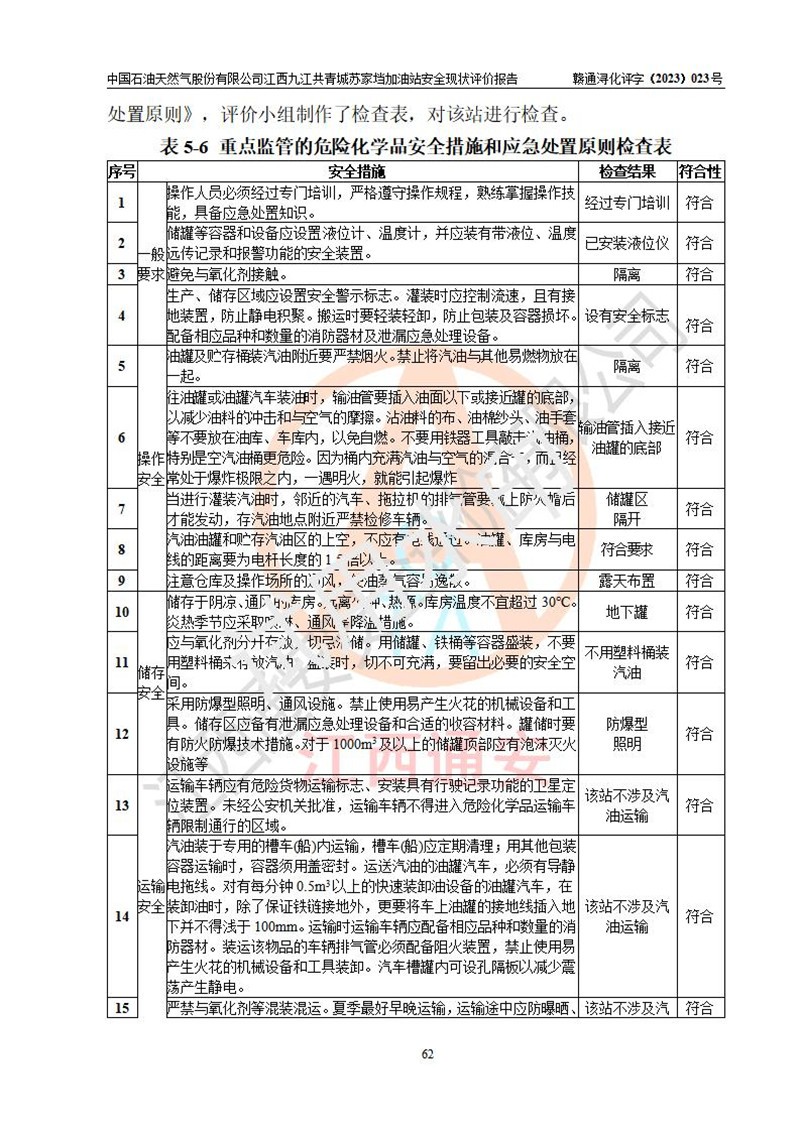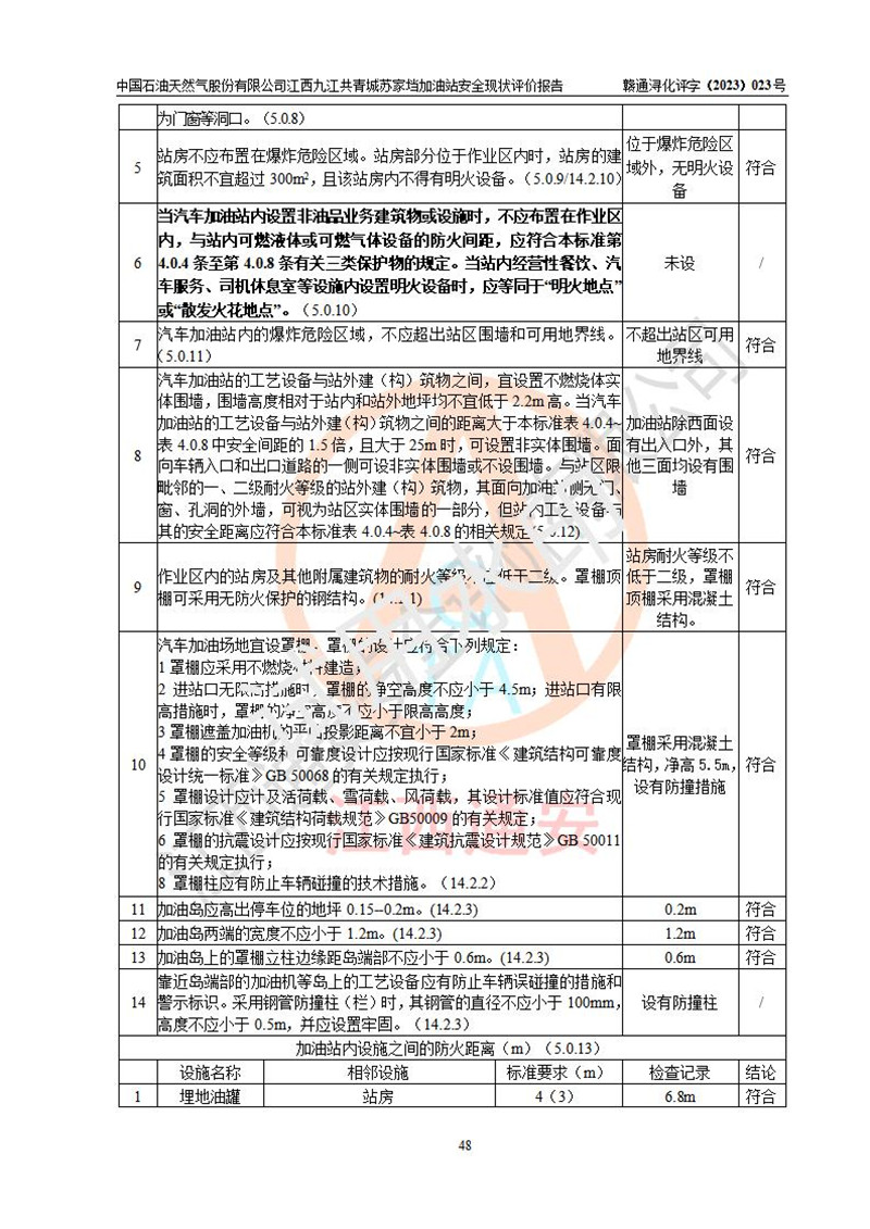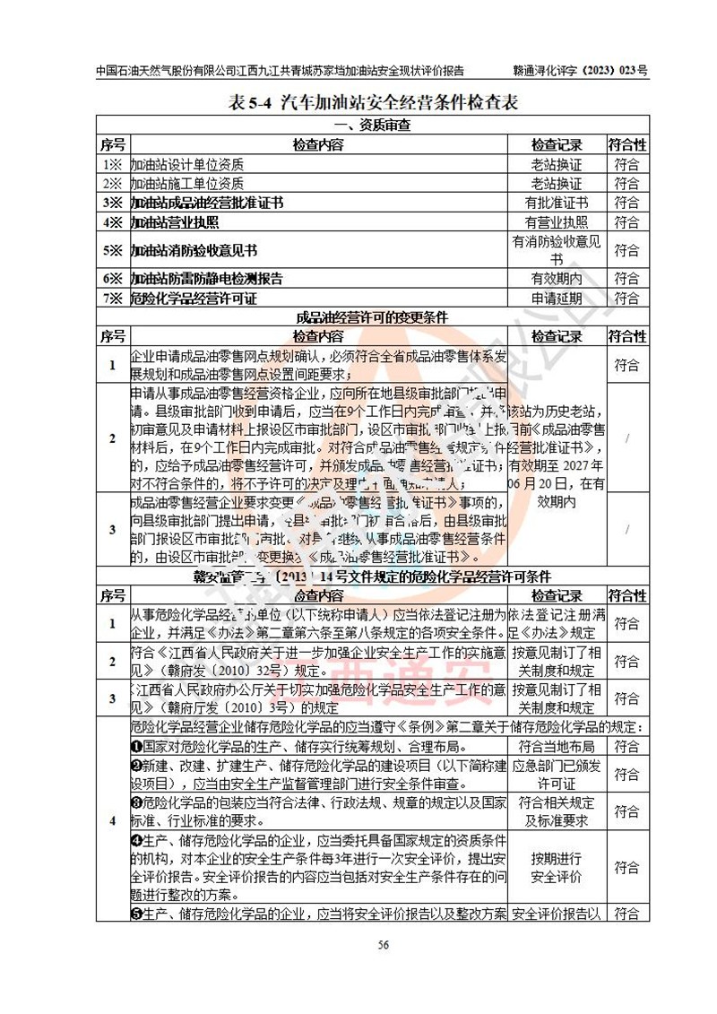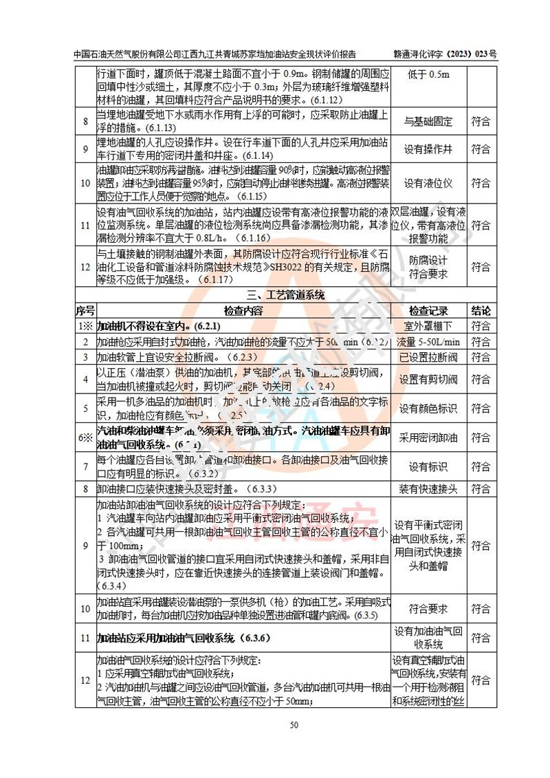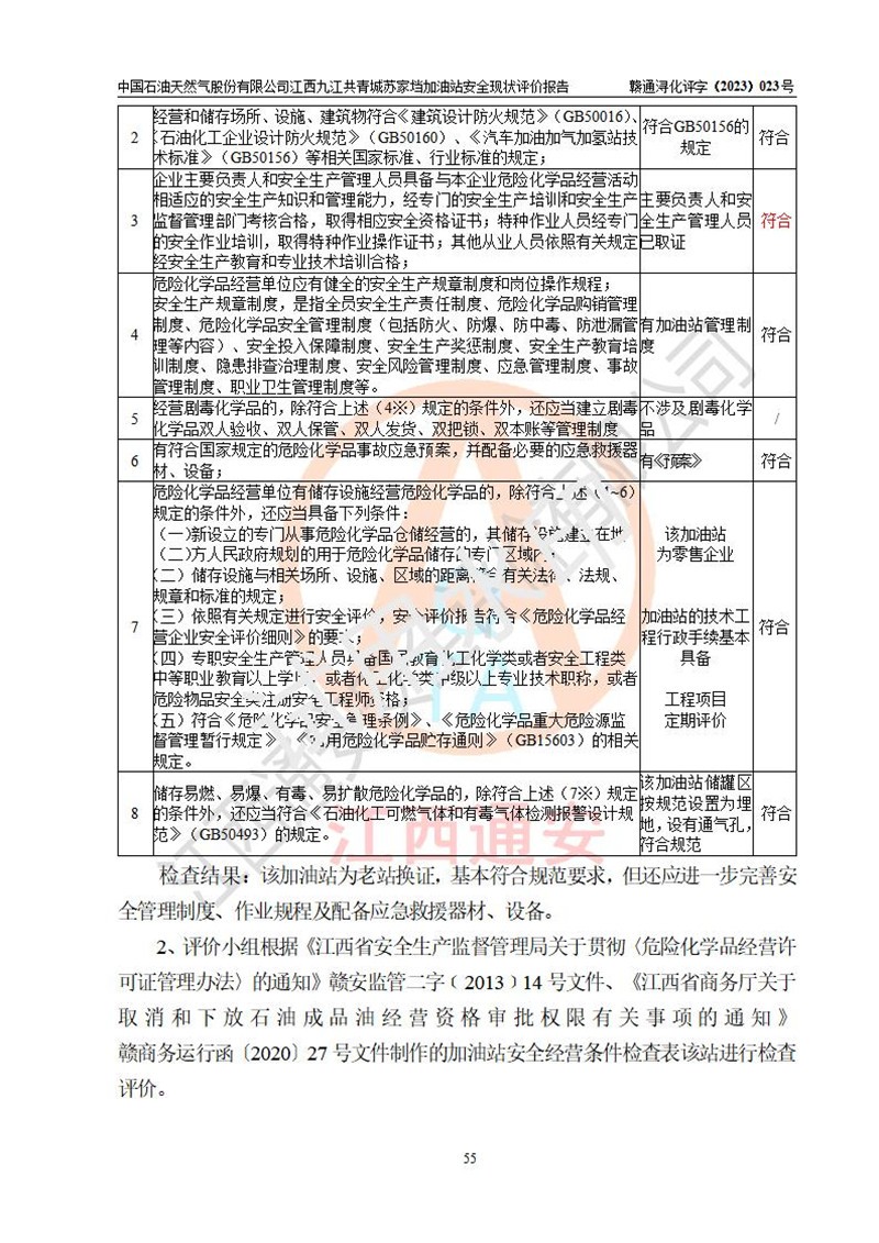 評價(jià)結(jié)論 | 中國石油天然氣股份有限公司江西九江共青城蘇家垱加油站涉及的安全條件、安全經(jīng)營條件、安全生產(chǎn)管理符合《危險(xiǎn)化學(xué)品經(jīng)營許可證管理辦法》、《汽車加油加氣加氫站技術(shù)標(biāo)準(zhǔn)》等**有關(guān)法規(guī)、標(biāo)準(zhǔn)、規(guī)范要求,能滿足危險(xiǎn)化學(xué)品經(jīng)營安全條件。 | |||