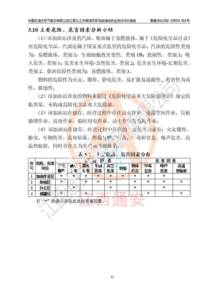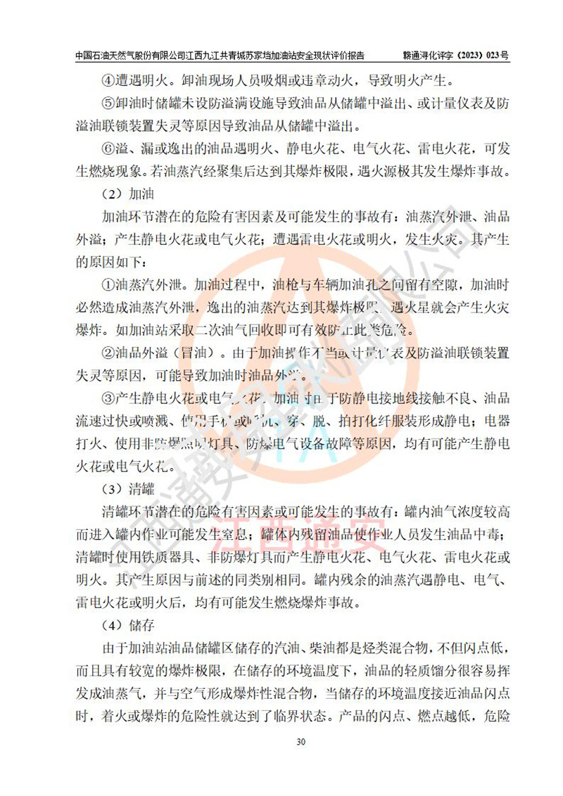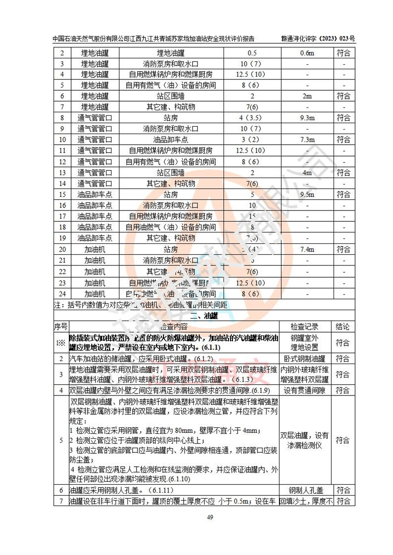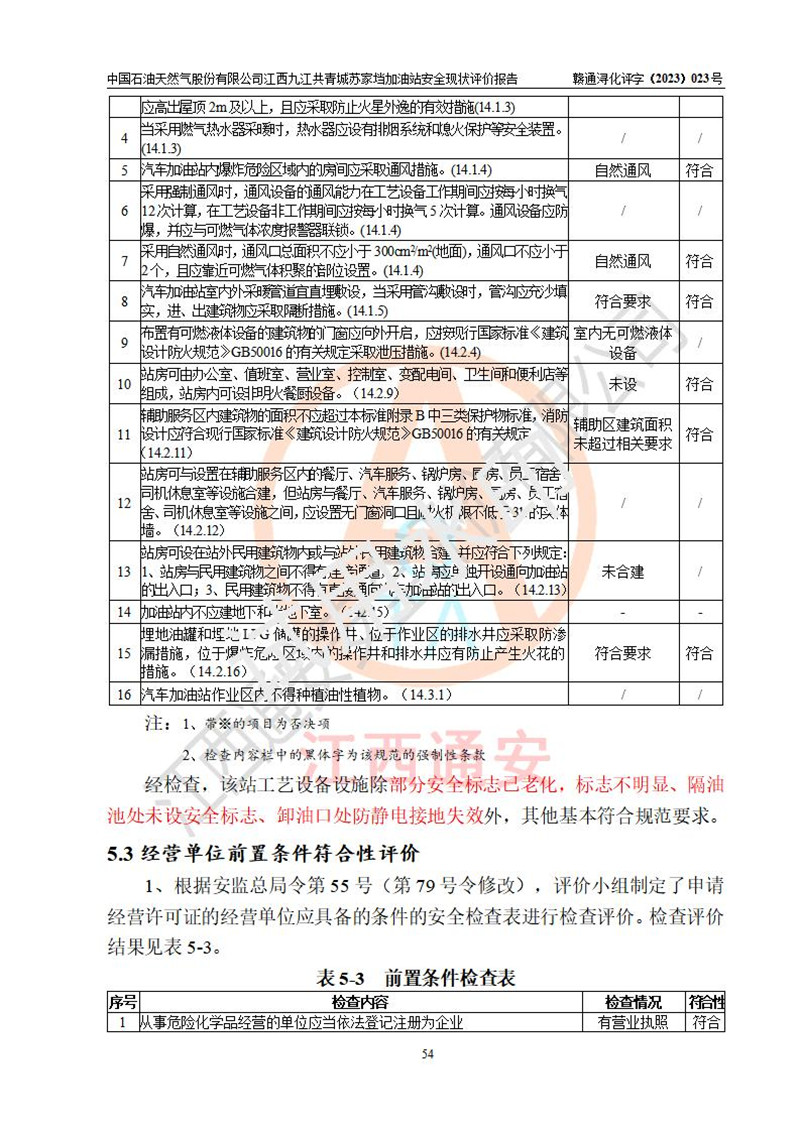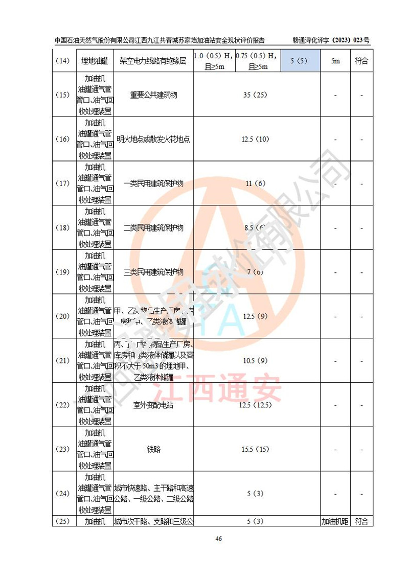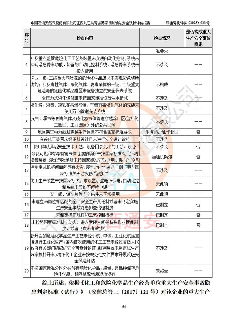 評價(jià)結(jié)論 | 中國石油天然氣股份有限公司江西九江共青城蘇家垱加油站涉及的安全條件、安全經(jīng)營條件、安全生產(chǎn)管理符合《危險(xiǎn)化學(xué)品經(jīng)營許可證管理辦法》、《汽車加油加氣加氫站技術(shù)標(biāo)準(zhǔn)》等**有關(guān)法規(guī)、標(biāo)準(zhǔn)、規(guī)范要求,能滿足危險(xiǎn)化學(xué)品經(jīng)營安全條件。 | |||