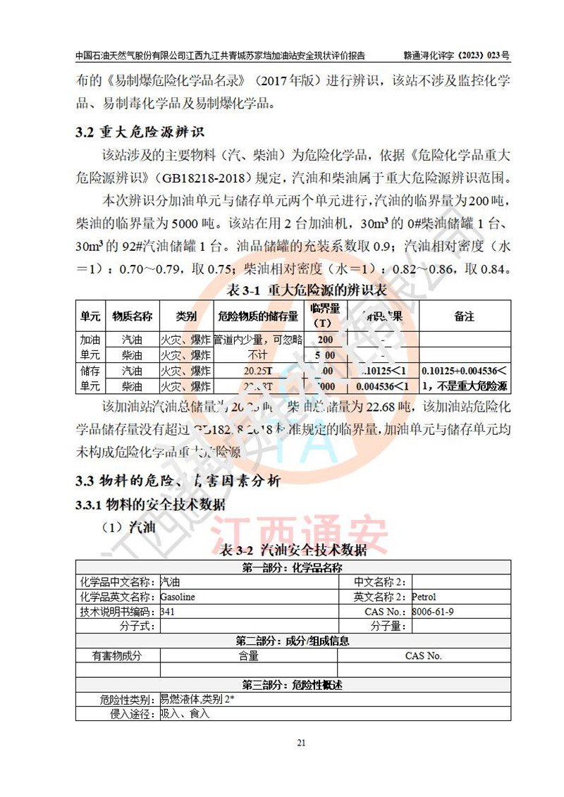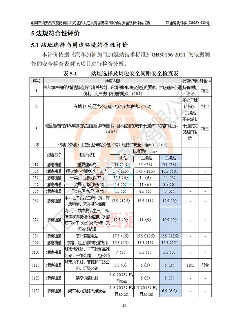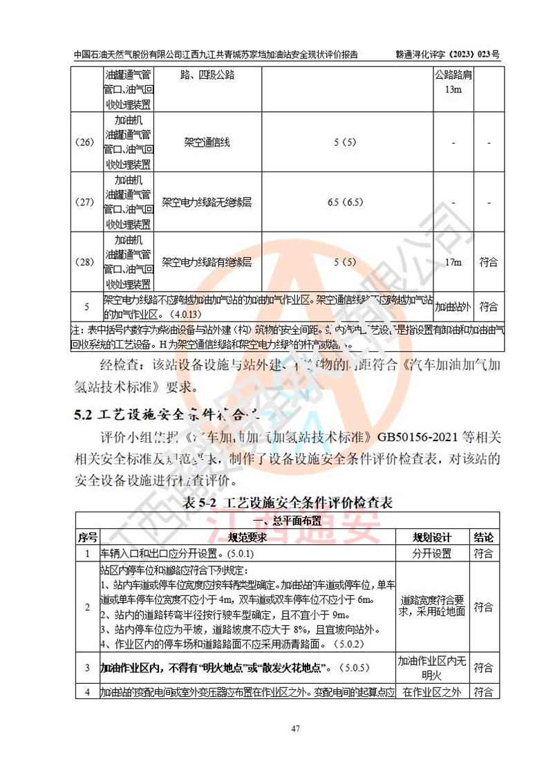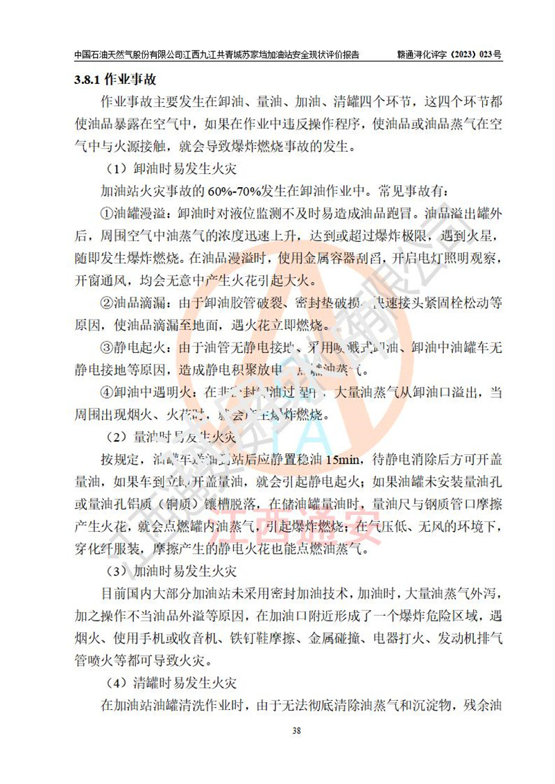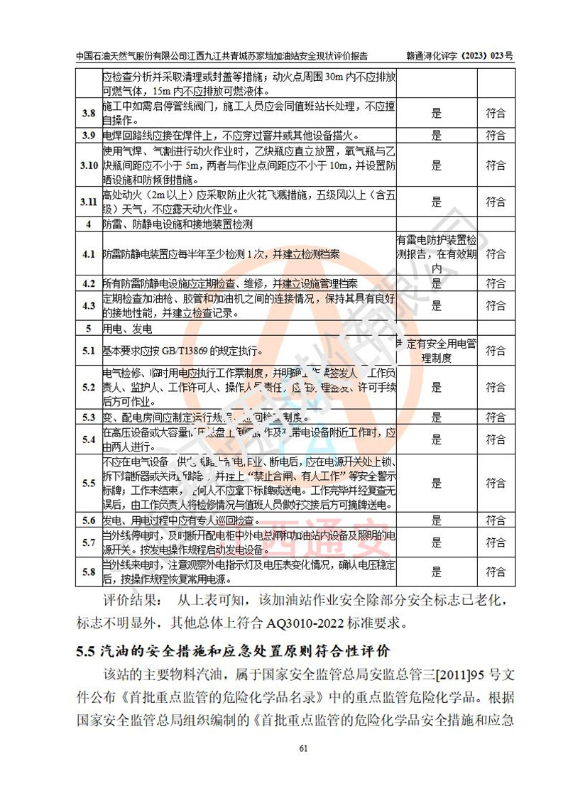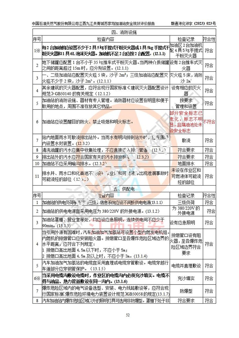 評價(jià)結(jié)論 | 中國石油天然氣股份有限公司江西九江共青城蘇家垱加油站涉及的安全條件、安全經(jīng)營條件、安全生產(chǎn)管理符合《危險(xiǎn)化學(xué)品經(jīng)營許可證管理辦法》、《汽車加油加氣加氫站技術(shù)標(biāo)準(zhǔn)》等**有關(guān)法規(guī)、標(biāo)準(zhǔn)、規(guī)范要求,能滿足危險(xiǎn)化學(xué)品經(jīng)營安全條件。 | |||