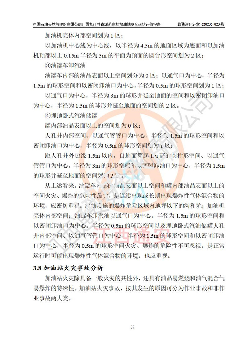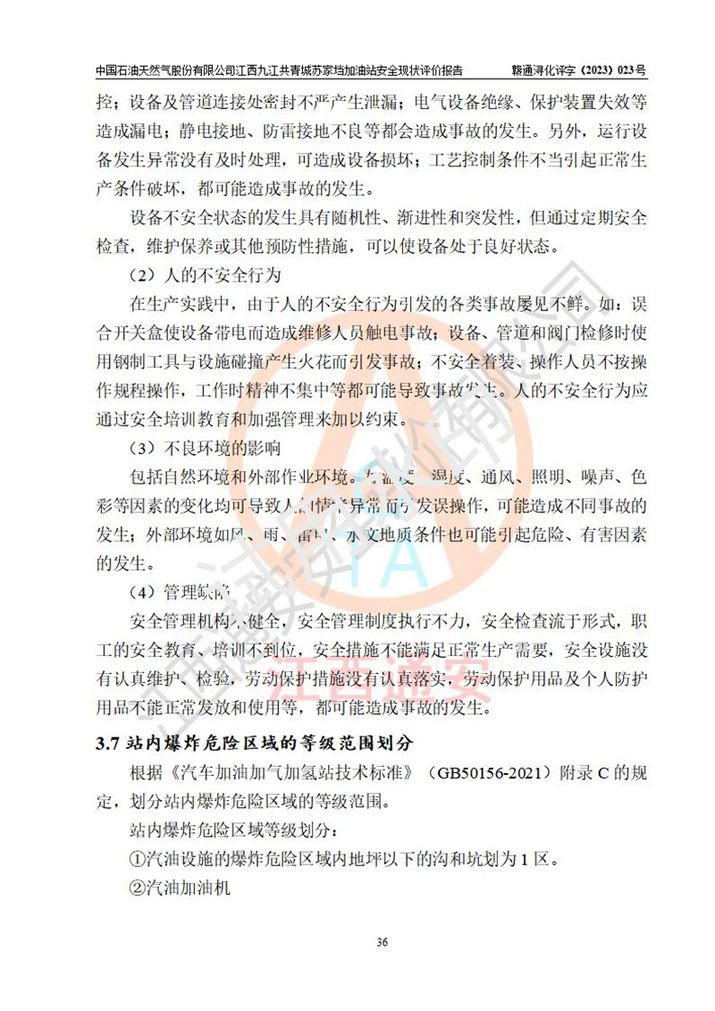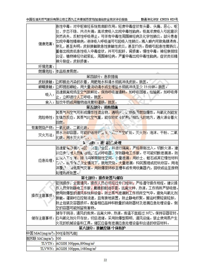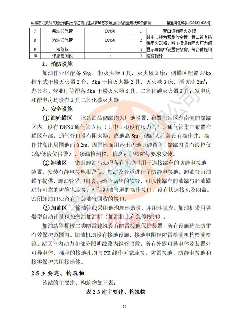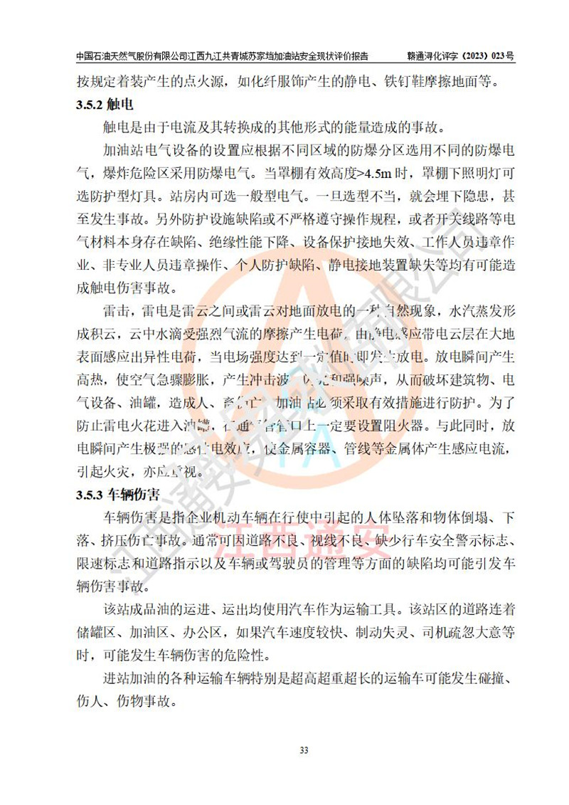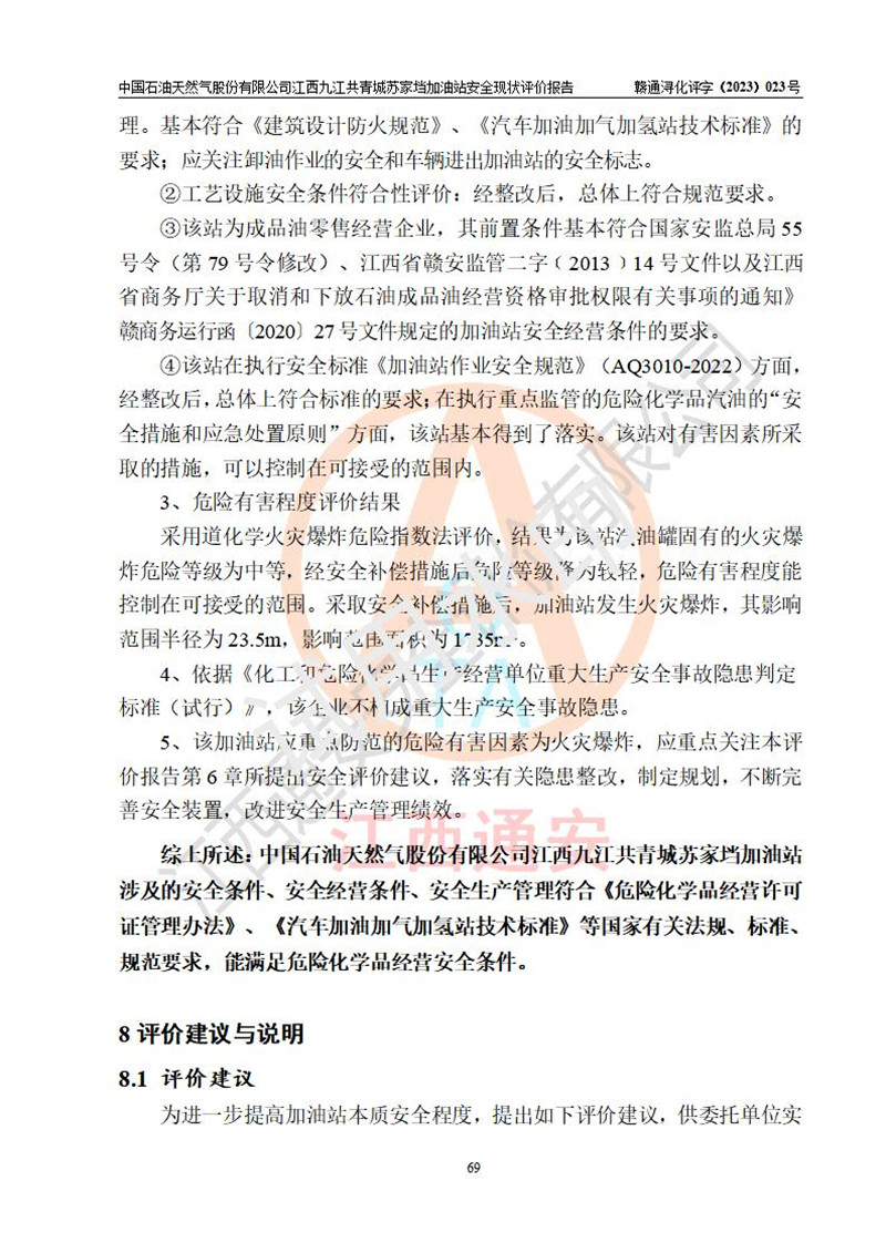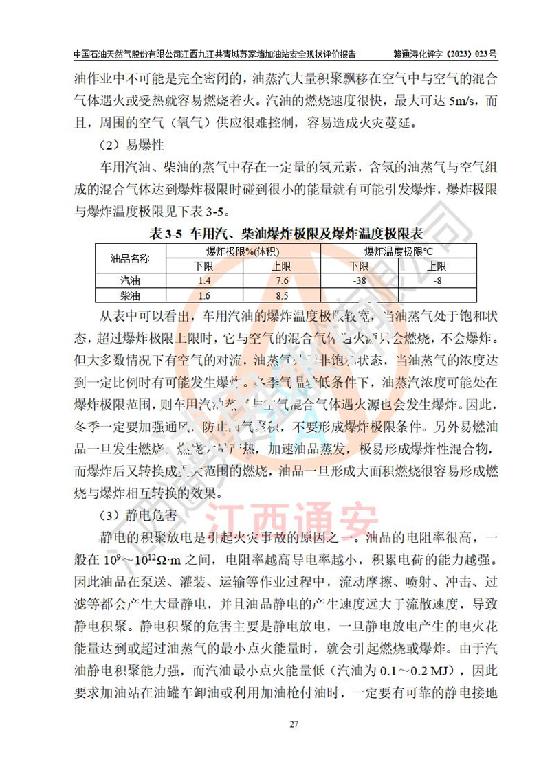 評價(jià)結(jié)論 | 中國石油天然氣股份有限公司江西九江共青城蘇家垱加油站涉及的安全條件、安全經(jīng)營條件、安全生產(chǎn)管理符合《危險(xiǎn)化學(xué)品經(jīng)營許可證管理辦法》、《汽車加油加氣加氫站技術(shù)標(biāo)準(zhǔn)》等**有關(guān)法規(guī)、標(biāo)準(zhǔn)、規(guī)范要求,能滿足危險(xiǎn)化學(xué)品經(jīng)營安全條件。 | |||