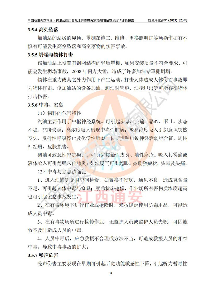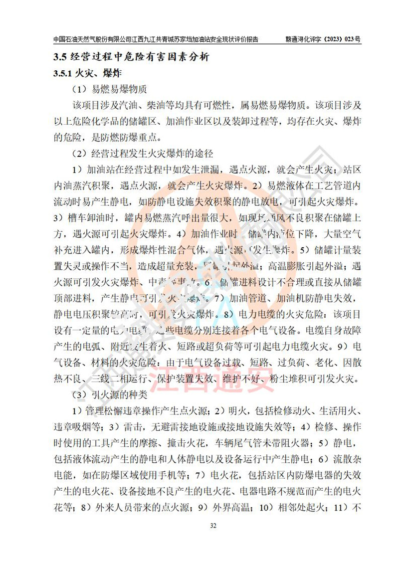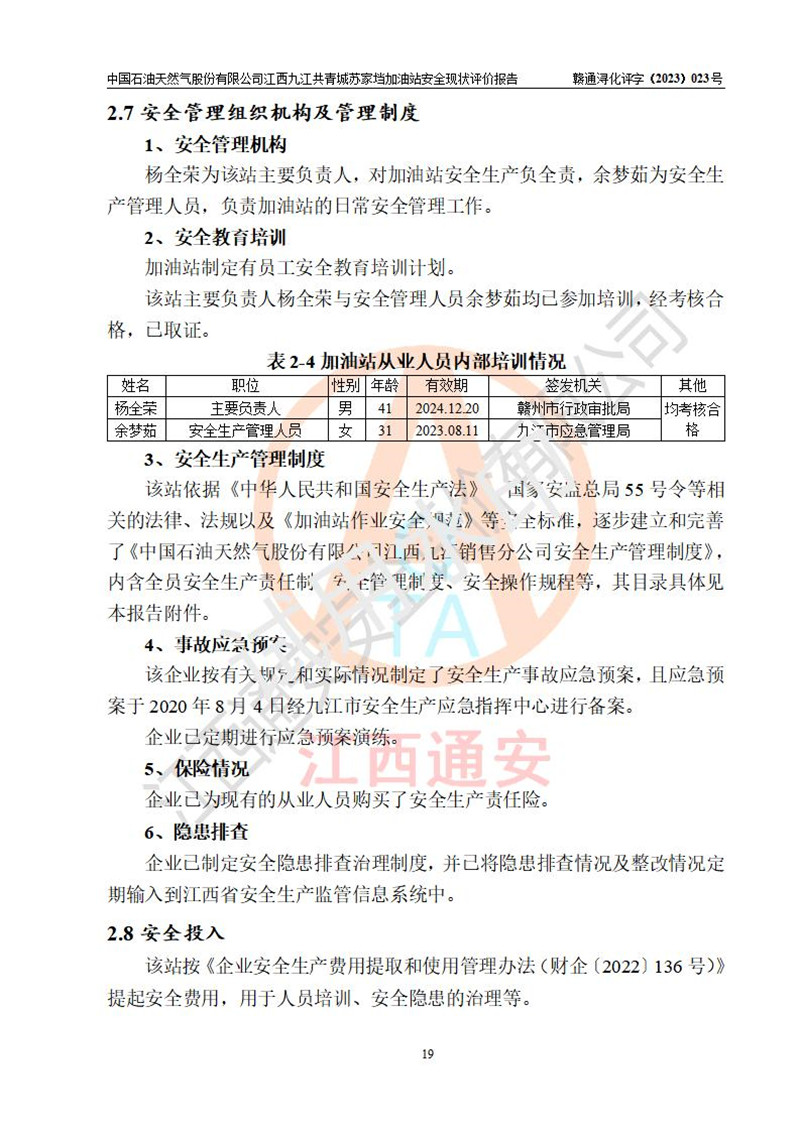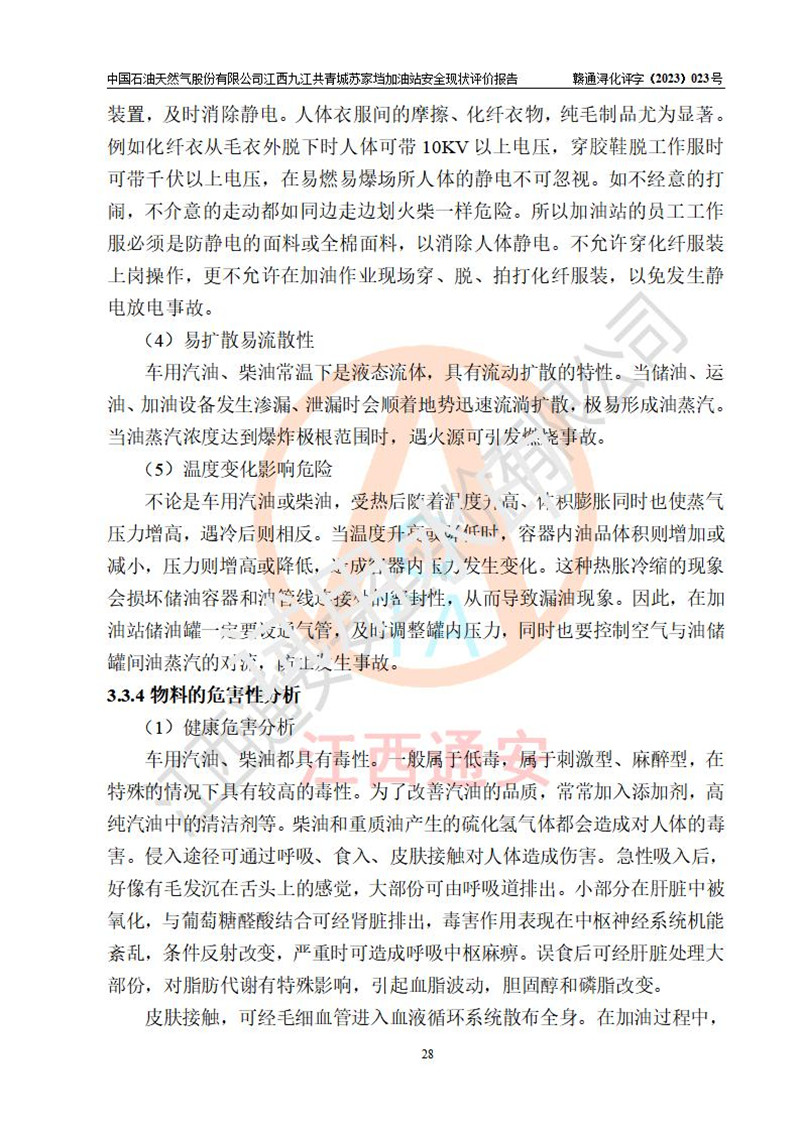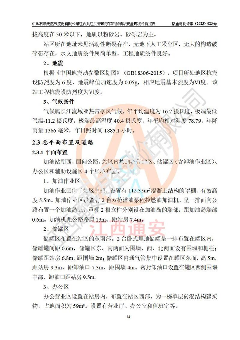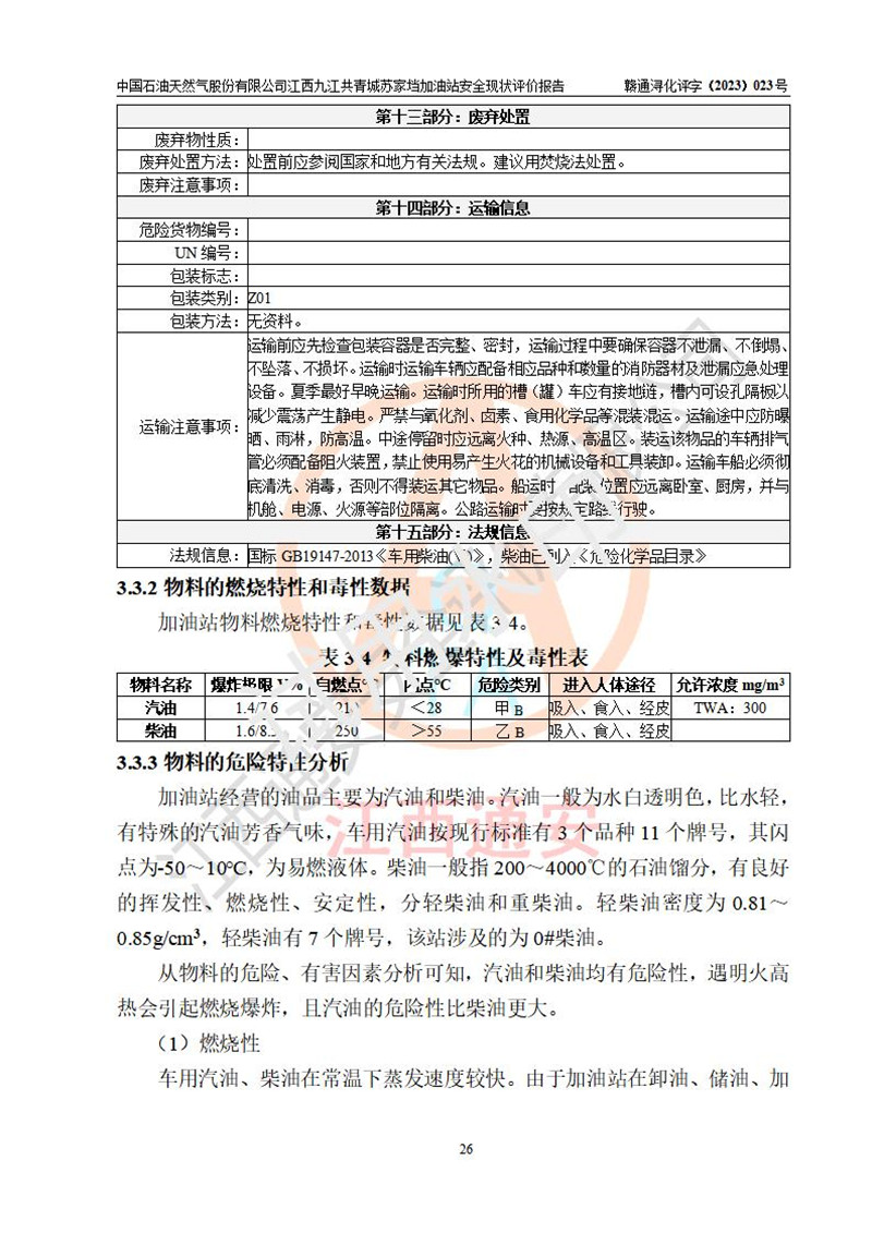 評價(jià)結(jié)論 | 中國石油天然氣股份有限公司江西九江共青城蘇家垱加油站涉及的安全條件、安全經(jīng)營條件、安全生產(chǎn)管理符合《危險(xiǎn)化學(xué)品經(jīng)營許可證管理辦法》、《汽車加油加氣加氫站技術(shù)標(biāo)準(zhǔn)》等**有關(guān)法規(guī)、標(biāo)準(zhǔn)、規(guī)范要求,能滿足危險(xiǎn)化學(xué)品經(jīng)營安全條件。 | |||