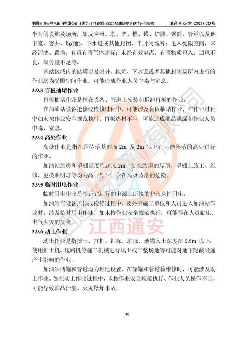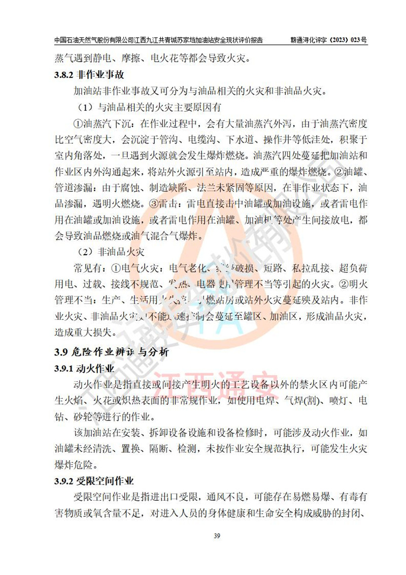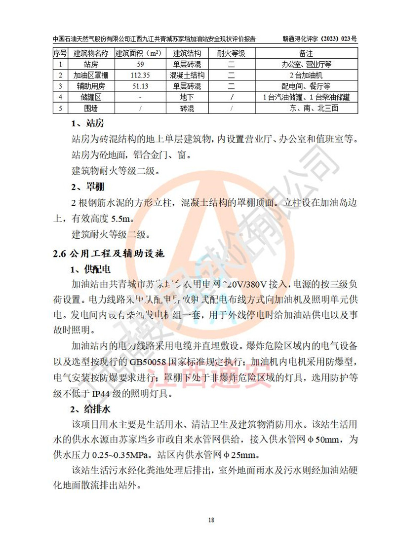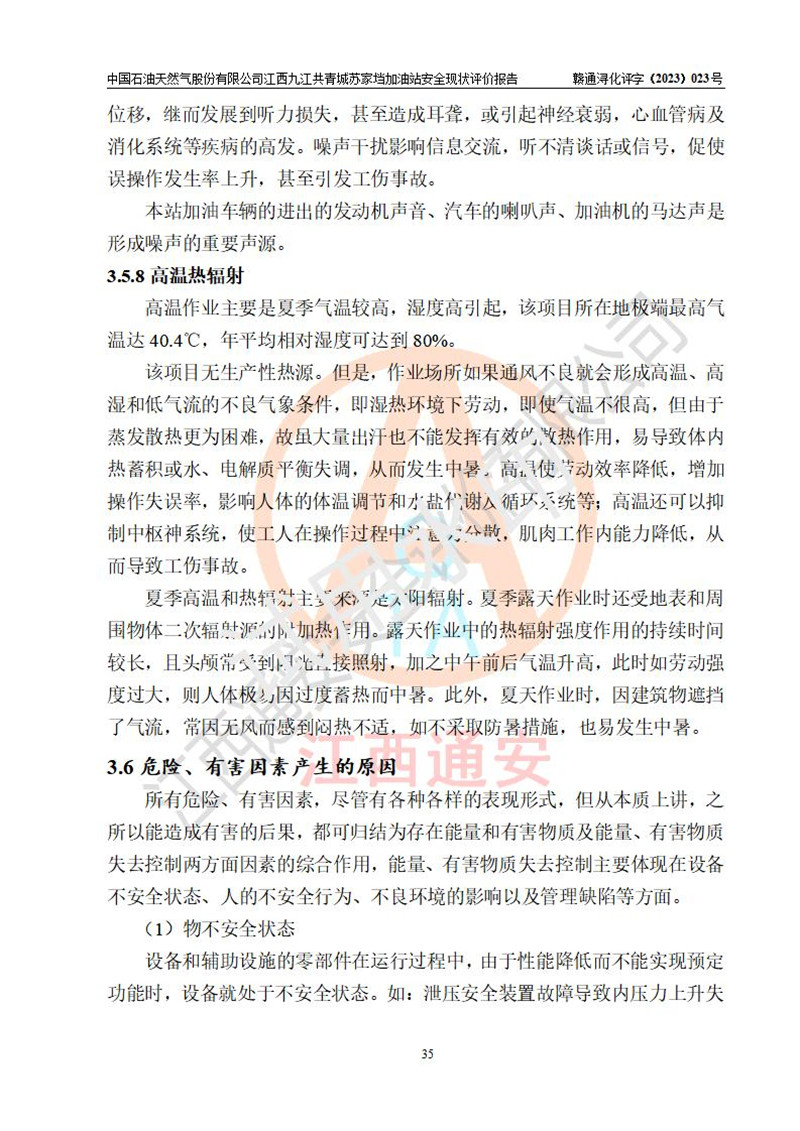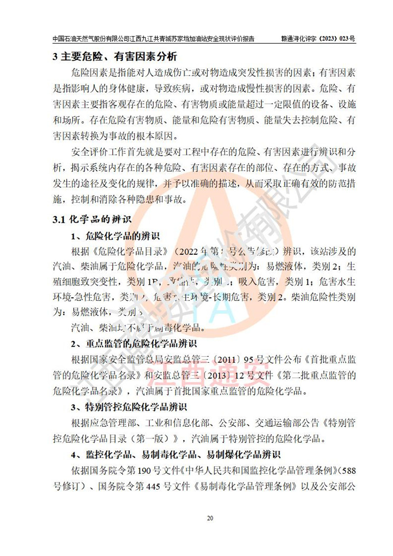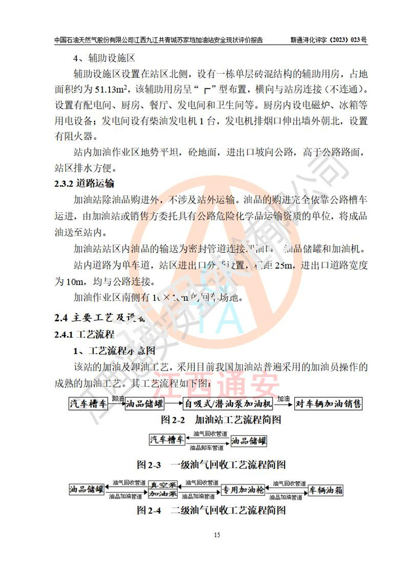 評價(jià)結(jié)論 | 中國石油天然氣股份有限公司江西九江共青城蘇家垱加油站涉及的安全條件、安全經(jīng)營條件、安全生產(chǎn)管理符合《危險(xiǎn)化學(xué)品經(jīng)營許可證管理辦法》、《汽車加油加氣加氫站技術(shù)標(biāo)準(zhǔn)》等**有關(guān)法規(guī)、標(biāo)準(zhǔn)、規(guī)范要求,能滿足危險(xiǎn)化學(xué)品經(jīng)營安全條件。 | |||
