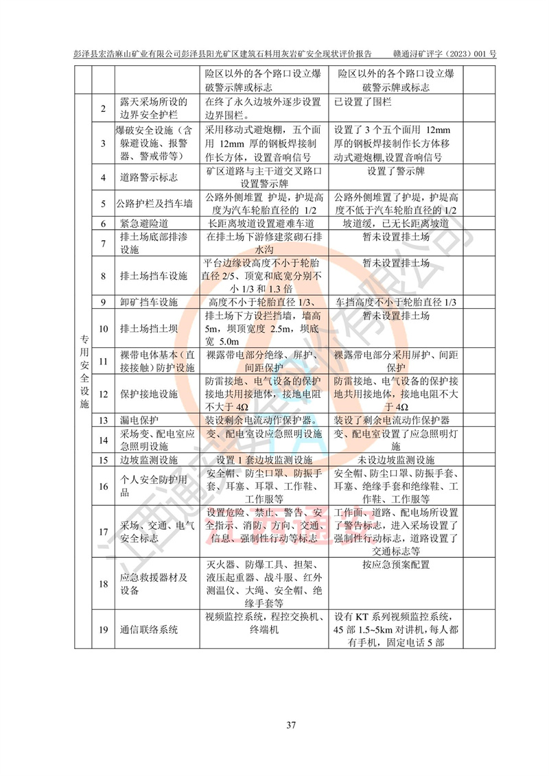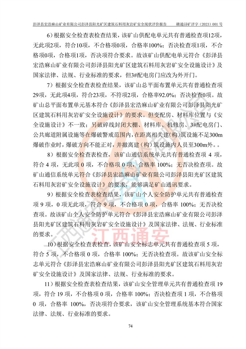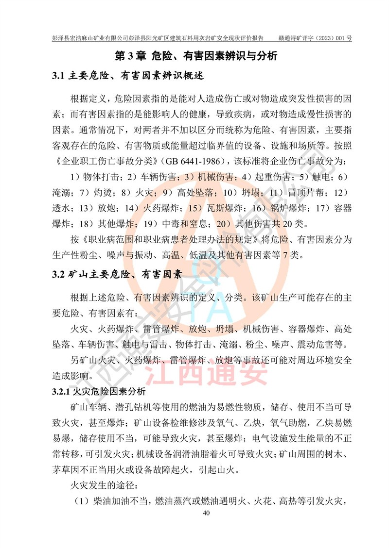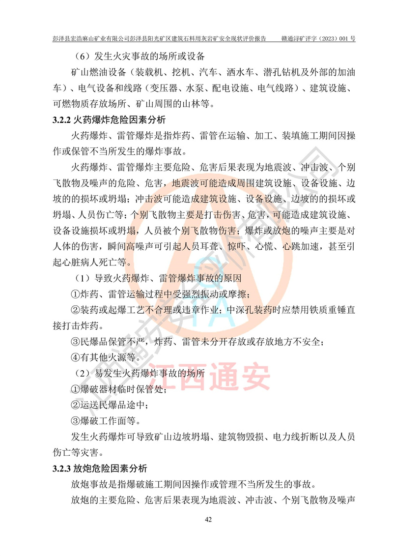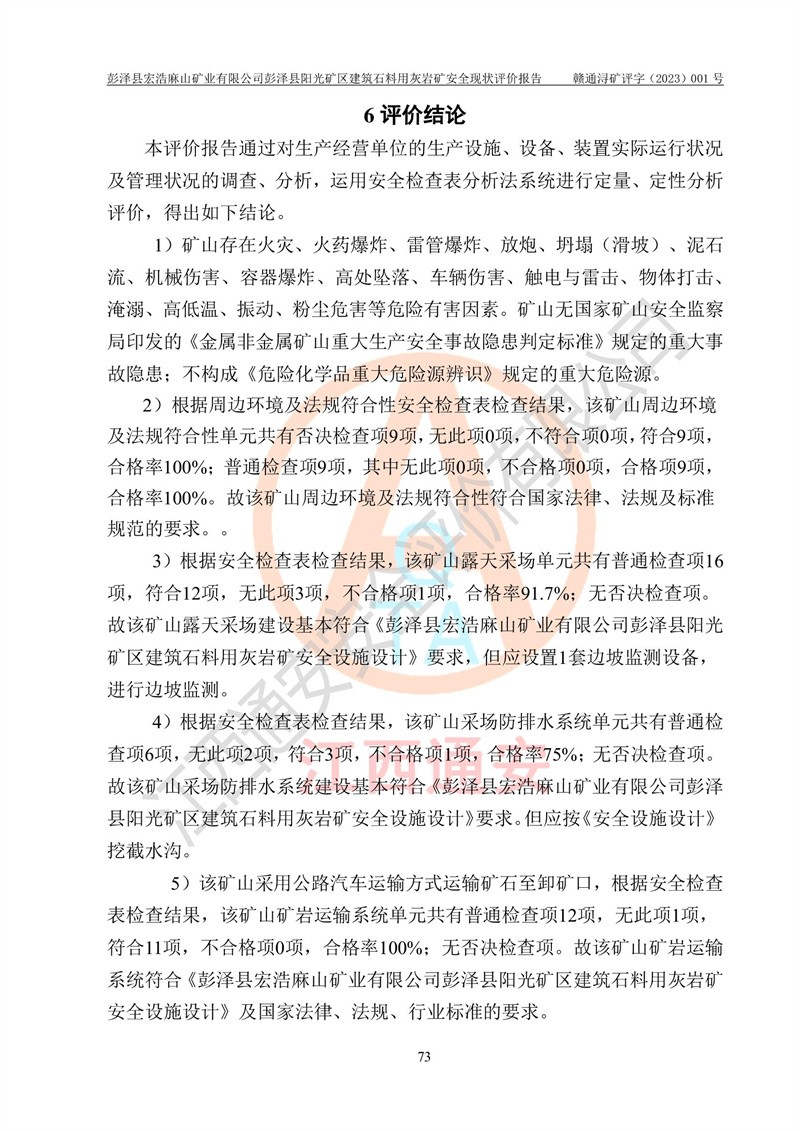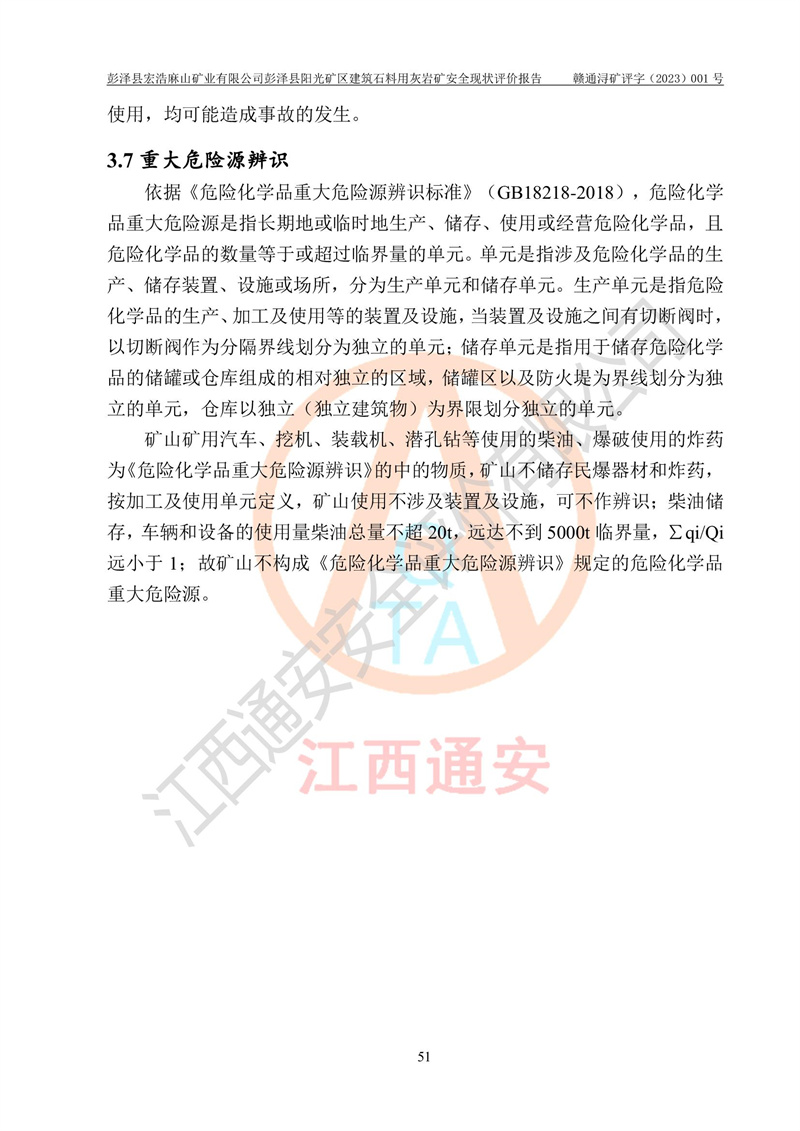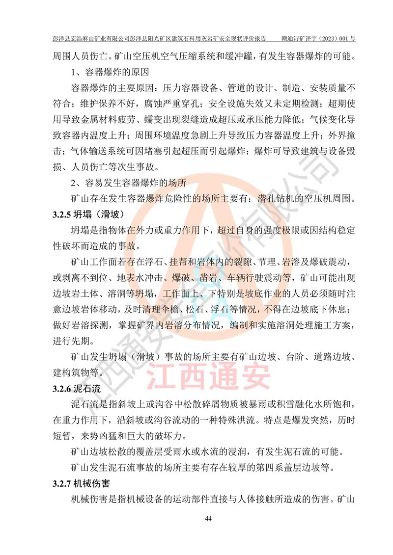 (1)礦山存在火災(zāi)、火藥爆炸、雷管爆炸、放炮、坍塌(滑坡)、泥石流、機械傷害、容器爆炸、高處墜落、**傷害、觸電與雷擊、物體打擊、淹溺、高低溫、振動、粉塵危害等危險有害因素。礦山無**礦山安全監(jiān)察局印發(fā)的《金屬非金屬礦山重大生產(chǎn)安全事故隱患判定標(biāo)準(zhǔn)》規(guī)定的重大事故隱患;不構(gòu)成《危險化學(xué)品重大危險源辨識》規(guī)定的重大危險源。 (2)礦山總體符合《彭澤縣宏浩麻山礦業(yè)有限公司彭澤縣陽光礦區(qū)建筑石料用灰?guī)r礦安全設(shè)施設(shè)計》和**安全生產(chǎn)法律、法規(guī)和行業(yè)標(biāo)準(zhǔn)、規(guī)范的要求。。 (3)礦山應(yīng)重點防范的重大危險有害因素有:坍塌、放炮、**傷害等。 總體結(jié)論:彭澤縣宏浩麻山礦業(yè)有限公司彭澤縣陽光礦區(qū)建筑石料用灰?guī)r礦周邊環(huán)境符合法規(guī)要求;安全設(shè)施總體符合《彭澤縣宏浩麻山礦業(yè)有限公司彭澤縣陽光礦區(qū)建筑石料用灰?guī)r礦安全設(shè)施設(shè)計》的要求,風(fēng)險可控,滿足安全生產(chǎn)條件。 |