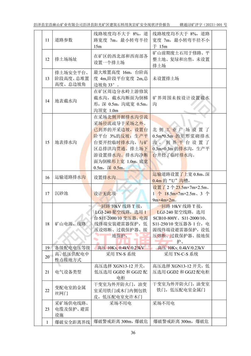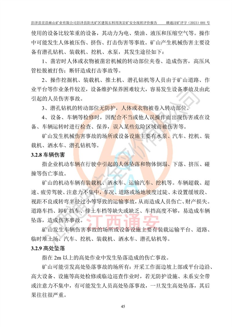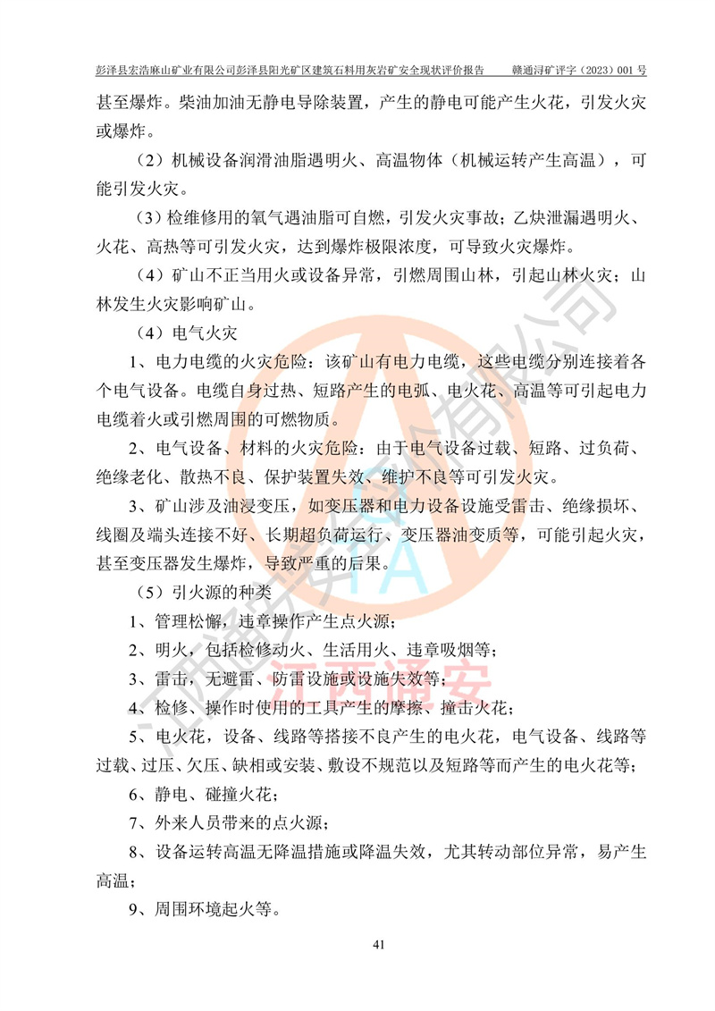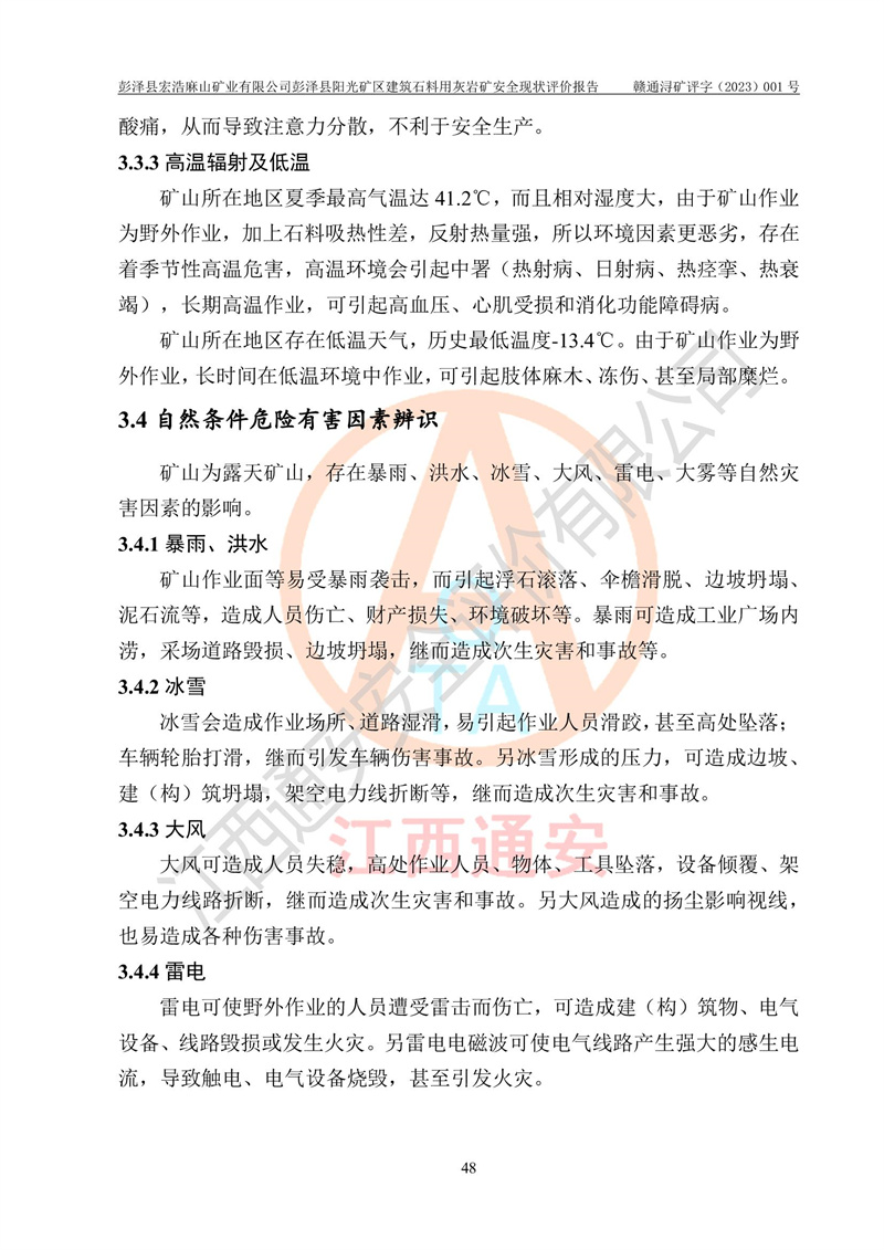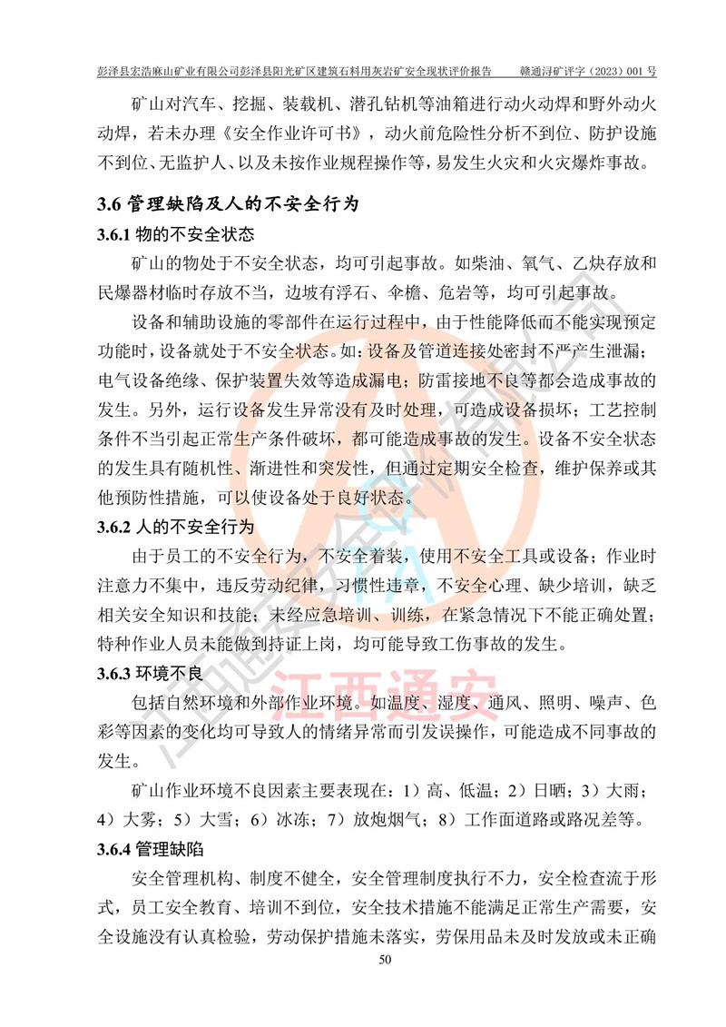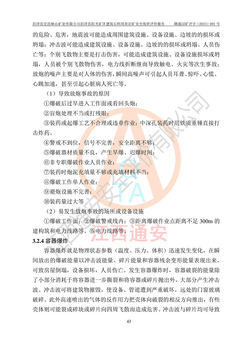 (1)礦山存在火災(zāi)、火藥爆炸、雷管爆炸、放炮、坍塌(滑坡)、泥石流、機械傷害、容器爆炸、高處墜落、**傷害、觸電與雷擊、物體打擊、淹溺、高低溫、振動、粉塵危害等危險有害因素。礦山無**礦山安全監(jiān)察局印發(fā)的《金屬非金屬礦山重大生產(chǎn)安全事故隱患判定標(biāo)準(zhǔn)》規(guī)定的重大事故隱患;不構(gòu)成《危險化學(xué)品重大危險源辨識》規(guī)定的重大危險源。 (2)礦山總體符合《彭澤縣宏浩麻山礦業(yè)有限公司彭澤縣陽光礦區(qū)建筑石料用灰?guī)r礦安全設(shè)施設(shè)計》和**安全生產(chǎn)法律、法規(guī)和行業(yè)標(biāo)準(zhǔn)、規(guī)范的要求。。 (3)礦山應(yīng)重點防范的重大危險有害因素有:坍塌、放炮、**傷害等。 總體結(jié)論:彭澤縣宏浩麻山礦業(yè)有限公司彭澤縣陽光礦區(qū)建筑石料用灰?guī)r礦周邊環(huán)境符合法規(guī)要求;安全設(shè)施總體符合《彭澤縣宏浩麻山礦業(yè)有限公司彭澤縣陽光礦區(qū)建筑石料用灰?guī)r礦安全設(shè)施設(shè)計》的要求,風(fēng)險可控,滿足安全生產(chǎn)條件。 |