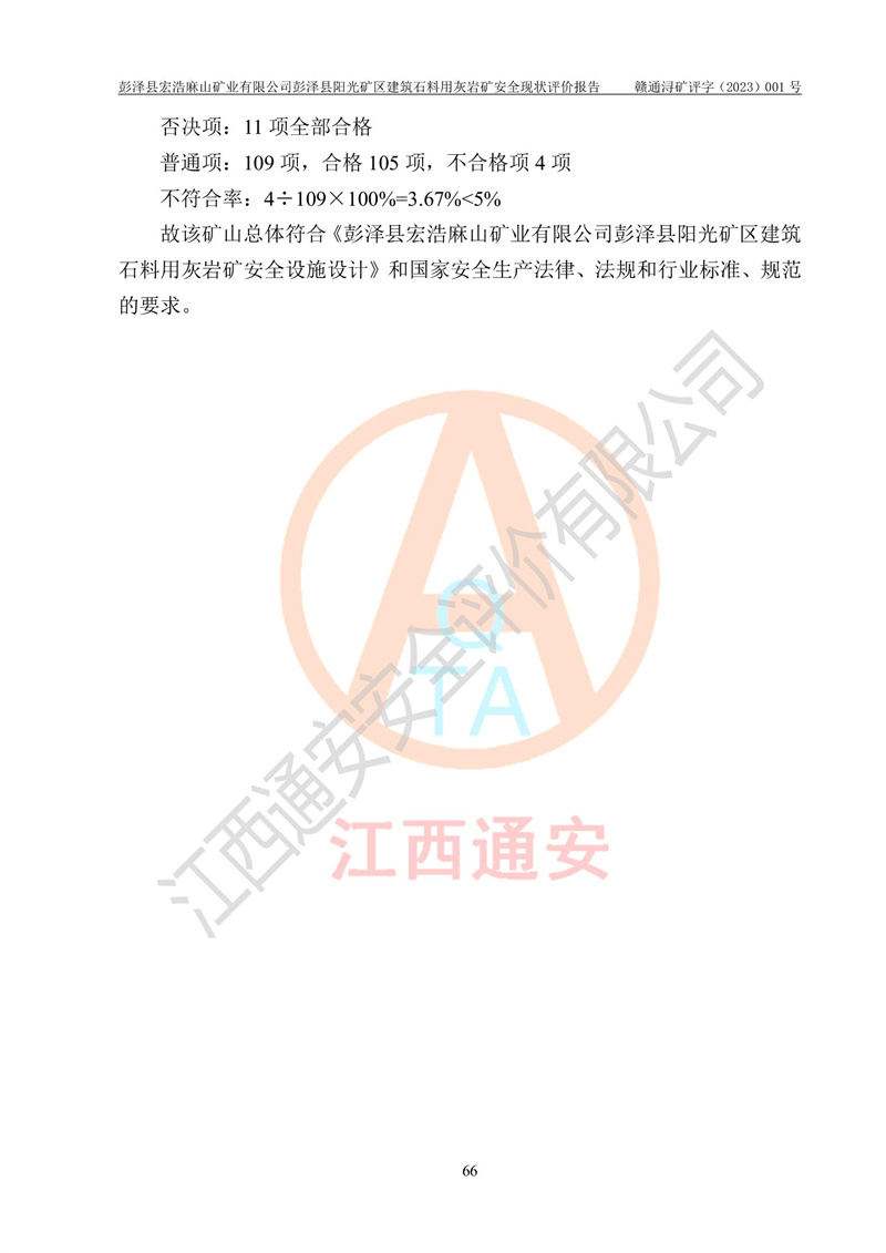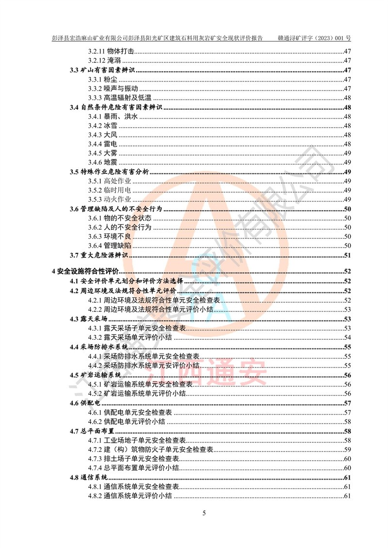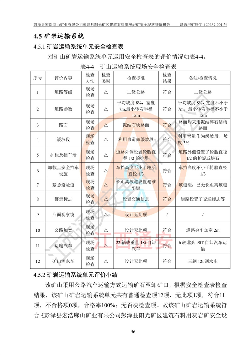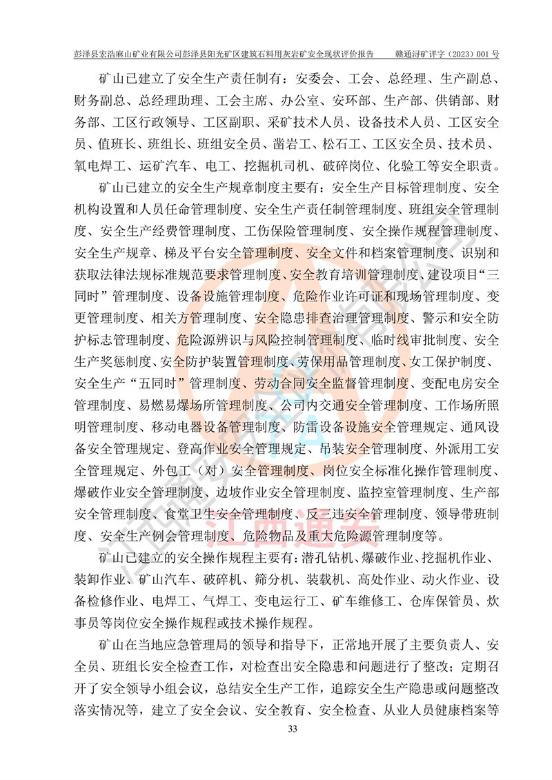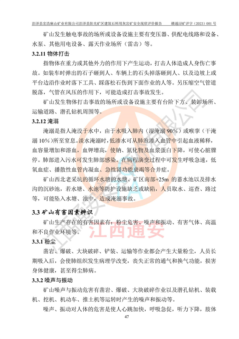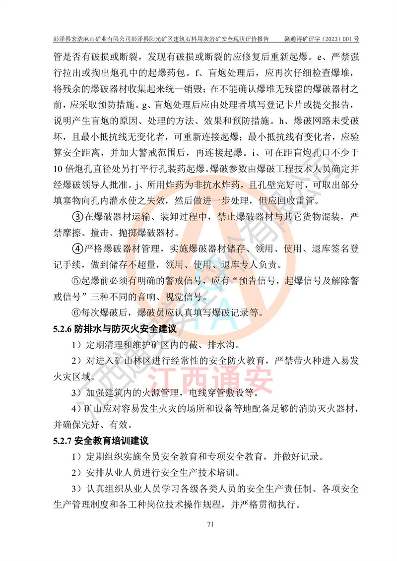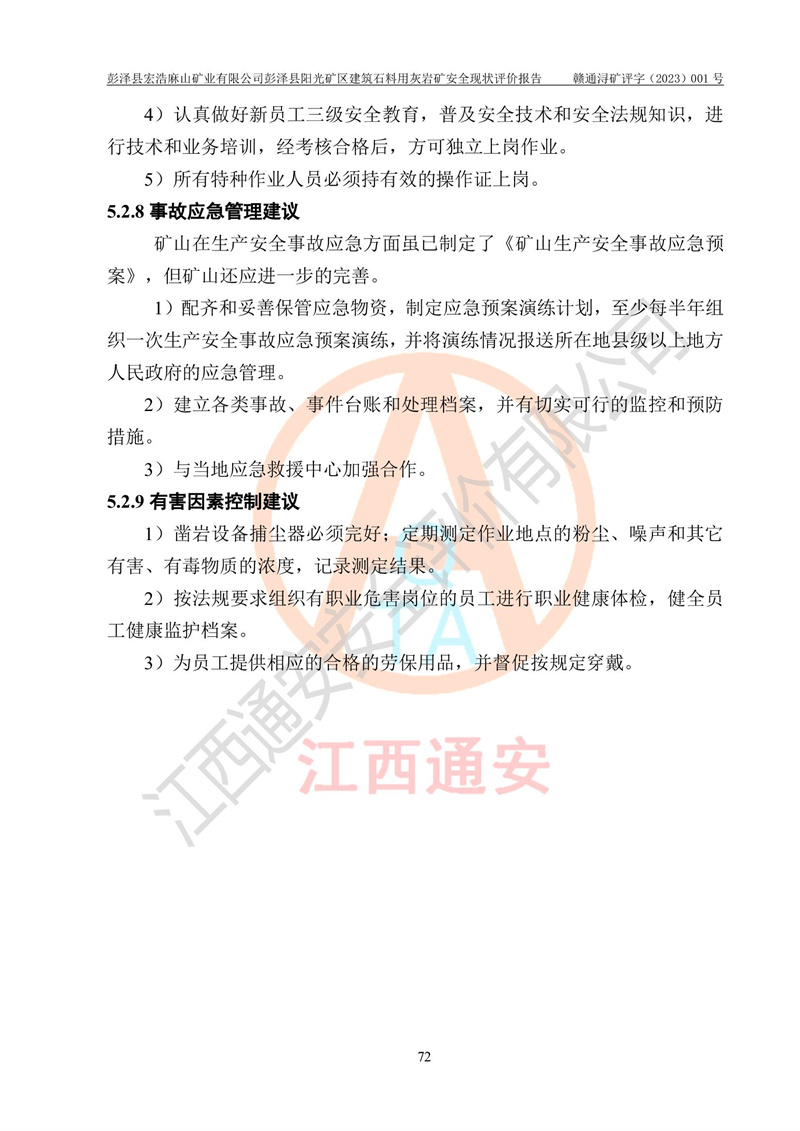 (1)礦山存在火災(zāi)、火藥爆炸、雷管爆炸、放炮、坍塌(滑坡)、泥石流、機械傷害、容器爆炸、高處墜落、**傷害、觸電與雷擊、物體打擊、淹溺、高低溫、振動、粉塵危害等危險有害因素。礦山無**礦山安全監(jiān)察局印發(fā)的《金屬非金屬礦山重大生產(chǎn)安全事故隱患判定標(biāo)準(zhǔn)》規(guī)定的重大事故隱患;不構(gòu)成《危險化學(xué)品重大危險源辨識》規(guī)定的重大危險源。 (2)礦山總體符合《彭澤縣宏浩麻山礦業(yè)有限公司彭澤縣陽光礦區(qū)建筑石料用灰?guī)r礦安全設(shè)施設(shè)計》和**安全生產(chǎn)法律、法規(guī)和行業(yè)標(biāo)準(zhǔn)、規(guī)范的要求。。 (3)礦山應(yīng)重點防范的重大危險有害因素有:坍塌、放炮、**傷害等。 總體結(jié)論:彭澤縣宏浩麻山礦業(yè)有限公司彭澤縣陽光礦區(qū)建筑石料用灰?guī)r礦周邊環(huán)境符合法規(guī)要求;安全設(shè)施總體符合《彭澤縣宏浩麻山礦業(yè)有限公司彭澤縣陽光礦區(qū)建筑石料用灰?guī)r礦安全設(shè)施設(shè)計》的要求,風(fēng)險可控,滿足安全生產(chǎn)條件。 |