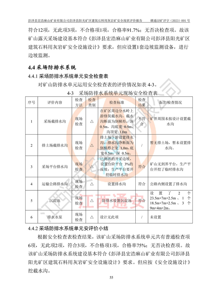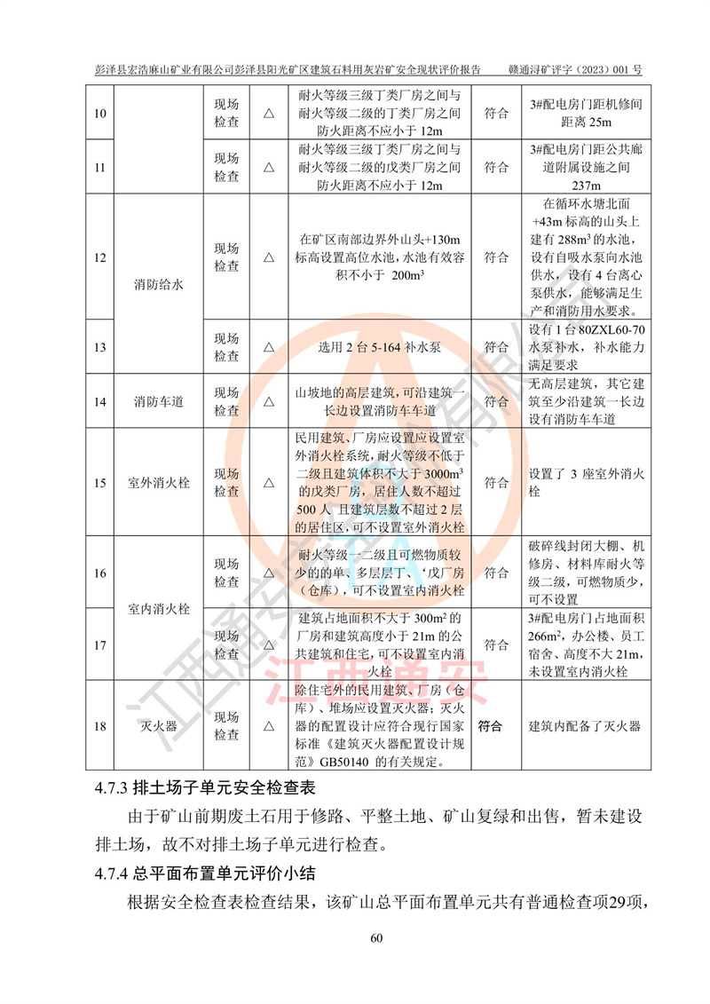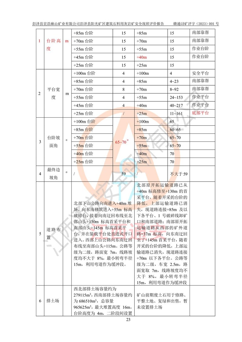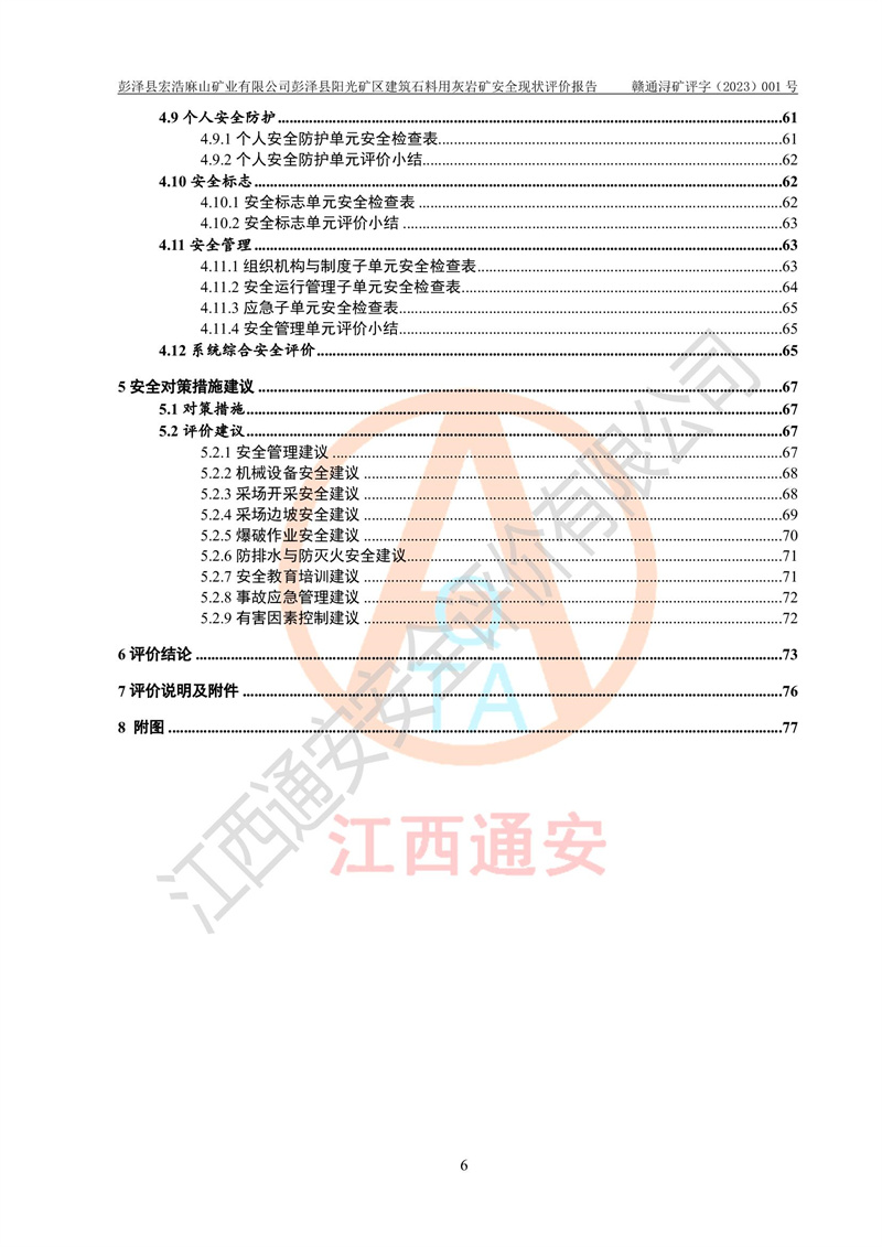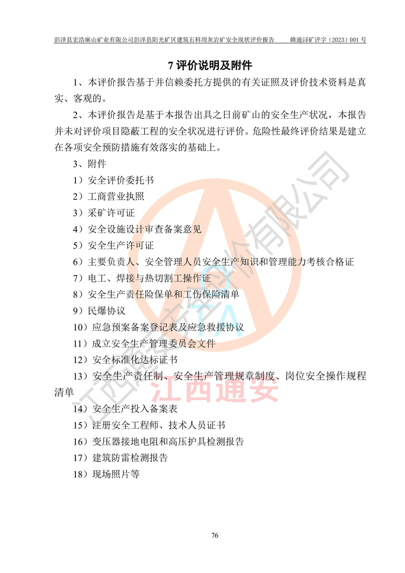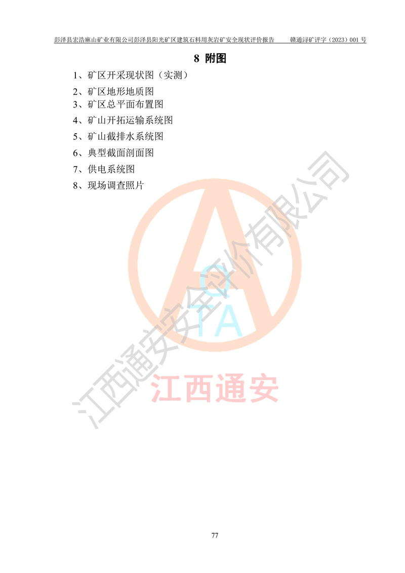 (1)礦山存在火災(zāi)、火藥爆炸、雷管爆炸、放炮、坍塌(滑坡)、泥石流、機械傷害、容器爆炸、高處墜落、**傷害、觸電與雷擊、物體打擊、淹溺、高低溫、振動、粉塵危害等危險有害因素。礦山無**礦山安全監(jiān)察局印發(fā)的《金屬非金屬礦山重大生產(chǎn)安全事故隱患判定標(biāo)準(zhǔn)》規(guī)定的重大事故隱患;不構(gòu)成《危險化學(xué)品重大危險源辨識》規(guī)定的重大危險源。 (2)礦山總體符合《彭澤縣宏浩麻山礦業(yè)有限公司彭澤縣陽光礦區(qū)建筑石料用灰?guī)r礦安全設(shè)施設(shè)計》和**安全生產(chǎn)法律、法規(guī)和行業(yè)標(biāo)準(zhǔn)、規(guī)范的要求。。 (3)礦山應(yīng)重點防范的重大危險有害因素有:坍塌、放炮、**傷害等。 總體結(jié)論:彭澤縣宏浩麻山礦業(yè)有限公司彭澤縣陽光礦區(qū)建筑石料用灰?guī)r礦周邊環(huán)境符合法規(guī)要求;安全設(shè)施總體符合《彭澤縣宏浩麻山礦業(yè)有限公司彭澤縣陽光礦區(qū)建筑石料用灰?guī)r礦安全設(shè)施設(shè)計》的要求,風(fēng)險可控,滿足安全生產(chǎn)條件。 |