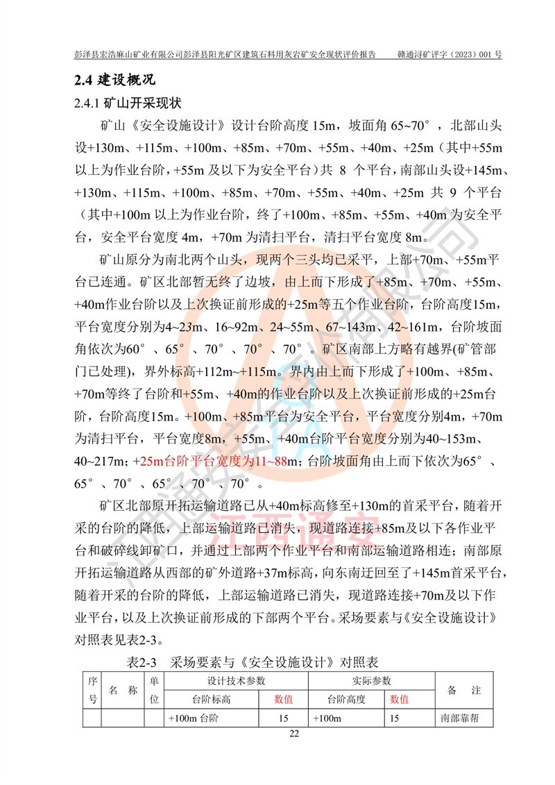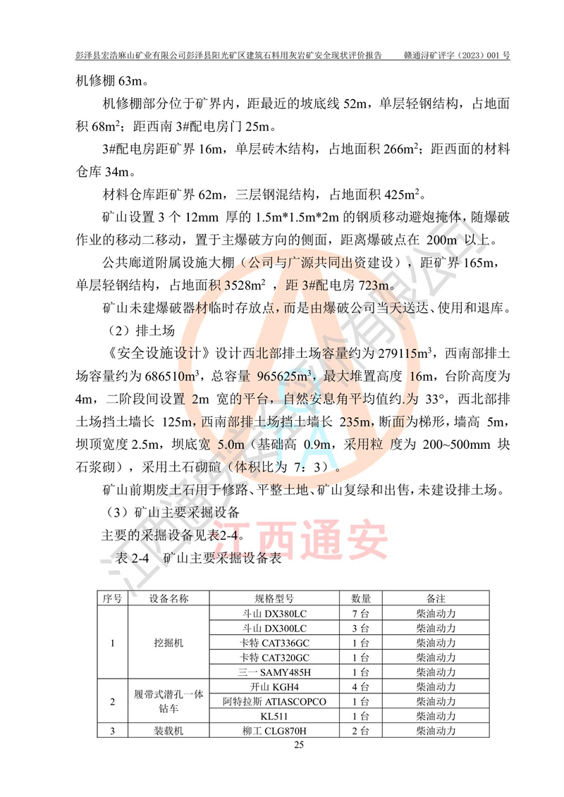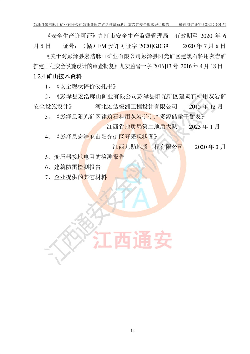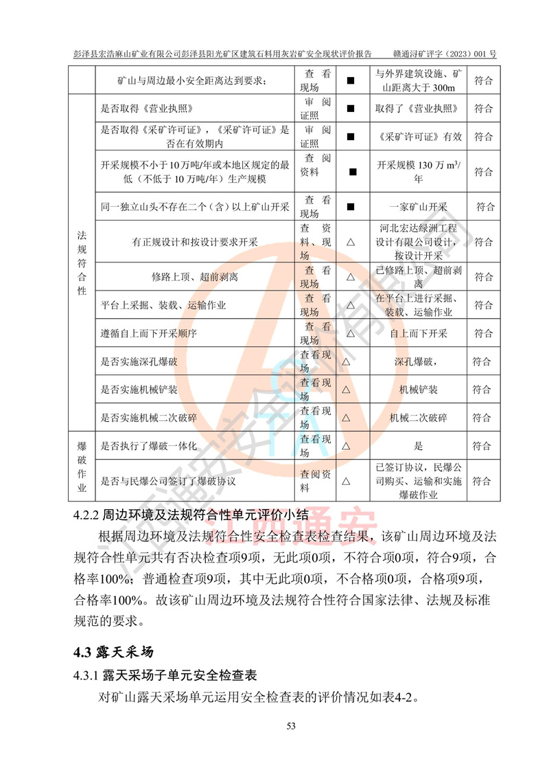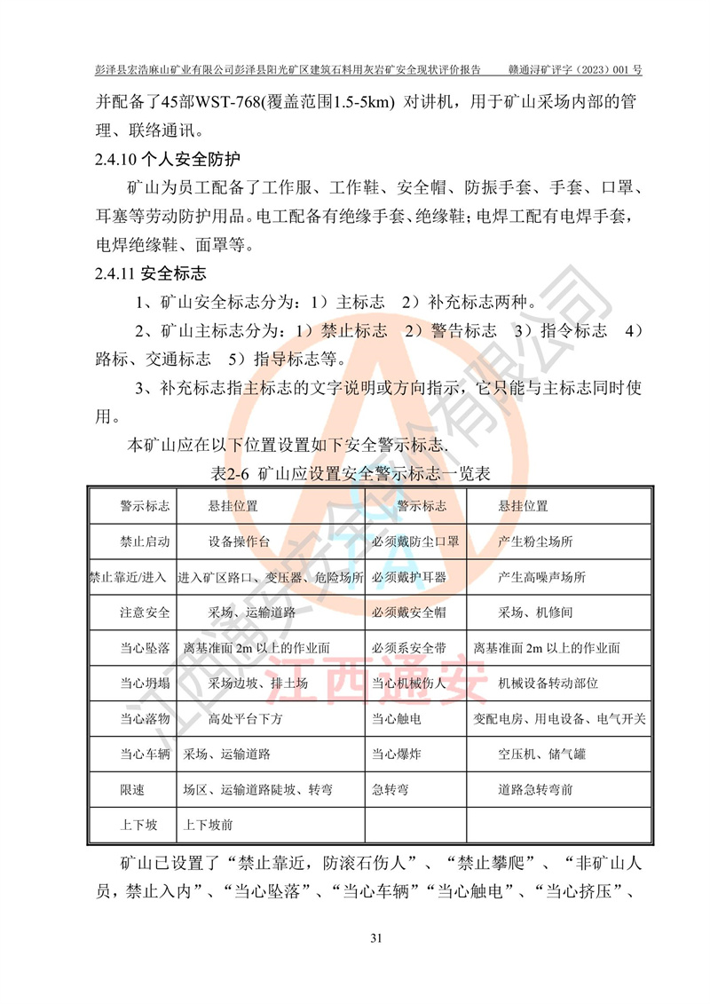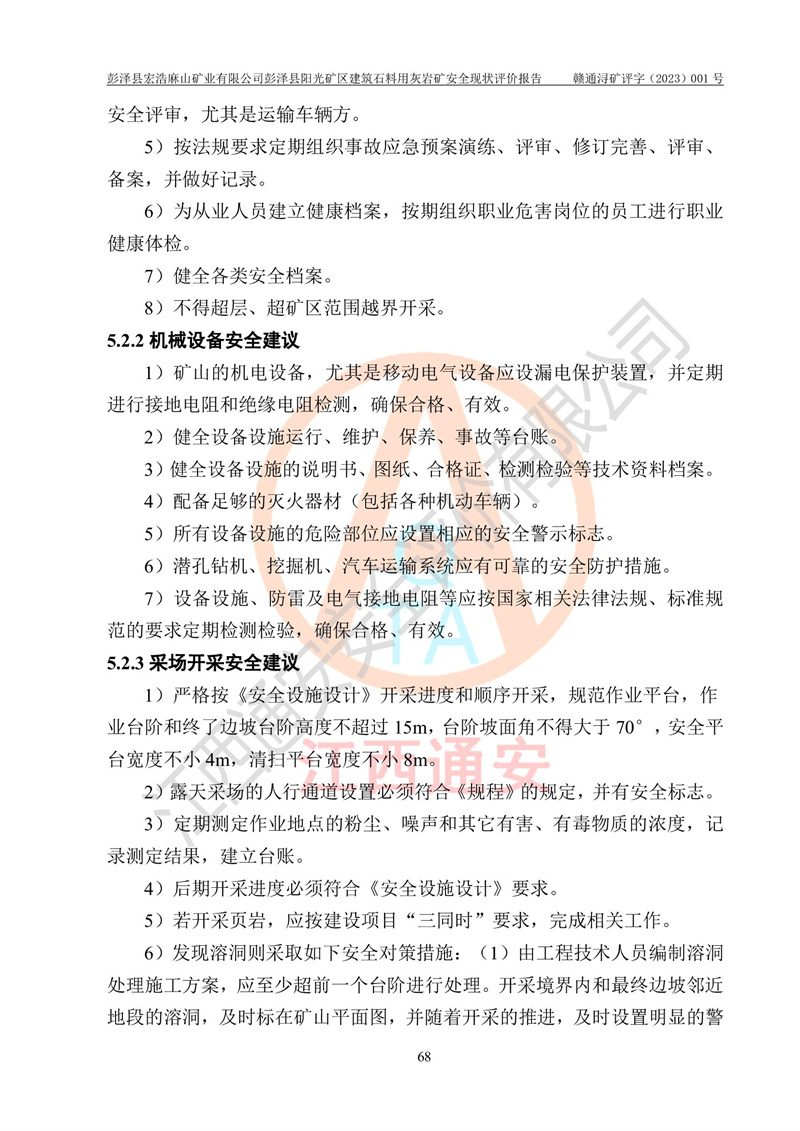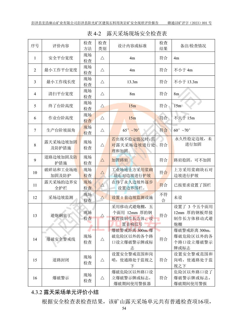 (1)礦山存在火災(zāi)、火藥爆炸、雷管爆炸、放炮、坍塌(滑坡)、泥石流、機械傷害、容器爆炸、高處墜落、**傷害、觸電與雷擊、物體打擊、淹溺、高低溫、振動、粉塵危害等危險有害因素。礦山無**礦山安全監(jiān)察局印發(fā)的《金屬非金屬礦山重大生產(chǎn)安全事故隱患判定標(biāo)準(zhǔn)》規(guī)定的重大事故隱患;不構(gòu)成《危險化學(xué)品重大危險源辨識》規(guī)定的重大危險源。 (2)礦山總體符合《彭澤縣宏浩麻山礦業(yè)有限公司彭澤縣陽光礦區(qū)建筑石料用灰?guī)r礦安全設(shè)施設(shè)計》和**安全生產(chǎn)法律、法規(guī)和行業(yè)標(biāo)準(zhǔn)、規(guī)范的要求。。 (3)礦山應(yīng)重點防范的重大危險有害因素有:坍塌、放炮、**傷害等。 總體結(jié)論:彭澤縣宏浩麻山礦業(yè)有限公司彭澤縣陽光礦區(qū)建筑石料用灰?guī)r礦周邊環(huán)境符合法規(guī)要求;安全設(shè)施總體符合《彭澤縣宏浩麻山礦業(yè)有限公司彭澤縣陽光礦區(qū)建筑石料用灰?guī)r礦安全設(shè)施設(shè)計》的要求,風(fēng)險可控,滿足安全生產(chǎn)條件。 |