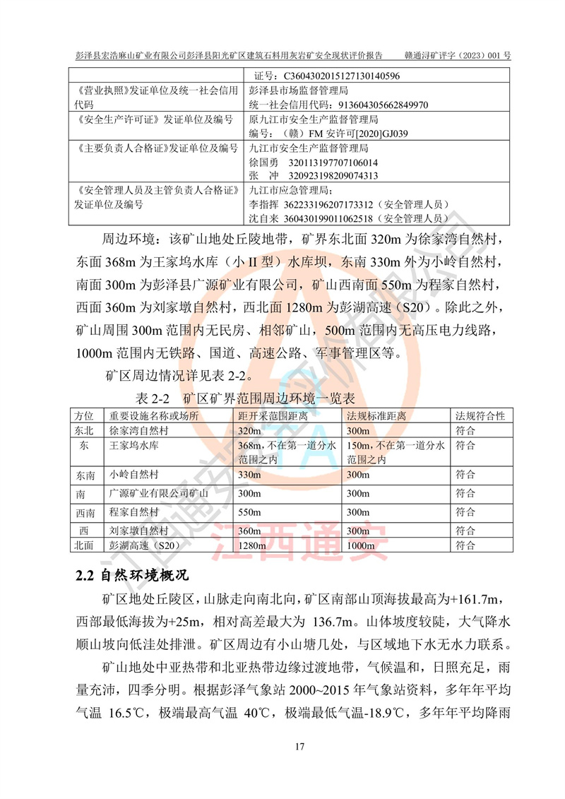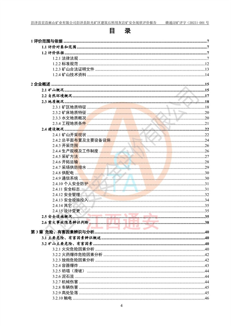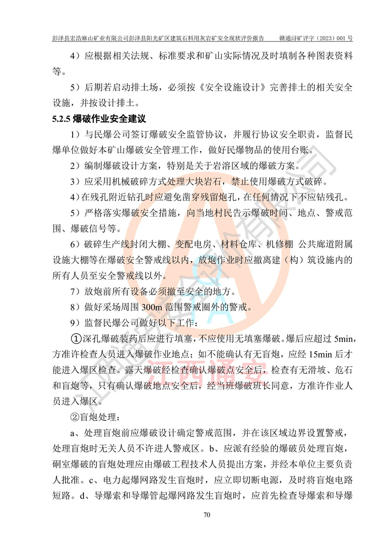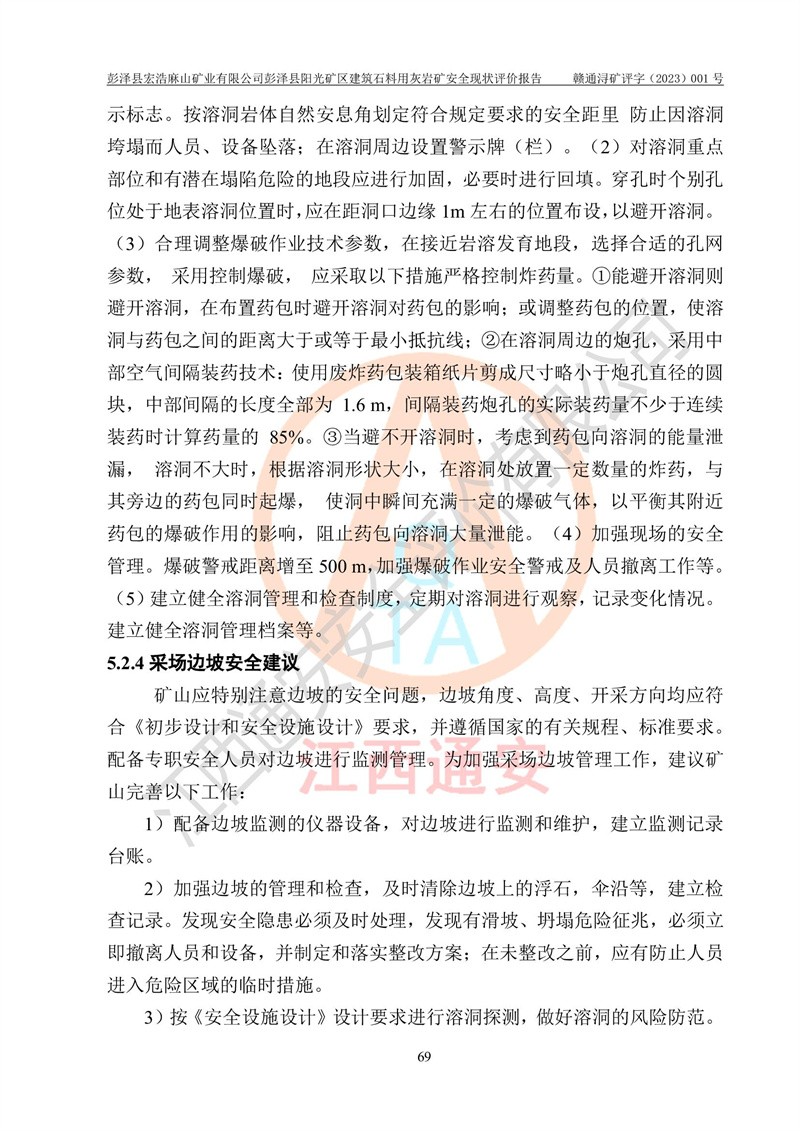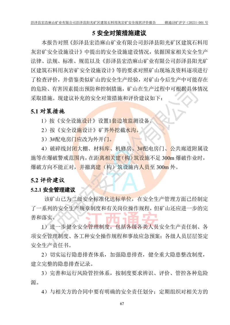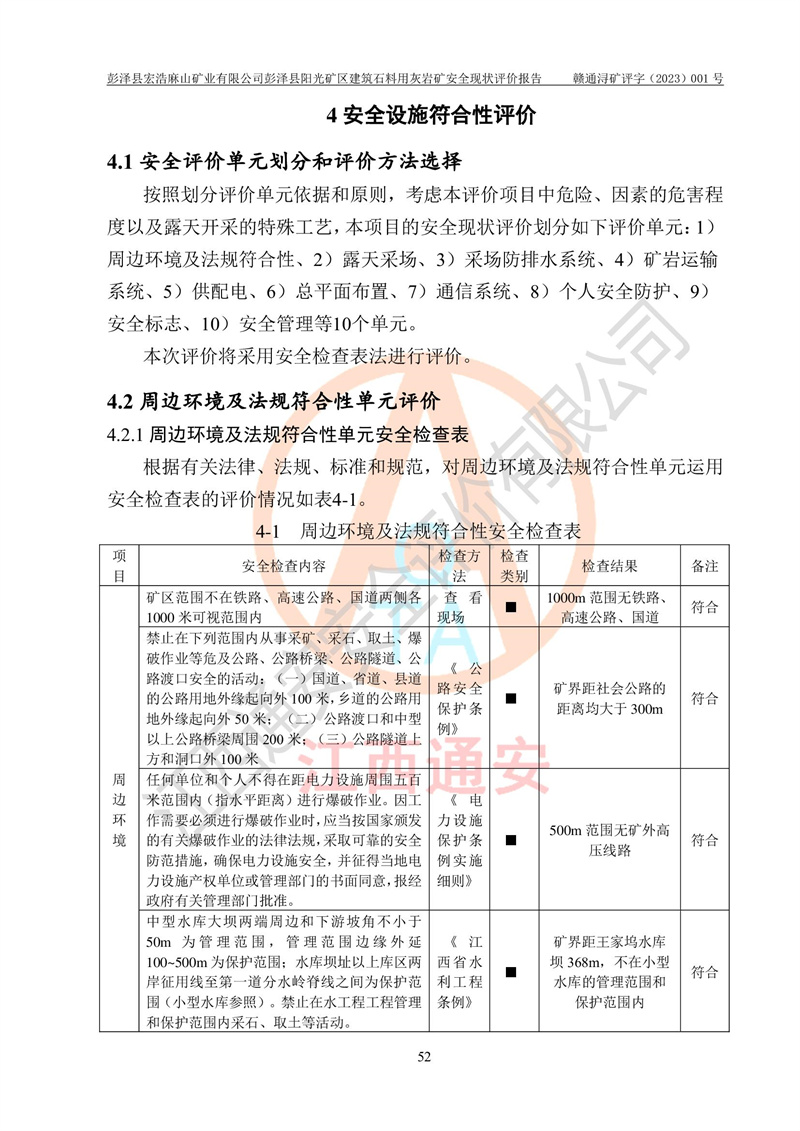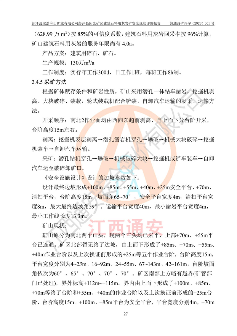 (1)礦山存在火災(zāi)、火藥爆炸、雷管爆炸、放炮、坍塌(滑坡)、泥石流、機械傷害、容器爆炸、高處墜落、**傷害、觸電與雷擊、物體打擊、淹溺、高低溫、振動、粉塵危害等危險有害因素。礦山無**礦山安全監(jiān)察局印發(fā)的《金屬非金屬礦山重大生產(chǎn)安全事故隱患判定標(biāo)準(zhǔn)》規(guī)定的重大事故隱患;不構(gòu)成《危險化學(xué)品重大危險源辨識》規(guī)定的重大危險源。 (2)礦山總體符合《彭澤縣宏浩麻山礦業(yè)有限公司彭澤縣陽光礦區(qū)建筑石料用灰?guī)r礦安全設(shè)施設(shè)計》和**安全生產(chǎn)法律、法規(guī)和行業(yè)標(biāo)準(zhǔn)、規(guī)范的要求。。 (3)礦山應(yīng)重點防范的重大危險有害因素有:坍塌、放炮、**傷害等。 總體結(jié)論:彭澤縣宏浩麻山礦業(yè)有限公司彭澤縣陽光礦區(qū)建筑石料用灰?guī)r礦周邊環(huán)境符合法規(guī)要求;安全設(shè)施總體符合《彭澤縣宏浩麻山礦業(yè)有限公司彭澤縣陽光礦區(qū)建筑石料用灰?guī)r礦安全設(shè)施設(shè)計》的要求,風(fēng)險可控,滿足安全生產(chǎn)條件。 |