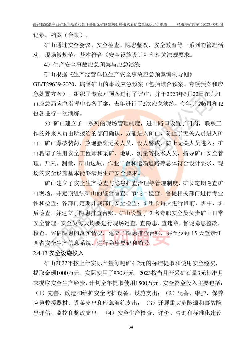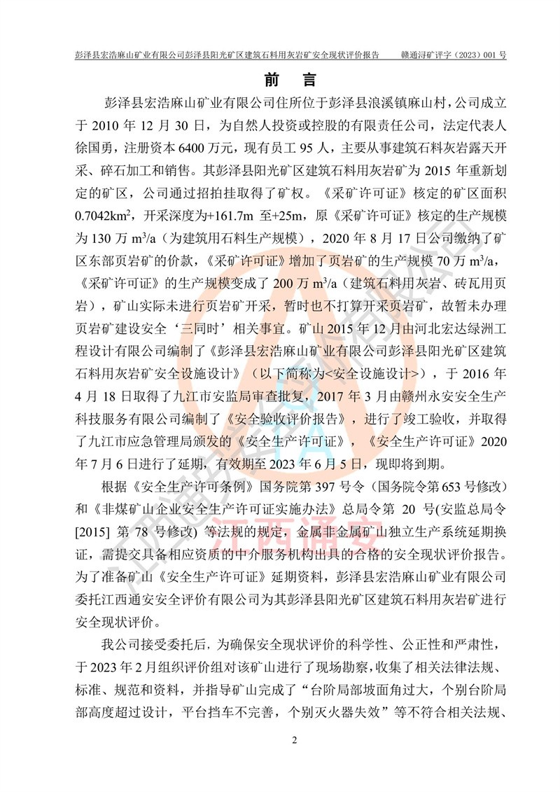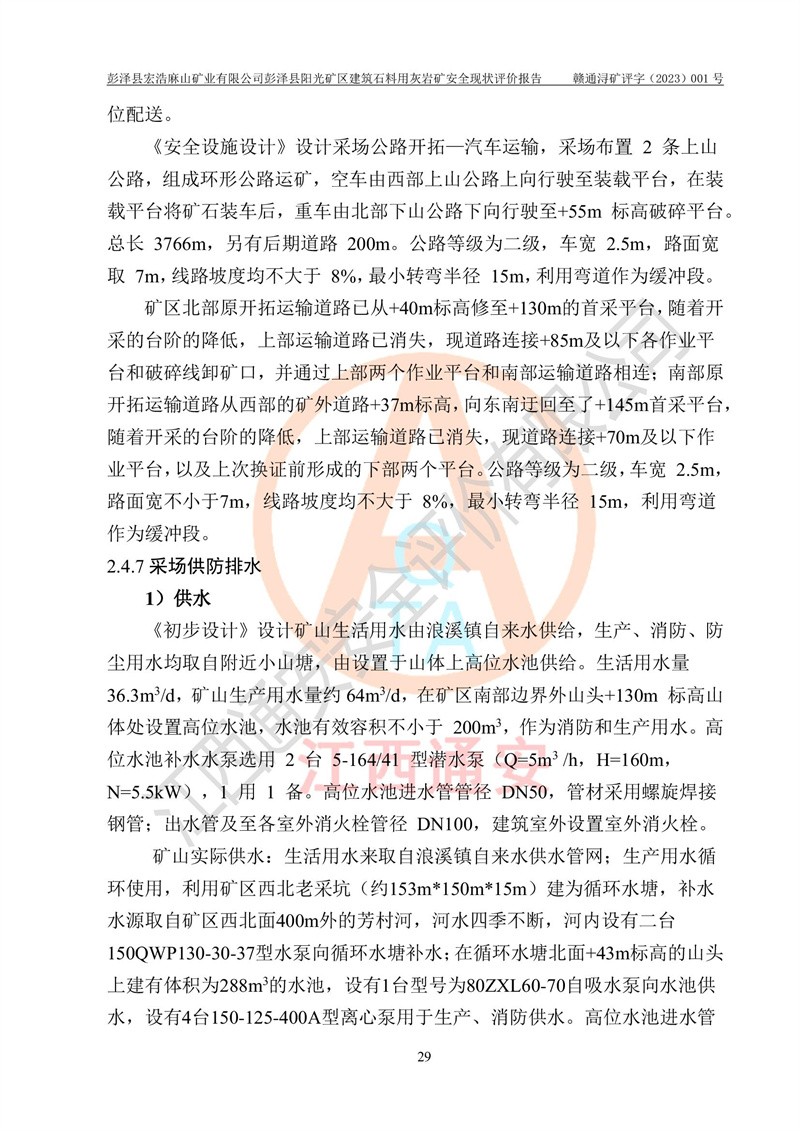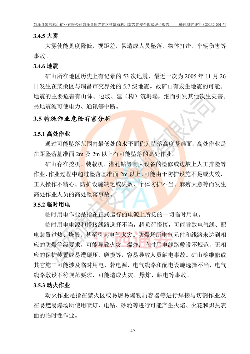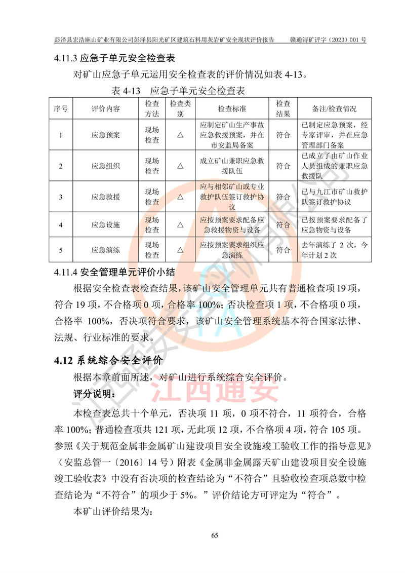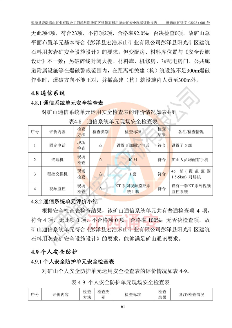 (1)礦山存在火災(zāi)、火藥爆炸、雷管爆炸、放炮、坍塌(滑坡)、泥石流、機械傷害、容器爆炸、高處墜落、**傷害、觸電與雷擊、物體打擊、淹溺、高低溫、振動、粉塵危害等危險有害因素。礦山無**礦山安全監(jiān)察局印發(fā)的《金屬非金屬礦山重大生產(chǎn)安全事故隱患判定標(biāo)準(zhǔn)》規(guī)定的重大事故隱患;不構(gòu)成《危險化學(xué)品重大危險源辨識》規(guī)定的重大危險源。 (2)礦山總體符合《彭澤縣宏浩麻山礦業(yè)有限公司彭澤縣陽光礦區(qū)建筑石料用灰?guī)r礦安全設(shè)施設(shè)計》和**安全生產(chǎn)法律、法規(guī)和行業(yè)標(biāo)準(zhǔn)、規(guī)范的要求。。 (3)礦山應(yīng)重點防范的重大危險有害因素有:坍塌、放炮、**傷害等。 總體結(jié)論:彭澤縣宏浩麻山礦業(yè)有限公司彭澤縣陽光礦區(qū)建筑石料用灰?guī)r礦周邊環(huán)境符合法規(guī)要求;安全設(shè)施總體符合《彭澤縣宏浩麻山礦業(yè)有限公司彭澤縣陽光礦區(qū)建筑石料用灰?guī)r礦安全設(shè)施設(shè)計》的要求,風(fēng)險可控,滿足安全生產(chǎn)條件。 |