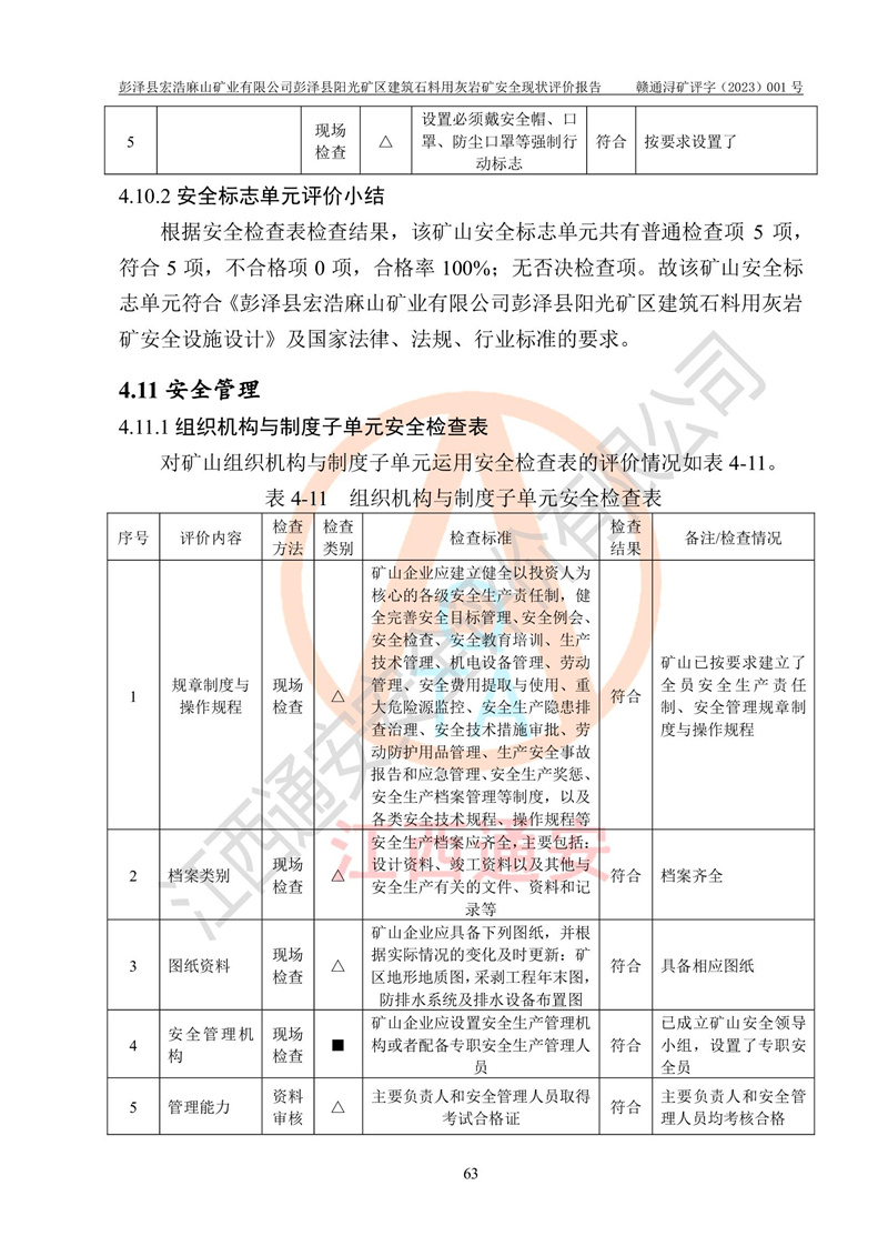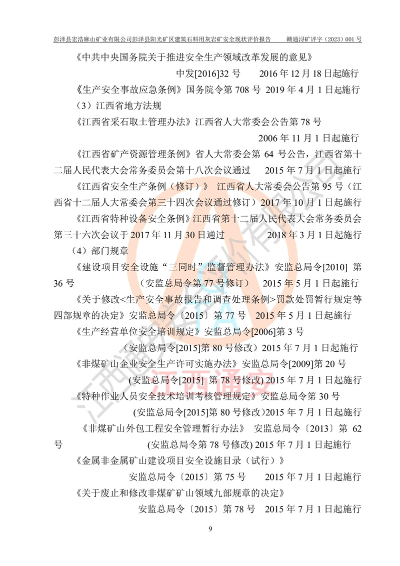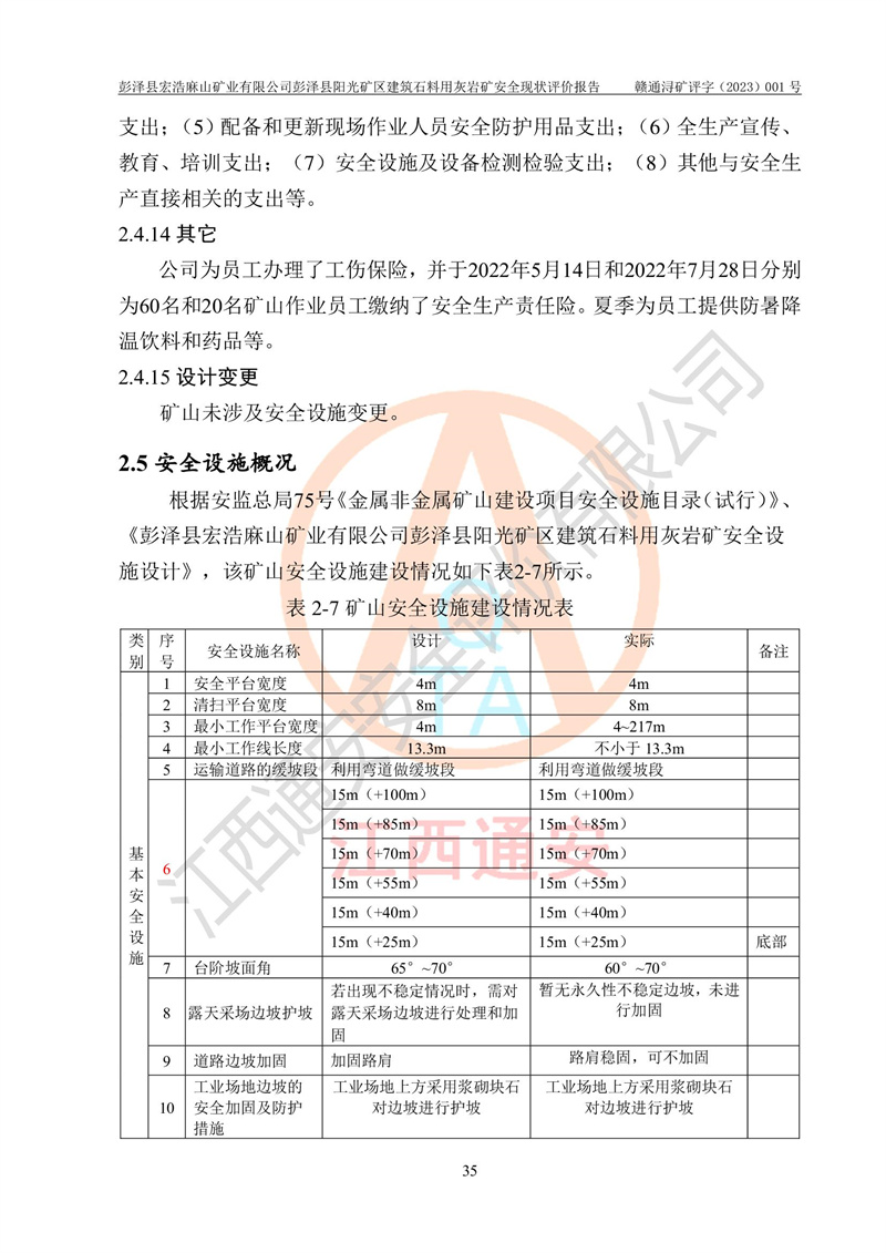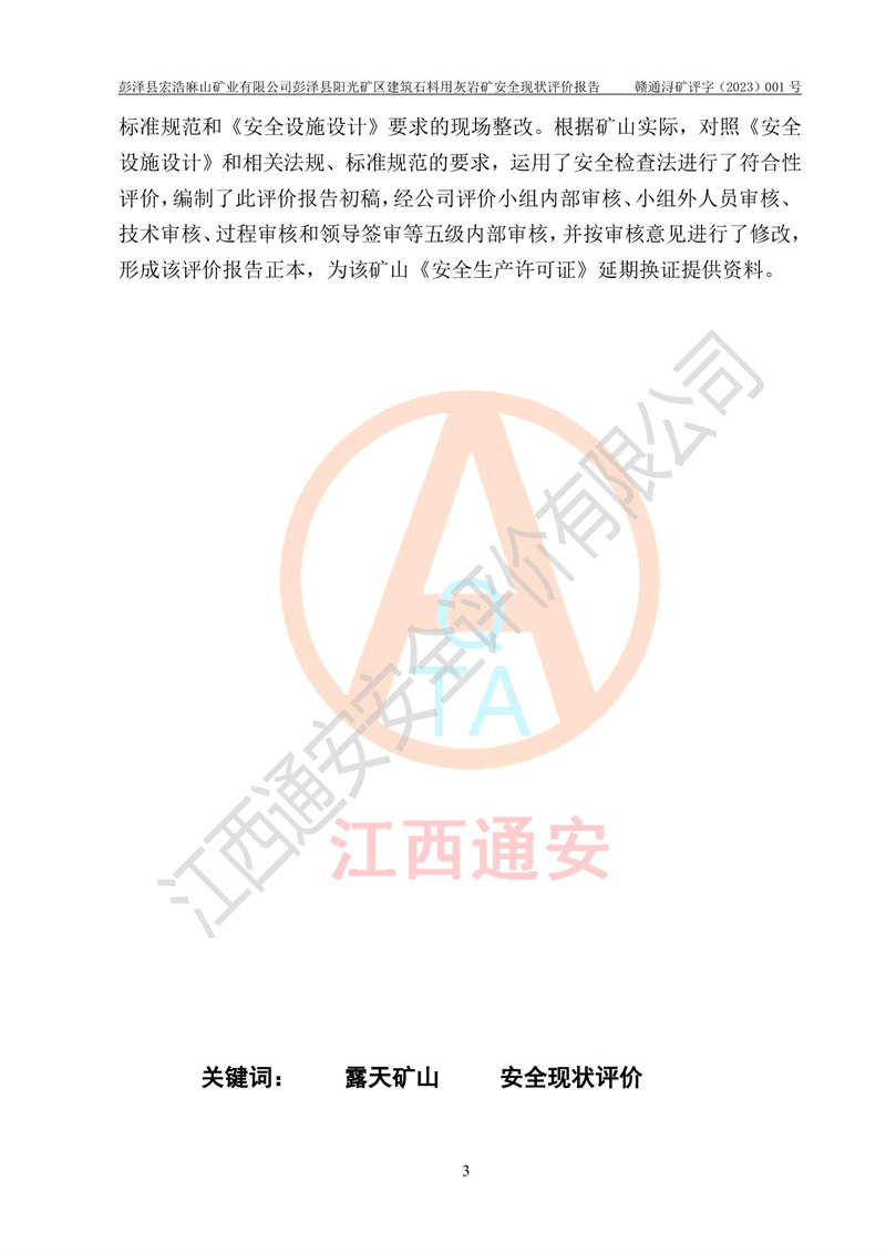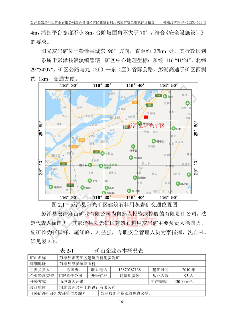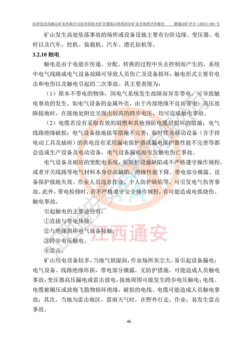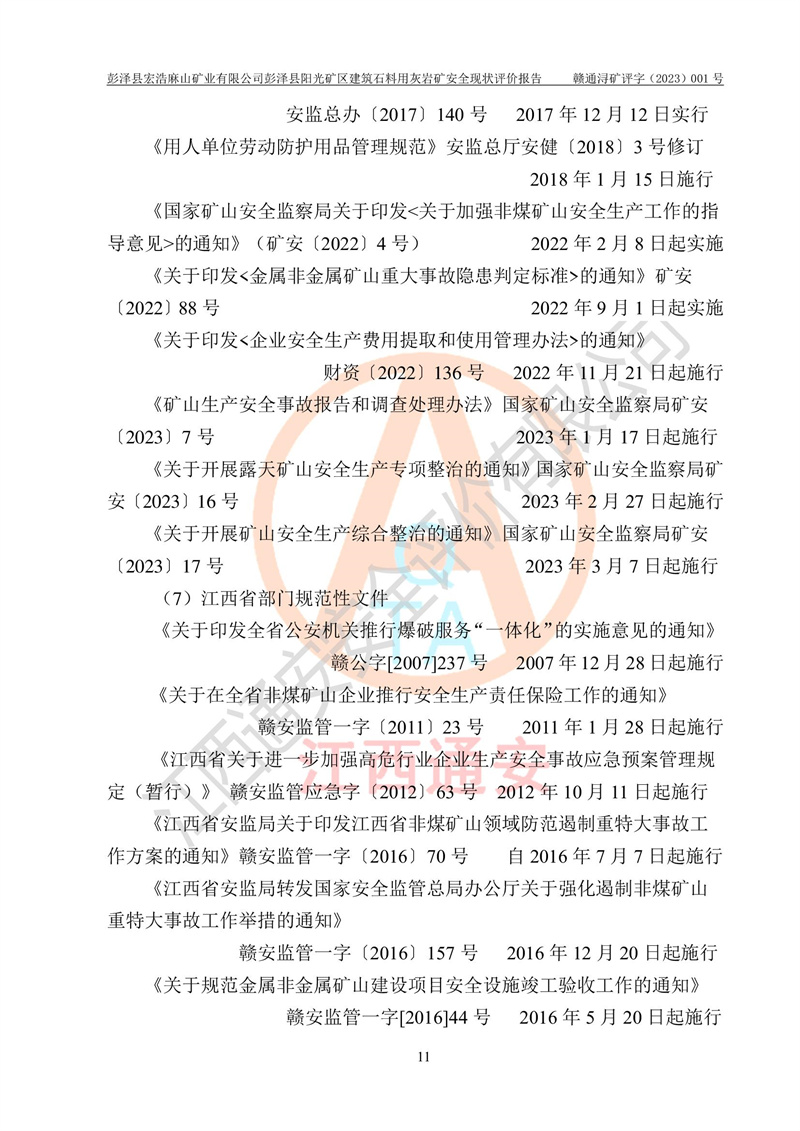 (1)礦山存在火災(zāi)、火藥爆炸、雷管爆炸、放炮、坍塌(滑坡)、泥石流、機械傷害、容器爆炸、高處墜落、**傷害、觸電與雷擊、物體打擊、淹溺、高低溫、振動、粉塵危害等危險有害因素。礦山無**礦山安全監(jiān)察局印發(fā)的《金屬非金屬礦山重大生產(chǎn)安全事故隱患判定標(biāo)準(zhǔn)》規(guī)定的重大事故隱患;不構(gòu)成《危險化學(xué)品重大危險源辨識》規(guī)定的重大危險源。 (2)礦山總體符合《彭澤縣宏浩麻山礦業(yè)有限公司彭澤縣陽光礦區(qū)建筑石料用灰?guī)r礦安全設(shè)施設(shè)計》和**安全生產(chǎn)法律、法規(guī)和行業(yè)標(biāo)準(zhǔn)、規(guī)范的要求。。 (3)礦山應(yīng)重點防范的重大危險有害因素有:坍塌、放炮、**傷害等。 總體結(jié)論:彭澤縣宏浩麻山礦業(yè)有限公司彭澤縣陽光礦區(qū)建筑石料用灰?guī)r礦周邊環(huán)境符合法規(guī)要求;安全設(shè)施總體符合《彭澤縣宏浩麻山礦業(yè)有限公司彭澤縣陽光礦區(qū)建筑石料用灰?guī)r礦安全設(shè)施設(shè)計》的要求,風(fēng)險可控,滿足安全生產(chǎn)條件。 |