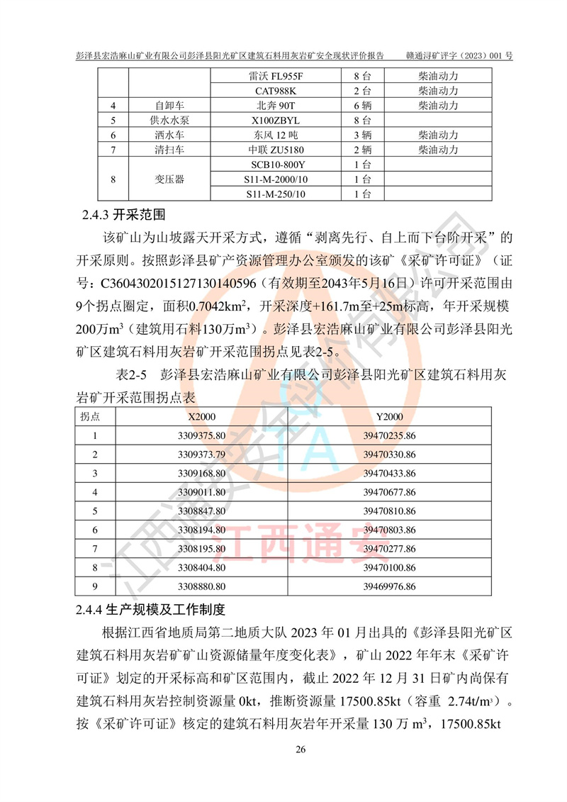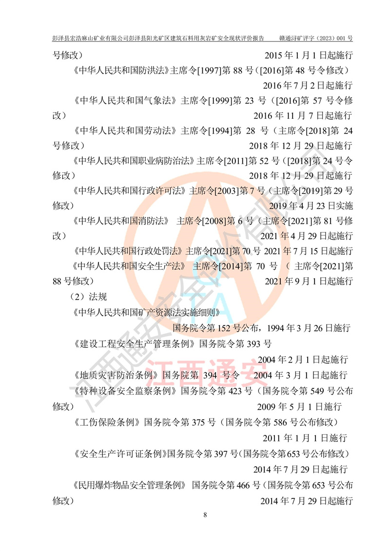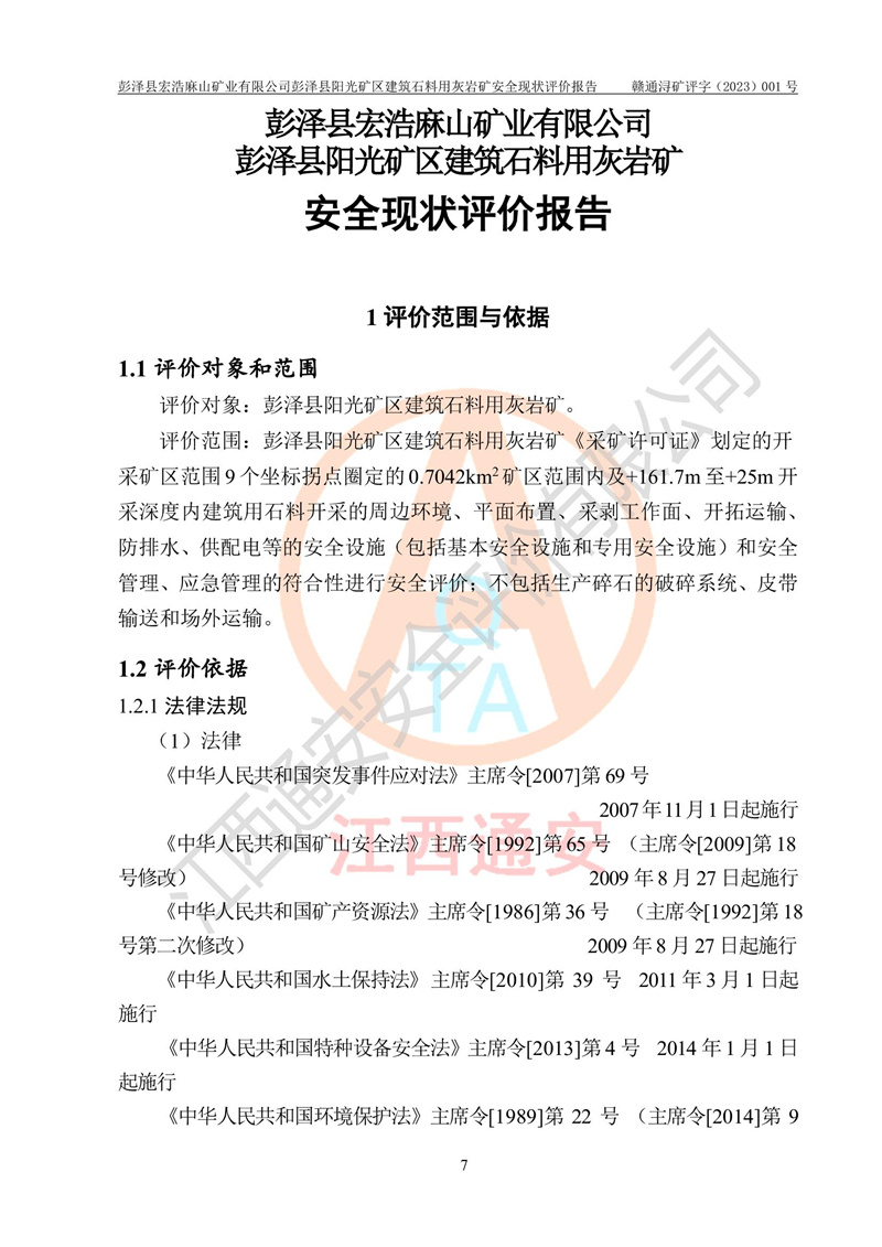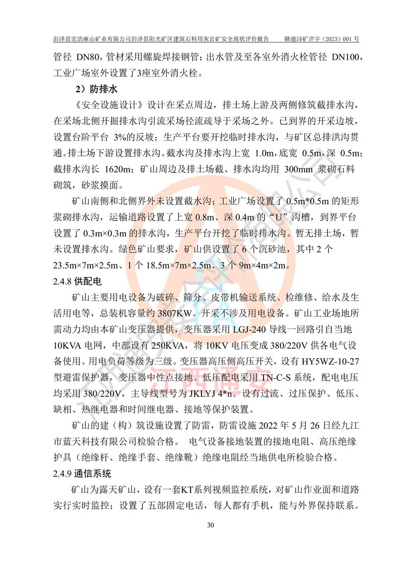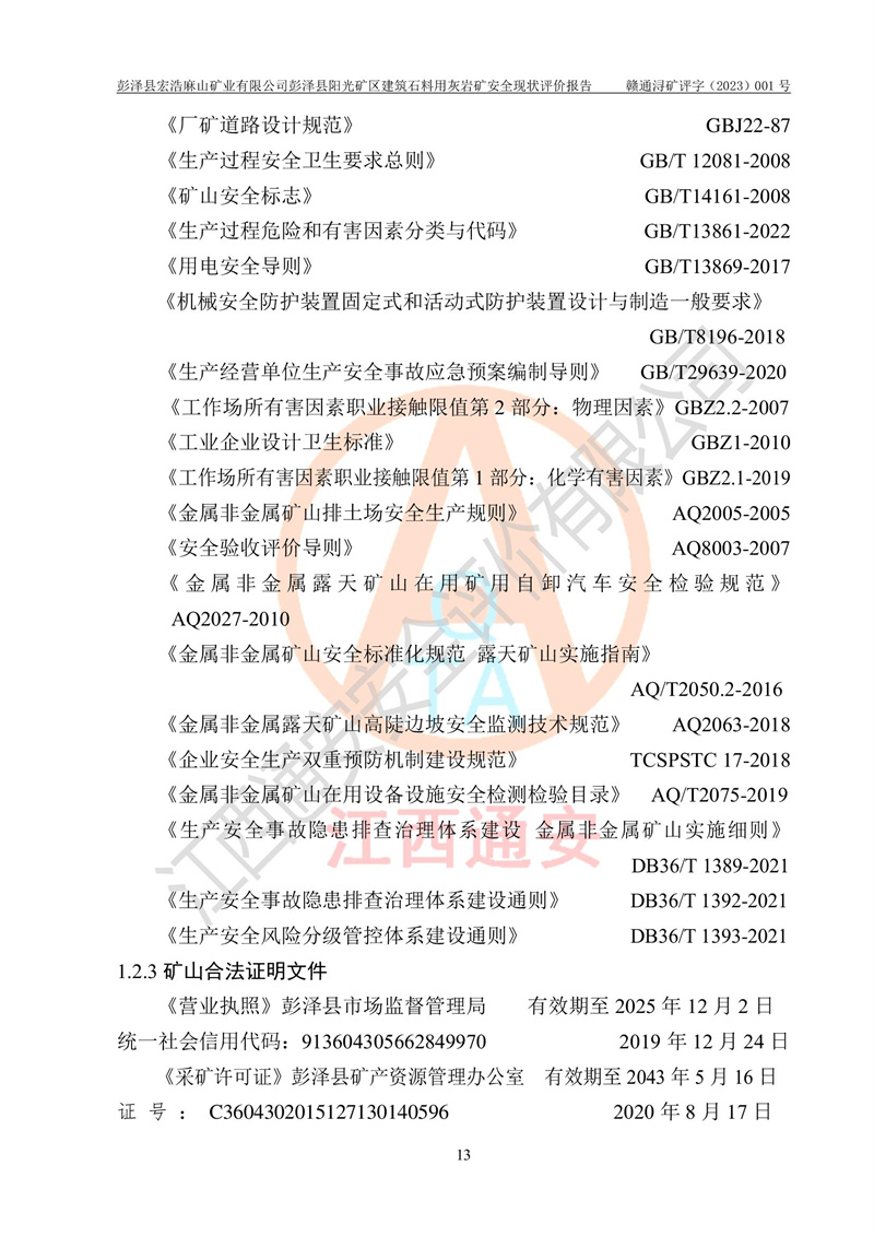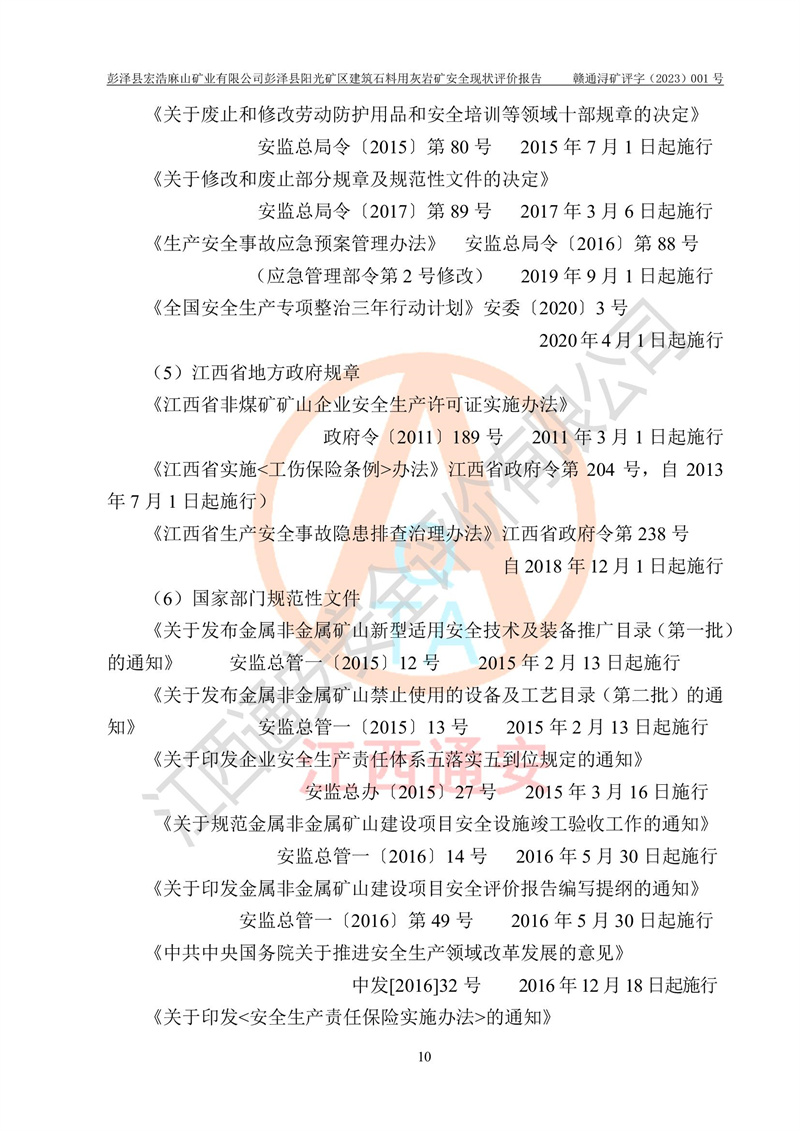 (1)礦山存在火災(zāi)、火藥爆炸、雷管爆炸、放炮、坍塌(滑坡)、泥石流、機械傷害、容器爆炸、高處墜落、**傷害、觸電與雷擊、物體打擊、淹溺、高低溫、振動、粉塵危害等危險有害因素。礦山無**礦山安全監(jiān)察局印發(fā)的《金屬非金屬礦山重大生產(chǎn)安全事故隱患判定標(biāo)準(zhǔn)》規(guī)定的重大事故隱患;不構(gòu)成《危險化學(xué)品重大危險源辨識》規(guī)定的重大危險源。 (2)礦山總體符合《彭澤縣宏浩麻山礦業(yè)有限公司彭澤縣陽光礦區(qū)建筑石料用灰?guī)r礦安全設(shè)施設(shè)計》和**安全生產(chǎn)法律、法規(guī)和行業(yè)標(biāo)準(zhǔn)、規(guī)范的要求。。 (3)礦山應(yīng)重點防范的重大危險有害因素有:坍塌、放炮、**傷害等。 總體結(jié)論:彭澤縣宏浩麻山礦業(yè)有限公司彭澤縣陽光礦區(qū)建筑石料用灰?guī)r礦周邊環(huán)境符合法規(guī)要求;安全設(shè)施總體符合《彭澤縣宏浩麻山礦業(yè)有限公司彭澤縣陽光礦區(qū)建筑石料用灰?guī)r礦安全設(shè)施設(shè)計》的要求,風(fēng)險可控,滿足安全生產(chǎn)條件。 |