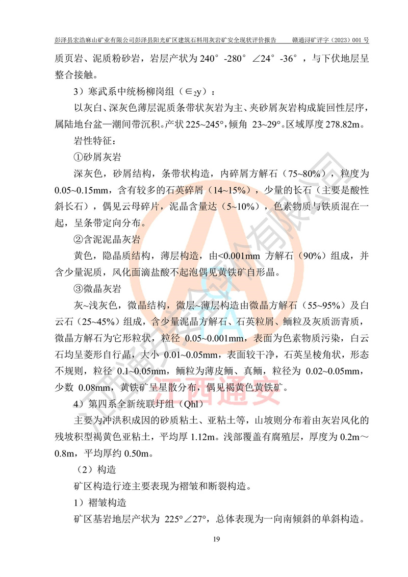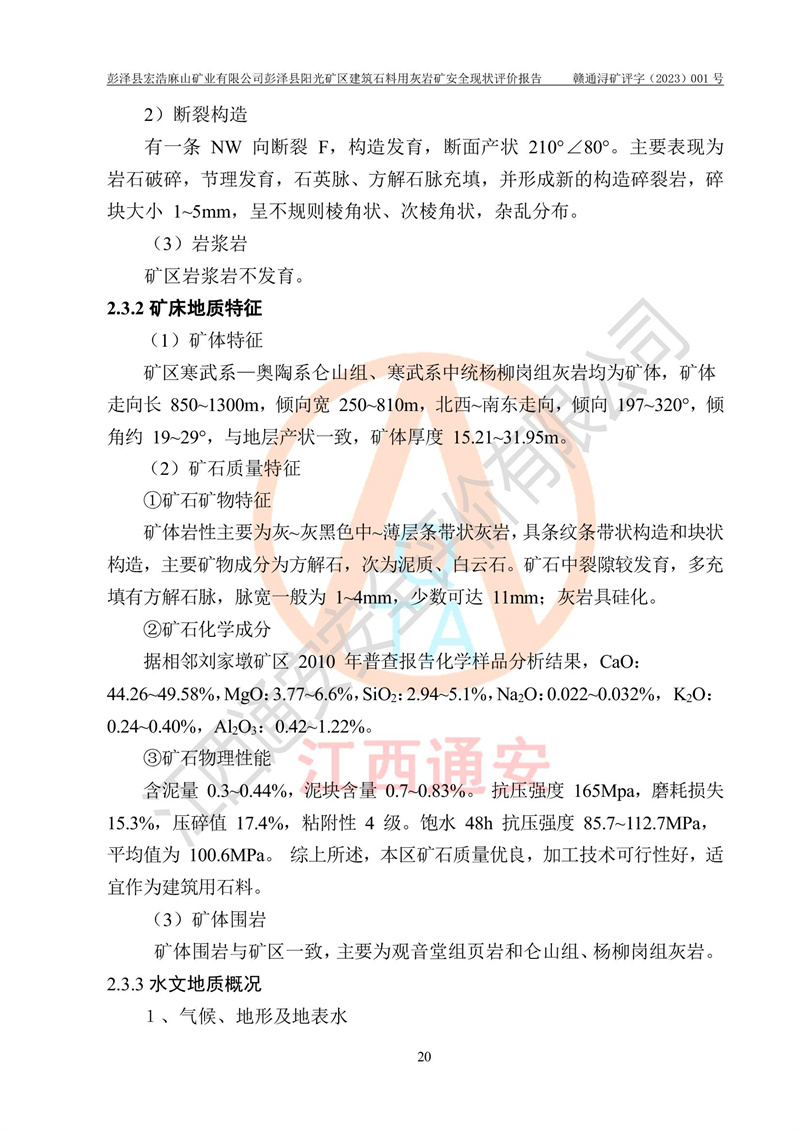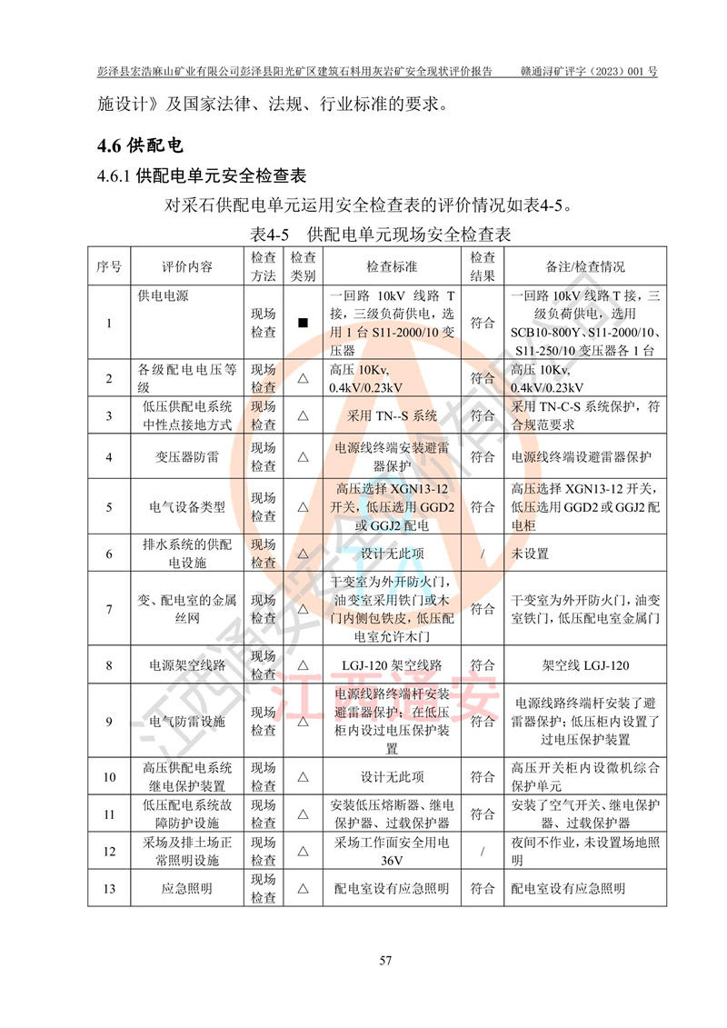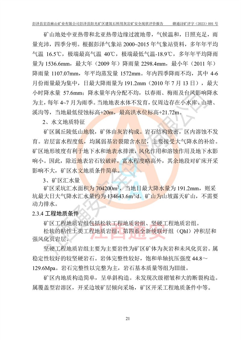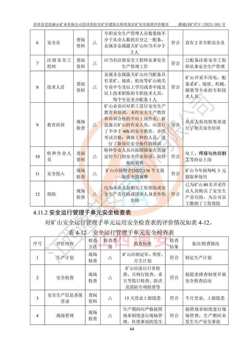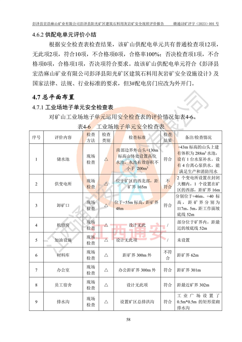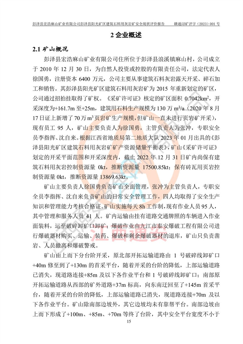 (1)礦山存在火災(zāi)、火藥爆炸、雷管爆炸、放炮、坍塌(滑坡)、泥石流、機械傷害、容器爆炸、高處墜落、**傷害、觸電與雷擊、物體打擊、淹溺、高低溫、振動、粉塵危害等危險有害因素。礦山無**礦山安全監(jiān)察局印發(fā)的《金屬非金屬礦山重大生產(chǎn)安全事故隱患判定標(biāo)準(zhǔn)》規(guī)定的重大事故隱患;不構(gòu)成《危險化學(xué)品重大危險源辨識》規(guī)定的重大危險源。 (2)礦山總體符合《彭澤縣宏浩麻山礦業(yè)有限公司彭澤縣陽光礦區(qū)建筑石料用灰?guī)r礦安全設(shè)施設(shè)計》和**安全生產(chǎn)法律、法規(guī)和行業(yè)標(biāo)準(zhǔn)、規(guī)范的要求。。 (3)礦山應(yīng)重點防范的重大危險有害因素有:坍塌、放炮、**傷害等。 總體結(jié)論:彭澤縣宏浩麻山礦業(yè)有限公司彭澤縣陽光礦區(qū)建筑石料用灰?guī)r礦周邊環(huán)境符合法規(guī)要求;安全設(shè)施總體符合《彭澤縣宏浩麻山礦業(yè)有限公司彭澤縣陽光礦區(qū)建筑石料用灰?guī)r礦安全設(shè)施設(shè)計》的要求,風(fēng)險可控,滿足安全生產(chǎn)條件。 |