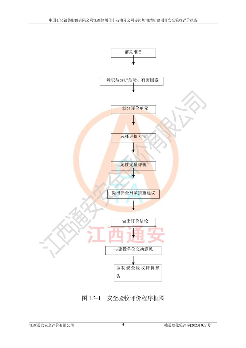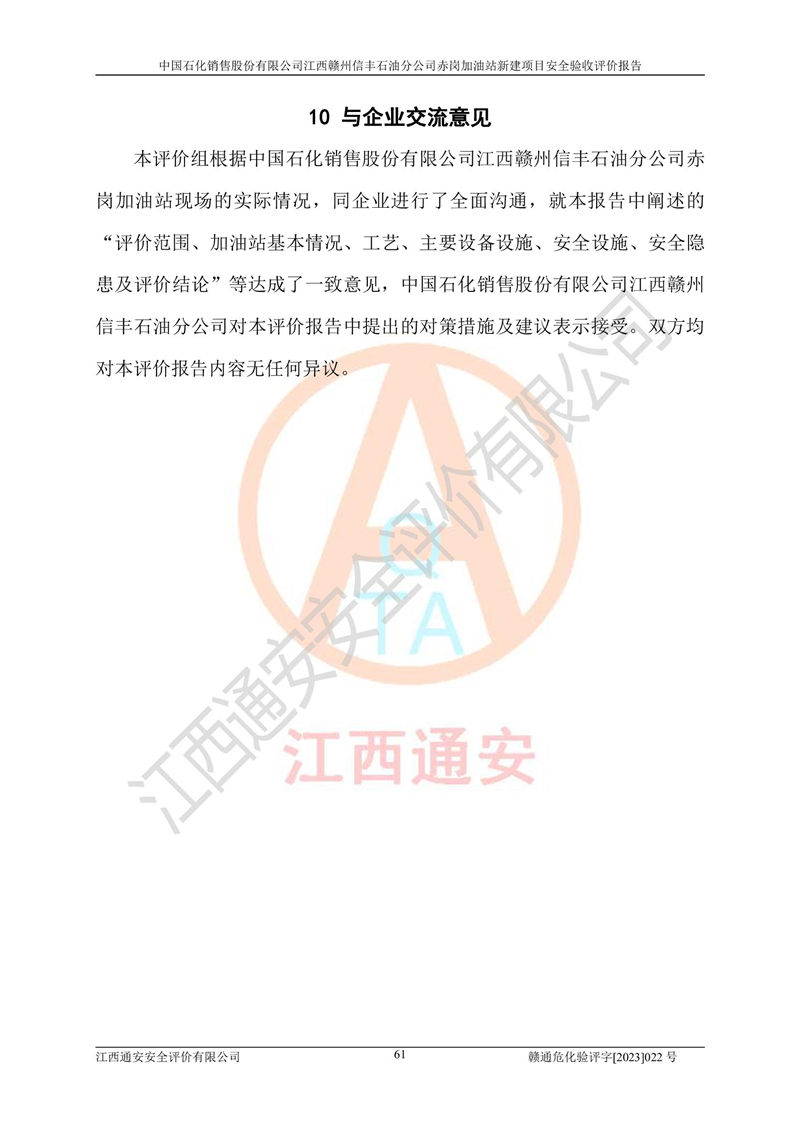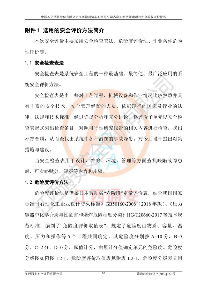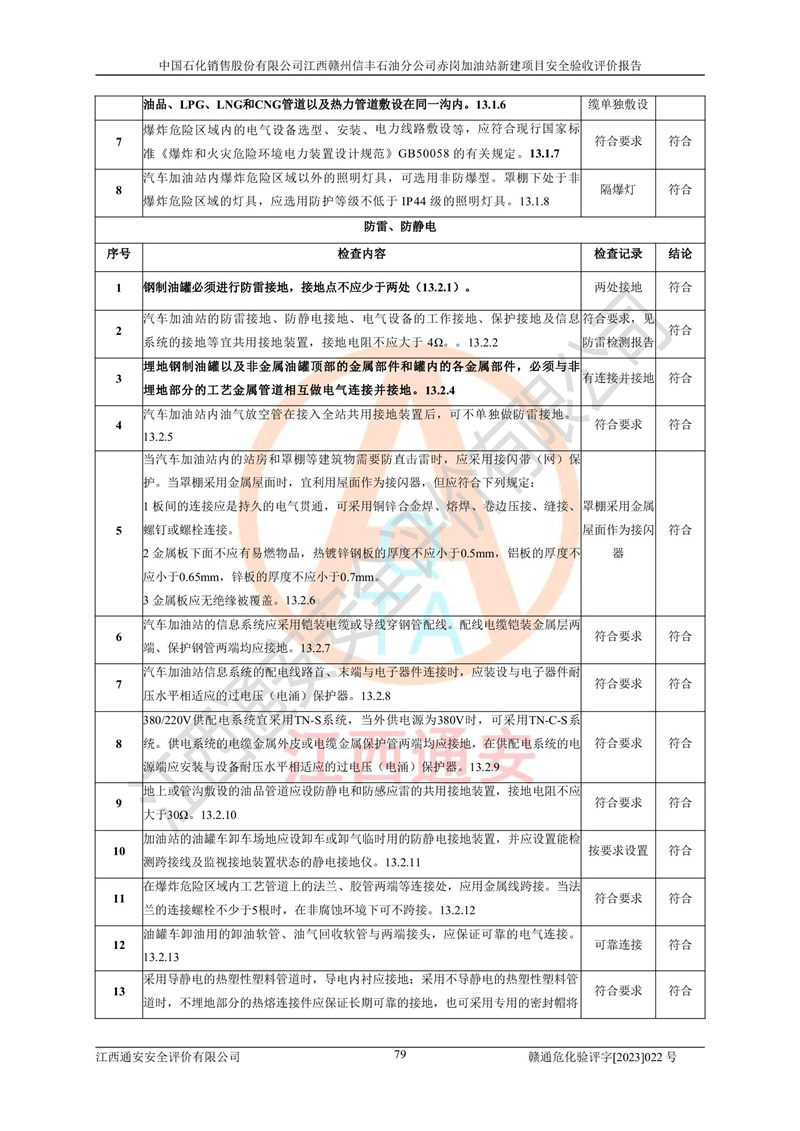 主要任務(wù) | 江西通安安全評價有限公司2023年5月13日組織安全評價人員,對中國石化銷售股份有限公司江西贛州信豐石油分公司赤崗加油站的現(xiàn)場以及提供的資料、文件進行了分析和討論,對評價人員進行了工作職責(zé)分工,并編制了現(xiàn)場安全檢查表。在委托方有關(guān)管理人員的陪同下,評價人員進行了現(xiàn)場安全設(shè)施檢驗和檢查,對中國石化銷售股份有限公司江西贛州信豐石油分公司赤崗加油站的安全設(shè)施和技術(shù)措施進行符合性和**性進行驗證,對安全生產(chǎn)管理狀況進行檢查,并提出安全生產(chǎn)方面的問題當(dāng)場與委托方相關(guān)人員進行了交流的基礎(chǔ)上,依據(jù)按照《安全評價通則》(AQ8001-2007)和《安全驗收評價導(dǎo)則》(AQ8003-2007)編制了《中國石化銷售股份有限公司江西贛州信豐石油分公司赤崗加油站安全驗收報告》。 | ||||