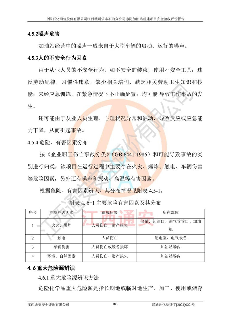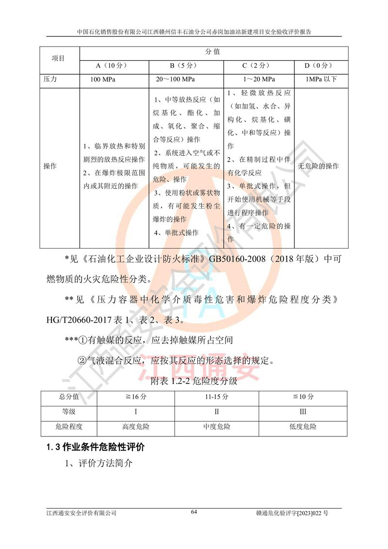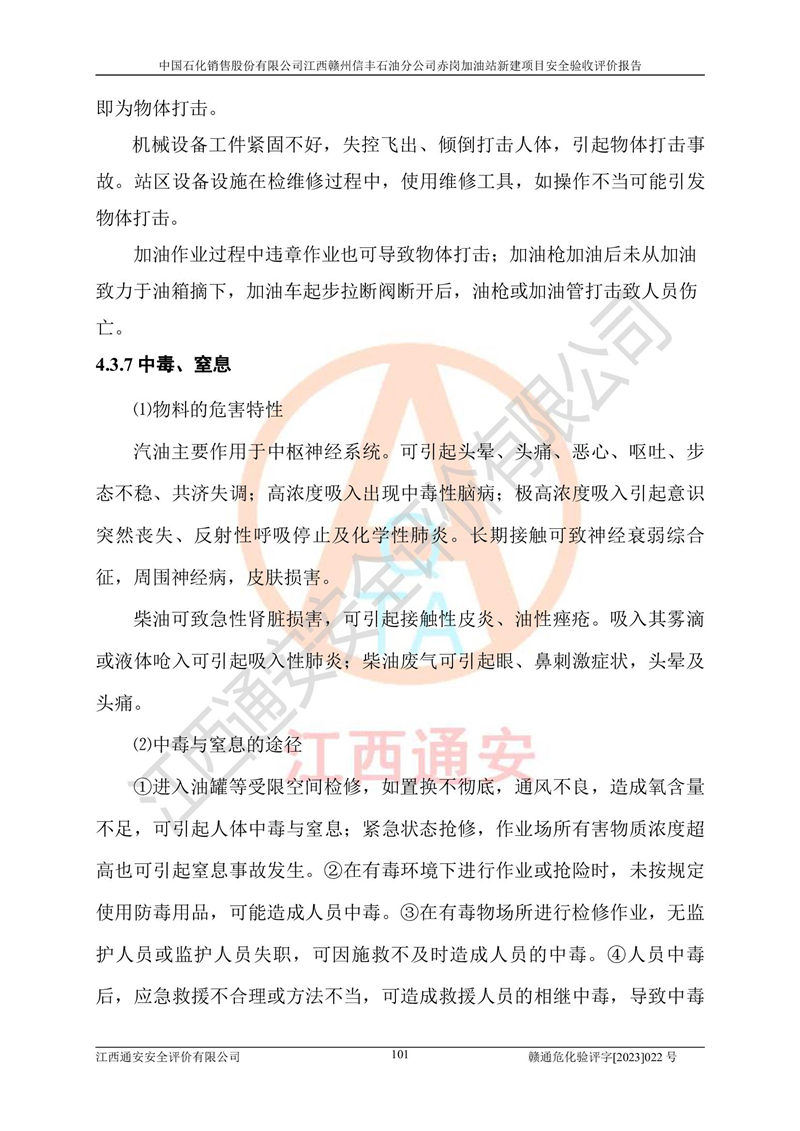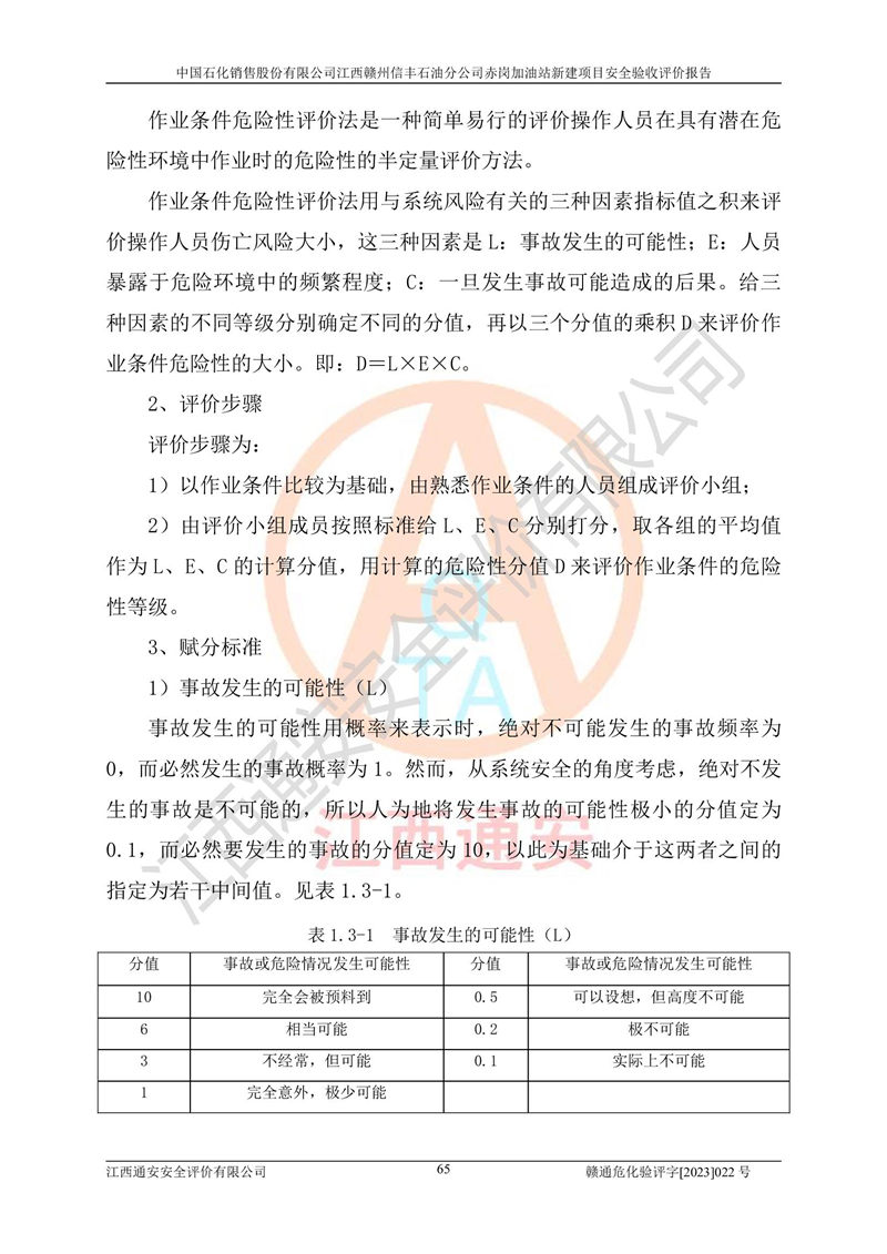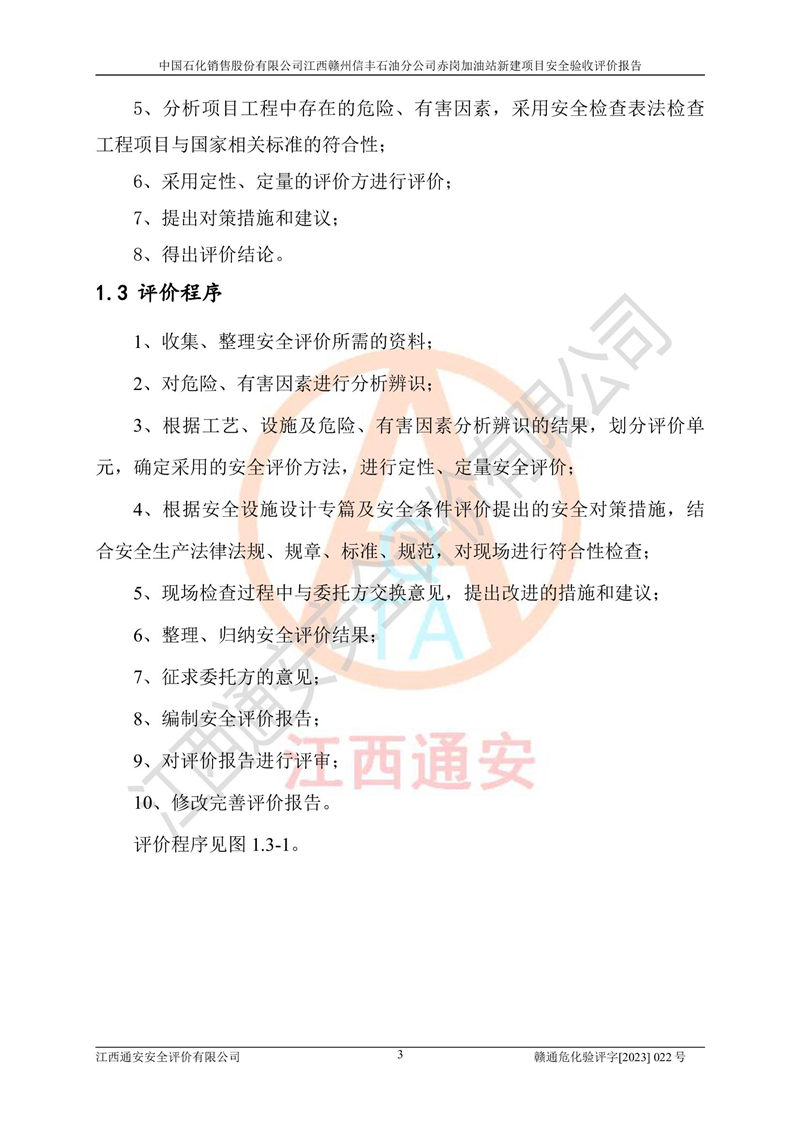 主要任務(wù) | 江西通安安全評價有限公司2023年5月13日組織安全評價人員,對中國石化銷售股份有限公司江西贛州信豐石油分公司赤崗加油站的現(xiàn)場以及提供的資料、文件進行了分析和討論,對評價人員進行了工作職責(zé)分工,并編制了現(xiàn)場安全檢查表。在委托方有關(guān)管理人員的陪同下,評價人員進行了現(xiàn)場安全設(shè)施檢驗和檢查,對中國石化銷售股份有限公司江西贛州信豐石油分公司赤崗加油站的安全設(shè)施和技術(shù)措施進行符合性和**性進行驗證,對安全生產(chǎn)管理狀況進行檢查,并提出安全生產(chǎn)方面的問題當(dāng)場與委托方相關(guān)人員進行了交流的基礎(chǔ)上,依據(jù)按照《安全評價通則》(AQ8001-2007)和《安全驗收評價導(dǎo)則》(AQ8003-2007)編制了《中國石化銷售股份有限公司江西贛州信豐石油分公司赤崗加油站安全驗收報告》。 | ||||