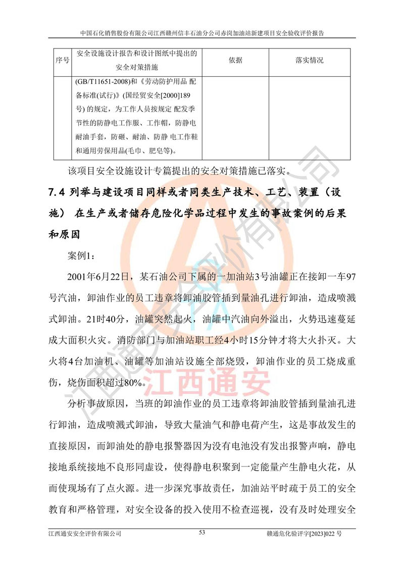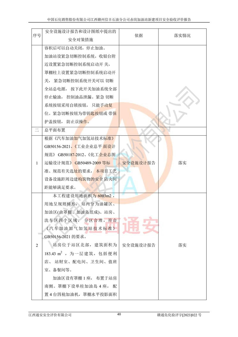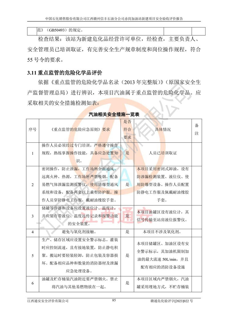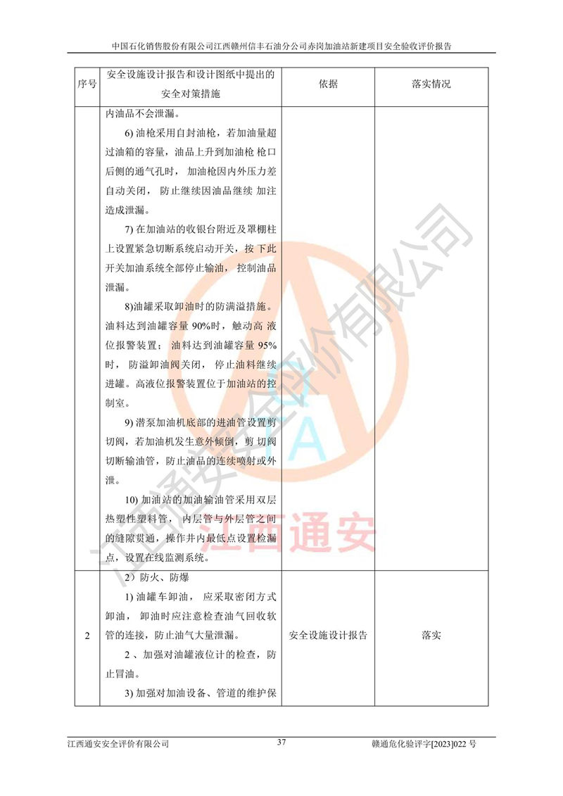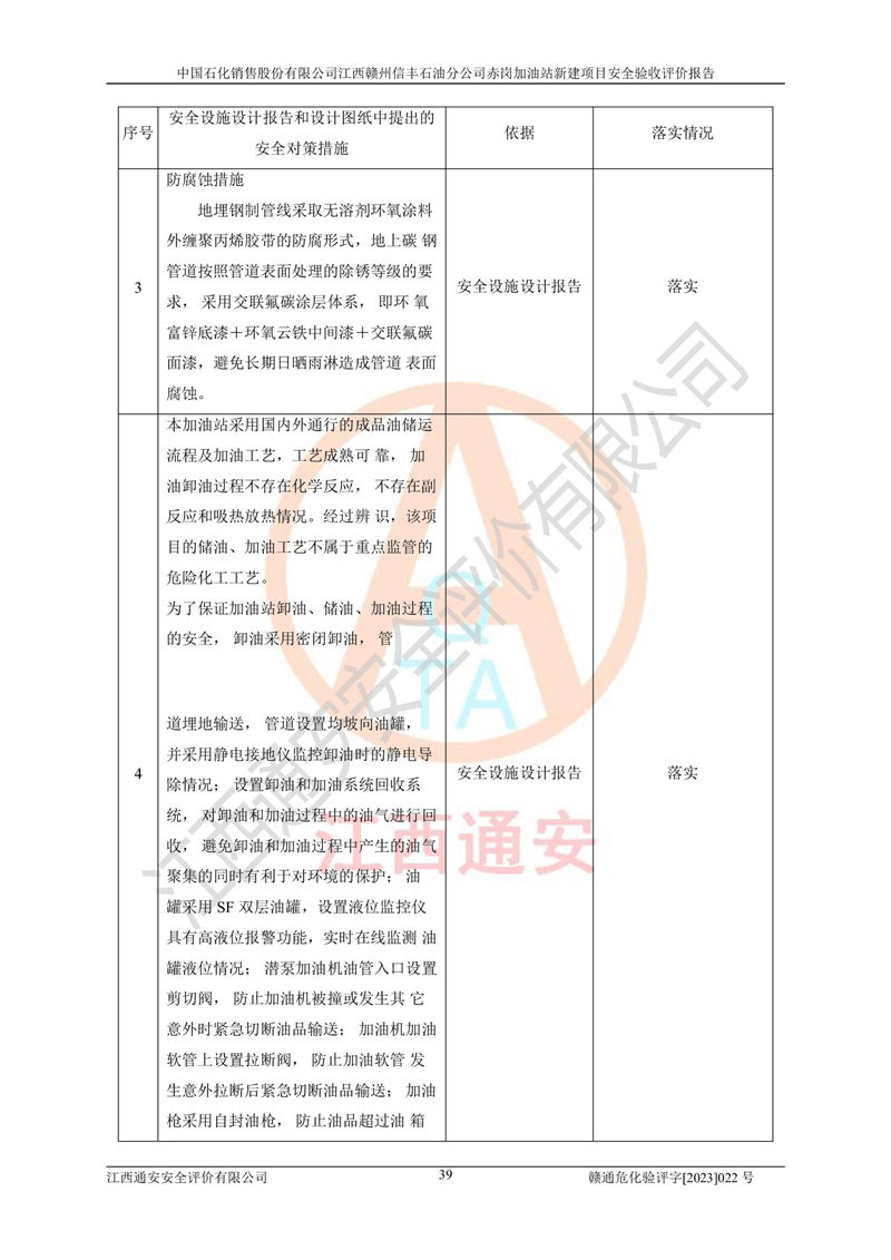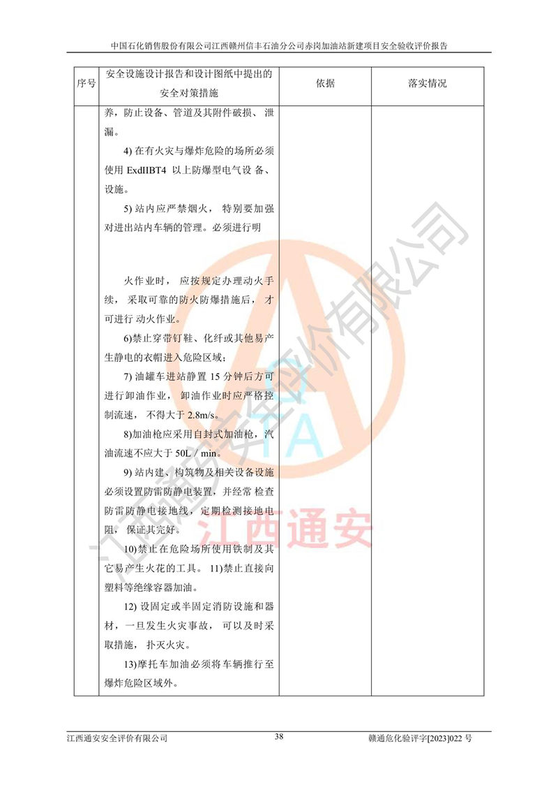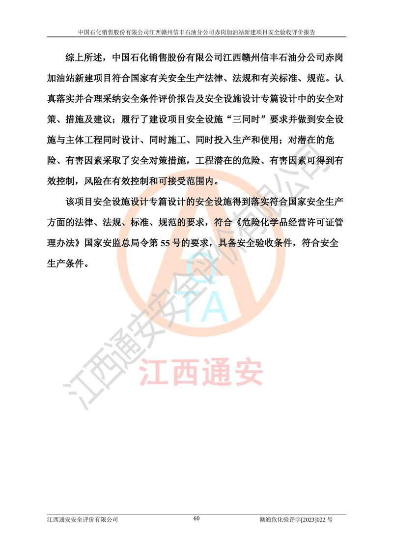 其它 | 中國石化銷售股份有限公司江西贛州信豐石油分公司赤崗加油站新建項目符合**有關(guān)安全生產(chǎn)法律、法規(guī)和有關(guān)標(biāo)準(zhǔn)、規(guī)范。認(rèn)真落實并合理采納安全條件評價報告及安全設(shè)施設(shè)計專篇設(shè)計中的安全對策、措施及建議;履行了建設(shè)項目安全設(shè)施“三同時”要求并做到安全設(shè)施與主體工程同時設(shè)計、同時施工、同時投入生產(chǎn)和使用;對潛在的危險、有害因素采取了安全對策措施,工程潛在的危險、有害因素可得到**控制,風(fēng)險在**控制和可接受范圍內(nèi)。 該項目安全設(shè)施設(shè)計專篇設(shè)計的安全設(shè)施得到落實符合**安全生產(chǎn)方面的法律、法規(guī)、標(biāo)準(zhǔn)、規(guī)范的要求,符合《危險化學(xué)品經(jīng)營許可證管理辦法》**安監(jiān)總局令第55號的要求,具備安全驗收條件,符合安全生產(chǎn)條件。 | ||||