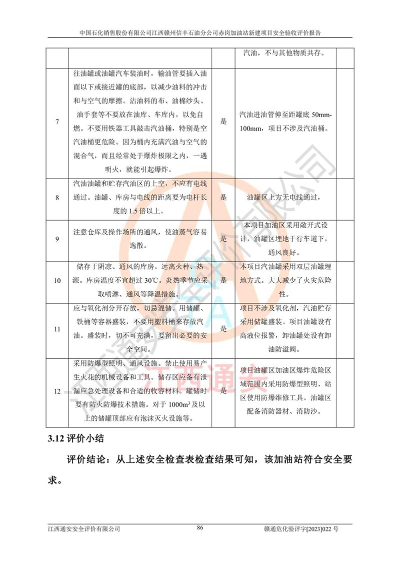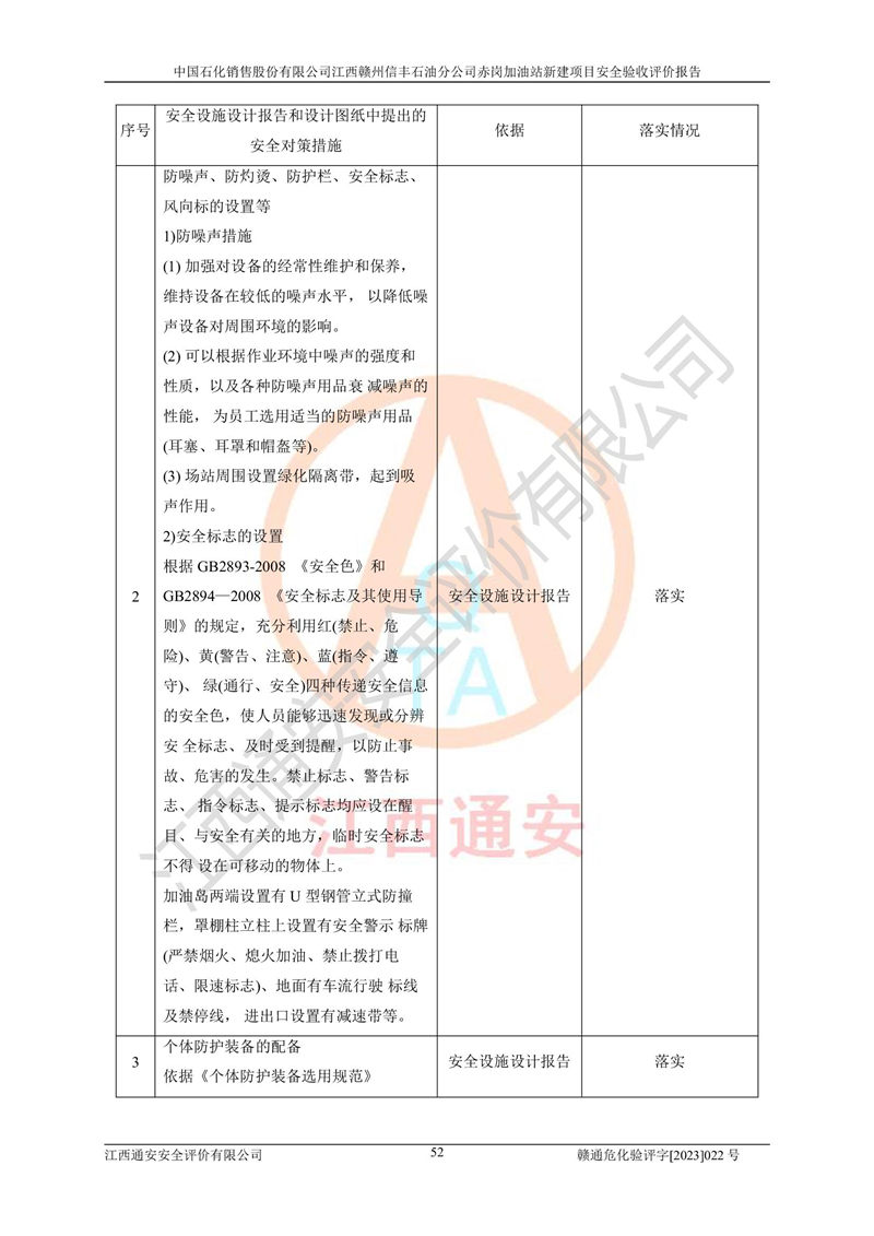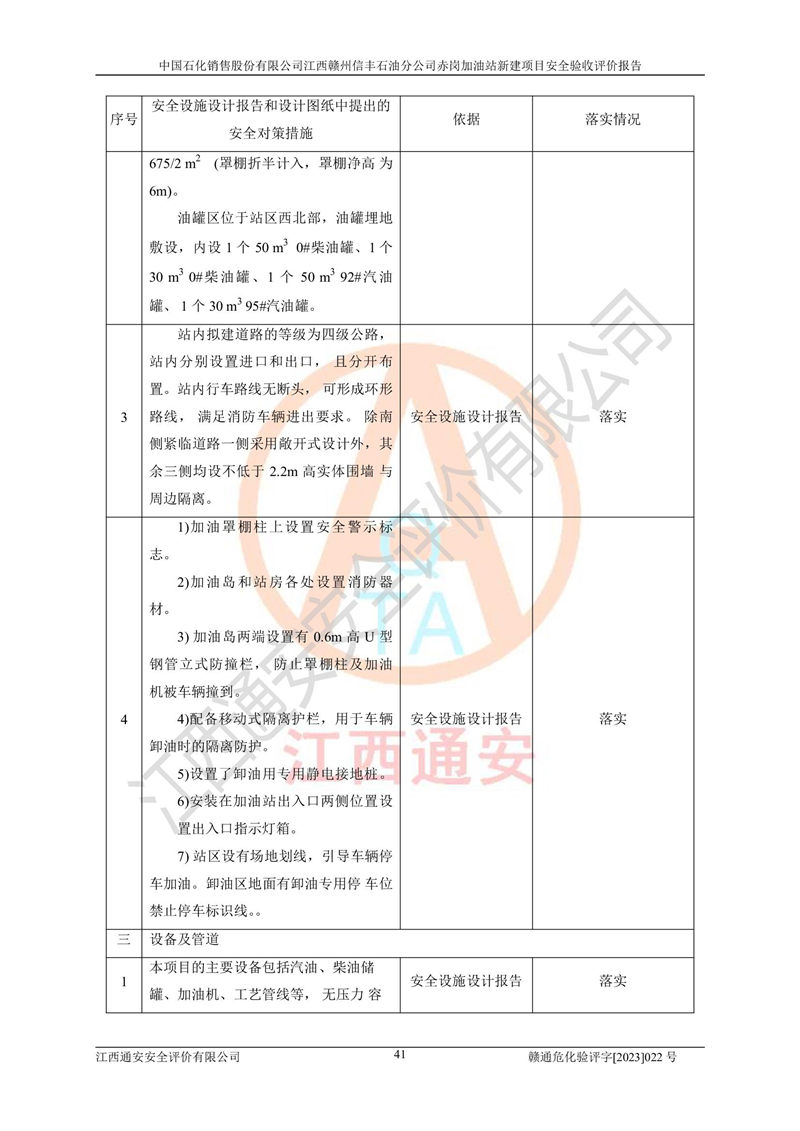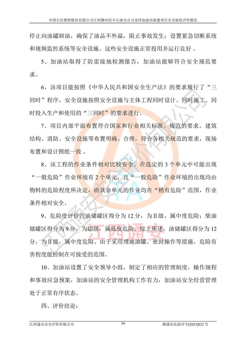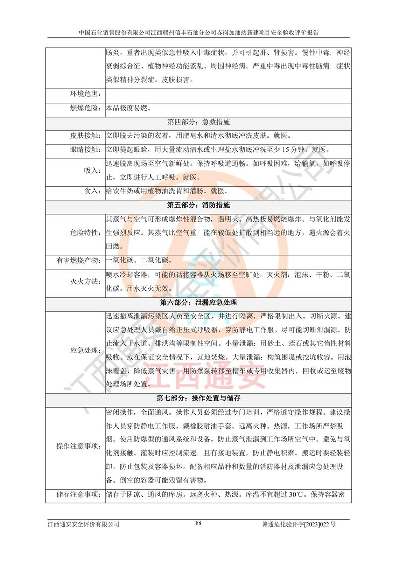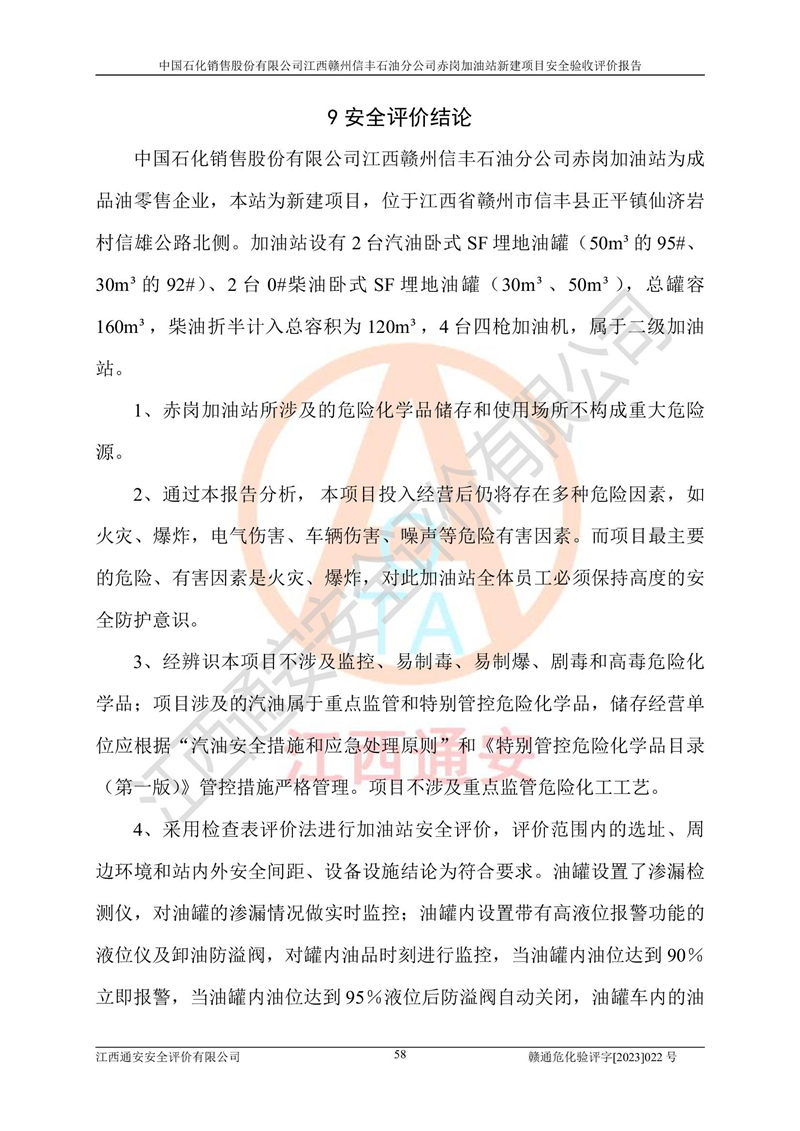 其它 | 中國石化銷售股份有限公司江西贛州信豐石油分公司赤崗加油站新建項目符合**有關(guān)安全生產(chǎn)法律、法規(guī)和有關(guān)標(biāo)準(zhǔn)、規(guī)范。認(rèn)真落實并合理采納安全條件評價報告及安全設(shè)施設(shè)計專篇設(shè)計中的安全對策、措施及建議;履行了建設(shè)項目安全設(shè)施“三同時”要求并做到安全設(shè)施與主體工程同時設(shè)計、同時施工、同時投入生產(chǎn)和使用;對潛在的危險、有害因素采取了安全對策措施,工程潛在的危險、有害因素可得到**控制,風(fēng)險在**控制和可接受范圍內(nèi)。 該項目安全設(shè)施設(shè)計專篇設(shè)計的安全設(shè)施得到落實符合**安全生產(chǎn)方面的法律、法規(guī)、標(biāo)準(zhǔn)、規(guī)范的要求,符合《危險化學(xué)品經(jīng)營許可證管理辦法》**安監(jiān)總局令第55號的要求,具備安全驗收條件,符合安全生產(chǎn)條件。 | ||||