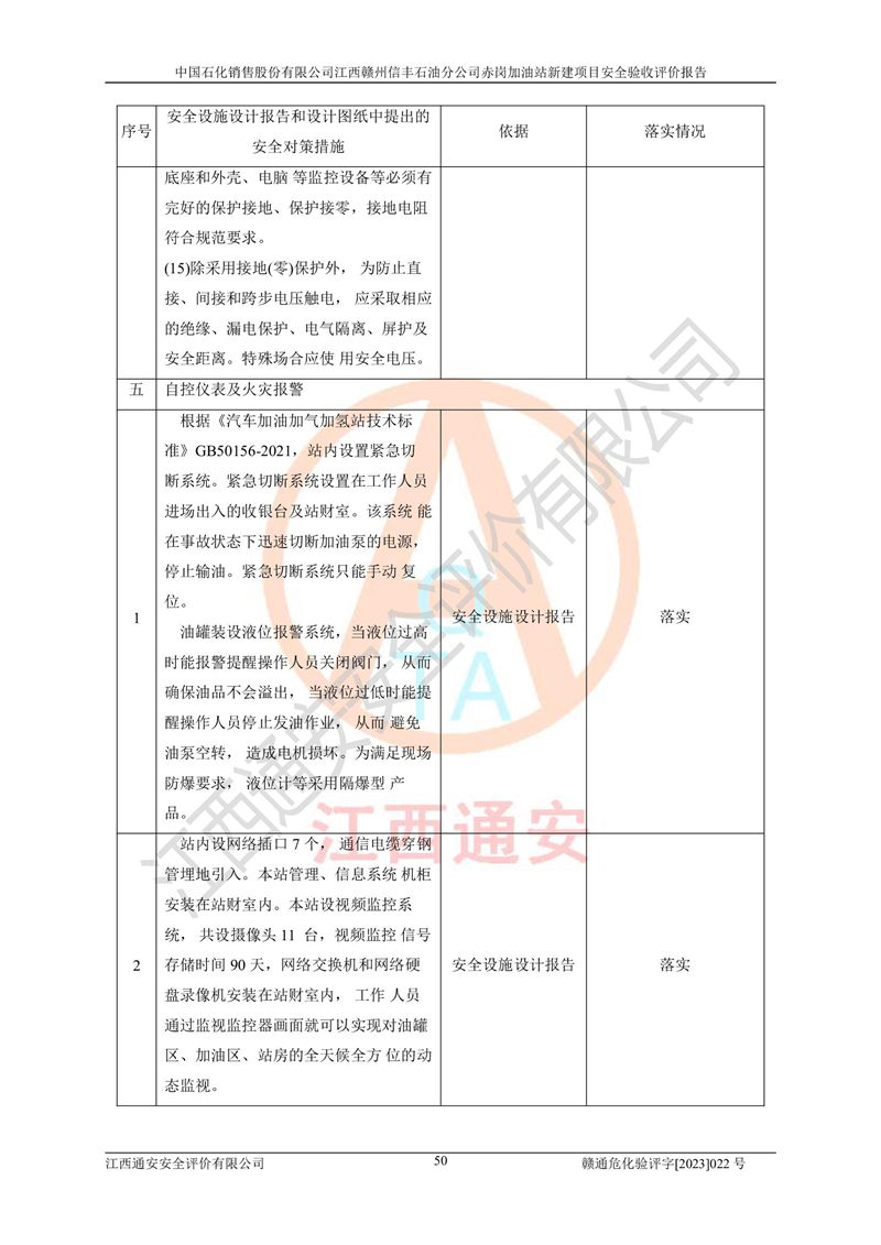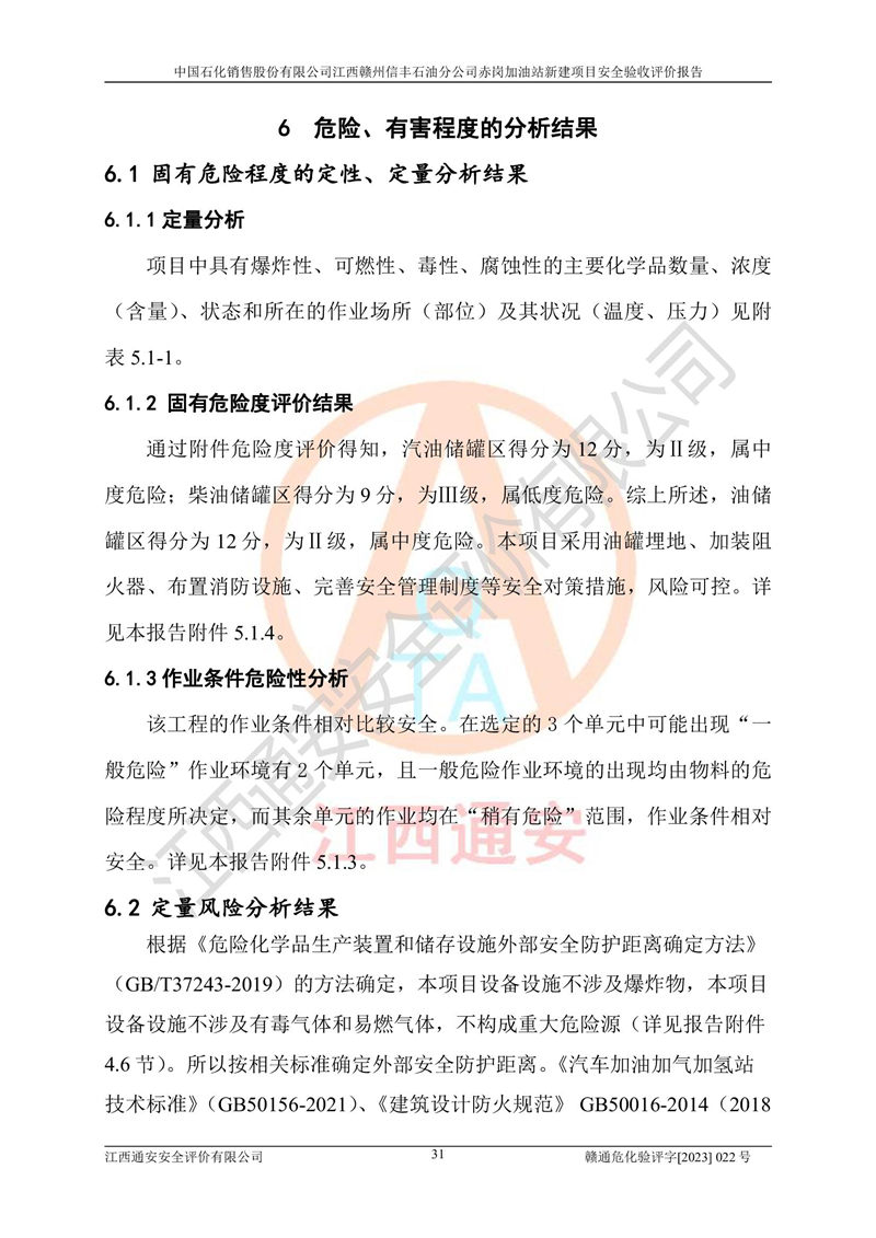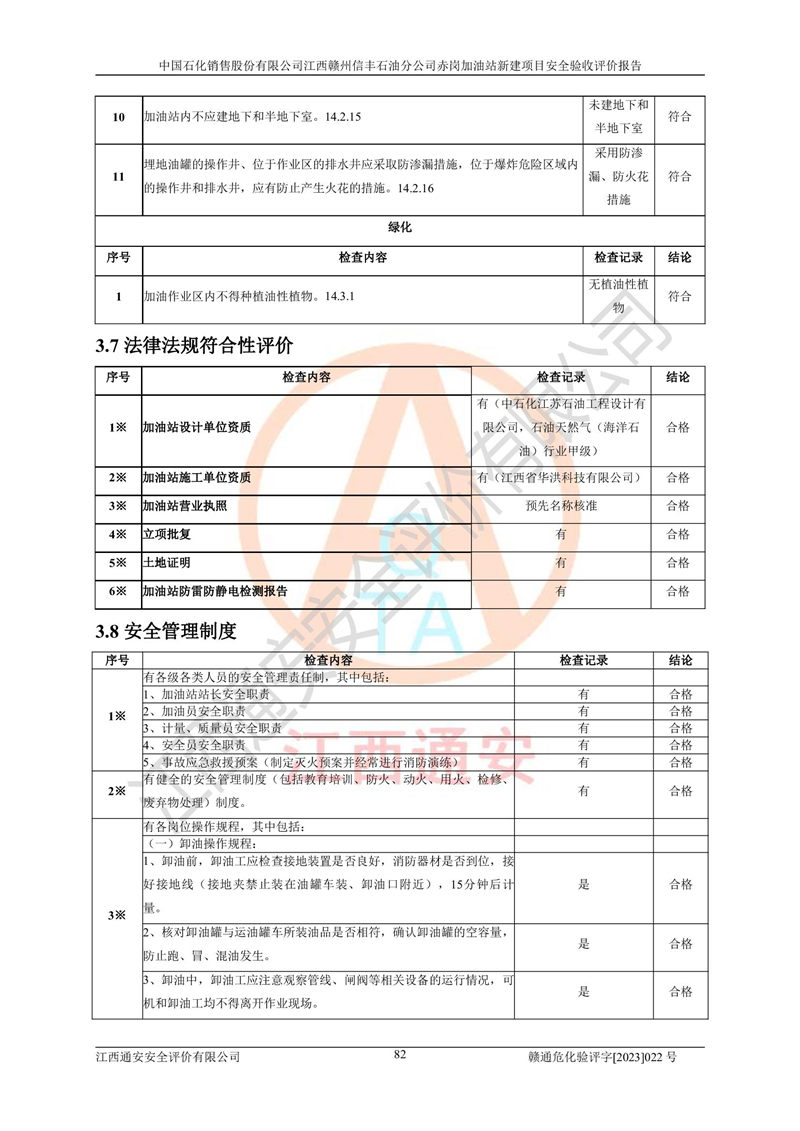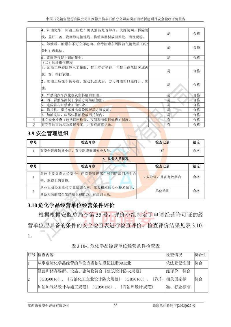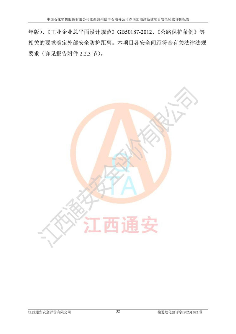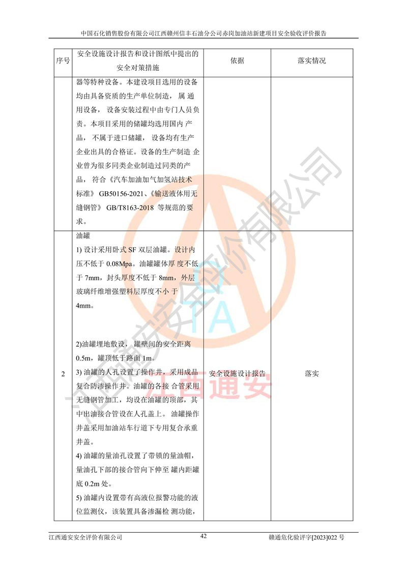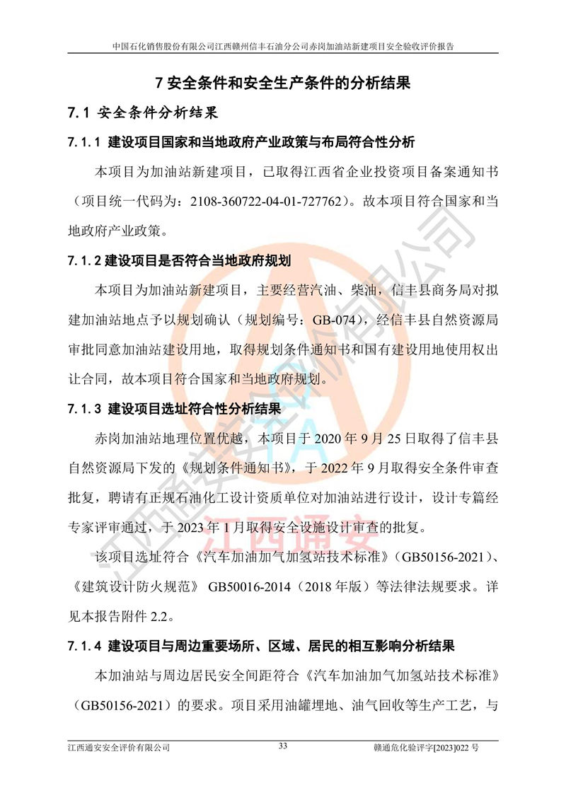 其它 | 中國石化銷售股份有限公司江西贛州信豐石油分公司赤崗加油站新建項目符合**有關(guān)安全生產(chǎn)法律、法規(guī)和有關(guān)標(biāo)準(zhǔn)、規(guī)范。認(rèn)真落實并合理采納安全條件評價報告及安全設(shè)施設(shè)計專篇設(shè)計中的安全對策、措施及建議;履行了建設(shè)項目安全設(shè)施“三同時”要求并做到安全設(shè)施與主體工程同時設(shè)計、同時施工、同時投入生產(chǎn)和使用;對潛在的危險、有害因素采取了安全對策措施,工程潛在的危險、有害因素可得到**控制,風(fēng)險在**控制和可接受范圍內(nèi)。 該項目安全設(shè)施設(shè)計專篇設(shè)計的安全設(shè)施得到落實符合**安全生產(chǎn)方面的法律、法規(guī)、標(biāo)準(zhǔn)、規(guī)范的要求,符合《危險化學(xué)品經(jīng)營許可證管理辦法》**安監(jiān)總局令第55號的要求,具備安全驗收條件,符合安全生產(chǎn)條件。 | ||||