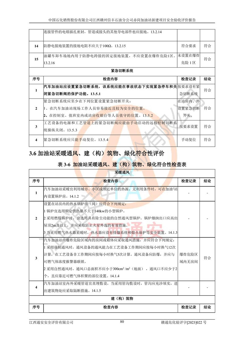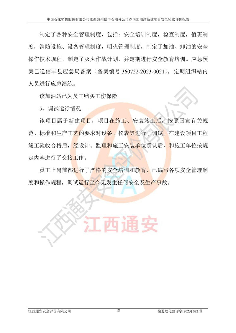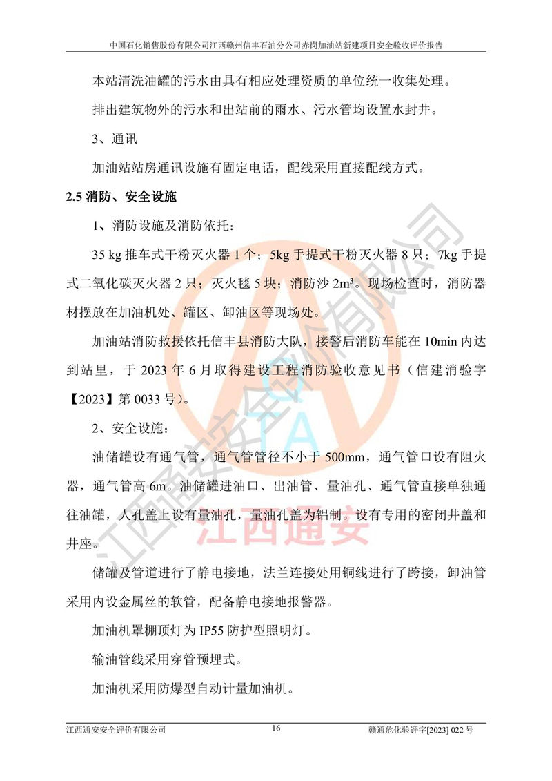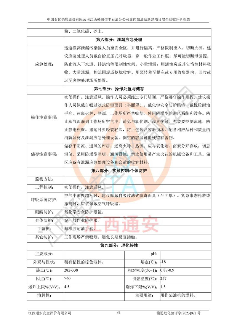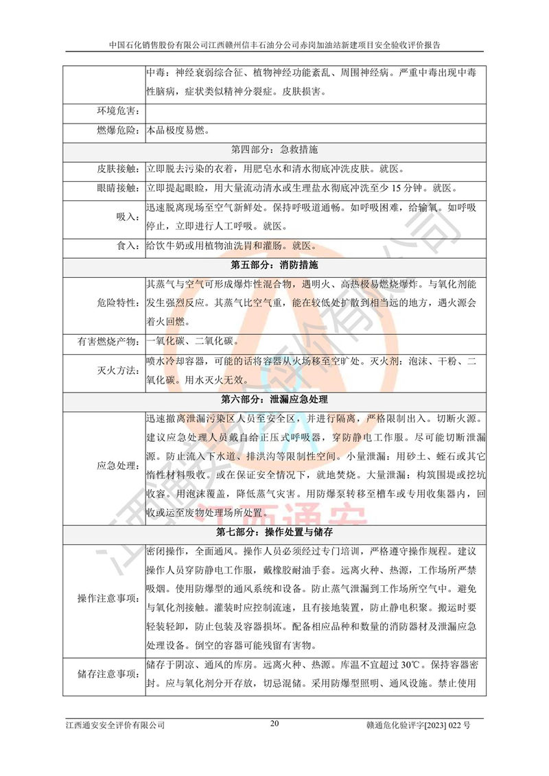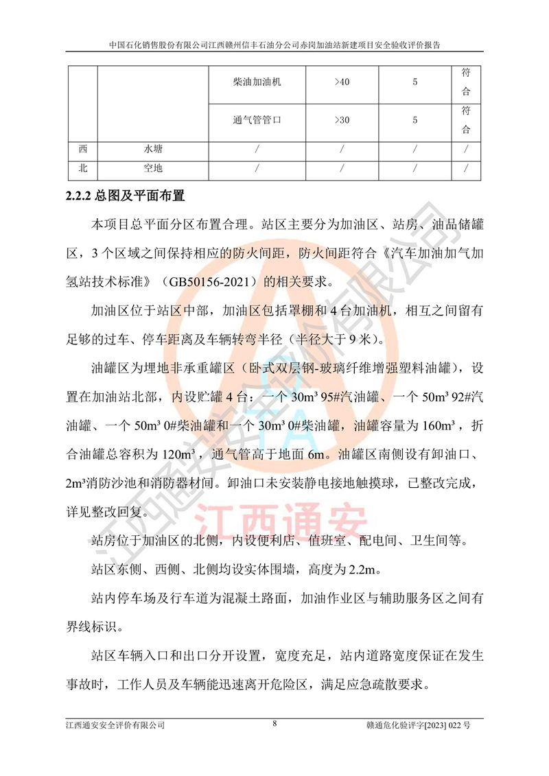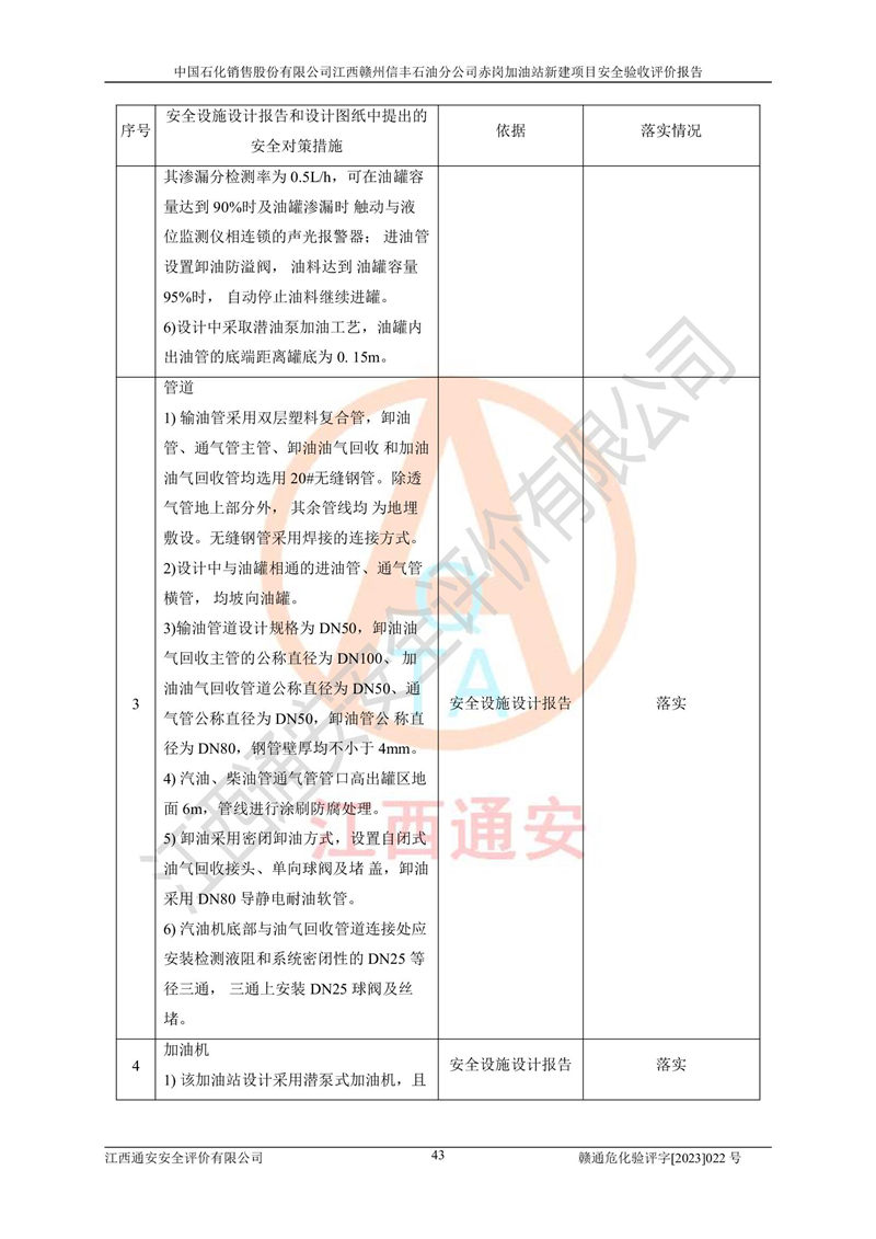 其它 | 中國石化銷售股份有限公司江西贛州信豐石油分公司赤崗加油站新建項目符合**有關(guān)安全生產(chǎn)法律、法規(guī)和有關(guān)標(biāo)準(zhǔn)、規(guī)范。認(rèn)真落實并合理采納安全條件評價報告及安全設(shè)施設(shè)計專篇設(shè)計中的安全對策、措施及建議;履行了建設(shè)項目安全設(shè)施“三同時”要求并做到安全設(shè)施與主體工程同時設(shè)計、同時施工、同時投入生產(chǎn)和使用;對潛在的危險、有害因素采取了安全對策措施,工程潛在的危險、有害因素可得到**控制,風(fēng)險在**控制和可接受范圍內(nèi)。 該項目安全設(shè)施設(shè)計專篇設(shè)計的安全設(shè)施得到落實符合**安全生產(chǎn)方面的法律、法規(guī)、標(biāo)準(zhǔn)、規(guī)范的要求,符合《危險化學(xué)品經(jīng)營許可證管理辦法》**安監(jiān)總局令第55號的要求,具備安全驗收條件,符合安全生產(chǎn)條件。 | ||||