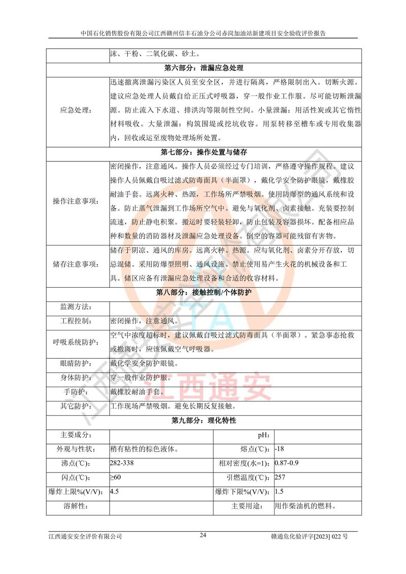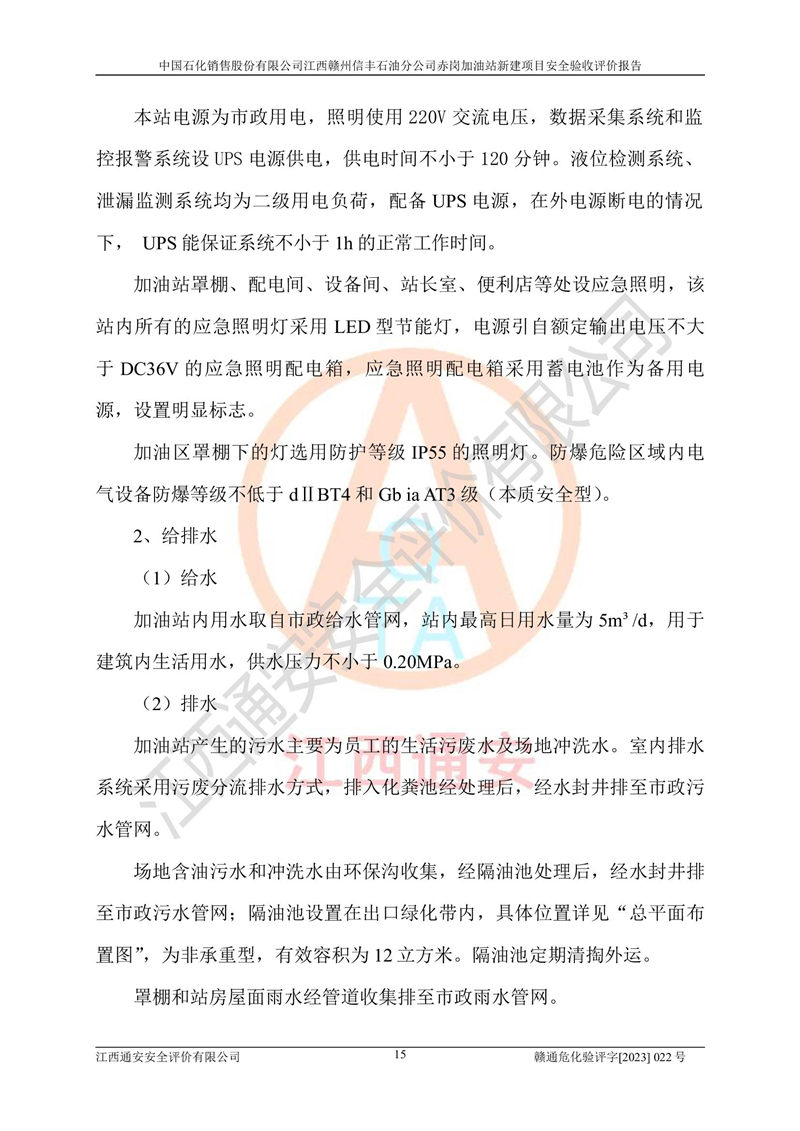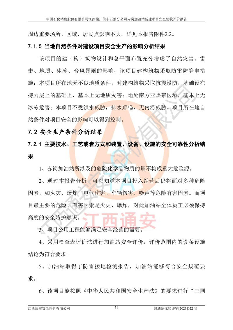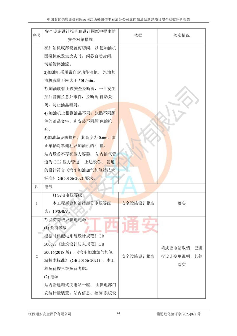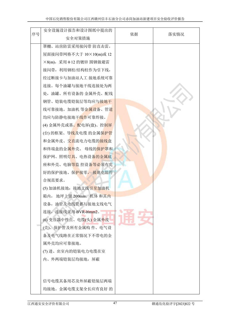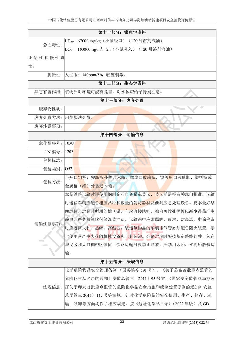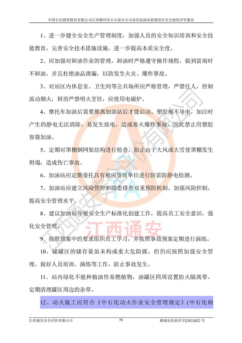 其它 | 中國石化銷售股份有限公司江西贛州信豐石油分公司赤崗加油站新建項目符合**有關(guān)安全生產(chǎn)法律、法規(guī)和有關(guān)標(biāo)準(zhǔn)、規(guī)范。認(rèn)真落實并合理采納安全條件評價報告及安全設(shè)施設(shè)計專篇設(shè)計中的安全對策、措施及建議;履行了建設(shè)項目安全設(shè)施“三同時”要求并做到安全設(shè)施與主體工程同時設(shè)計、同時施工、同時投入生產(chǎn)和使用;對潛在的危險、有害因素采取了安全對策措施,工程潛在的危險、有害因素可得到**控制,風(fēng)險在**控制和可接受范圍內(nèi)。 該項目安全設(shè)施設(shè)計專篇設(shè)計的安全設(shè)施得到落實符合**安全生產(chǎn)方面的法律、法規(guī)、標(biāo)準(zhǔn)、規(guī)范的要求,符合《危險化學(xué)品經(jīng)營許可證管理辦法》**安監(jiān)總局令第55號的要求,具備安全驗收條件,符合安全生產(chǎn)條件。 | ||||