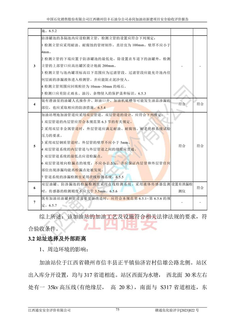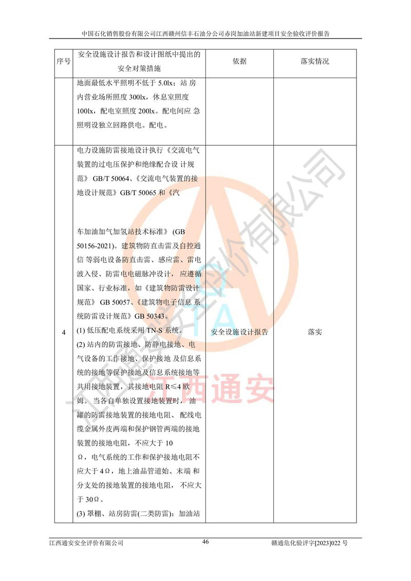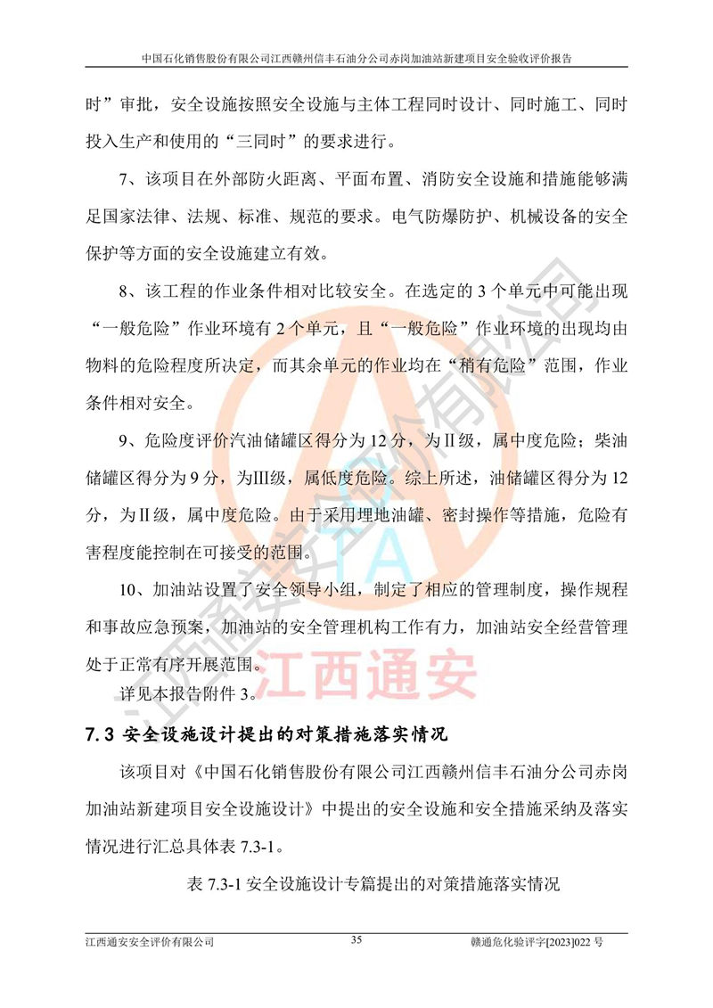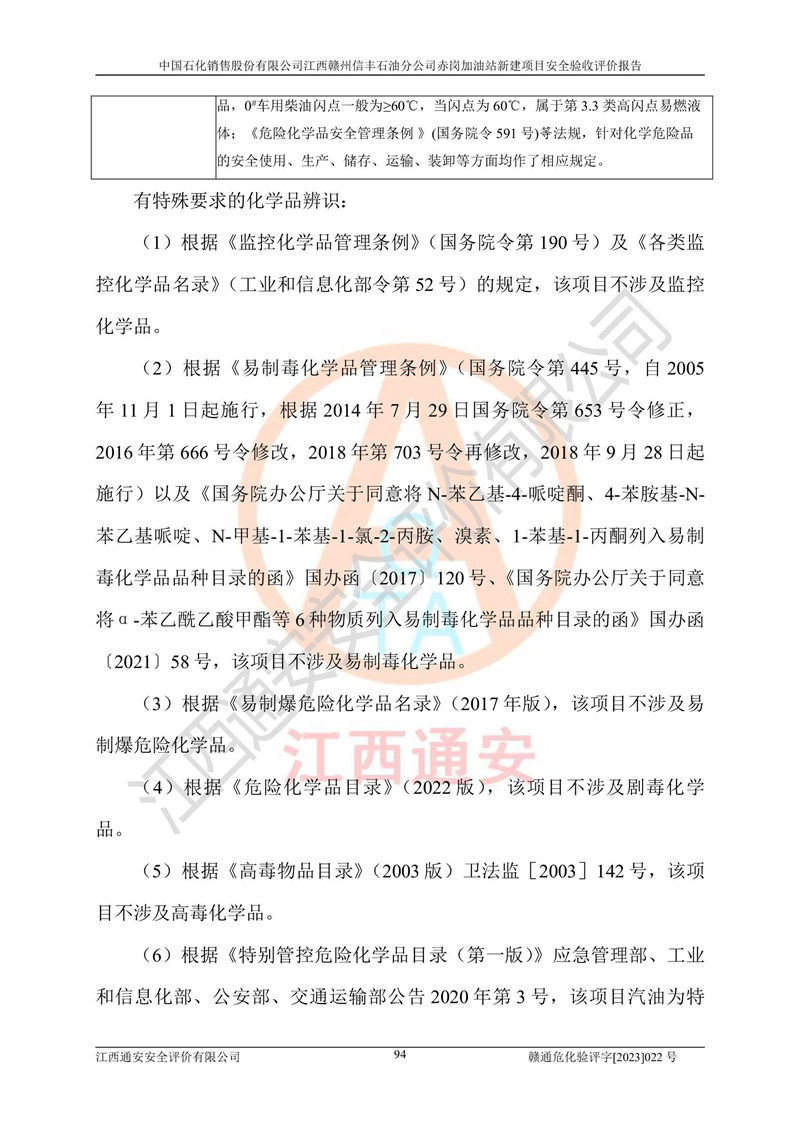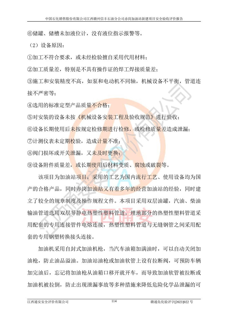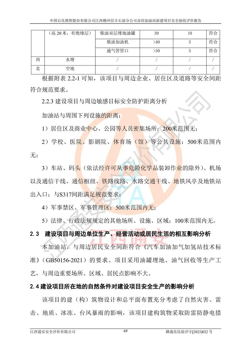 其它 | 中國石化銷售股份有限公司江西贛州信豐石油分公司赤崗加油站新建項目符合**有關(guān)安全生產(chǎn)法律、法規(guī)和有關(guān)標(biāo)準(zhǔn)、規(guī)范。認(rèn)真落實并合理采納安全條件評價報告及安全設(shè)施設(shè)計專篇設(shè)計中的安全對策、措施及建議;履行了建設(shè)項目安全設(shè)施“三同時”要求并做到安全設(shè)施與主體工程同時設(shè)計、同時施工、同時投入生產(chǎn)和使用;對潛在的危險、有害因素采取了安全對策措施,工程潛在的危險、有害因素可得到**控制,風(fēng)險在**控制和可接受范圍內(nèi)。 該項目安全設(shè)施設(shè)計專篇設(shè)計的安全設(shè)施得到落實符合**安全生產(chǎn)方面的法律、法規(guī)、標(biāo)準(zhǔn)、規(guī)范的要求,符合《危險化學(xué)品經(jīng)營許可證管理辦法》**安監(jiān)總局令第55號的要求,具備安全驗收條件,符合安全生產(chǎn)條件。 | ||||