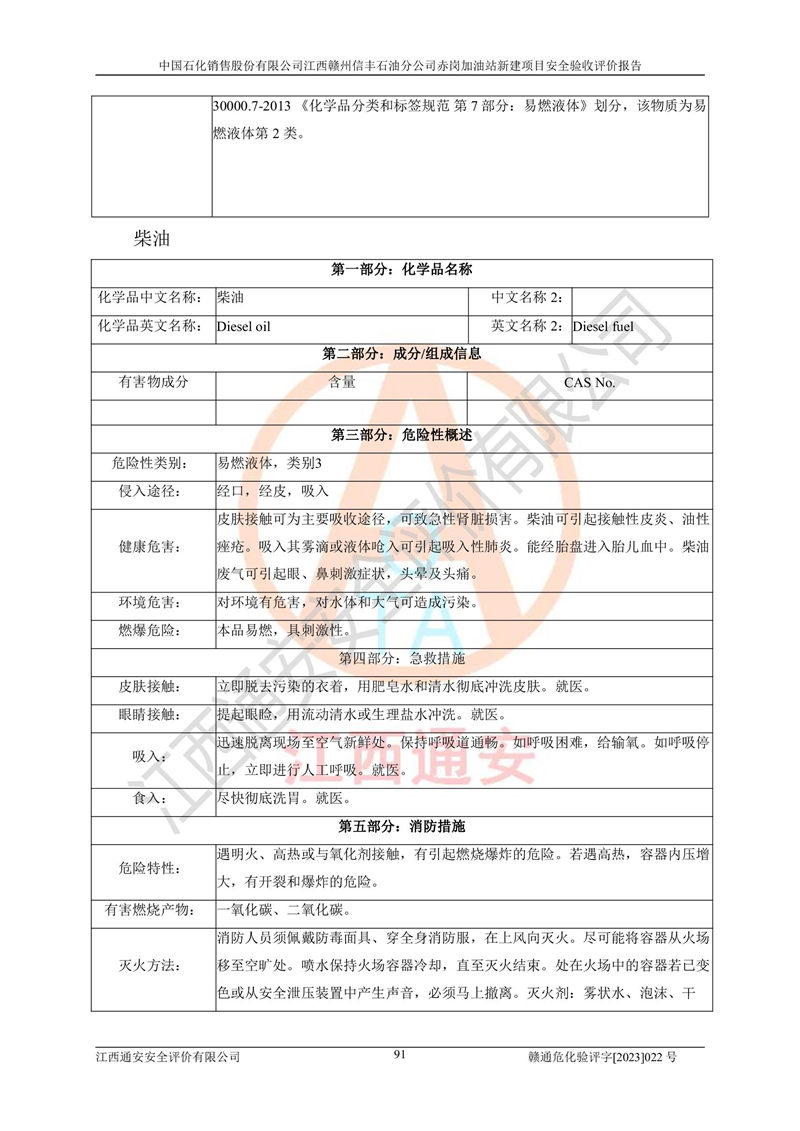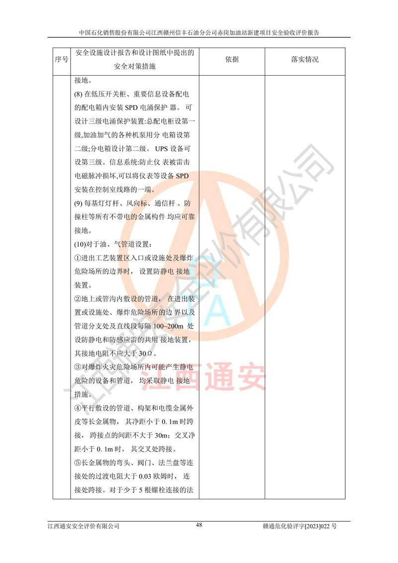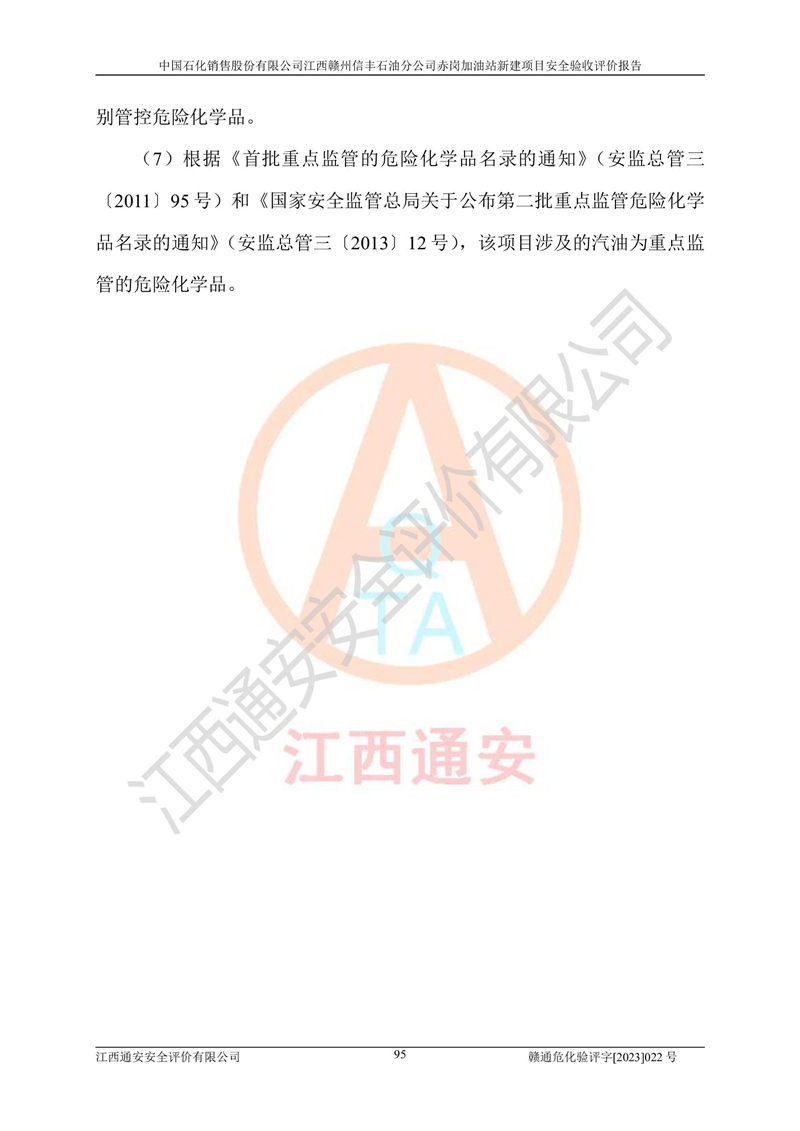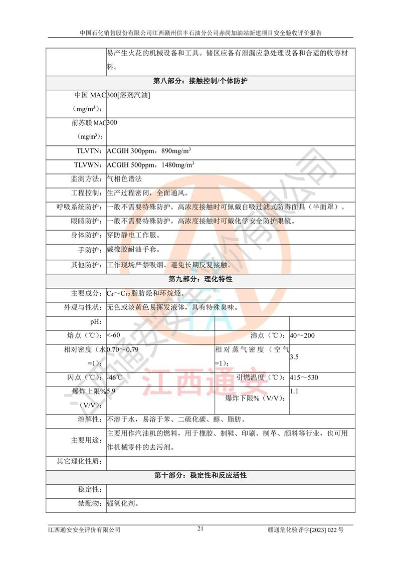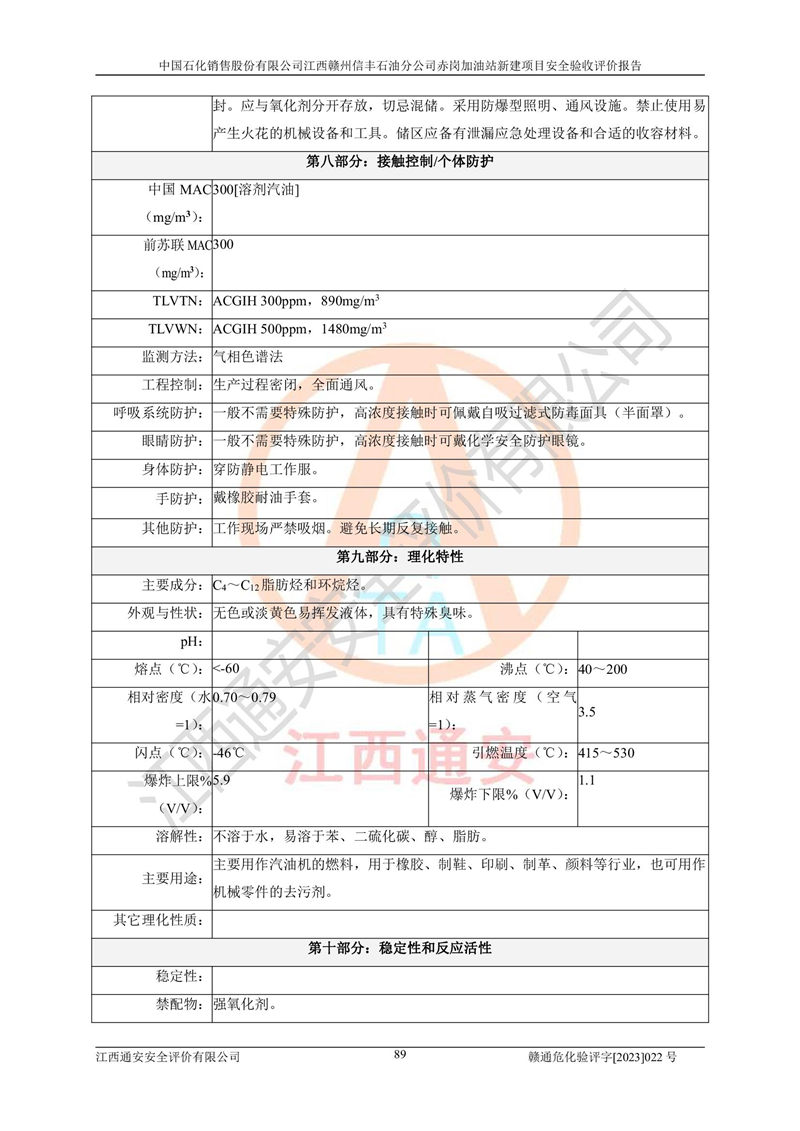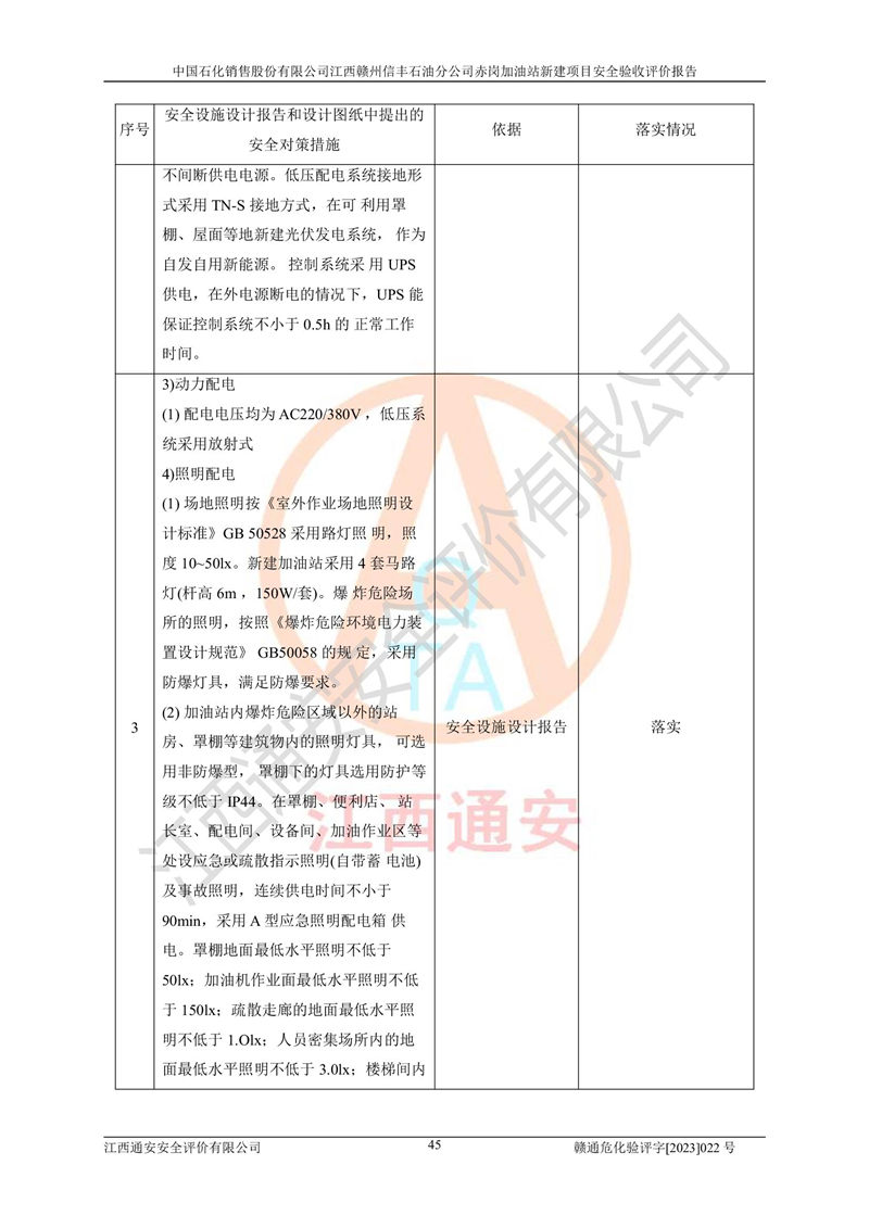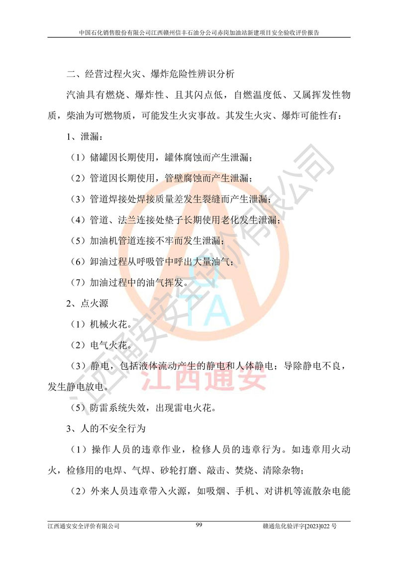 其它 | 中國石化銷售股份有限公司江西贛州信豐石油分公司赤崗加油站新建項目符合**有關(guān)安全生產(chǎn)法律、法規(guī)和有關(guān)標(biāo)準(zhǔn)、規(guī)范。認(rèn)真落實并合理采納安全條件評價報告及安全設(shè)施設(shè)計專篇設(shè)計中的安全對策、措施及建議;履行了建設(shè)項目安全設(shè)施“三同時”要求并做到安全設(shè)施與主體工程同時設(shè)計、同時施工、同時投入生產(chǎn)和使用;對潛在的危險、有害因素采取了安全對策措施,工程潛在的危險、有害因素可得到**控制,風(fēng)險在**控制和可接受范圍內(nèi)。 該項目安全設(shè)施設(shè)計專篇設(shè)計的安全設(shè)施得到落實符合**安全生產(chǎn)方面的法律、法規(guī)、標(biāo)準(zhǔn)、規(guī)范的要求,符合《危險化學(xué)品經(jīng)營許可證管理辦法》**安監(jiān)總局令第55號的要求,具備安全驗收條件,符合安全生產(chǎn)條件。 | ||||