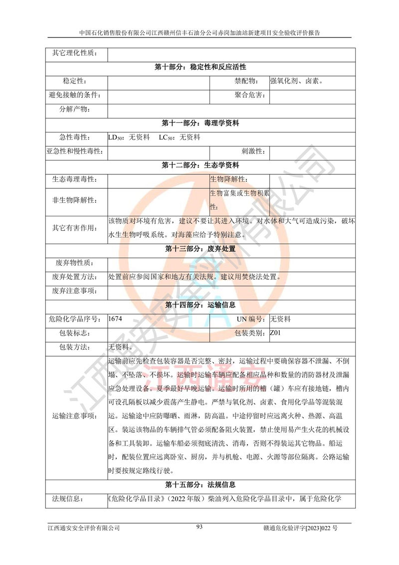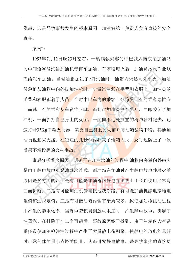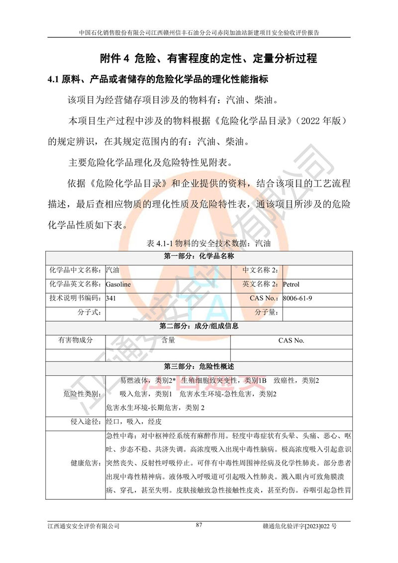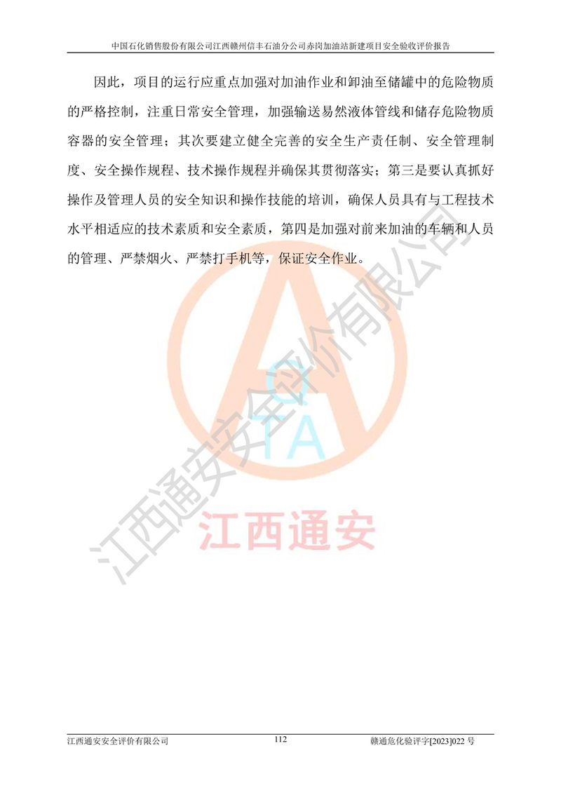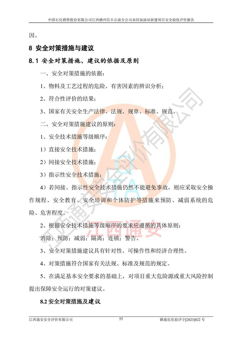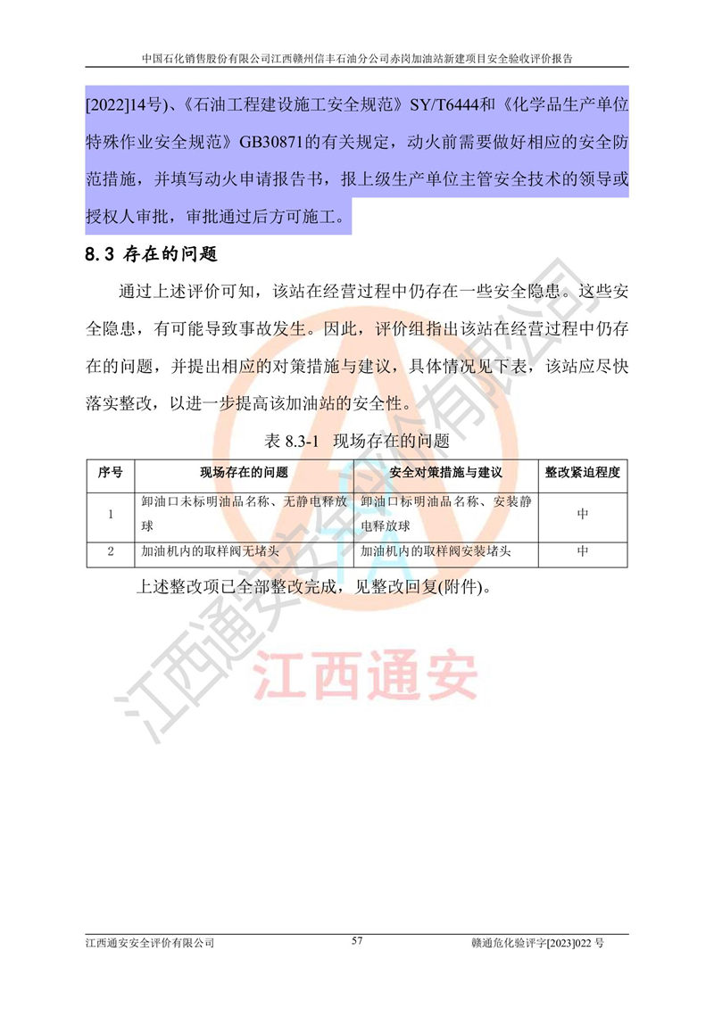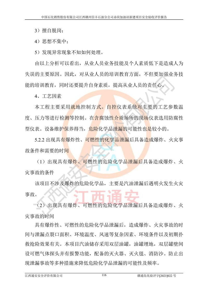 其它 | 中國石化銷售股份有限公司江西贛州信豐石油分公司赤崗加油站新建項目符合**有關(guān)安全生產(chǎn)法律、法規(guī)和有關(guān)標(biāo)準(zhǔn)、規(guī)范。認(rèn)真落實并合理采納安全條件評價報告及安全設(shè)施設(shè)計專篇設(shè)計中的安全對策、措施及建議;履行了建設(shè)項目安全設(shè)施“三同時”要求并做到安全設(shè)施與主體工程同時設(shè)計、同時施工、同時投入生產(chǎn)和使用;對潛在的危險、有害因素采取了安全對策措施,工程潛在的危險、有害因素可得到**控制,風(fēng)險在**控制和可接受范圍內(nèi)。 該項目安全設(shè)施設(shè)計專篇設(shè)計的安全設(shè)施得到落實符合**安全生產(chǎn)方面的法律、法規(guī)、標(biāo)準(zhǔn)、規(guī)范的要求,符合《危險化學(xué)品經(jīng)營許可證管理辦法》**安監(jiān)總局令第55號的要求,具備安全驗收條件,符合安全生產(chǎn)條件。 | ||||