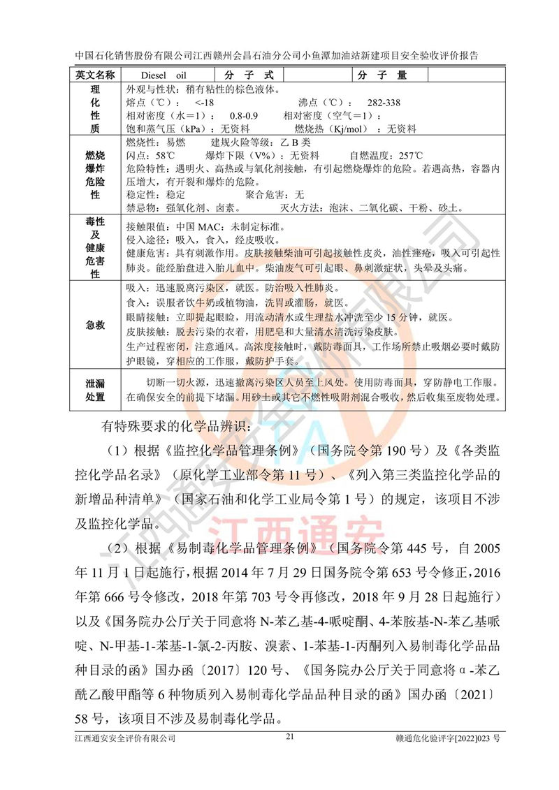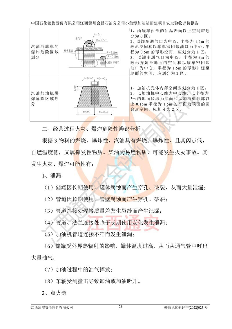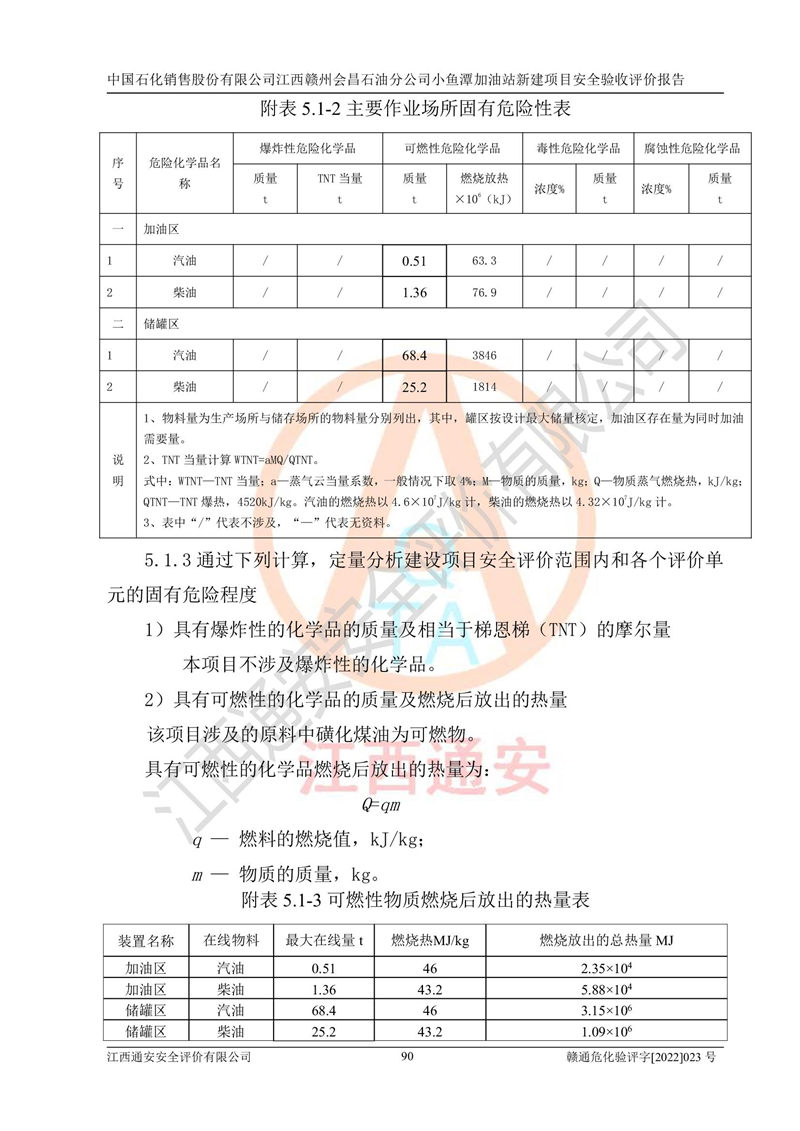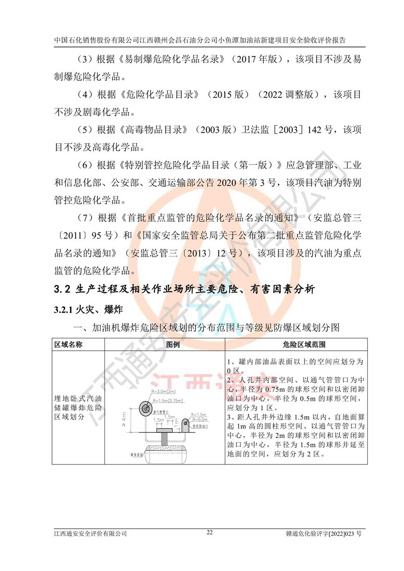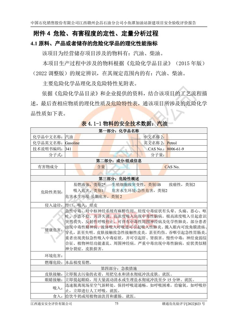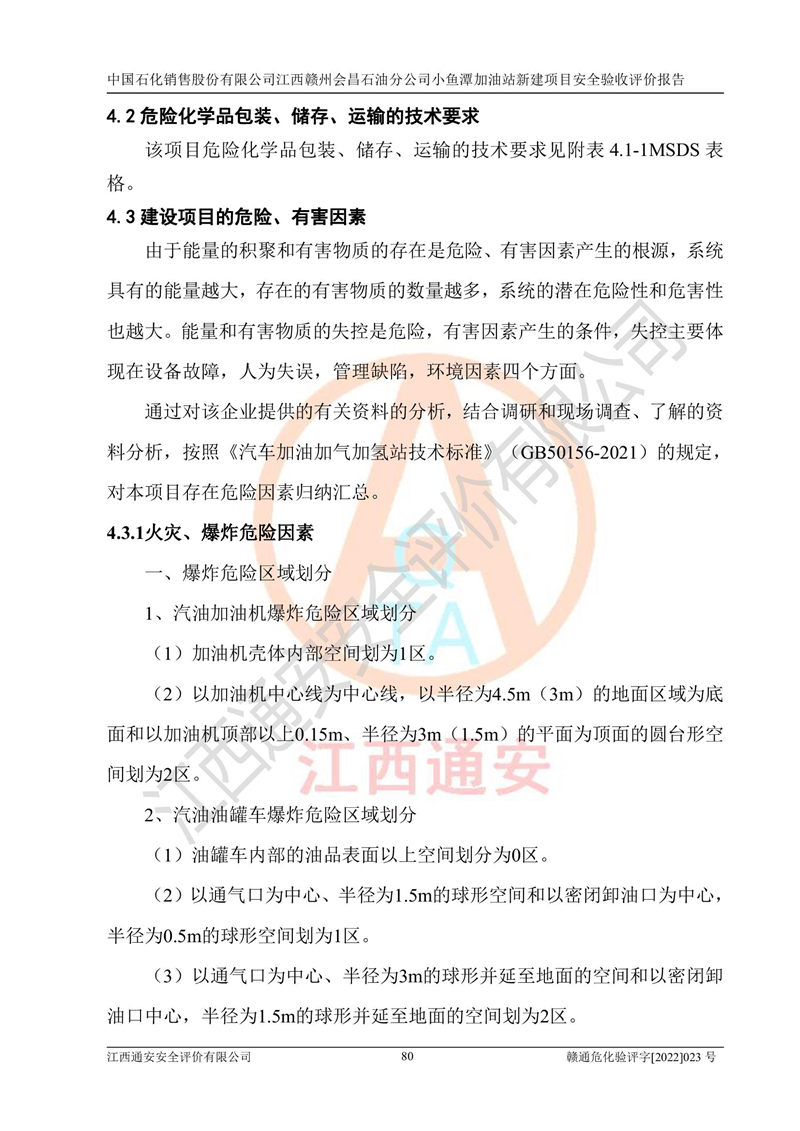 項(xiàng)目簡(jiǎn)介 | 本報(bào)告為中國石化銷售股份有限公司江西贛州會(huì)昌石油分公司小魚潭加油站(以下簡(jiǎn)稱小魚潭加油站)新建項(xiàng)目的安全驗(yàn)收評(píng)價(jià)報(bào)告。小魚潭加油站位于江西省贛州市會(huì)昌縣小魚潭B1-1地塊,湘西路和會(huì)南大道交叉口。中國石化銷售股份有限公司江西贛州會(huì)昌石油分公司法定**人為丁立柳,成立日期為2002年10月18日,統(tǒng)一社會(huì)信用代碼913607331608405786。經(jīng)營范圍為成品油(汽油、柴油)零售,該站于2020年10月10日取得贛州市行政審批局出具的《關(guān)于對(duì)興國縣等地新建加油站規(guī)劃確認(rèn)的通知》,由河北海川能源科技股份有限公司設(shè)計(jì)。本站設(shè)置30m3的柴油臥式SF雙層油罐、92#汽油臥式SF雙層油罐、95#汽油臥式SF雙層油罐和98#汽油臥式SF雙層油罐各1具,總罐容積為120m3,油儲(chǔ)容積為105m3(柴油折半),屬于二級(jí)加油站。 汽油、柴油均為危險(xiǎn)化學(xué)品,其蒸汽與空氣形成爆炸性氣體,遇明火、高熱易燃燒爆炸;柴油火險(xiǎn)分級(jí)為丙A類,遇明火、高熱或與氧化劑接觸,有引起燃燒爆炸的危險(xiǎn)。其中汽油火險(xiǎn)分級(jí)為甲B類,是重點(diǎn)監(jiān)和特別管控危險(xiǎn)化學(xué)品。因此,本項(xiàng)目存在的主要危險(xiǎn)有害因素是火災(zāi)爆炸。 | ||||