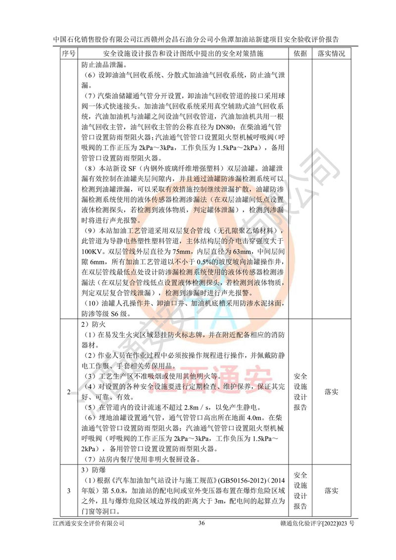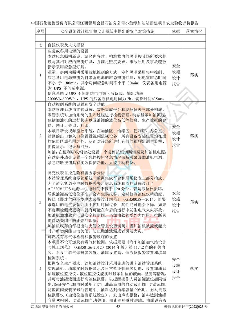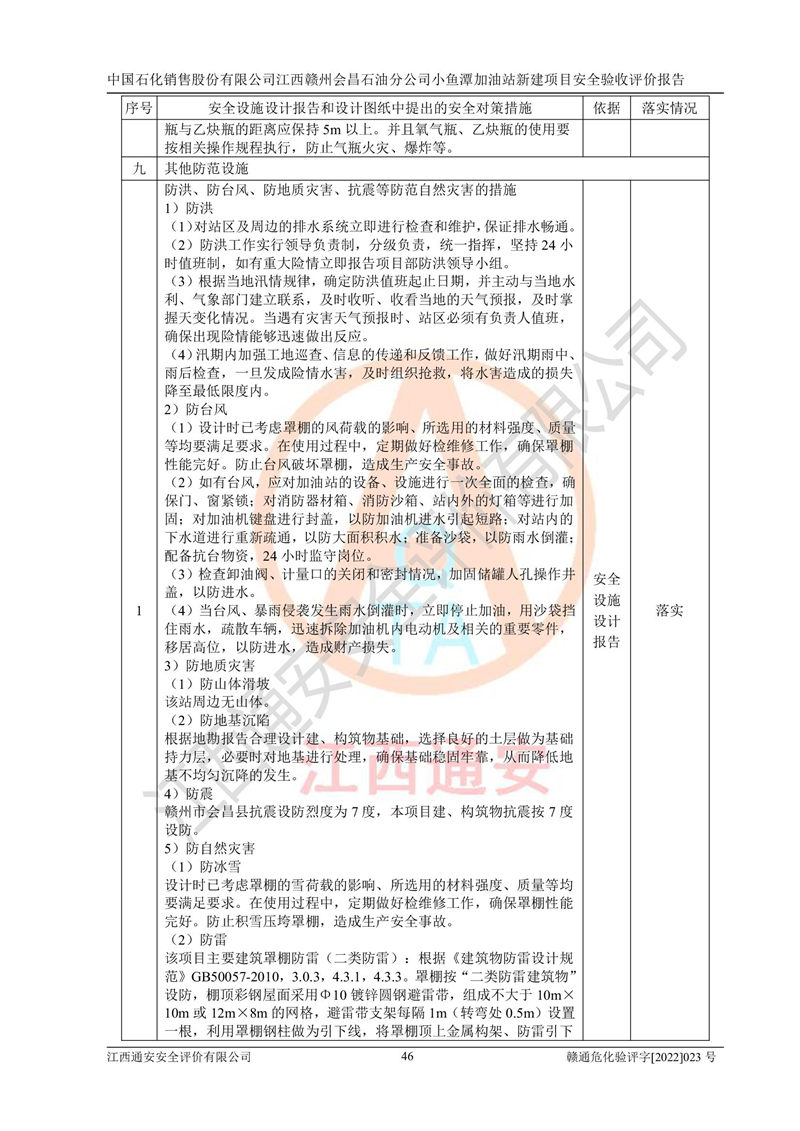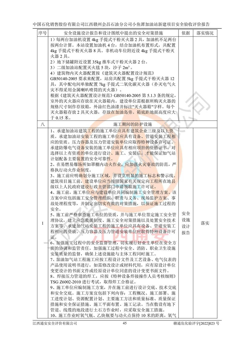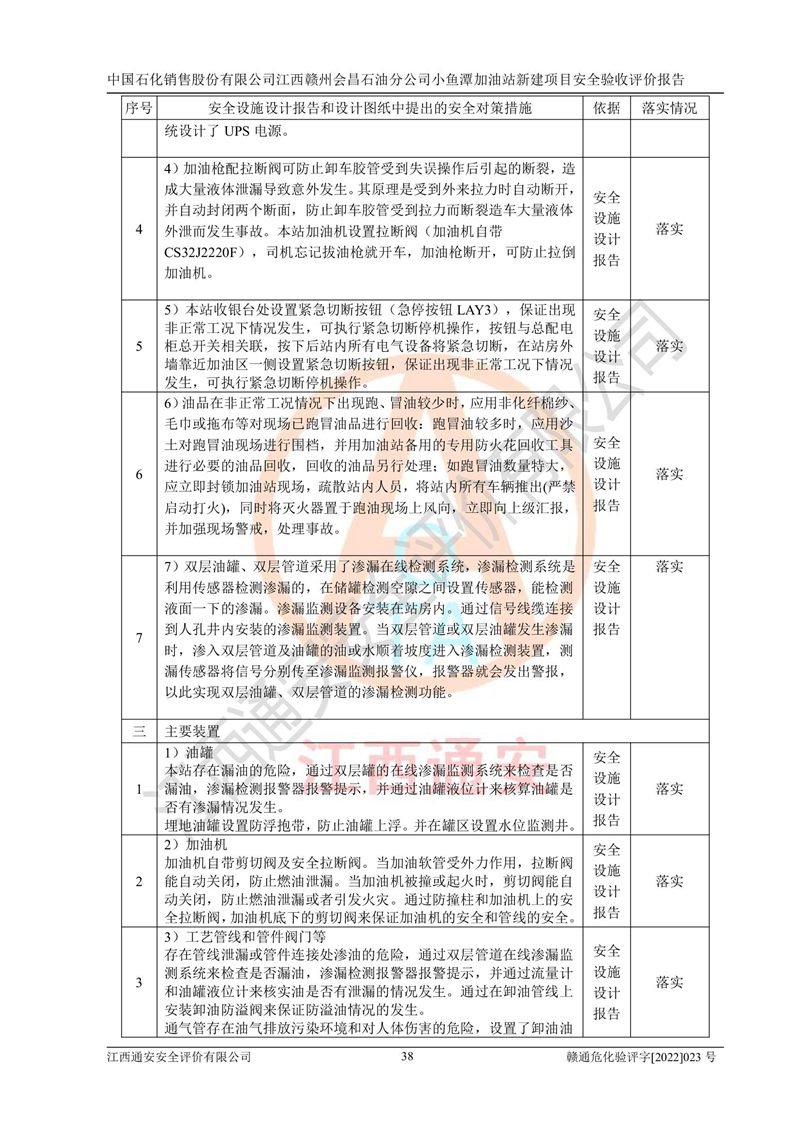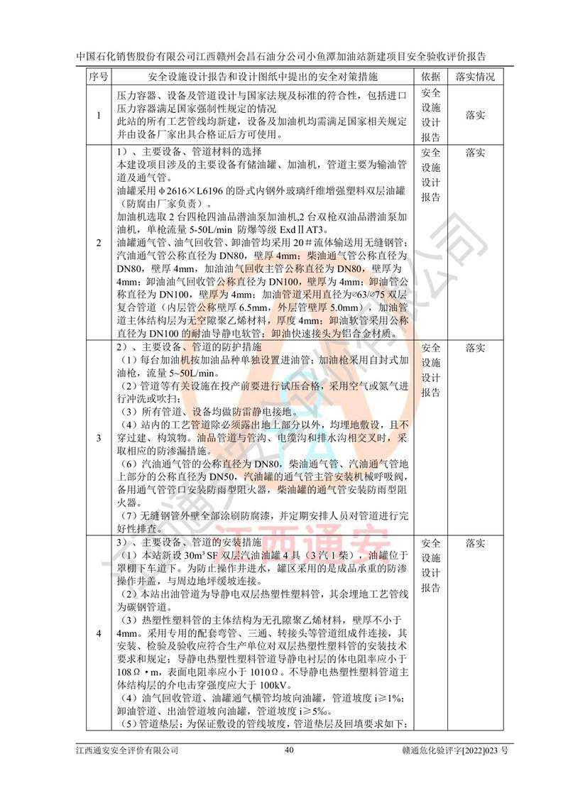 其它 | 中國石化銷售股份有限公司江西贛州會(huì)昌石油分公司小魚潭加油站新建項(xiàng)目嚴(yán)格執(zhí)行**有關(guān)安全生產(chǎn)法律、法規(guī)和有關(guān)標(biāo)準(zhǔn)、規(guī)范,認(rèn)真落實(shí)并合理采納安全條件評(píng)價(jià)報(bào)告及安全設(shè)施設(shè)計(jì)專篇設(shè)計(jì)中的安全對(duì)策、措施及建議,做到安全設(shè)施與主體工程同時(shí)設(shè)計(jì)、同時(shí)施工、同時(shí)投入生產(chǎn)和使用的“三同時(shí)”,對(duì)潛在的危險(xiǎn)、有害因素采取了安全對(duì)策措施,工程潛在的危險(xiǎn)、有害因素可得到**控制,風(fēng)險(xiǎn)在**控制和可接受范圍內(nèi)?,F(xiàn)場(chǎng)與設(shè)計(jì)一致。 該項(xiàng)目安全設(shè)施設(shè)計(jì)專篇設(shè)計(jì)的安全設(shè)施得到落實(shí)符合**安全生產(chǎn)方面的法律、法規(guī)、標(biāo)準(zhǔn)、規(guī)范的要求,具備安全驗(yàn)收條件,符合安全生產(chǎn)條件。 | ||||