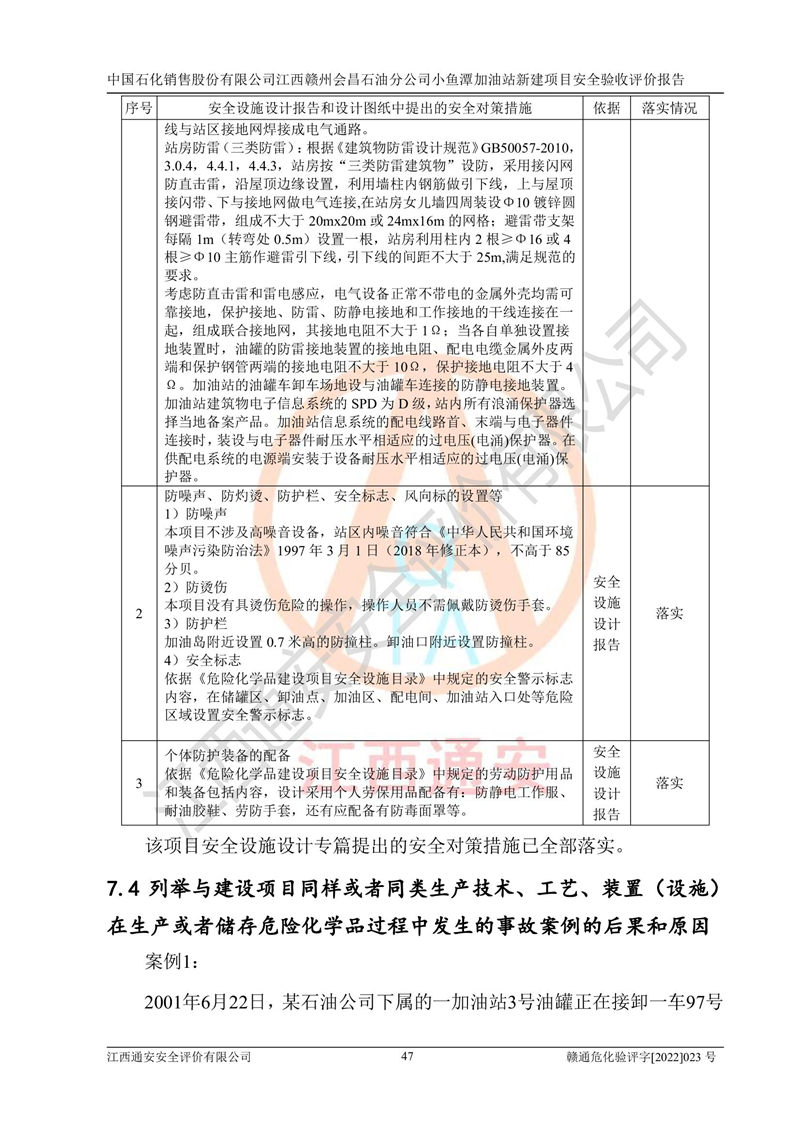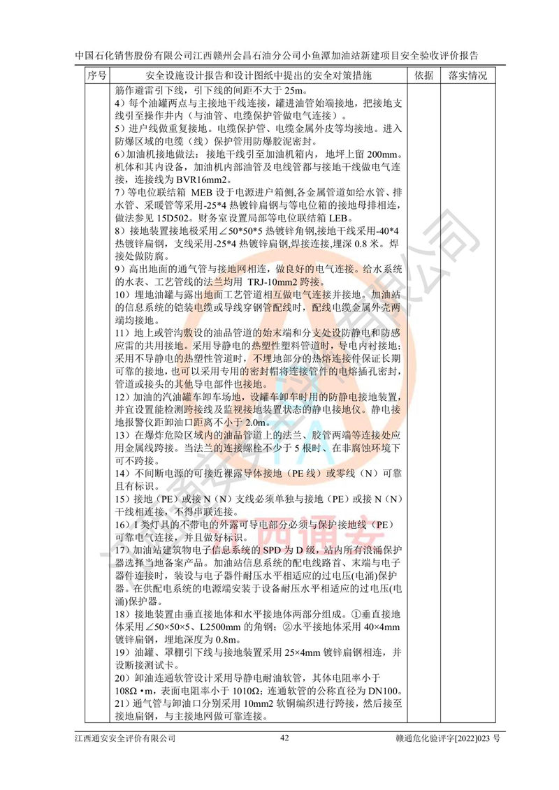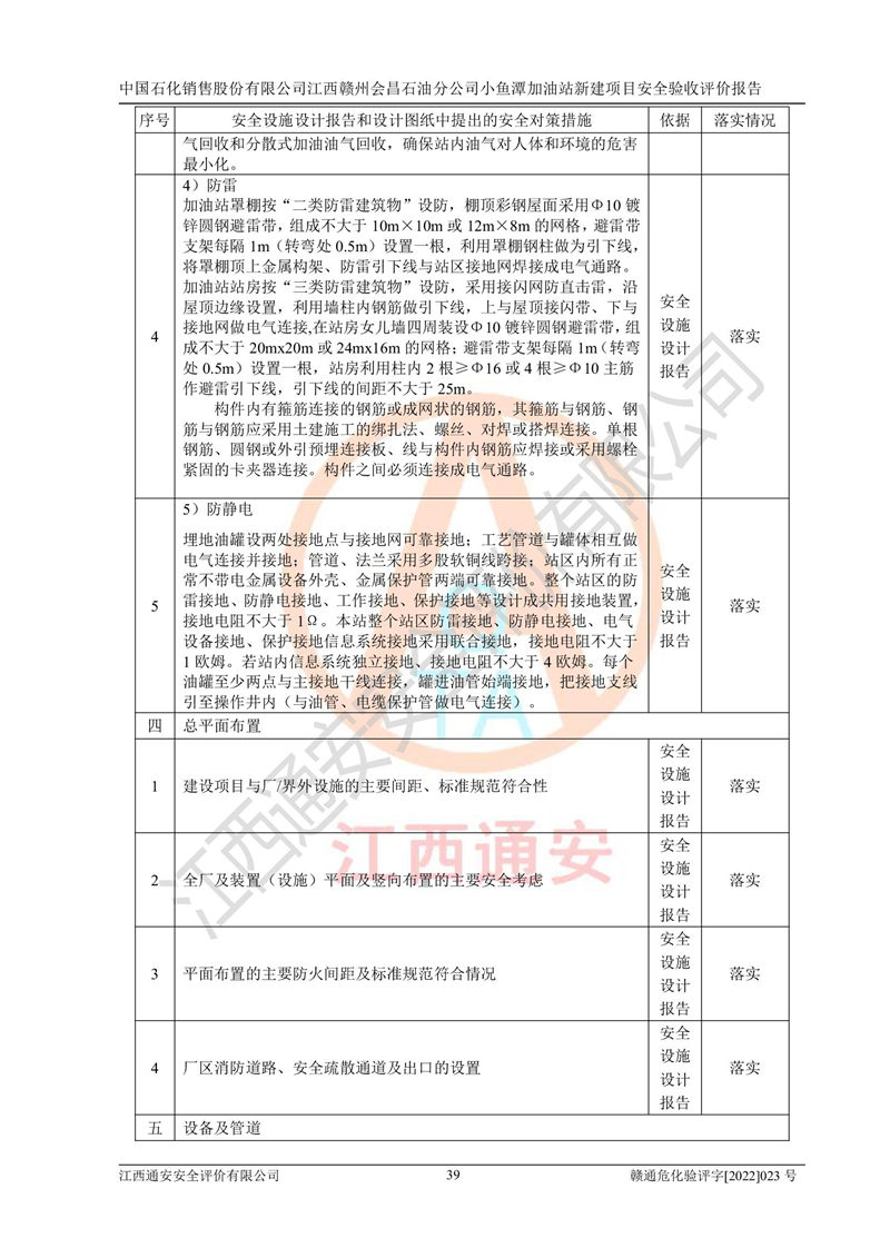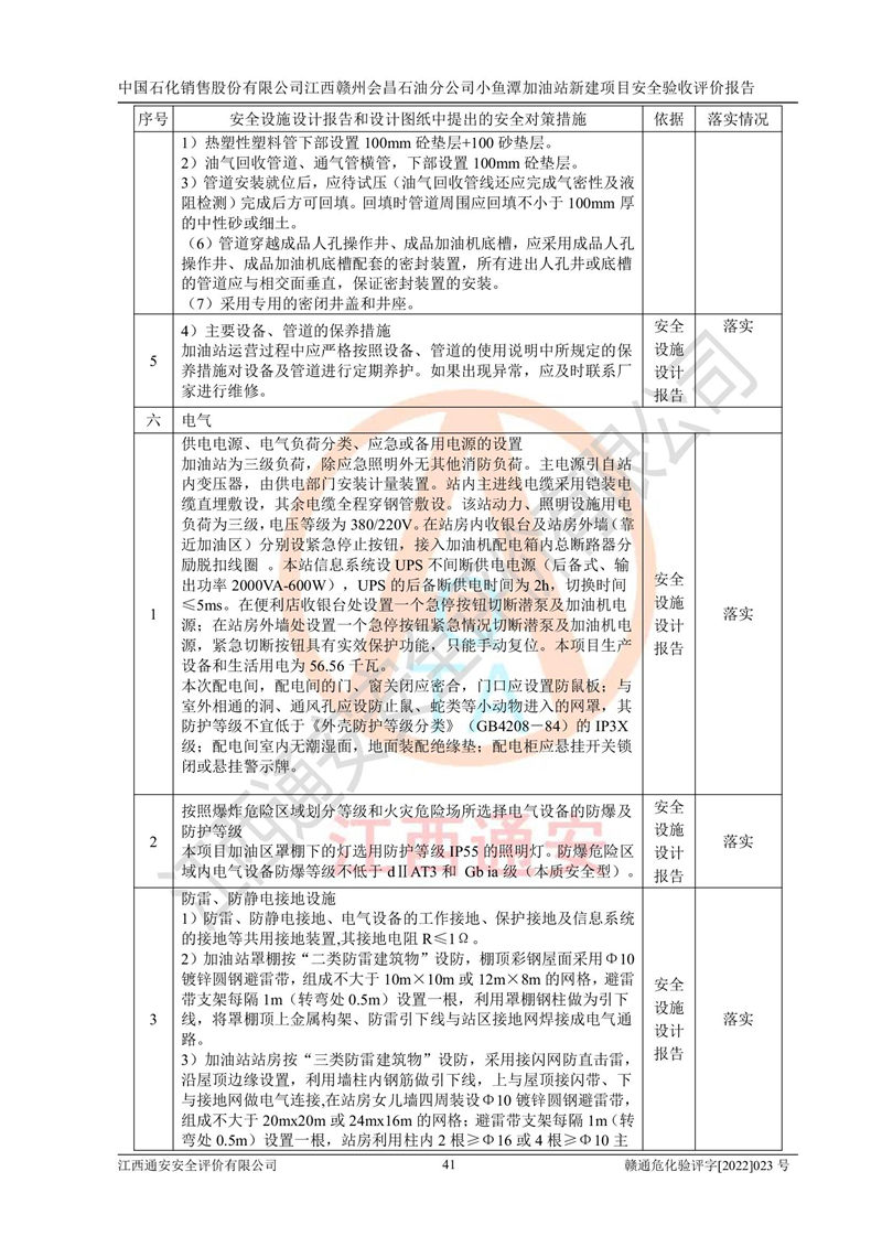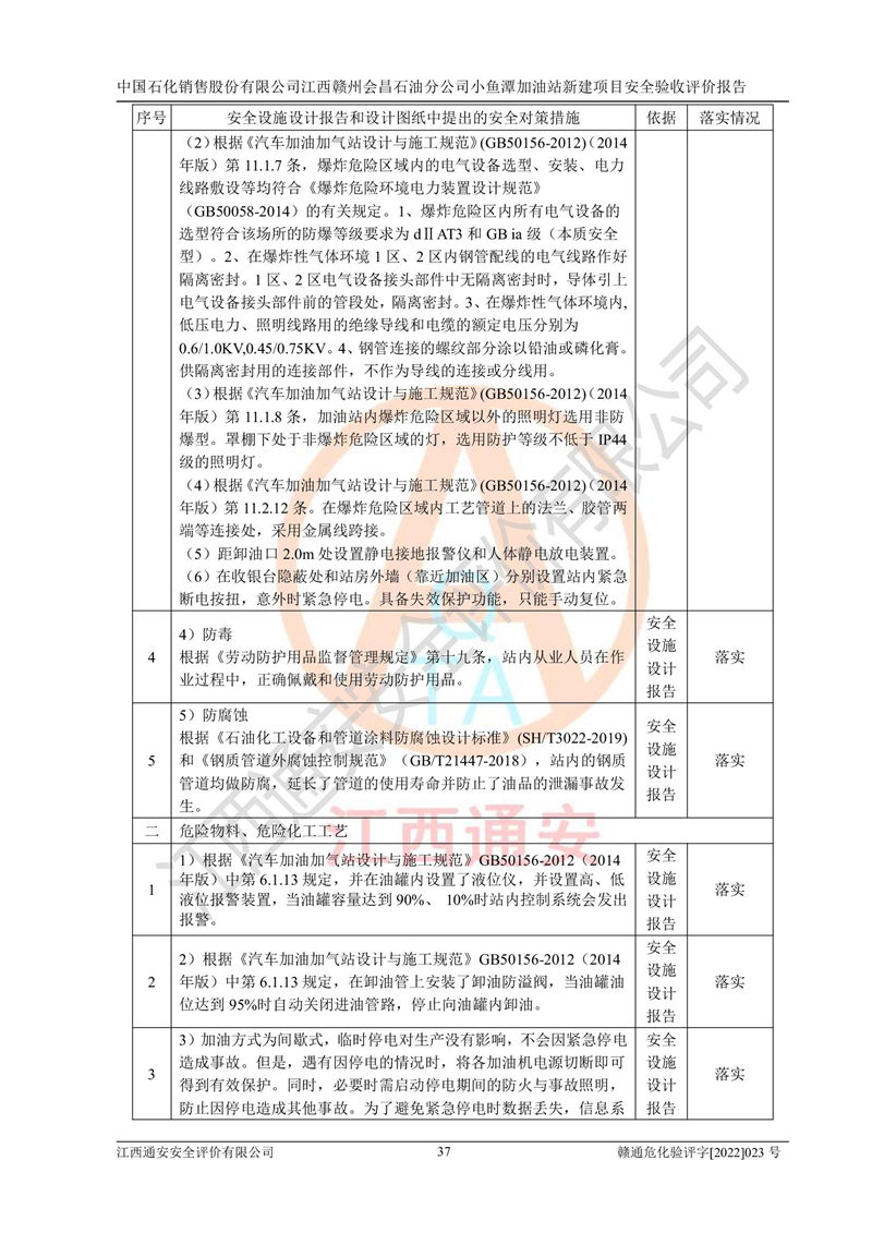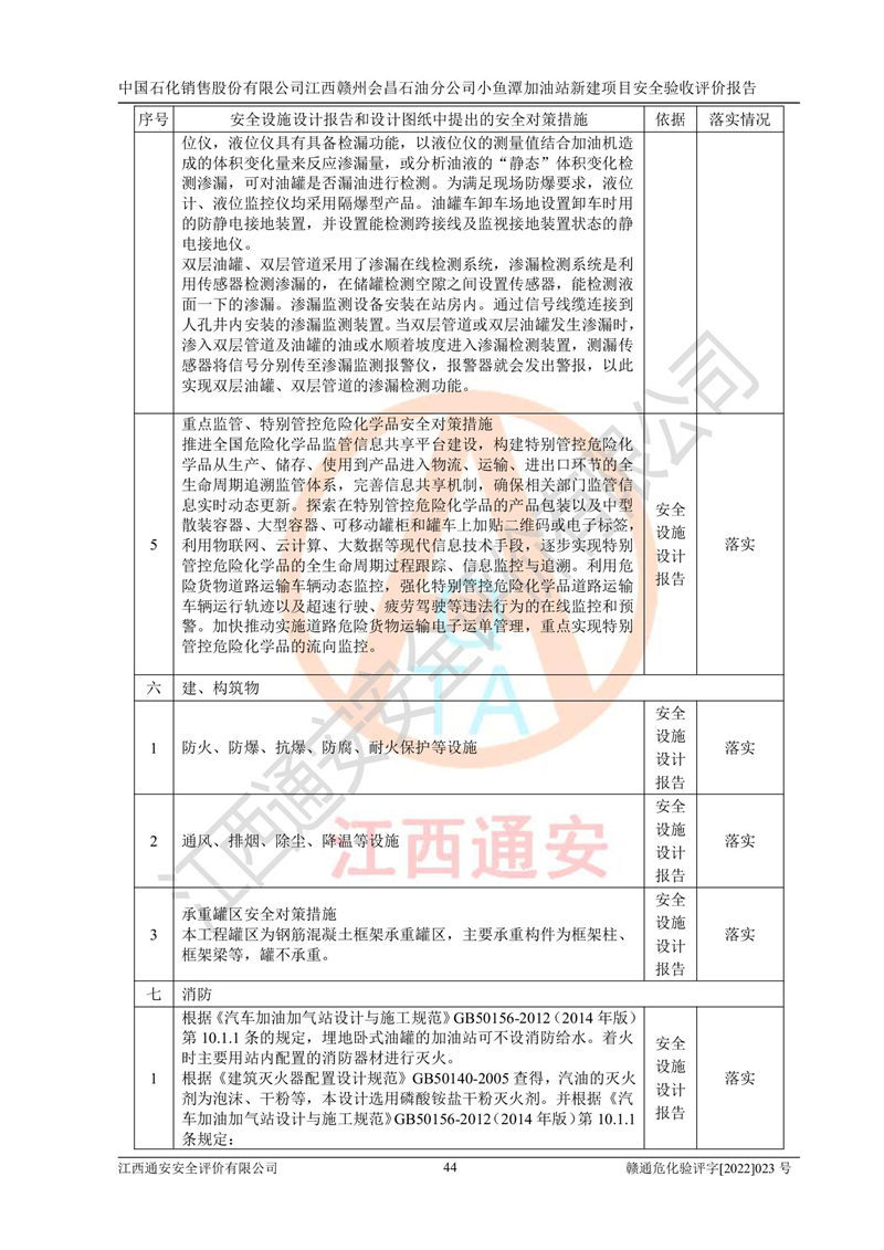 其它 | 中國石化銷售股份有限公司江西贛州會(huì)昌石油分公司小魚潭加油站新建項(xiàng)目嚴(yán)格執(zhí)行**有關(guān)安全生產(chǎn)法律、法規(guī)和有關(guān)標(biāo)準(zhǔn)、規(guī)范,認(rèn)真落實(shí)并合理采納安全條件評(píng)價(jià)報(bào)告及安全設(shè)施設(shè)計(jì)專篇設(shè)計(jì)中的安全對(duì)策、措施及建議,做到安全設(shè)施與主體工程同時(shí)設(shè)計(jì)、同時(shí)施工、同時(shí)投入生產(chǎn)和使用的“三同時(shí)”,對(duì)潛在的危險(xiǎn)、有害因素采取了安全對(duì)策措施,工程潛在的危險(xiǎn)、有害因素可得到**控制,風(fēng)險(xiǎn)在**控制和可接受范圍內(nèi)?,F(xiàn)場(chǎng)與設(shè)計(jì)一致。 該項(xiàng)目安全設(shè)施設(shè)計(jì)專篇設(shè)計(jì)的安全設(shè)施得到落實(shí)符合**安全生產(chǎn)方面的法律、法規(guī)、標(biāo)準(zhǔn)、規(guī)范的要求,具備安全驗(yàn)收條件,符合安全生產(chǎn)條件。 | ||||