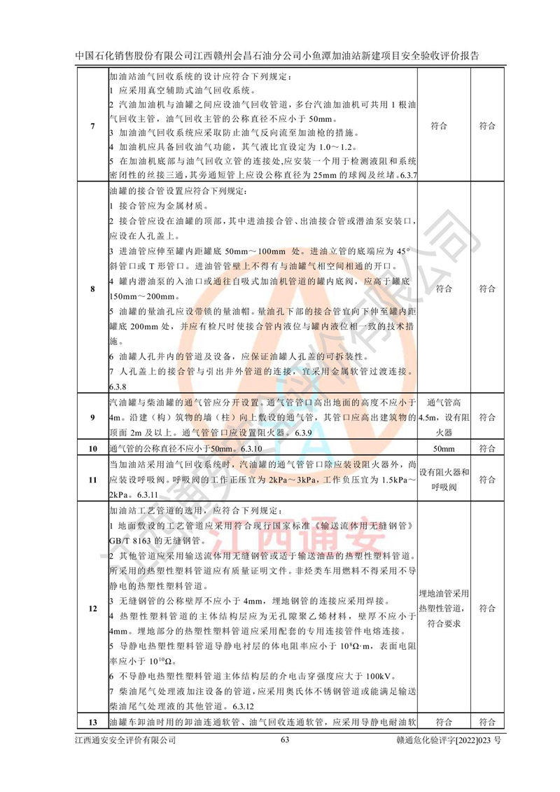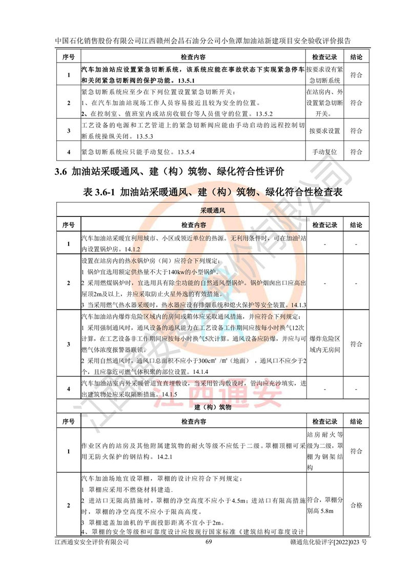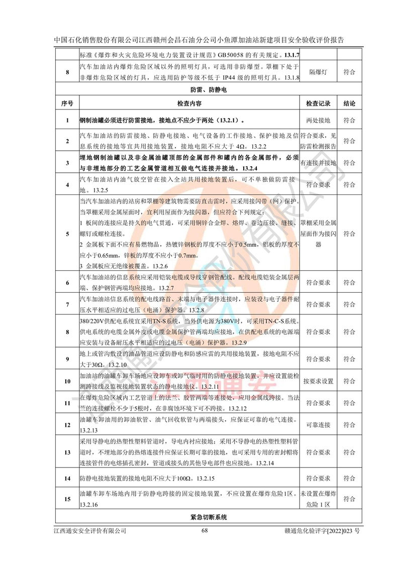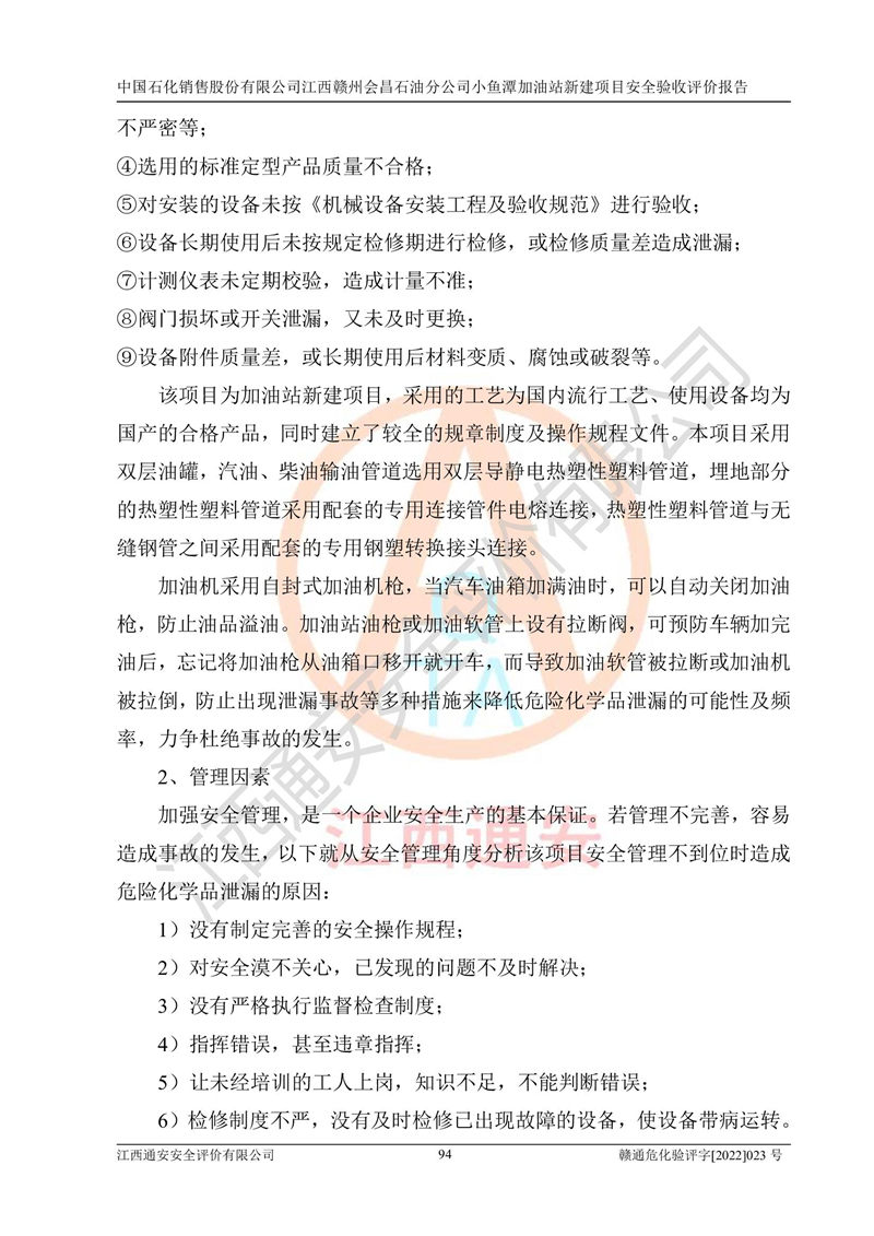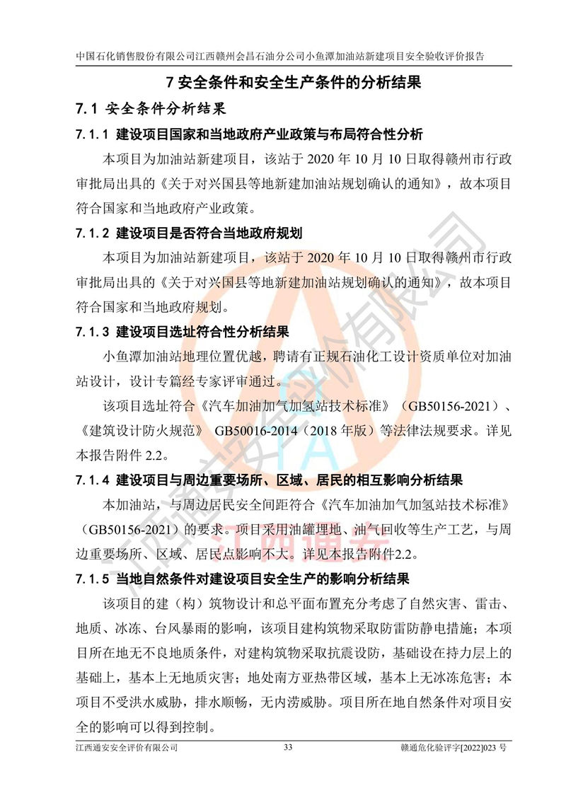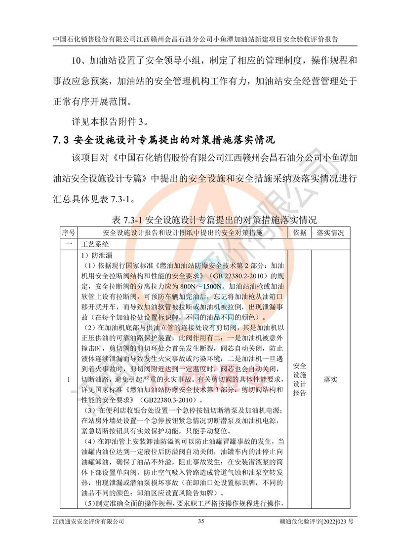 其它 | 中國石化銷售股份有限公司江西贛州會(huì)昌石油分公司小魚潭加油站新建項(xiàng)目嚴(yán)格執(zhí)行**有關(guān)安全生產(chǎn)法律、法規(guī)和有關(guān)標(biāo)準(zhǔn)、規(guī)范,認(rèn)真落實(shí)并合理采納安全條件評(píng)價(jià)報(bào)告及安全設(shè)施設(shè)計(jì)專篇設(shè)計(jì)中的安全對(duì)策、措施及建議,做到安全設(shè)施與主體工程同時(shí)設(shè)計(jì)、同時(shí)施工、同時(shí)投入生產(chǎn)和使用的“三同時(shí)”,對(duì)潛在的危險(xiǎn)、有害因素采取了安全對(duì)策措施,工程潛在的危險(xiǎn)、有害因素可得到**控制,風(fēng)險(xiǎn)在**控制和可接受范圍內(nèi)?,F(xiàn)場(chǎng)與設(shè)計(jì)一致。 該項(xiàng)目安全設(shè)施設(shè)計(jì)專篇設(shè)計(jì)的安全設(shè)施得到落實(shí)符合**安全生產(chǎn)方面的法律、法規(guī)、標(biāo)準(zhǔn)、規(guī)范的要求,具備安全驗(yàn)收條件,符合安全生產(chǎn)條件。 | ||||