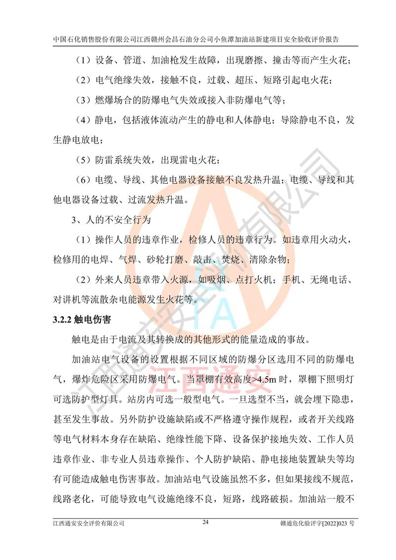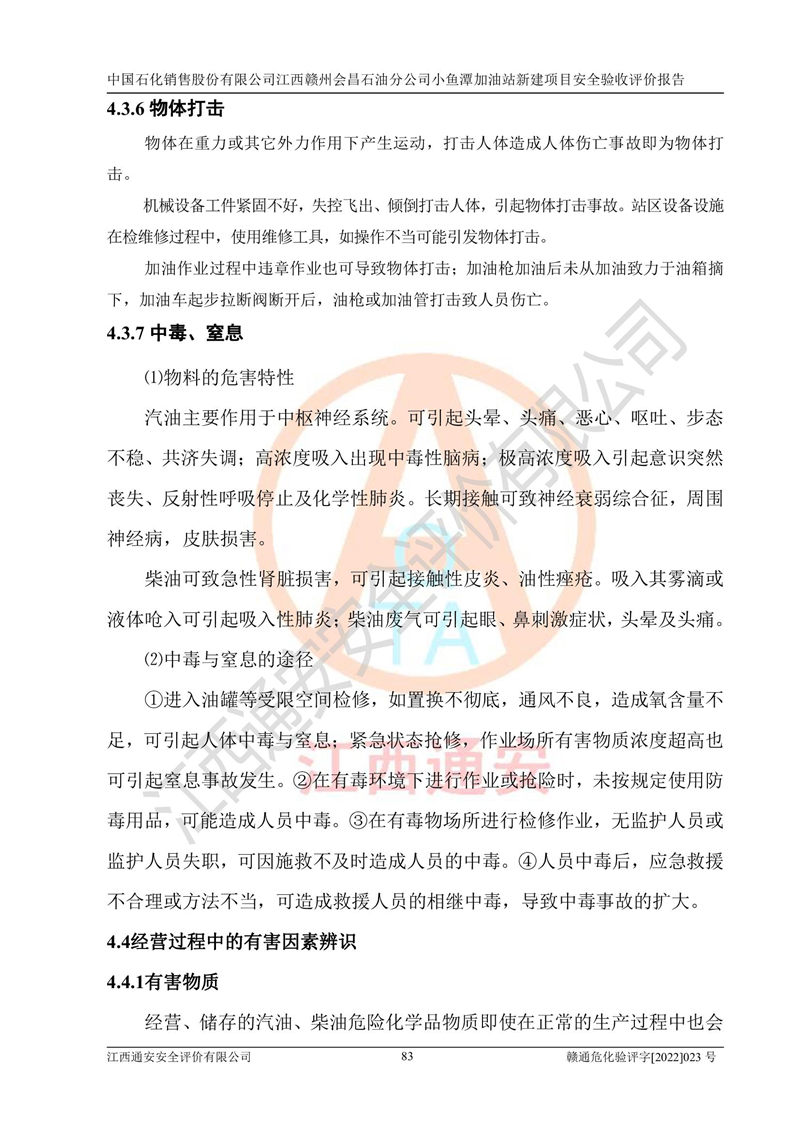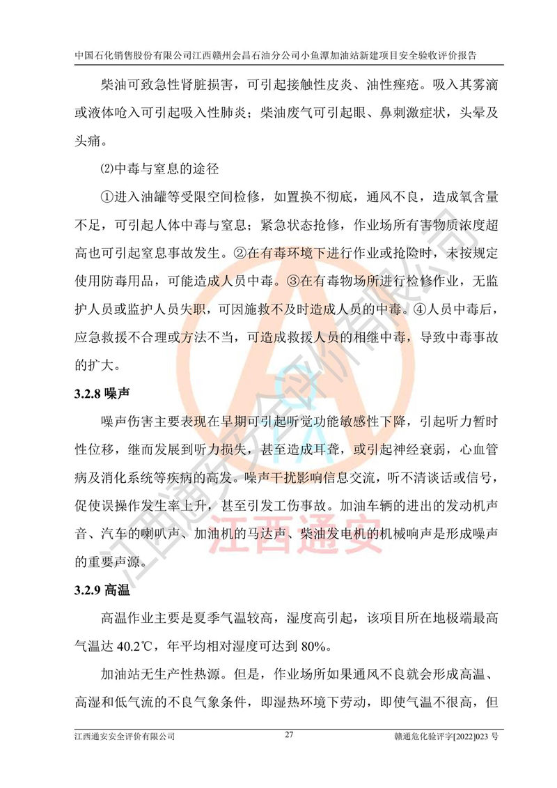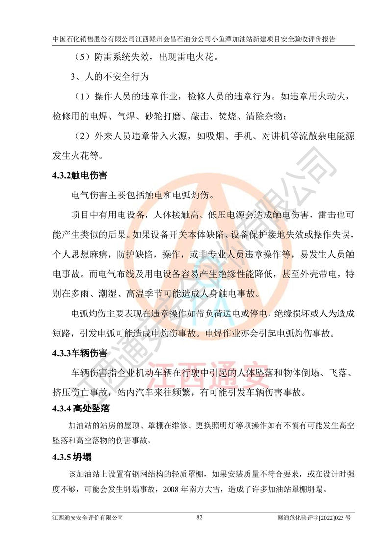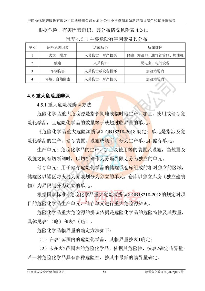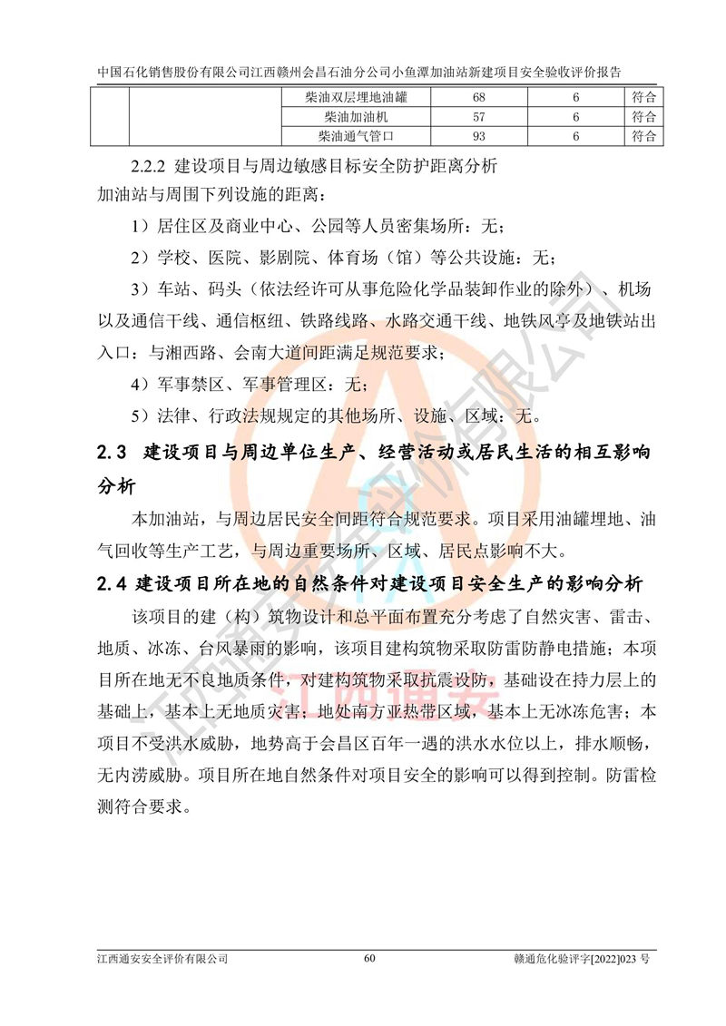 其它 | 中國石化銷售股份有限公司江西贛州會(huì)昌石油分公司小魚潭加油站新建項(xiàng)目嚴(yán)格執(zhí)行**有關(guān)安全生產(chǎn)法律、法規(guī)和有關(guān)標(biāo)準(zhǔn)、規(guī)范,認(rèn)真落實(shí)并合理采納安全條件評(píng)價(jià)報(bào)告及安全設(shè)施設(shè)計(jì)專篇設(shè)計(jì)中的安全對(duì)策、措施及建議,做到安全設(shè)施與主體工程同時(shí)設(shè)計(jì)、同時(shí)施工、同時(shí)投入生產(chǎn)和使用的“三同時(shí)”,對(duì)潛在的危險(xiǎn)、有害因素采取了安全對(duì)策措施,工程潛在的危險(xiǎn)、有害因素可得到**控制,風(fēng)險(xiǎn)在**控制和可接受范圍內(nèi)?,F(xiàn)場(chǎng)與設(shè)計(jì)一致。 該項(xiàng)目安全設(shè)施設(shè)計(jì)專篇設(shè)計(jì)的安全設(shè)施得到落實(shí)符合**安全生產(chǎn)方面的法律、法規(guī)、標(biāo)準(zhǔn)、規(guī)范的要求,具備安全驗(yàn)收條件,符合安全生產(chǎn)條件。 | ||||