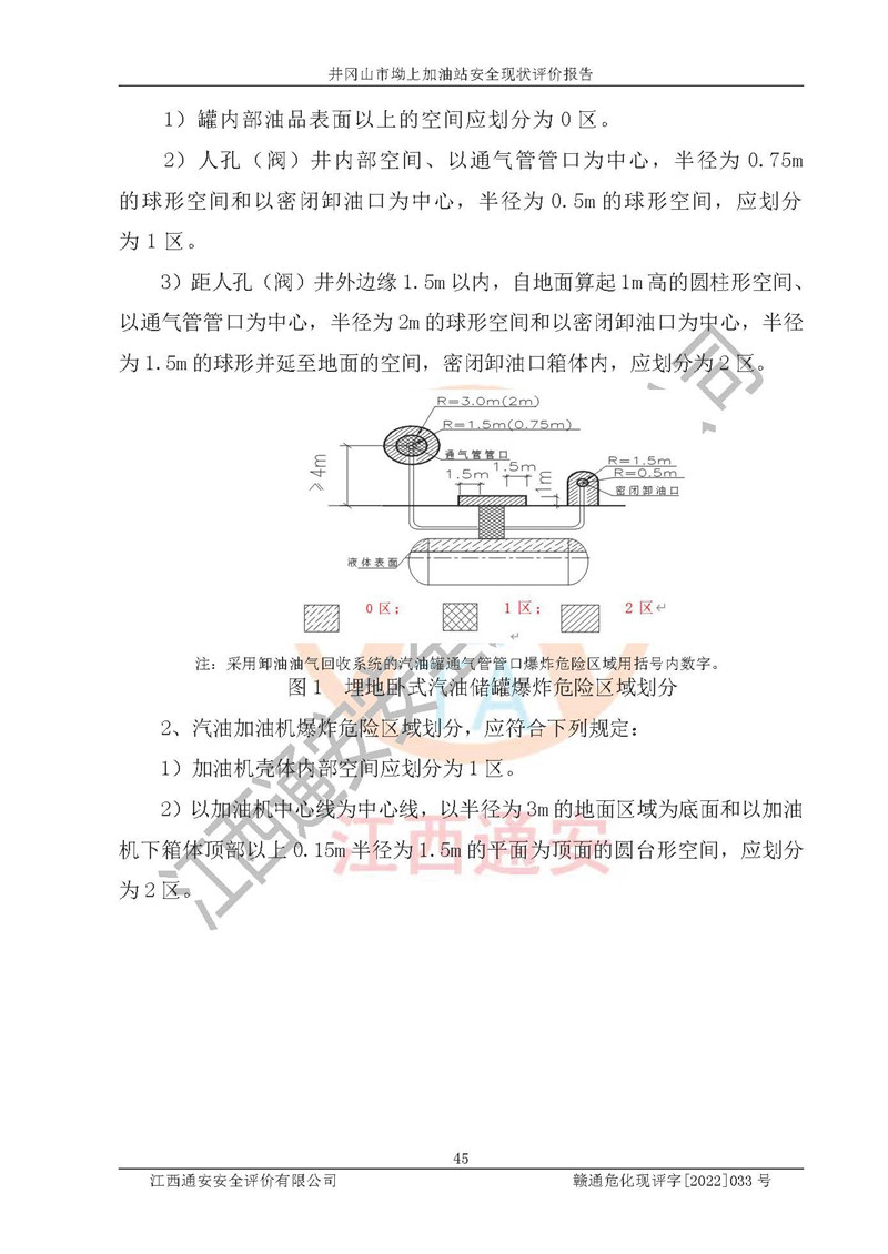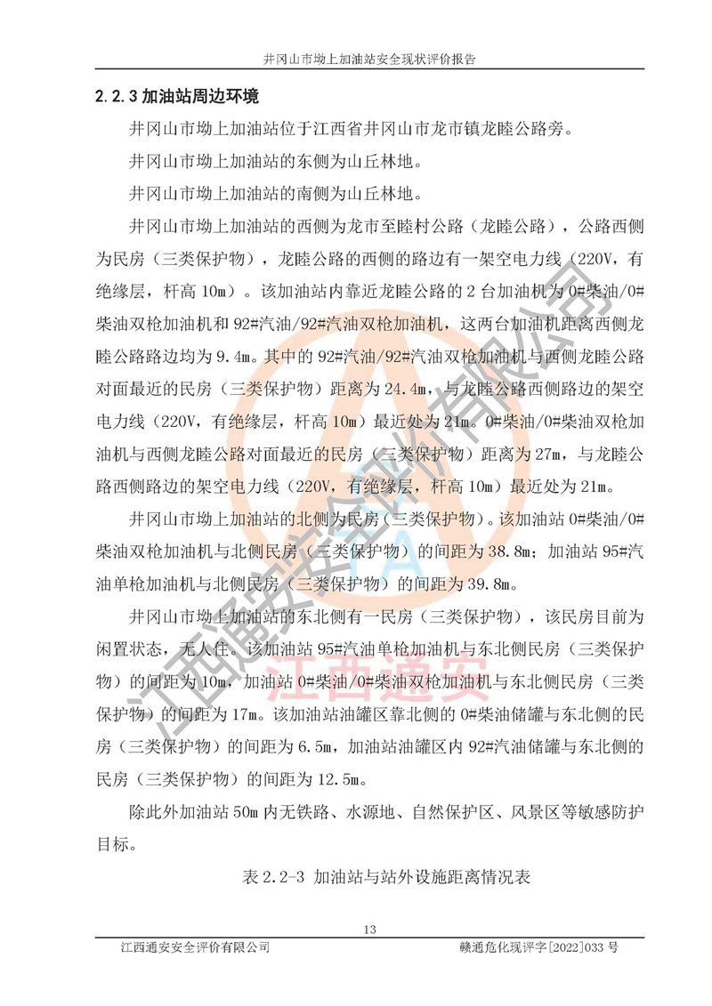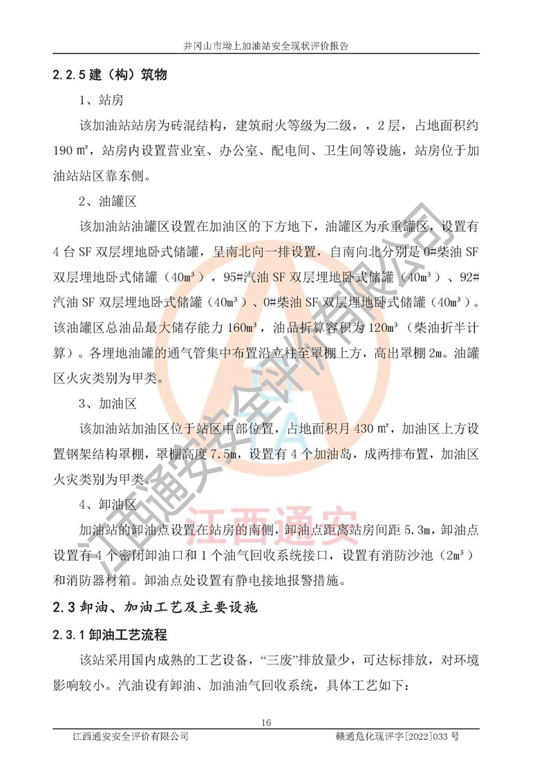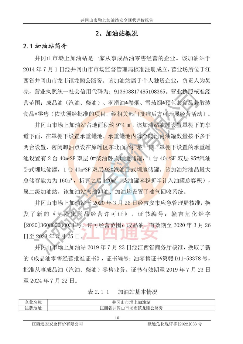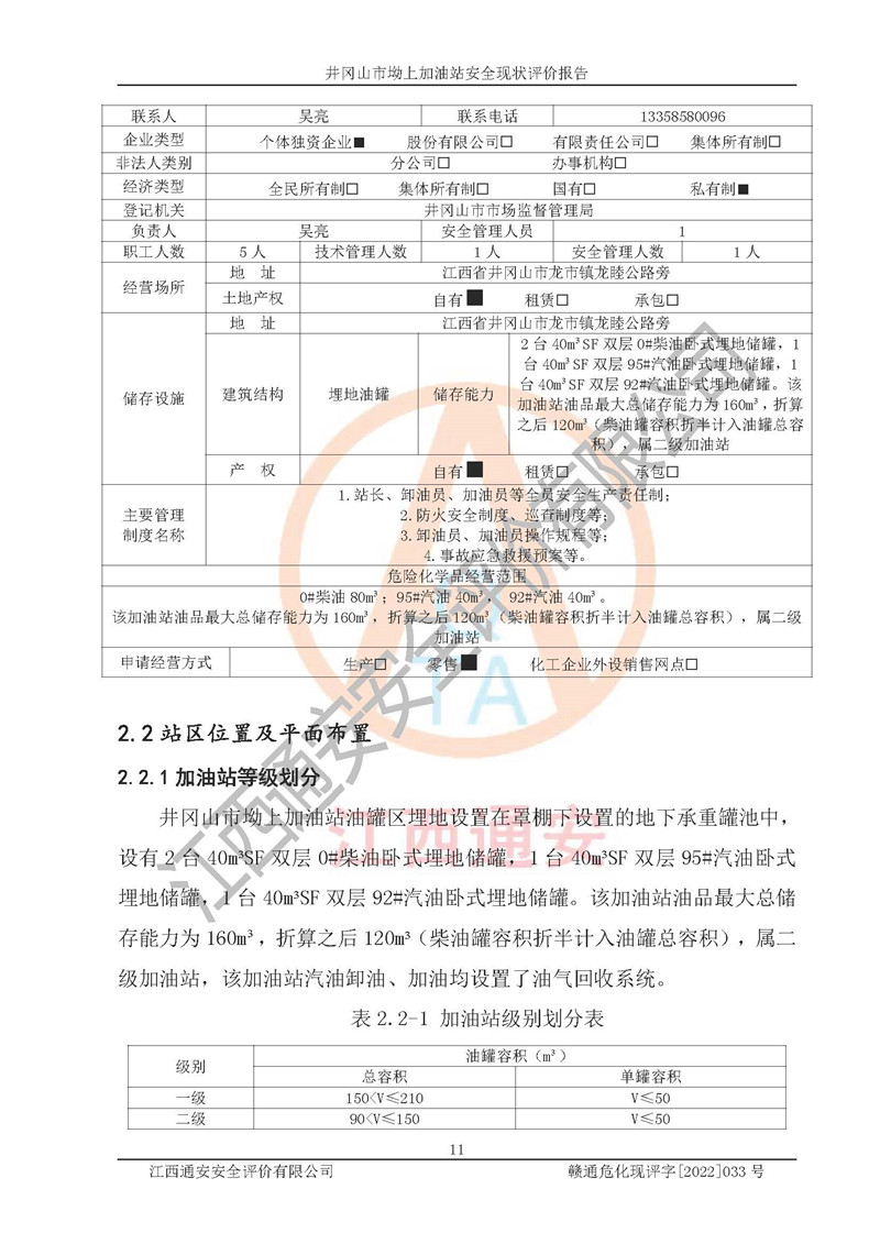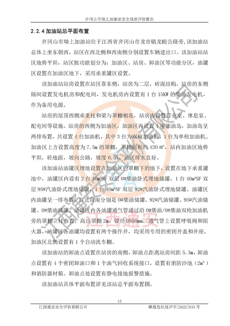 井岡山市坳上加油站是一家從事成品油零售經(jīng)營(yíng)的企業(yè)。該加油站于2014年7月1日經(jīng)井岡山市市場(chǎng)監(jiān)督管理局核準(zhǔn)注冊(cè)成立,營(yíng)業(yè)場(chǎng)所位于江西省井岡山市龍市鎮(zhèn)龍睦公路旁。該加油站屬于個(gè)人獨(dú)資企業(yè),負(fù)責(zé)人為吳亮,營(yíng)業(yè)執(zhí)照統(tǒng)一社會(huì)信用代碼為:913608817485108365。營(yíng)業(yè)執(zhí)照核準(zhǔn)經(jīng)營(yíng)范圍:成品油(汽油、柴油)、潤(rùn)滑油*卷煙、雪茄煙*預(yù)包裝食品兼散裝食品*零售(依法須經(jīng)批準(zhǔn)的項(xiàng)目,經(jīng)相關(guān)部門批準(zhǔn)后方可開展經(jīng)營(yíng)活動(dòng))。 井岡山市坳上加油站占地面積約974㎡,該加油站油罐設(shè)置罩棚下的車道下面,在罩棚下設(shè)置承重罐池,承重罐池內(nèi)每個(gè)隔池內(nèi)油罐數(shù)量按不多于兩臺(tái)設(shè)置,密閉卸油點(diǎn)設(shè)在原罐區(qū)東北面靠護(hù)坡一側(cè)。罩棚下設(shè)置的承重罐池設(shè)置有2臺(tái)40m3SF雙層0#柴油臥式埋地儲(chǔ)罐,1臺(tái)40m3SF雙層95#汽油臥式埋地儲(chǔ)罐,1臺(tái)40m3SF雙層92#汽油臥式埋地儲(chǔ)罐。該加油站油品*大總儲(chǔ)存能力為160m3,折算之后120m3(柴油罐容積折半計(jì)入油罐總?cè)莘e),屬二級(jí)加油站,該加油站汽油卸油、加油均設(shè)置了油氣回收系統(tǒng)。 |