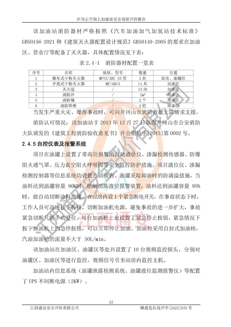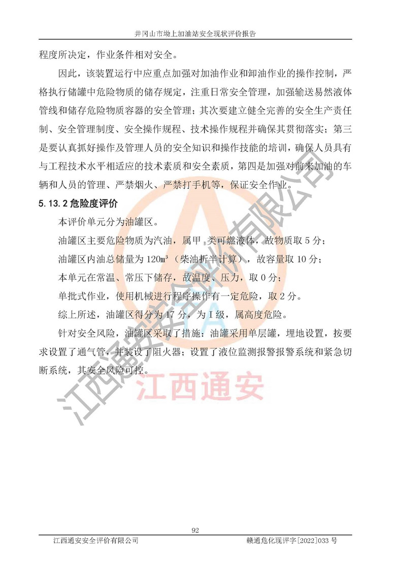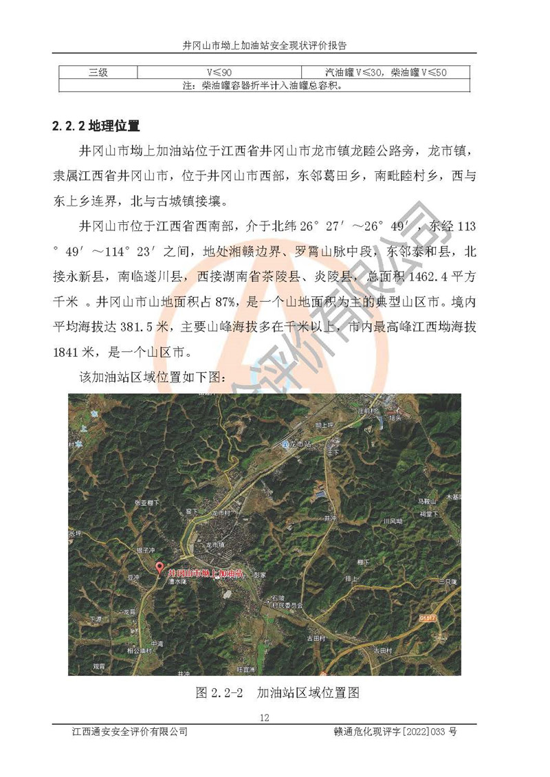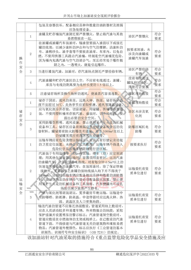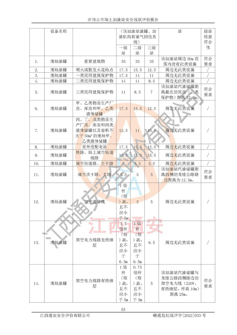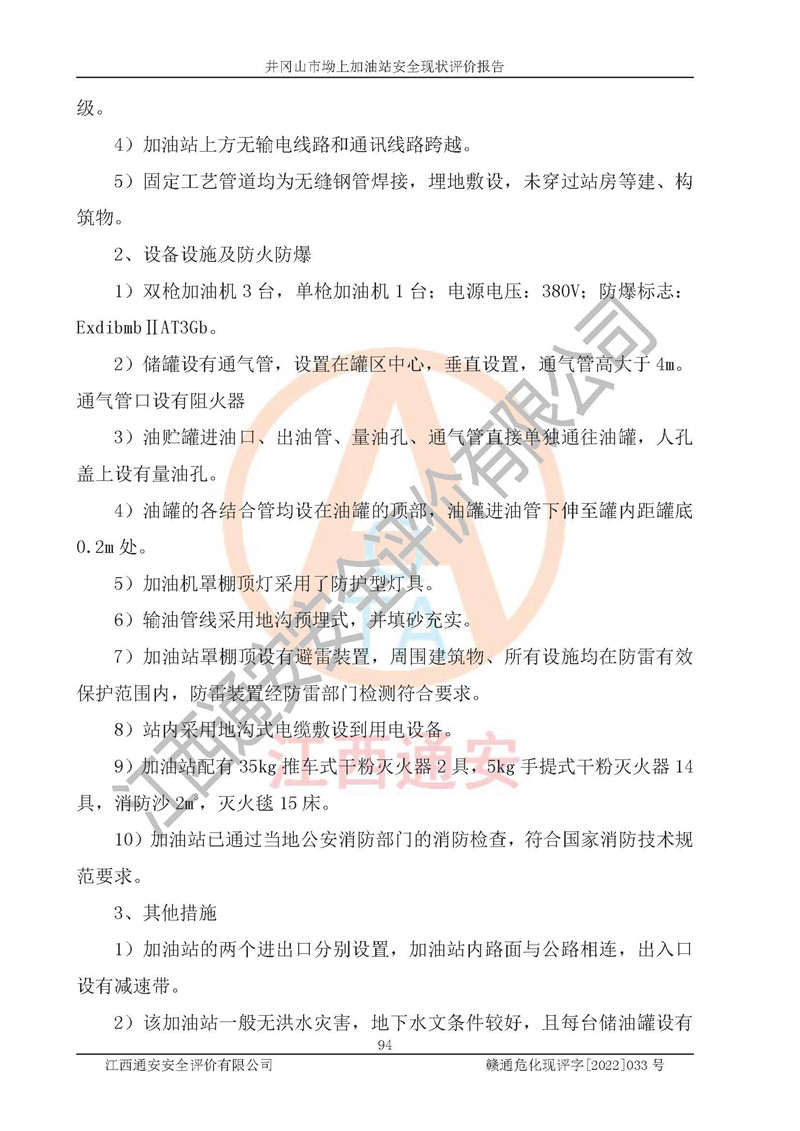 井岡山市坳上加油站是一家從事成品油零售經(jīng)營(yíng)的企業(yè)。該加油站于2014年7月1日經(jīng)井岡山市市場(chǎng)監(jiān)督管理局核準(zhǔn)注冊(cè)成立,營(yíng)業(yè)場(chǎng)所位于江西省井岡山市龍市鎮(zhèn)龍睦公路旁。該加油站屬于個(gè)人獨(dú)資企業(yè),負(fù)責(zé)人為吳亮,營(yíng)業(yè)執(zhí)照統(tǒng)一社會(huì)信用代碼為:913608817485108365。營(yíng)業(yè)執(zhí)照核準(zhǔn)經(jīng)營(yíng)范圍:成品油(汽油、柴油)、潤(rùn)滑油*卷煙、雪茄煙*預(yù)包裝食品兼散裝食品*零售(依法須經(jīng)批準(zhǔn)的項(xiàng)目,經(jīng)相關(guān)部門批準(zhǔn)后方可開展經(jīng)營(yíng)活動(dòng))。 井岡山市坳上加油站占地面積約974㎡,該加油站油罐設(shè)置罩棚下的車道下面,在罩棚下設(shè)置承重罐池,承重罐池內(nèi)每個(gè)隔池內(nèi)油罐數(shù)量按不多于兩臺(tái)設(shè)置,密閉卸油點(diǎn)設(shè)在原罐區(qū)東北面靠護(hù)坡一側(cè)。罩棚下設(shè)置的承重罐池設(shè)置有2臺(tái)40m3SF雙層0#柴油臥式埋地儲(chǔ)罐,1臺(tái)40m3SF雙層95#汽油臥式埋地儲(chǔ)罐,1臺(tái)40m3SF雙層92#汽油臥式埋地儲(chǔ)罐。該加油站油品*大總儲(chǔ)存能力為160m3,折算之后120m3(柴油罐容積折半計(jì)入油罐總?cè)莘e),屬二級(jí)加油站,該加油站汽油卸油、加油均設(shè)置了油氣回收系統(tǒng)。 |