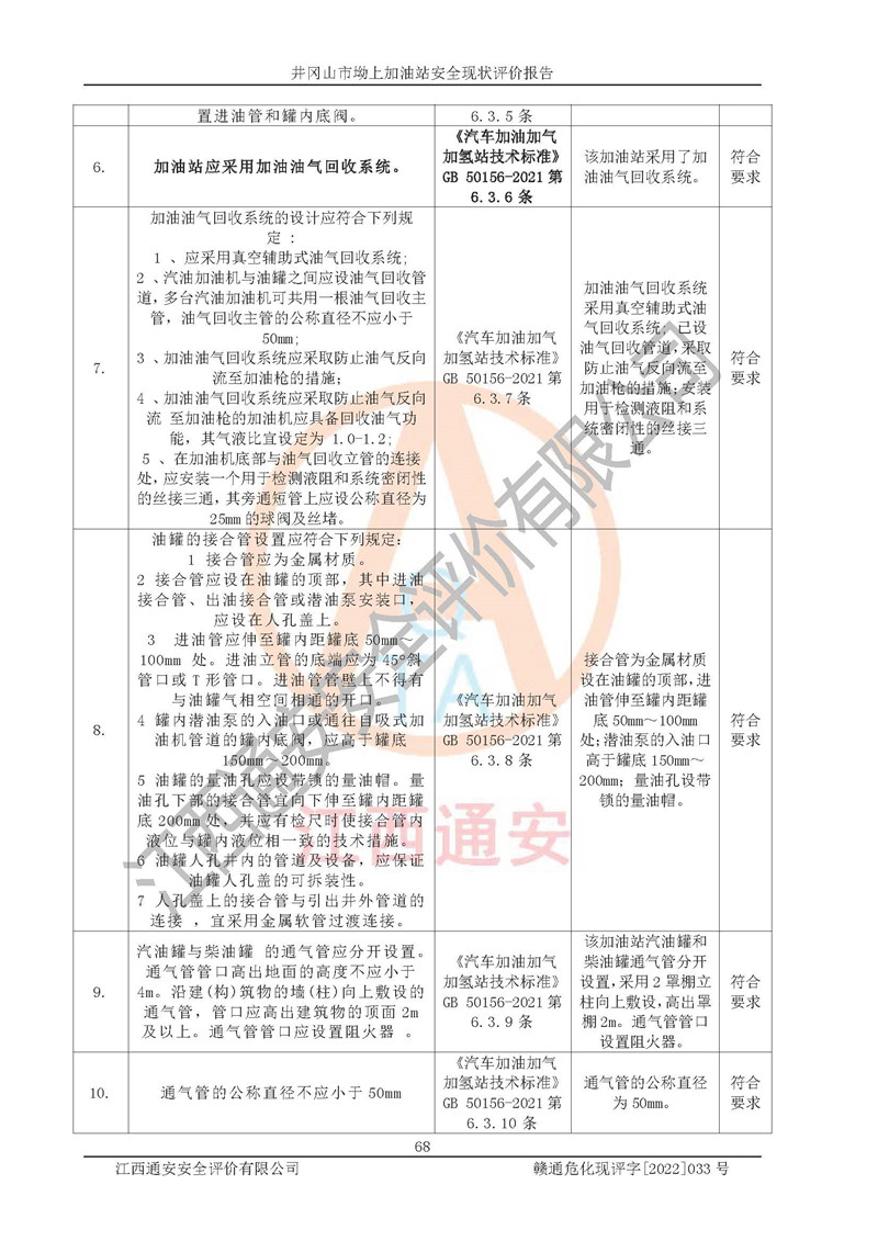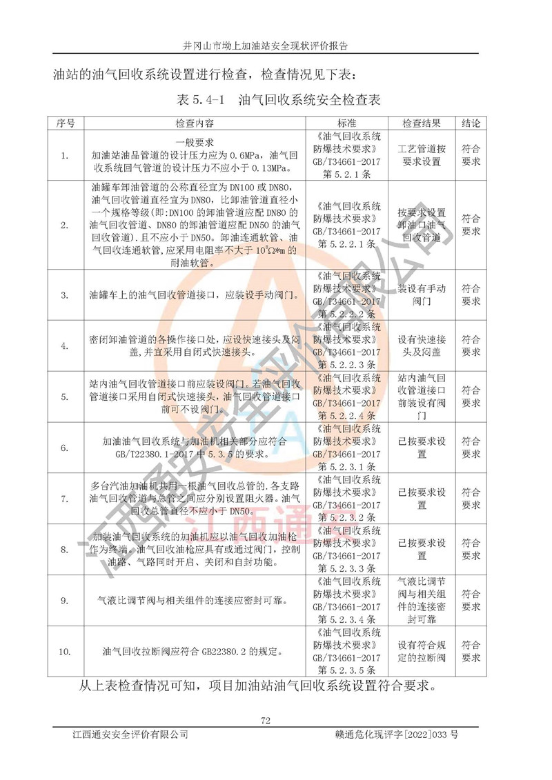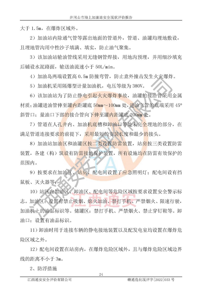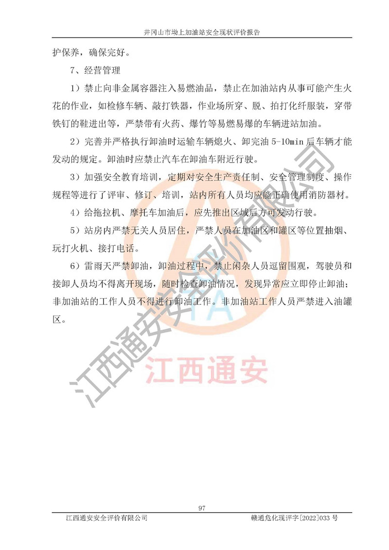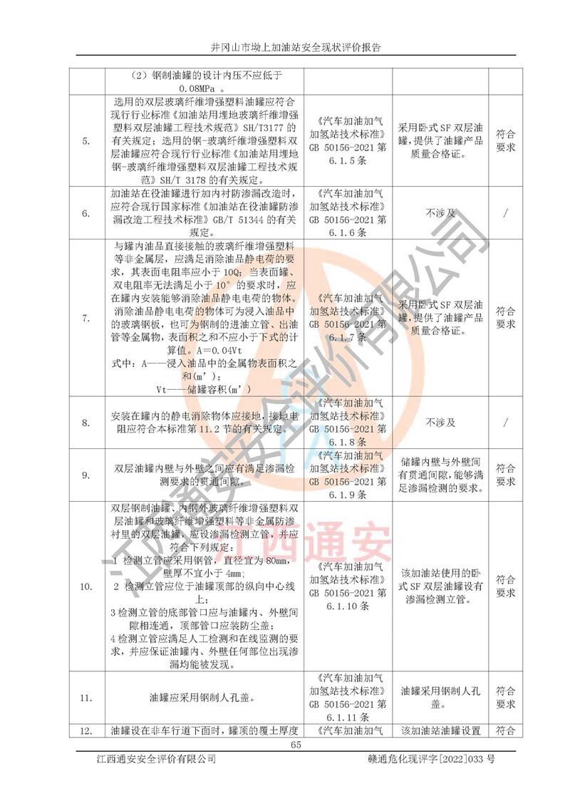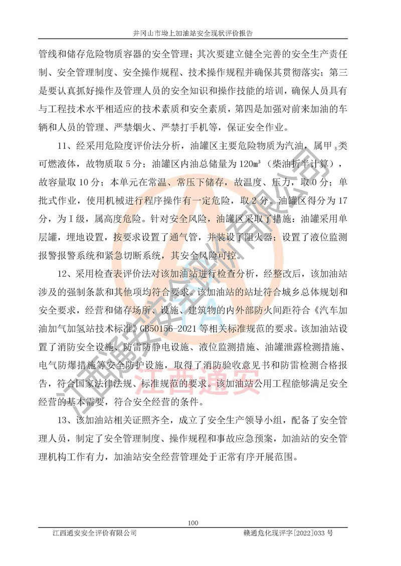 井岡山市坳上加油站是一家從事成品油零售經(jīng)營(yíng)的企業(yè)。該加油站于2014年7月1日經(jīng)井岡山市市場(chǎng)監(jiān)督管理局核準(zhǔn)注冊(cè)成立,營(yíng)業(yè)場(chǎng)所位于江西省井岡山市龍市鎮(zhèn)龍睦公路旁。該加油站屬于個(gè)人獨(dú)資企業(yè),負(fù)責(zé)人為吳亮,營(yíng)業(yè)執(zhí)照統(tǒng)一社會(huì)信用代碼為:913608817485108365。營(yíng)業(yè)執(zhí)照核準(zhǔn)經(jīng)營(yíng)范圍:成品油(汽油、柴油)、潤(rùn)滑油*卷煙、雪茄煙*預(yù)包裝食品兼散裝食品*零售(依法須經(jīng)批準(zhǔn)的項(xiàng)目,經(jīng)相關(guān)部門批準(zhǔn)后方可開展經(jīng)營(yíng)活動(dòng))。 井岡山市坳上加油站占地面積約974㎡,該加油站油罐設(shè)置罩棚下的車道下面,在罩棚下設(shè)置承重罐池,承重罐池內(nèi)每個(gè)隔池內(nèi)油罐數(shù)量按不多于兩臺(tái)設(shè)置,密閉卸油點(diǎn)設(shè)在原罐區(qū)東北面靠護(hù)坡一側(cè)。罩棚下設(shè)置的承重罐池設(shè)置有2臺(tái)40m3SF雙層0#柴油臥式埋地儲(chǔ)罐,1臺(tái)40m3SF雙層95#汽油臥式埋地儲(chǔ)罐,1臺(tái)40m3SF雙層92#汽油臥式埋地儲(chǔ)罐。該加油站油品*大總儲(chǔ)存能力為160m3,折算之后120m3(柴油罐容積折半計(jì)入油罐總?cè)莘e),屬二級(jí)加油站,該加油站汽油卸油、加油均設(shè)置了油氣回收系統(tǒng)。 |