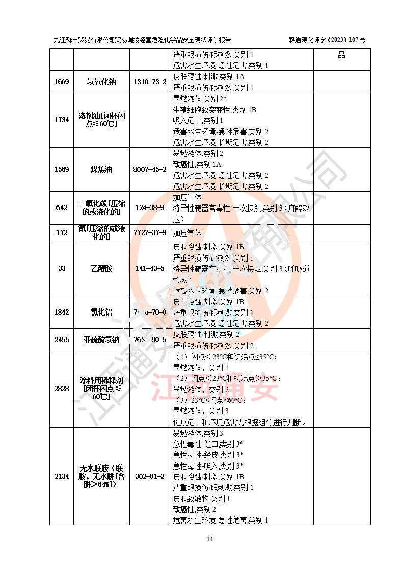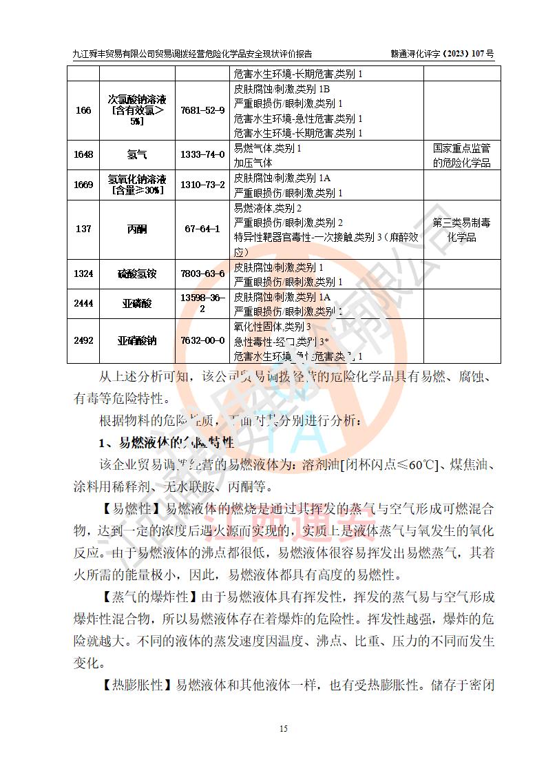 項目簡介 | 九九江舜豐貿(mào)易有限公司是一家從事貿(mào)易調(diào)撥經(jīng)營危險化學(xué)品的有限責(zé)任公司(自然人獨(dú)資),原經(jīng)營地址位于江西省九江市湖口縣武墾集鎮(zhèn)186號,現(xiàn)經(jīng)營地址變更為九江市湖口縣武山鎮(zhèn)新汽車站203,企業(yè)法定**人余永新。 該企業(yè)于2020年11月05日由湖口縣應(yīng)急管理局換發(fā)的《危險化學(xué)品經(jīng)營許可證》(贛湖危化經(jīng)字 [2020]025號),**期至2023年11月04日。企業(yè)以貿(mào)易調(diào)撥方式經(jīng)營硫酸、鹽酸、氧[壓縮的或液化的]、液氨、氫氧化鈉(燒堿)、溶劑油[閉杯閃點(diǎn)≤60℃]、煤焦油、二氧化碳[壓縮的或液化的]、氮[壓縮的或液化的]、乙醇胺、氯化鋁、亞硫酸氫鈉、涂料用稀釋劑[閉杯閃點(diǎn)≤60℃]、無水聯(lián)胺、次氯酸鈉溶液[含**氯>5%]、氫氣、氫氧化鈉溶液[含量≥30%] 、**、硫酸氫銨、亞磷酸、亞硝酸鈉等化學(xué)品,依據(jù)《危險化學(xué)品目錄》( 應(yīng)急管理部等十部門公告 [2022]第8號公告修改),該企業(yè)以貿(mào)易調(diào)撥方式經(jīng)營的所有品種均屬于列入目錄的危險化學(xué)品。 | |||