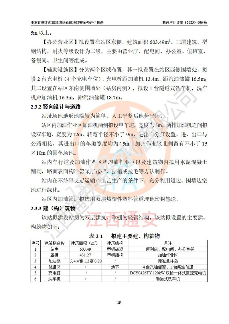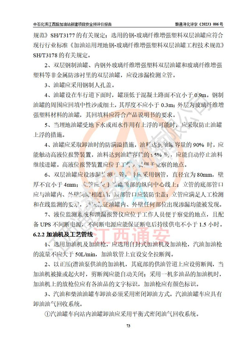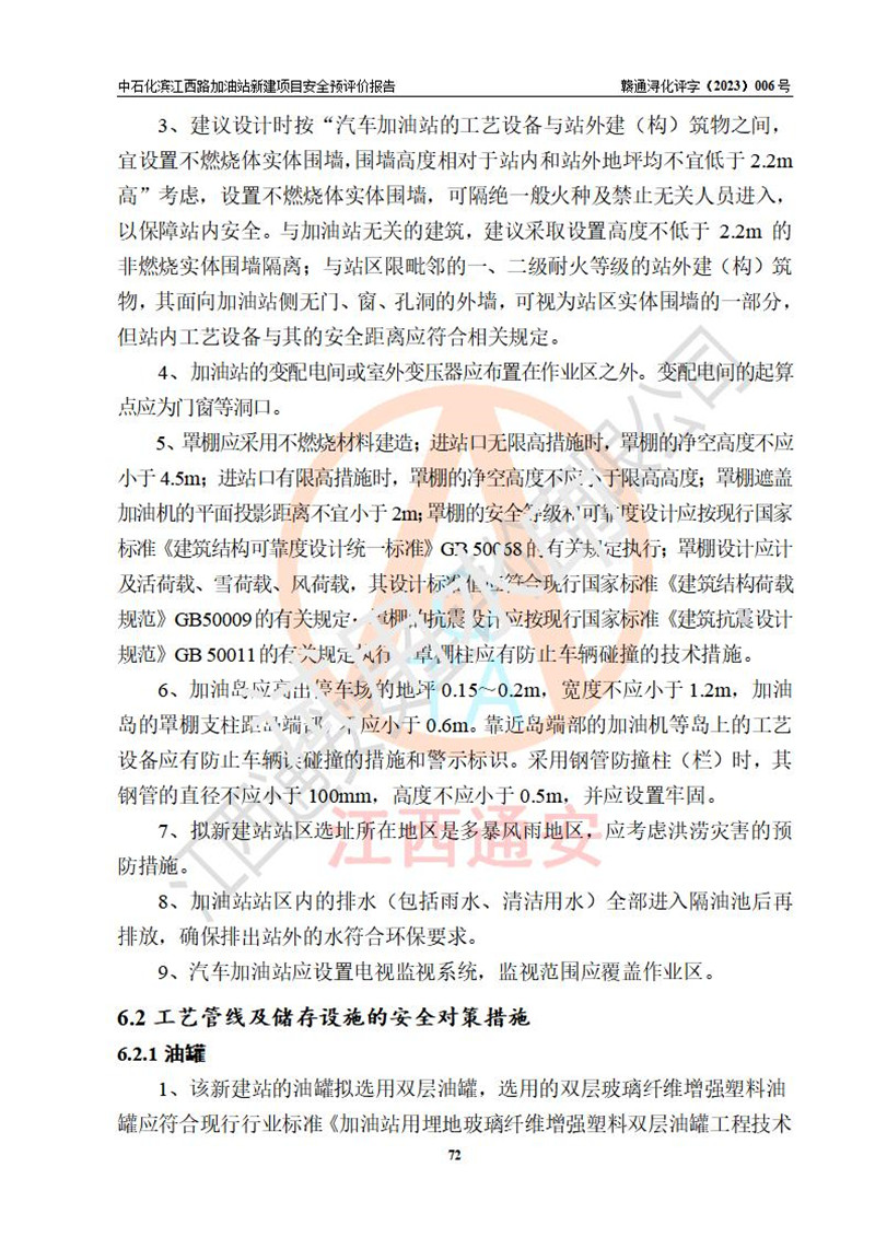 項(xiàng)目簡介 | 中國石化銷售股份有限公司江西九江潯陽石油分公司濱江西路加油站已取得企業(yè)名稱設(shè)立登記通知書,依據(jù)九江市商務(wù)局文件(九商務(wù)字【2023】6號),在九江經(jīng)開區(qū)濱江鷺園以東、望江天悅以北新建一座二級加油站。該站的建設(shè)用地已取得九江市自然資源局頒發(fā)的不動產(chǎn)權(quán)證書:贛(2022)九江市不動產(chǎn)權(quán)第0088347號。 擬新建加油站總用地面積為2727.04m2,站內(nèi)擬設(shè)3臺6槍潛油泵加油機(jī)及配套的工藝管線,擬設(shè)SF油品儲罐5臺,其中30m3的0#柴油儲罐1臺、30m3的92#汽油儲罐2臺、30m3的95#汽油儲罐1臺、30m3的98#汽油儲罐1臺,油罐總?cè)莘e為150m3(折算成汽油容積為135m3),按現(xiàn)行的《汽車加油加氣加氫站技術(shù)標(biāo)準(zhǔn)》對加油站的等級劃分,屬二級加油站。 | |||
