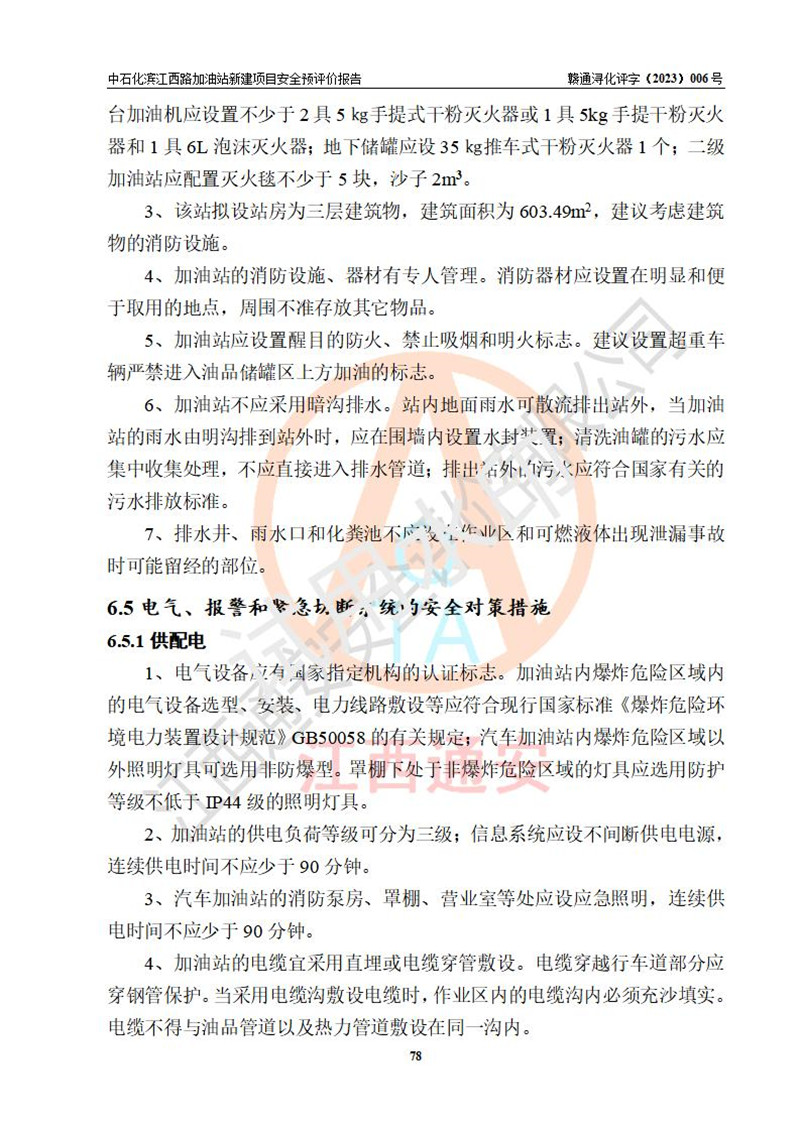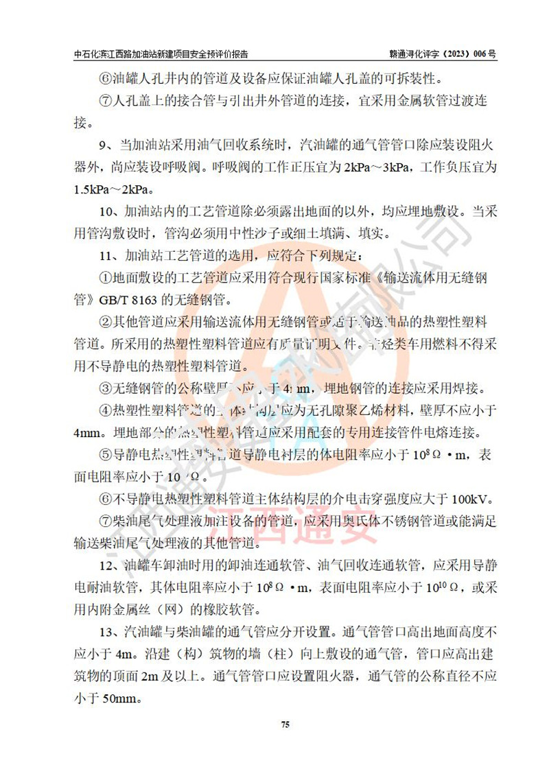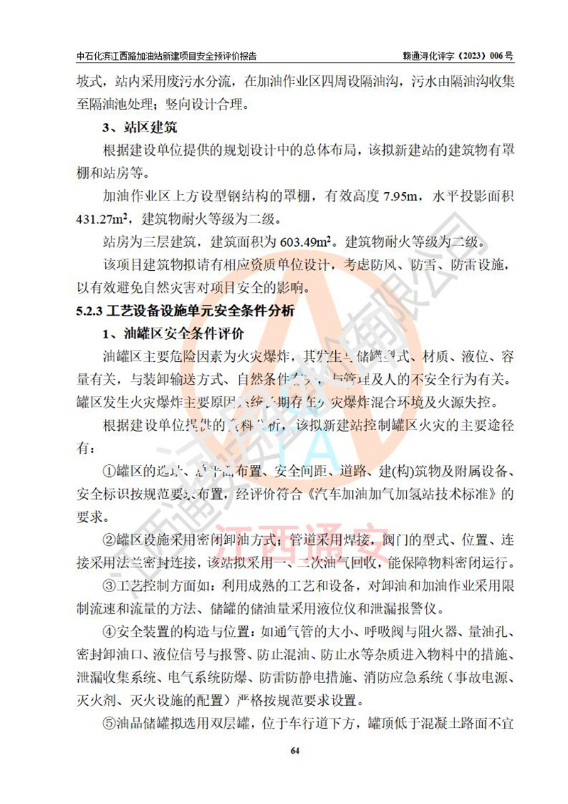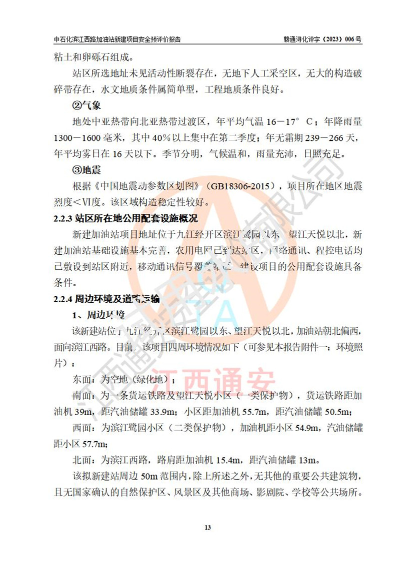 項(xiàng)目簡介 | 中國石化銷售股份有限公司江西九江潯陽石油分公司濱江西路加油站已取得企業(yè)名稱設(shè)立登記通知書,依據(jù)九江市商務(wù)局文件(九商務(wù)字【2023】6號),在九江經(jīng)開區(qū)濱江鷺園以東、望江天悅以北新建一座二級加油站。該站的建設(shè)用地已取得九江市自然資源局頒發(fā)的不動產(chǎn)權(quán)證書:贛(2022)九江市不動產(chǎn)權(quán)第0088347號。 擬新建加油站總用地面積為2727.04m2,站內(nèi)擬設(shè)3臺6槍潛油泵加油機(jī)及配套的工藝管線,擬設(shè)SF油品儲罐5臺,其中30m3的0#柴油儲罐1臺、30m3的92#汽油儲罐2臺、30m3的95#汽油儲罐1臺、30m3的98#汽油儲罐1臺,油罐總?cè)莘e為150m3(折算成汽油容積為135m3),按現(xiàn)行的《汽車加油加氣加氫站技術(shù)標(biāo)準(zhǔn)》對加油站的等級劃分,屬二級加油站。 | |||