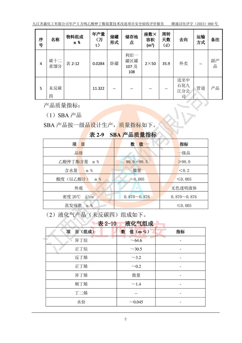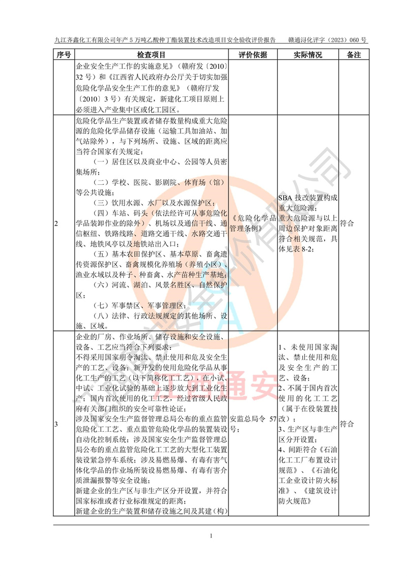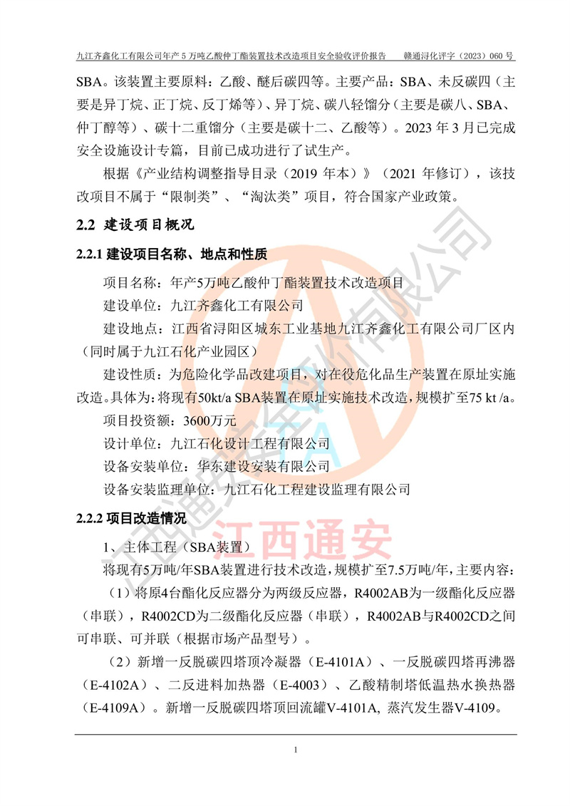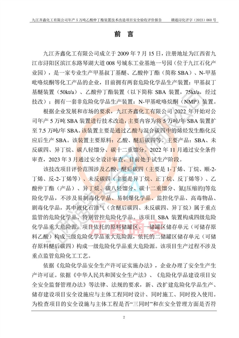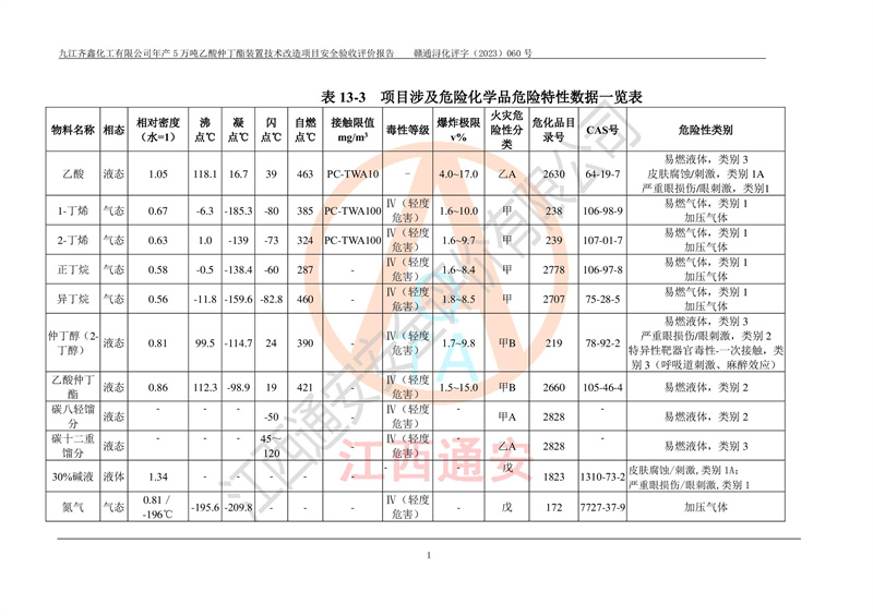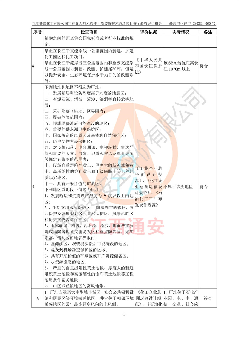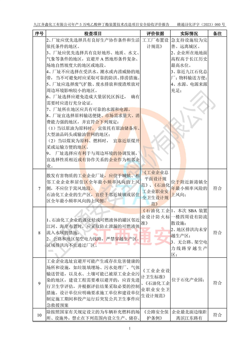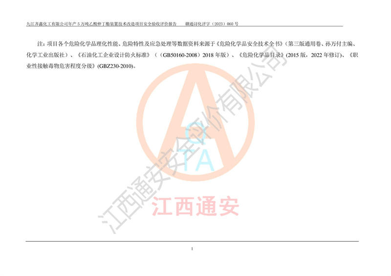 評(píng)價(jià)報(bào)告名稱 | 九江齊鑫化工有限公司年產(chǎn)5萬噸乙酸仲丁酯裝置技術(shù)改造項(xiàng)目安全驗(yàn)收評(píng)價(jià)報(bào)告 | ||||