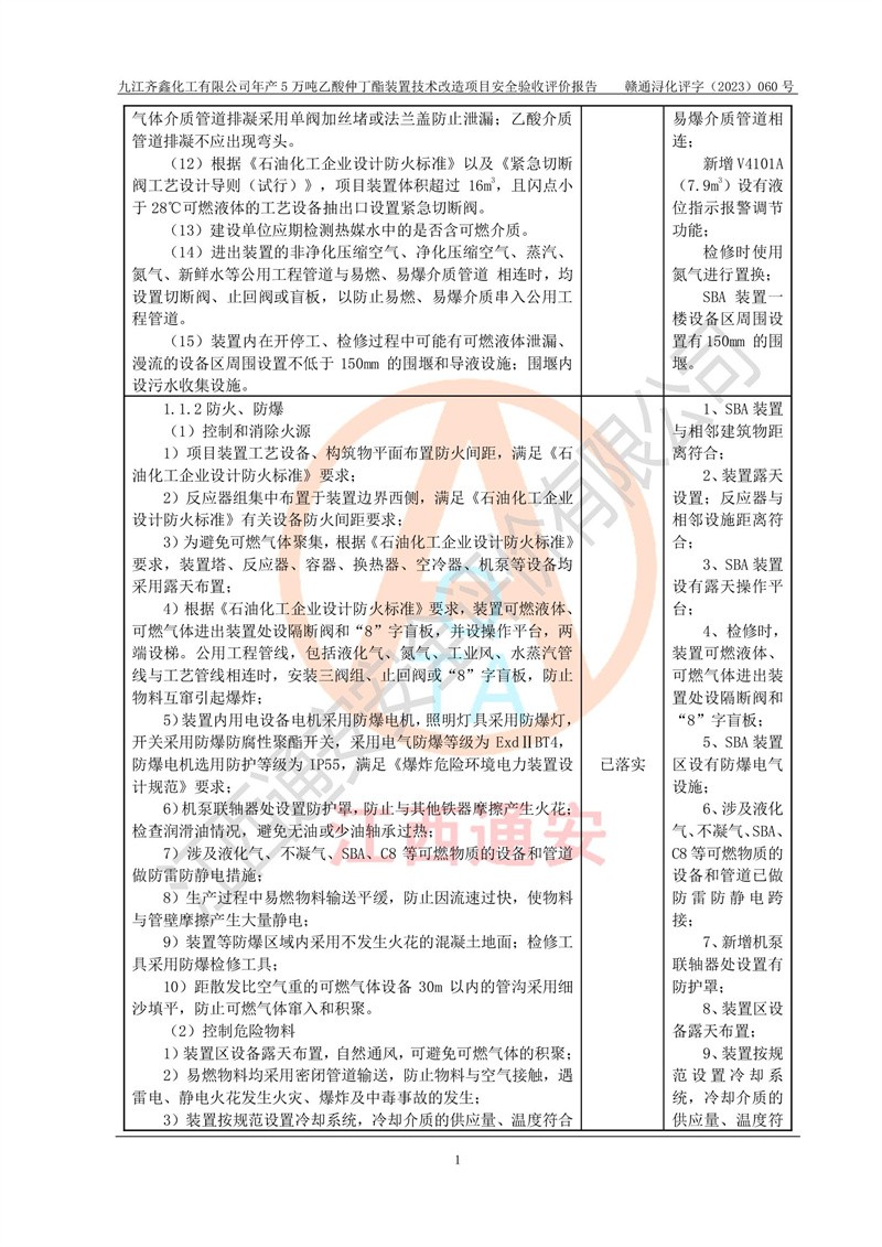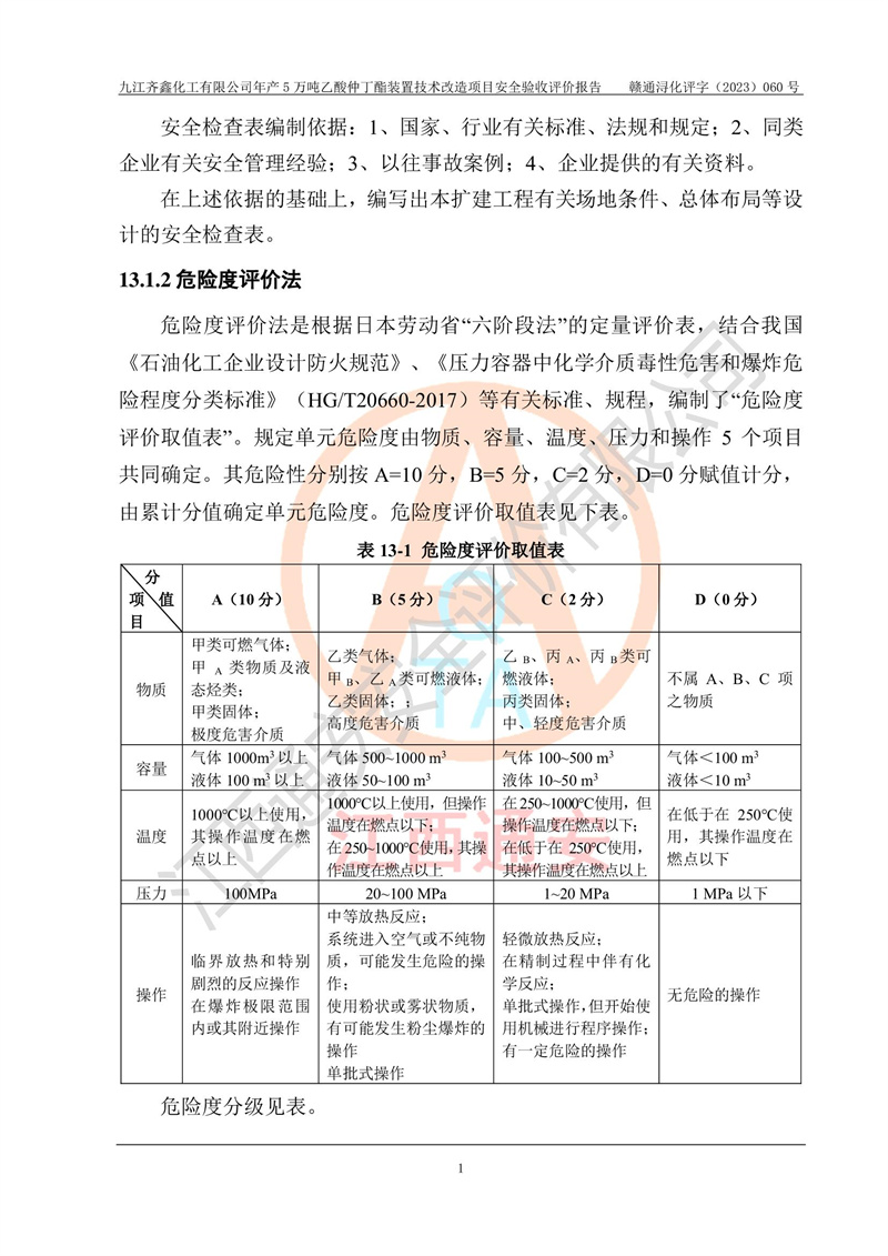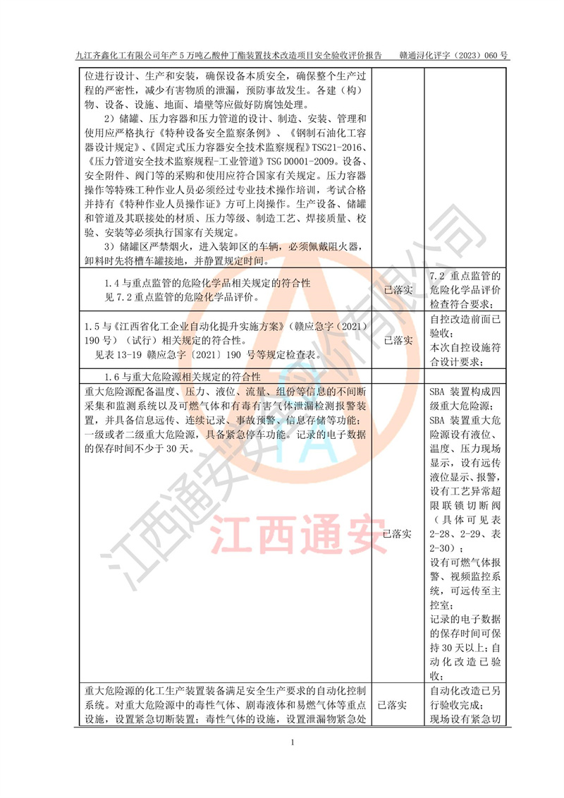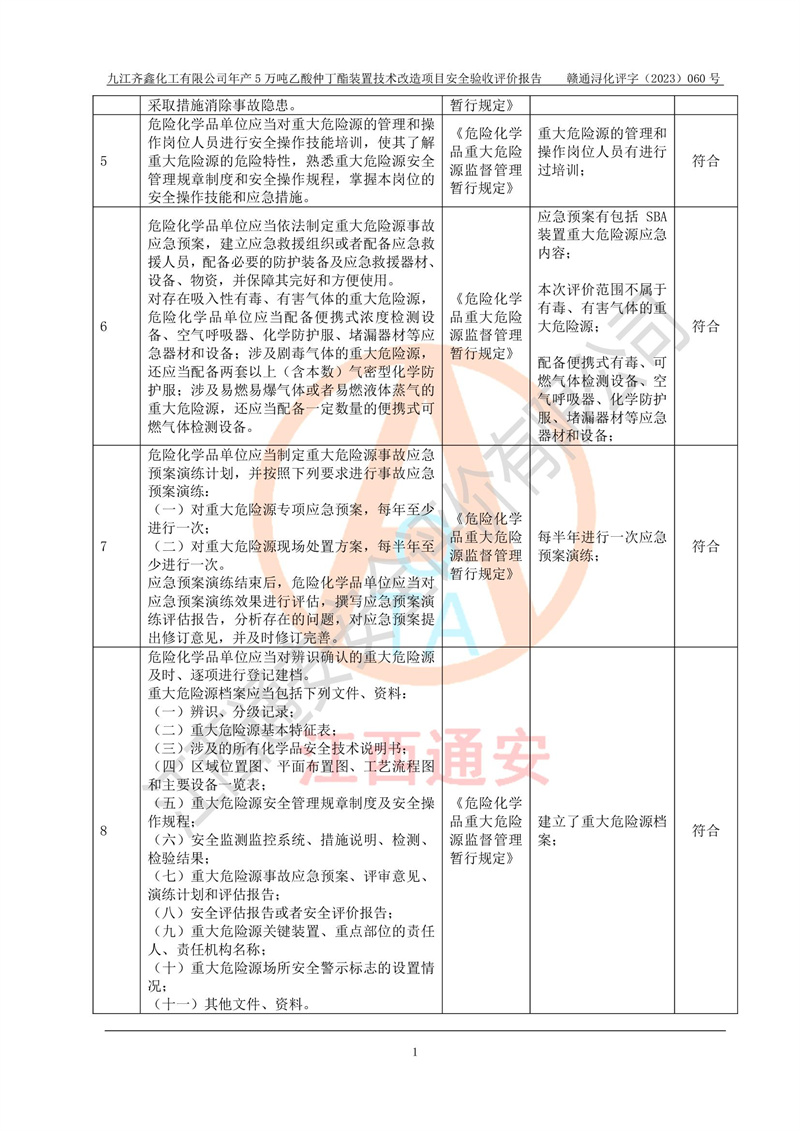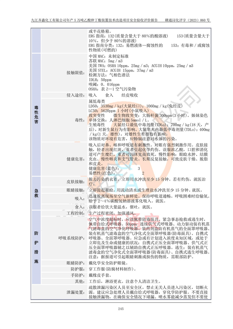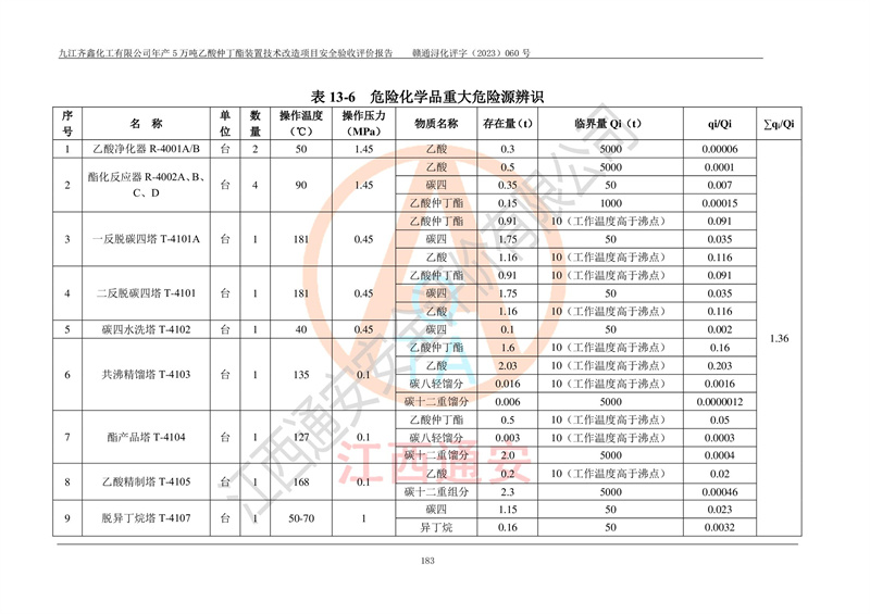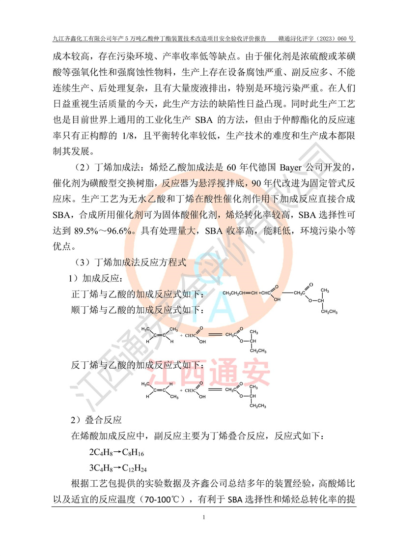 評(píng)價(jià)報(bào)告名稱 | 九江齊鑫化工有限公司年產(chǎn)5萬噸乙酸仲丁酯裝置技術(shù)改造項(xiàng)目安全驗(yàn)收評(píng)價(jià)報(bào)告 | ||||