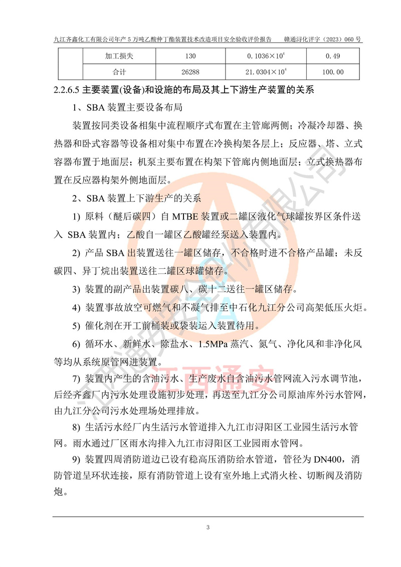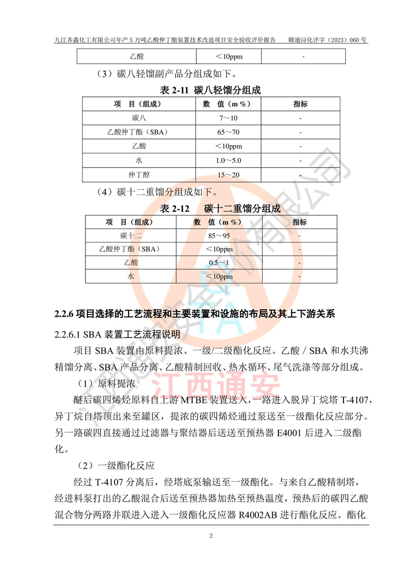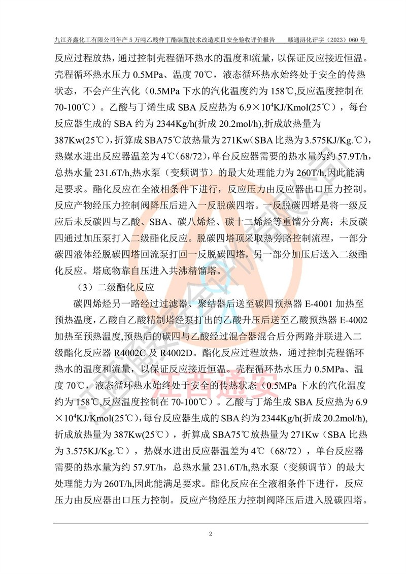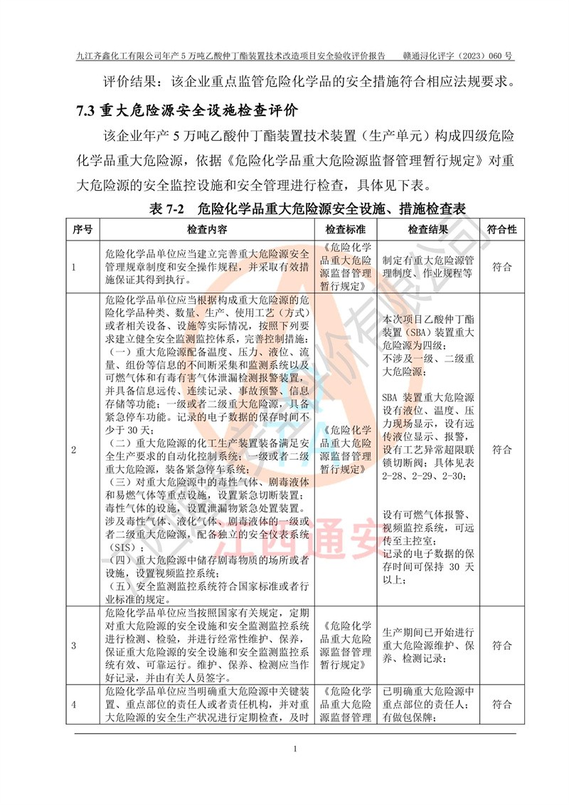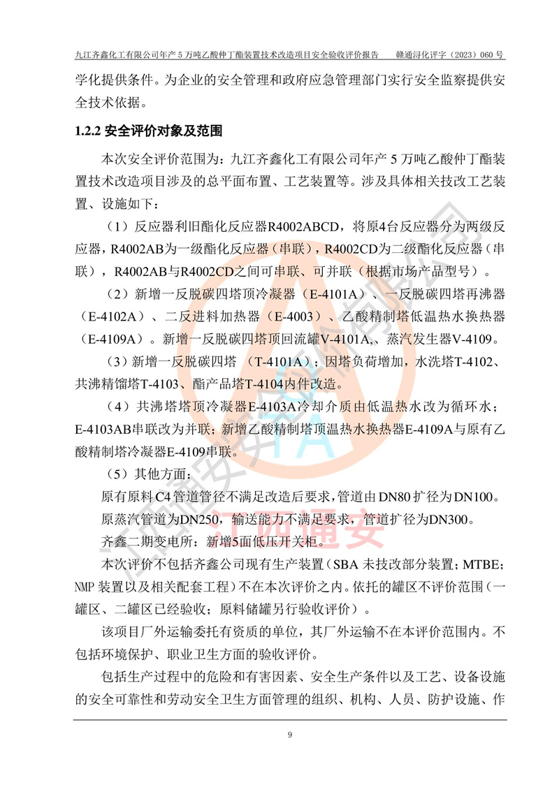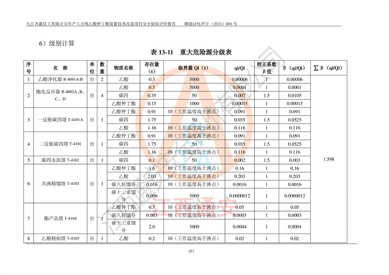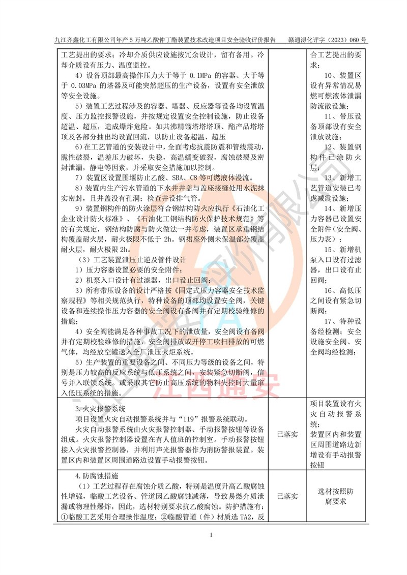 評(píng)價(jià)報(bào)告名稱 | 九江齊鑫化工有限公司年產(chǎn)5萬噸乙酸仲丁酯裝置技術(shù)改造項(xiàng)目安全驗(yàn)收評(píng)價(jià)報(bào)告 | ||||