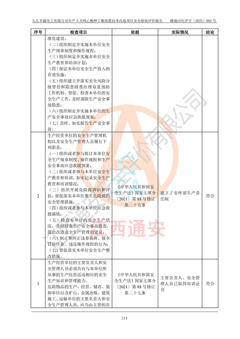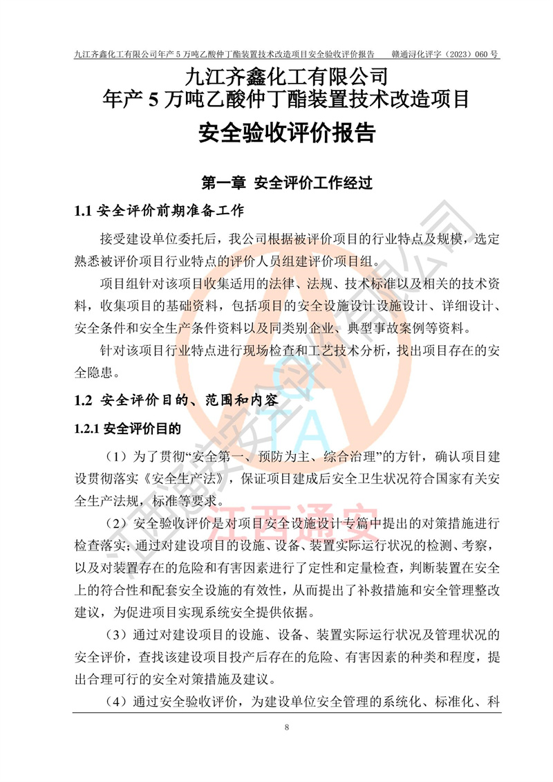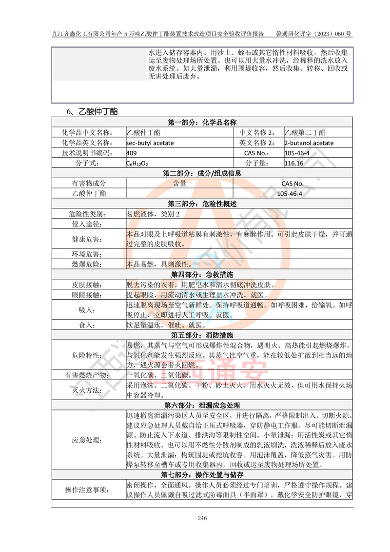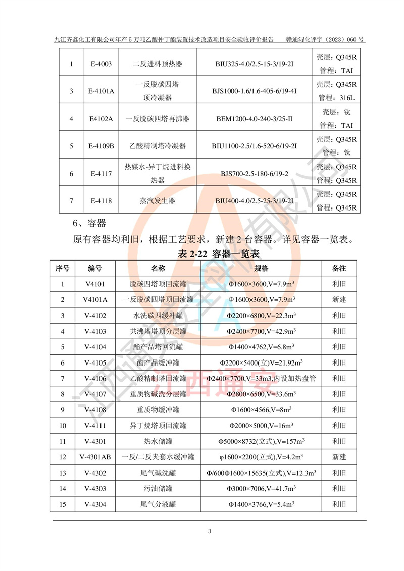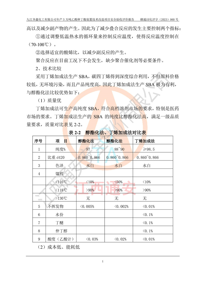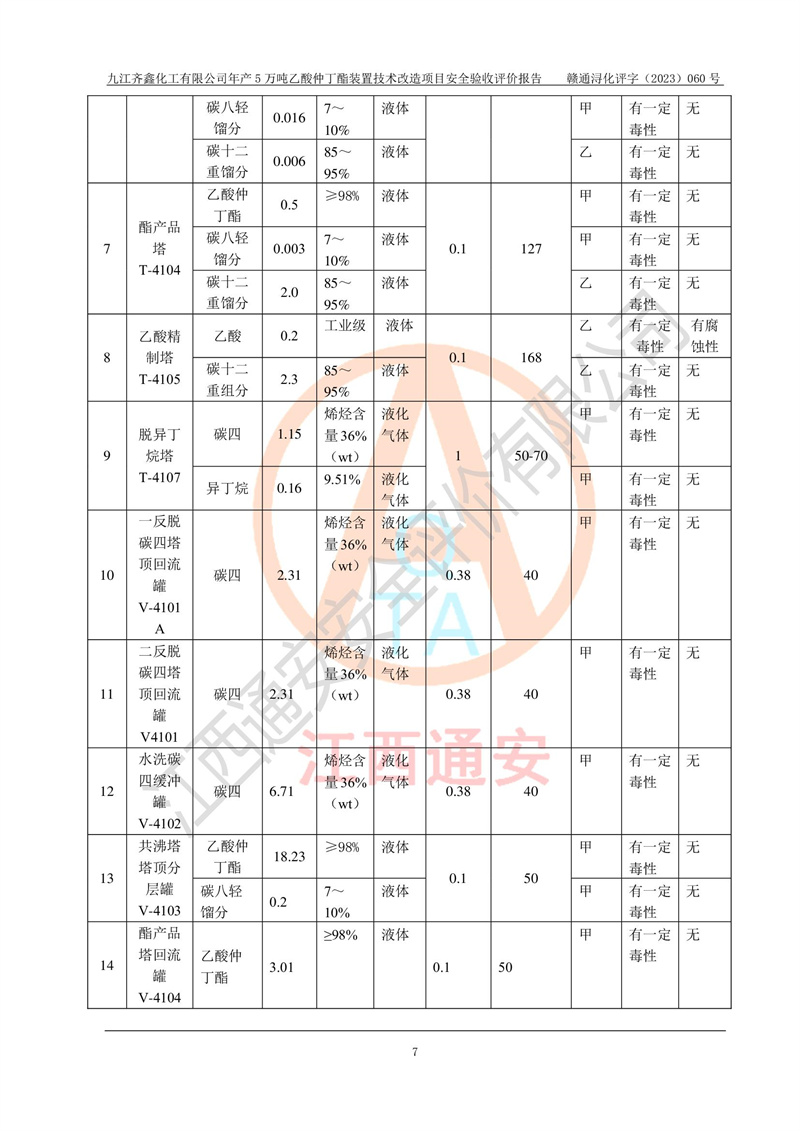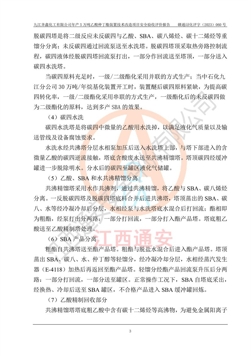 評(píng)價(jià)報(bào)告名稱 | 九江齊鑫化工有限公司年產(chǎn)5萬噸乙酸仲丁酯裝置技術(shù)改造項(xiàng)目安全驗(yàn)收評(píng)價(jià)報(bào)告 | ||||