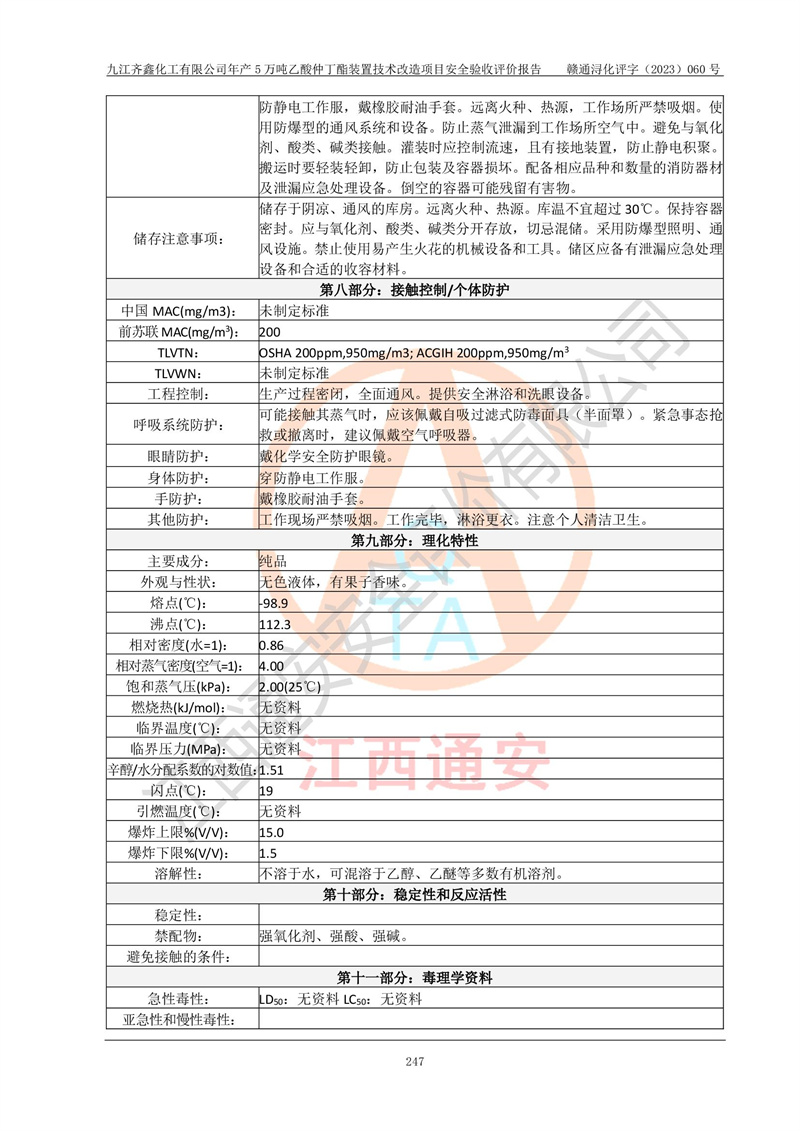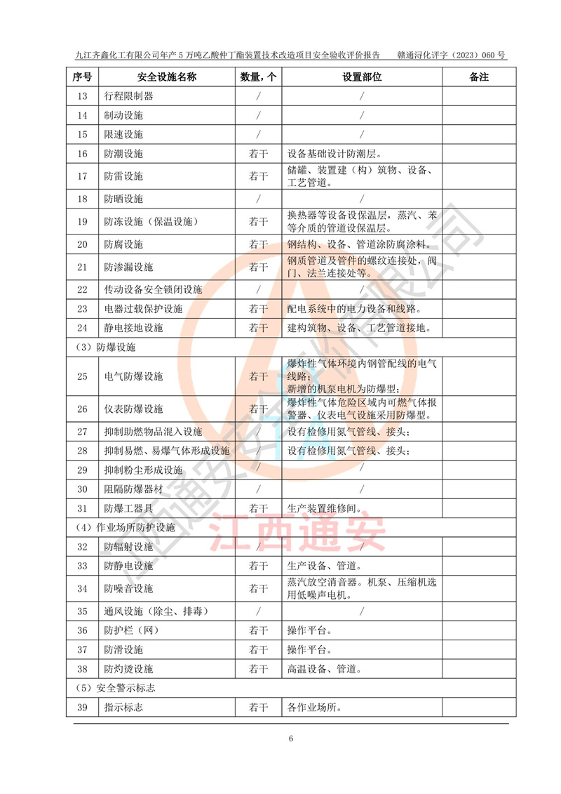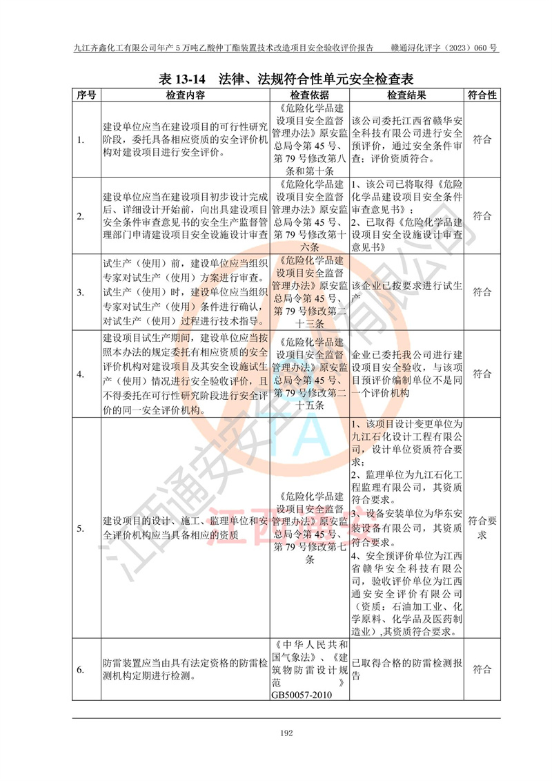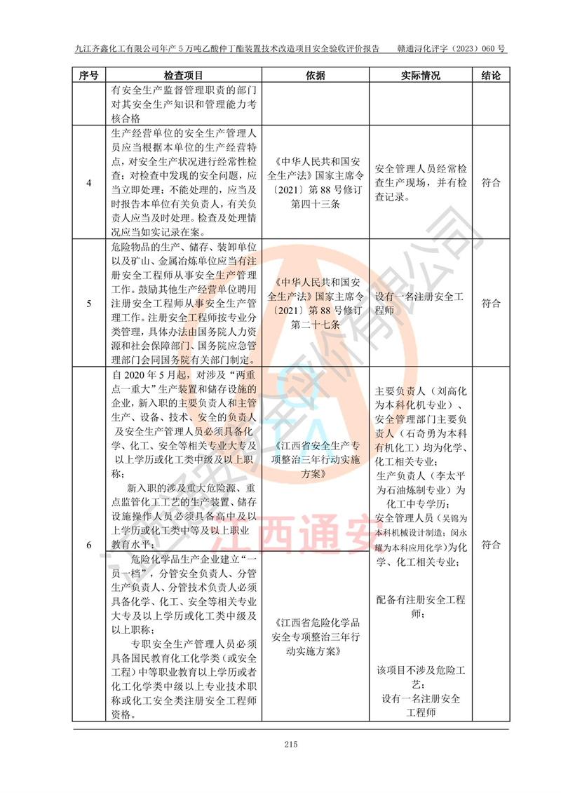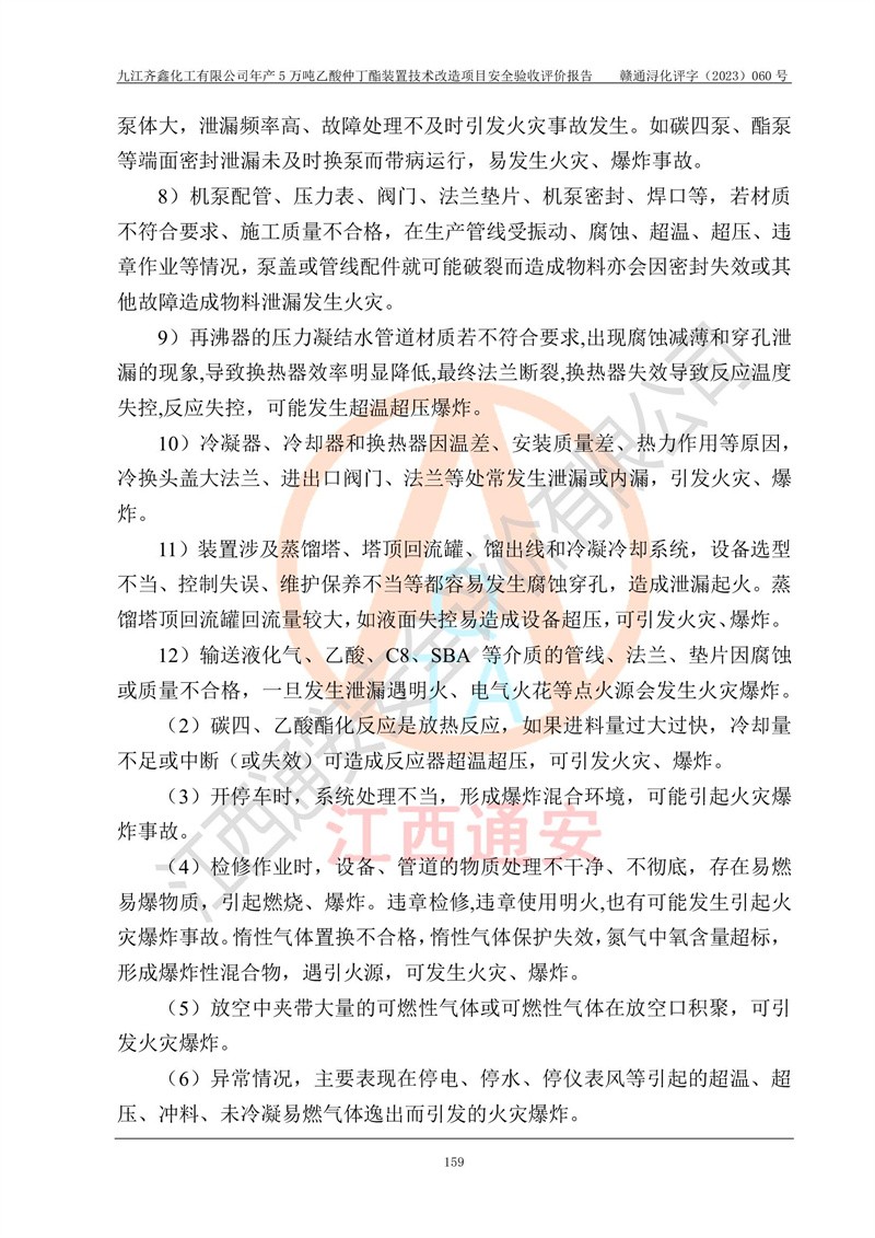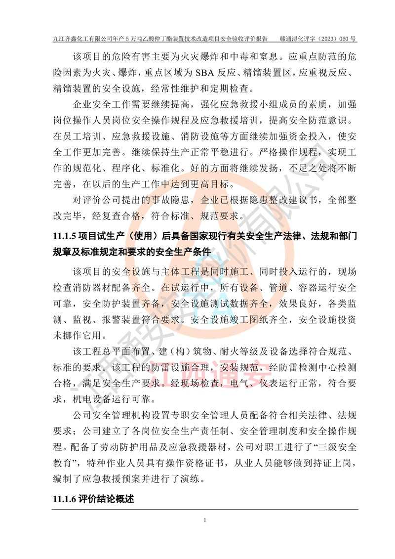 評(píng)價(jià)報(bào)告名稱 | 九江齊鑫化工有限公司年產(chǎn)5萬噸乙酸仲丁酯裝置技術(shù)改造項(xiàng)目安全驗(yàn)收評(píng)價(jià)報(bào)告 | ||||