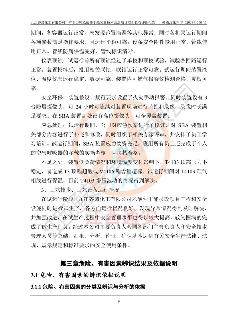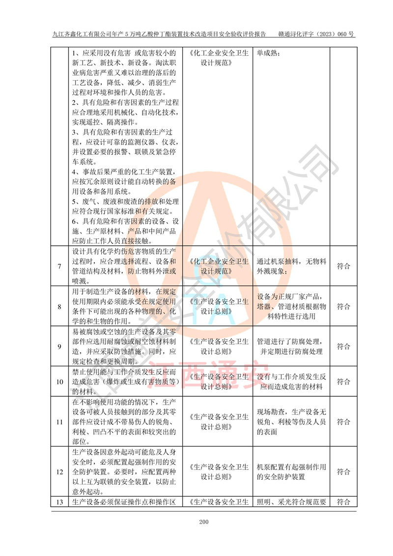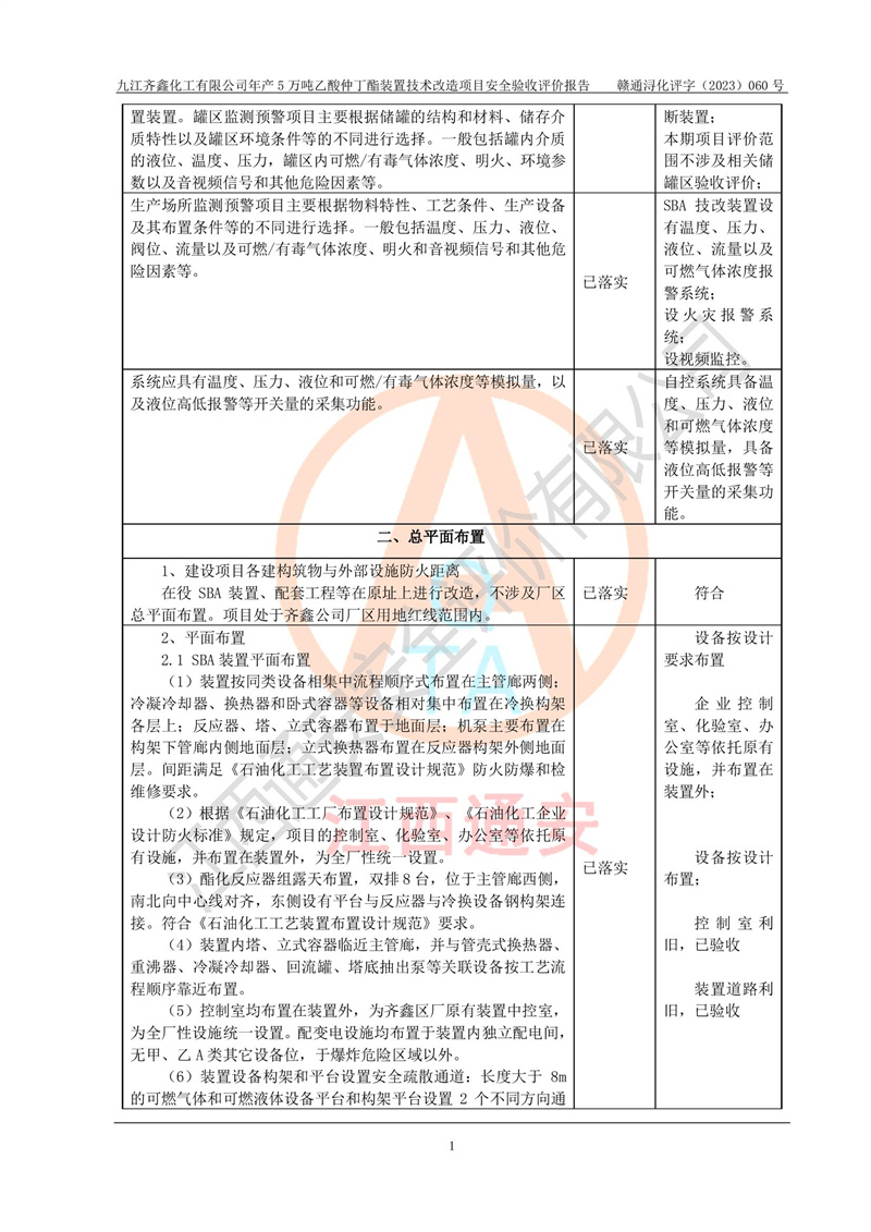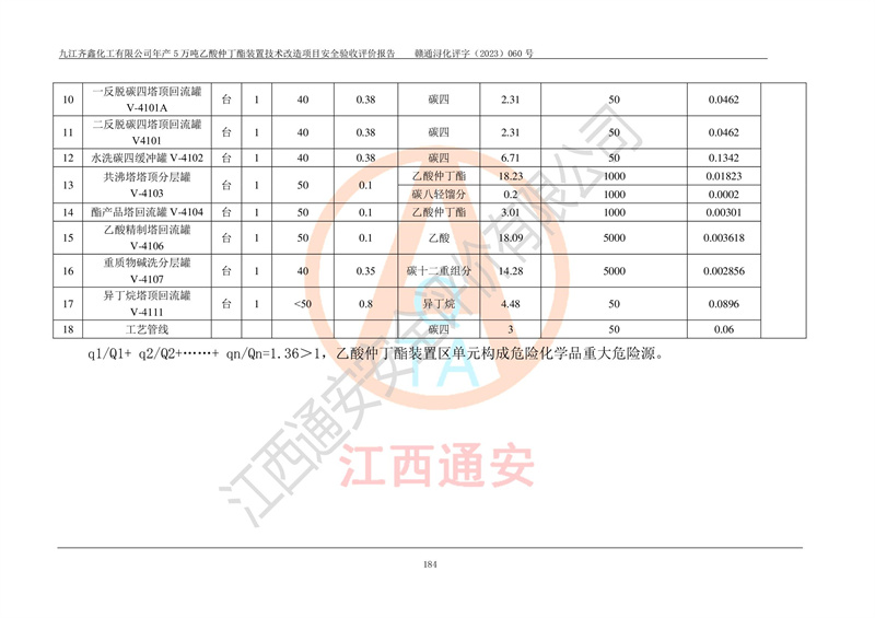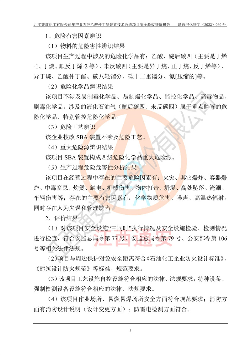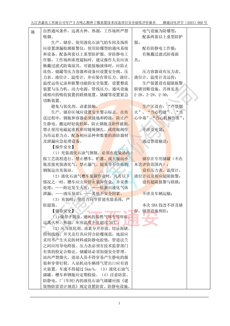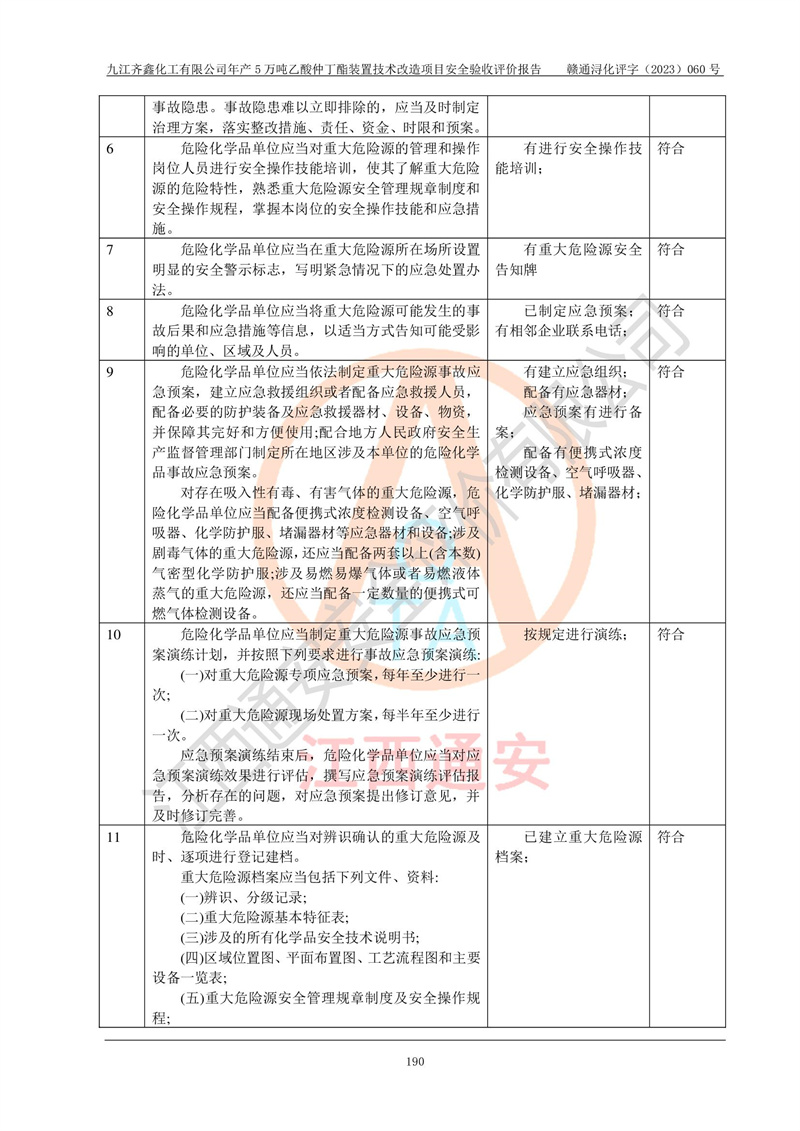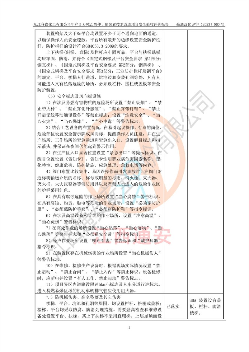 評(píng)價(jià)報(bào)告名稱 | 九江齊鑫化工有限公司年產(chǎn)5萬噸乙酸仲丁酯裝置技術(shù)改造項(xiàng)目安全驗(yàn)收評(píng)價(jià)報(bào)告 | ||||