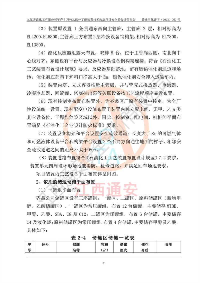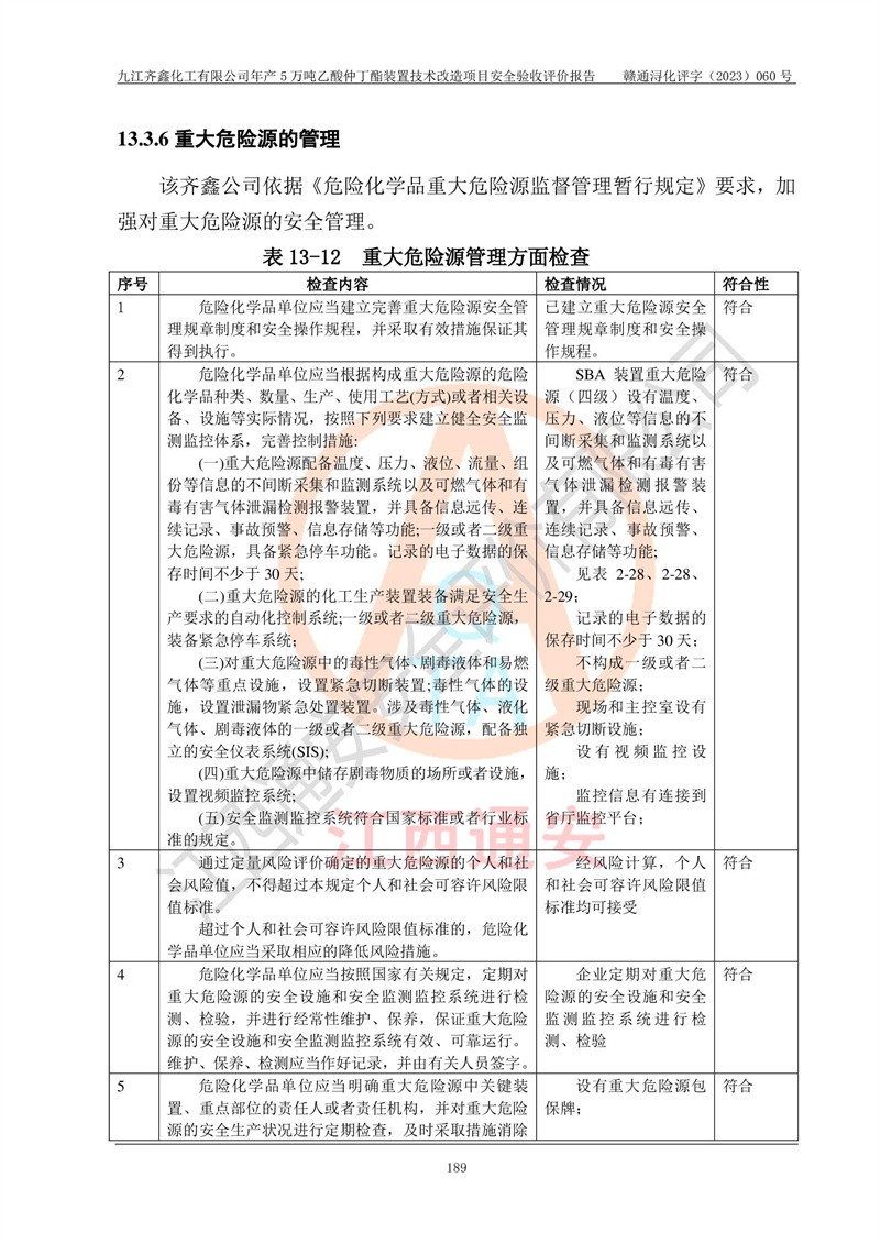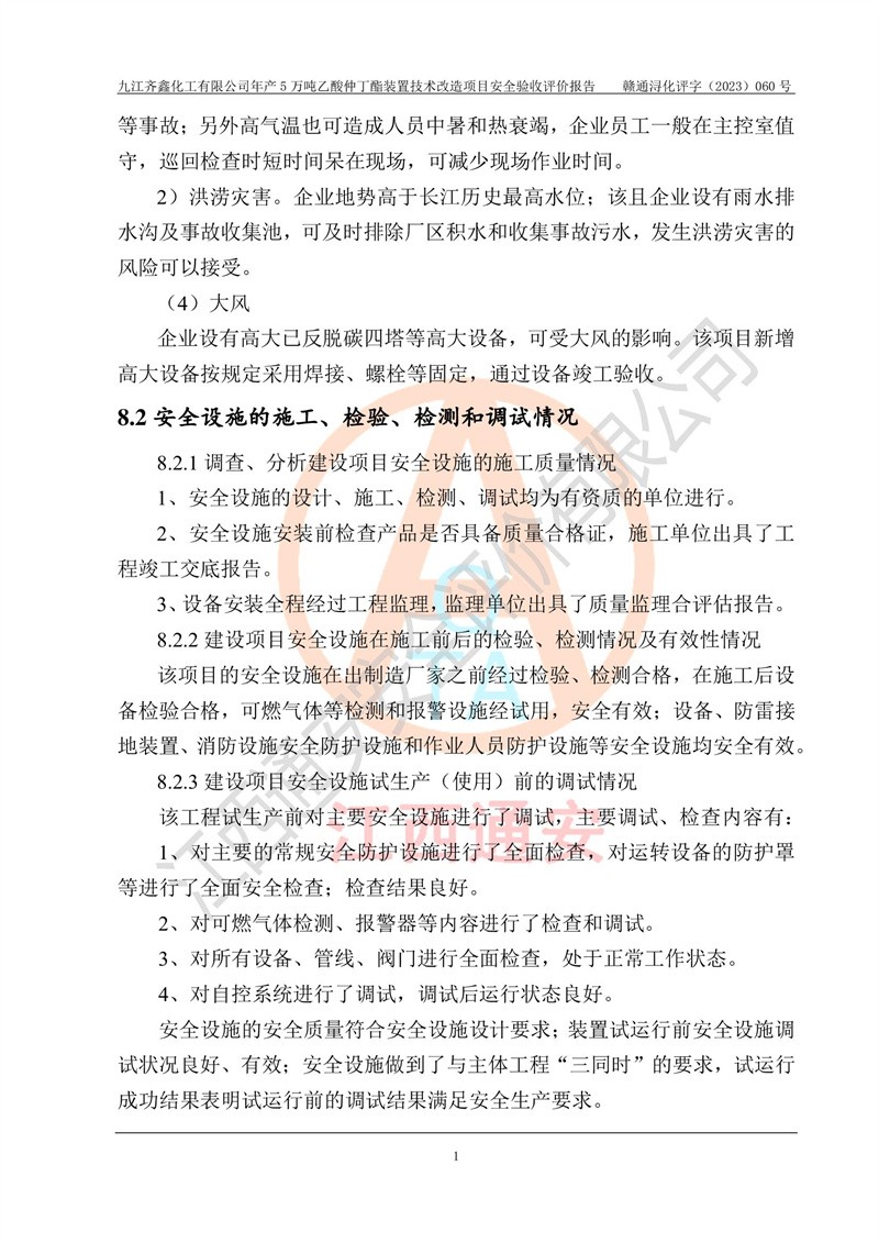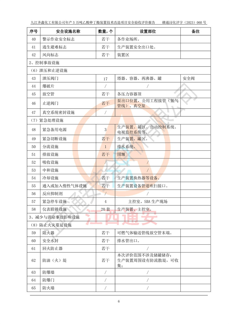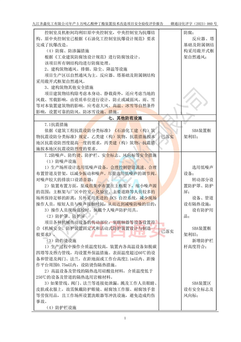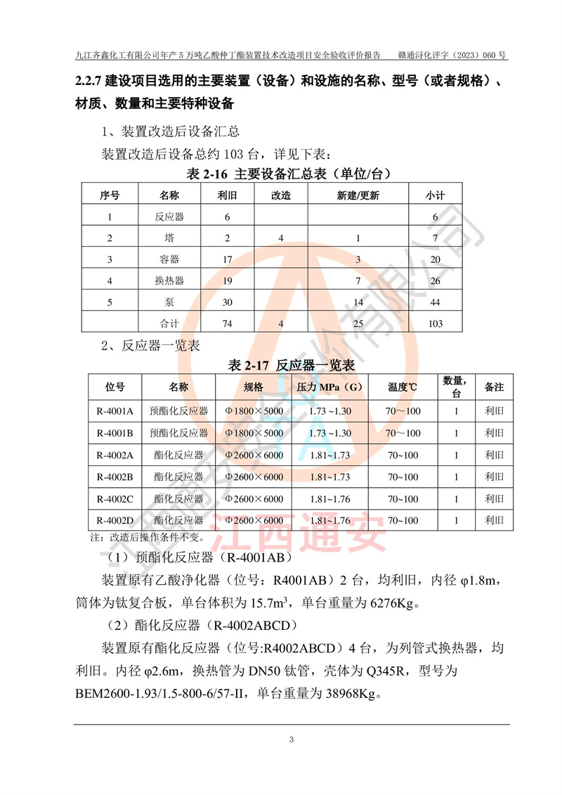 評(píng)價(jià)報(bào)告名稱 | 九江齊鑫化工有限公司年產(chǎn)5萬噸乙酸仲丁酯裝置技術(shù)改造項(xiàng)目安全驗(yàn)收評(píng)價(jià)報(bào)告 | ||||