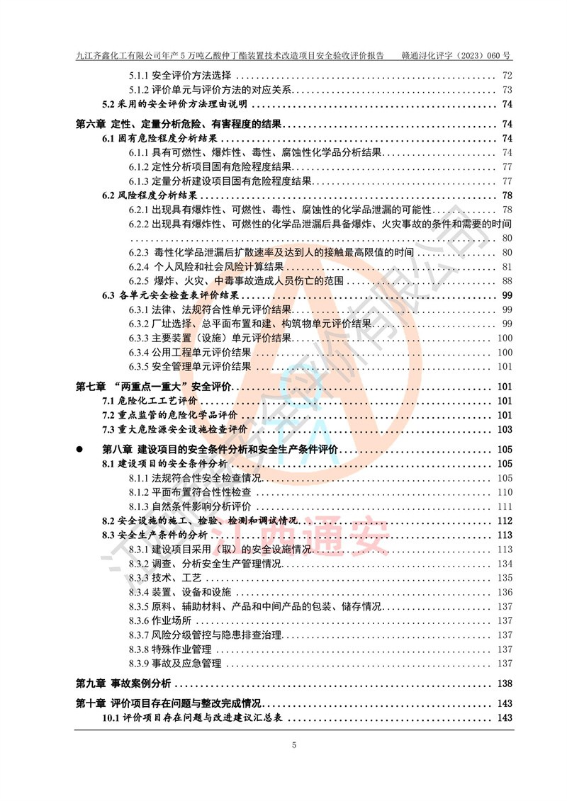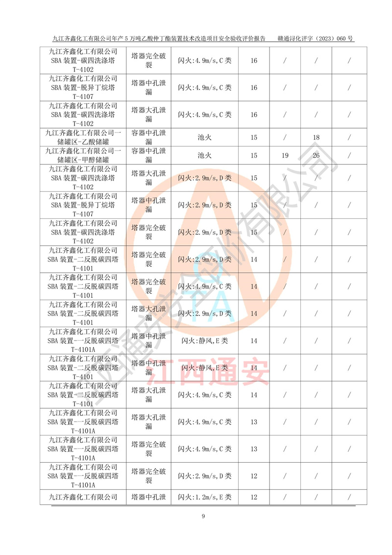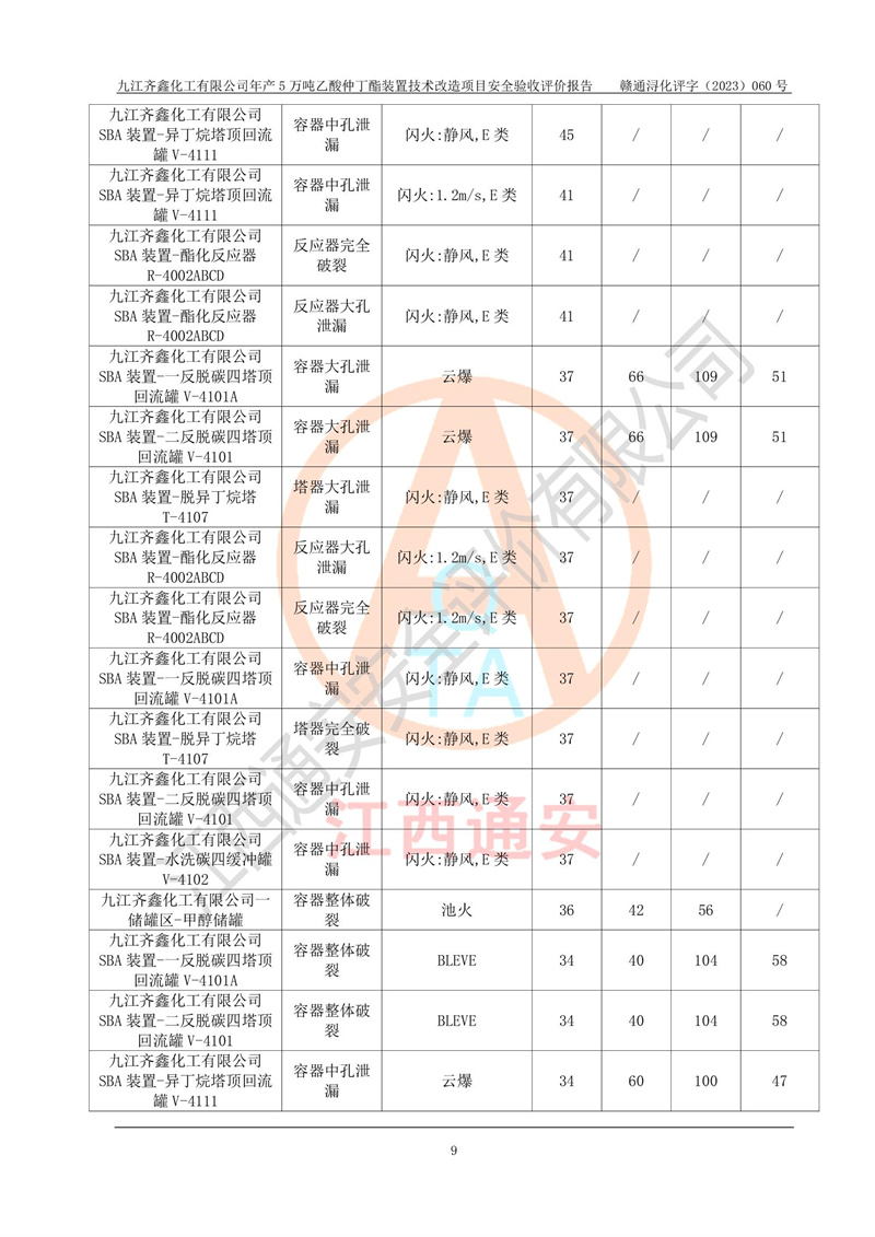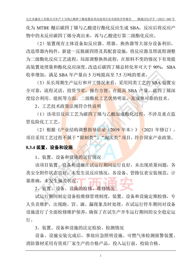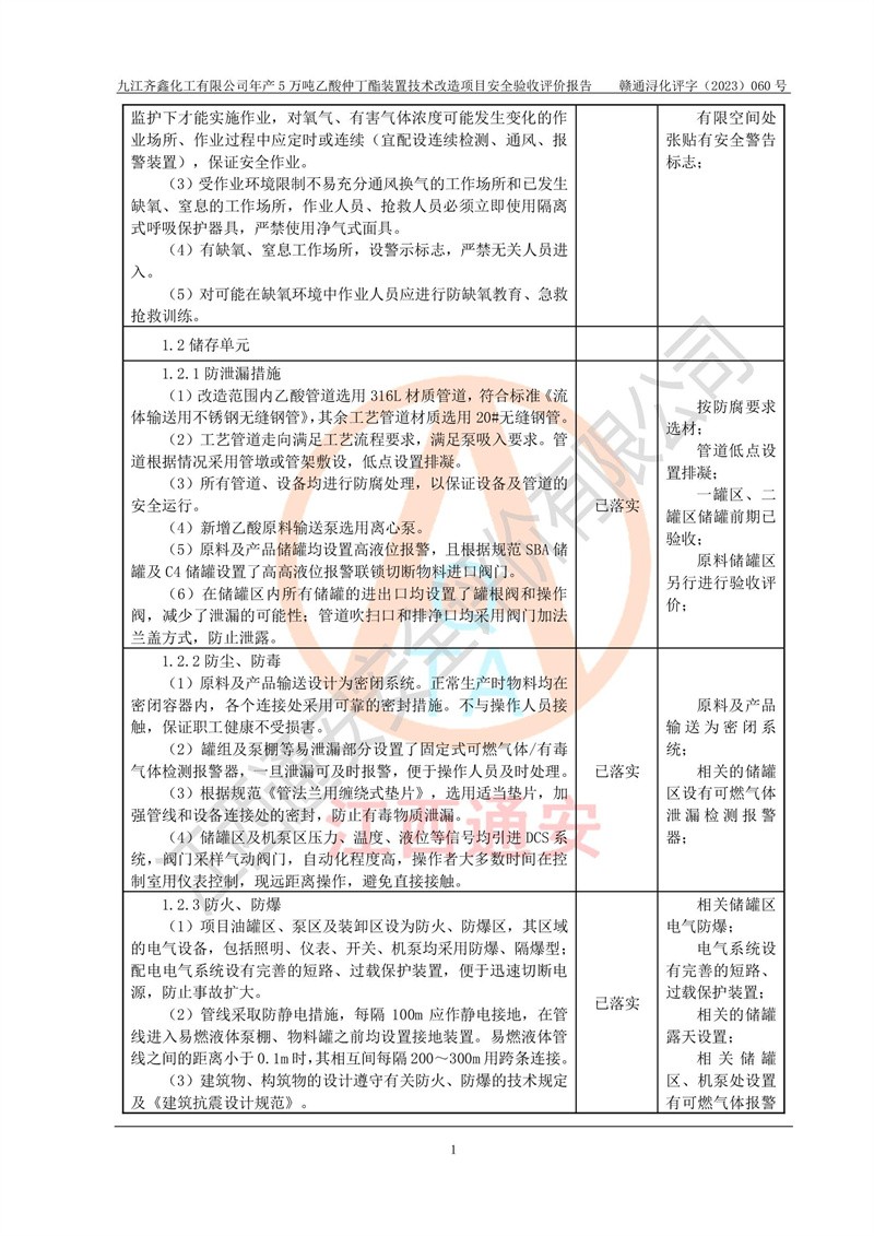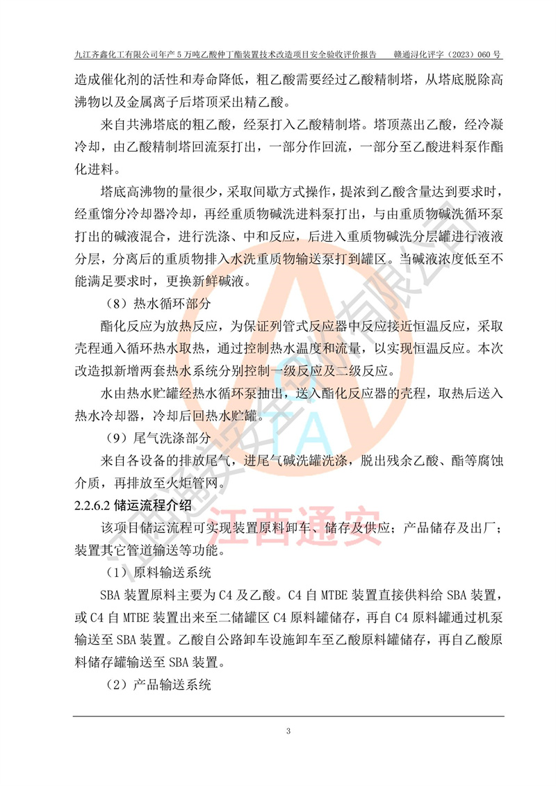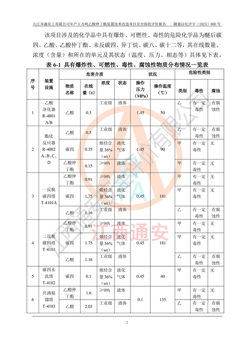 評(píng)價(jià)報(bào)告名稱 | 九江齊鑫化工有限公司年產(chǎn)5萬噸乙酸仲丁酯裝置技術(shù)改造項(xiàng)目安全驗(yàn)收評(píng)價(jià)報(bào)告 | ||||