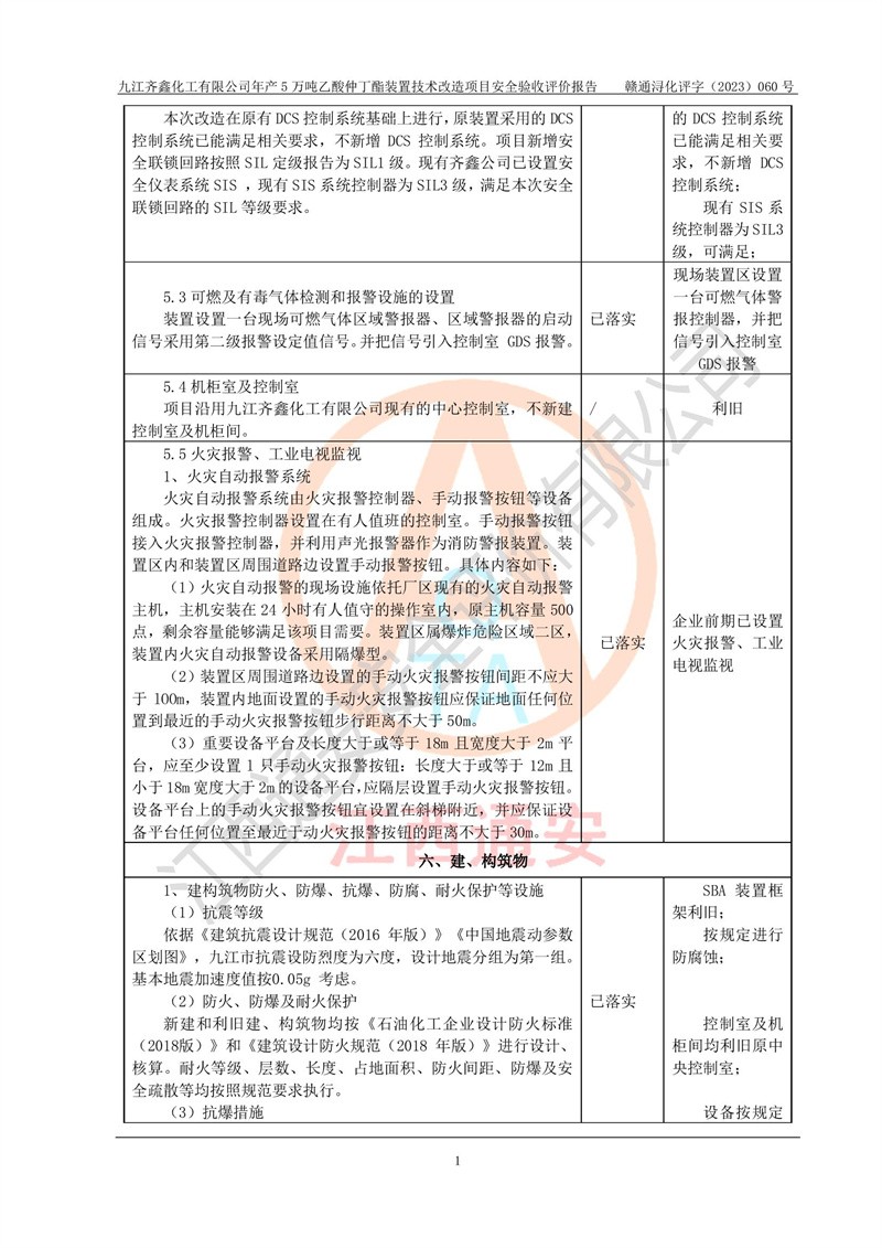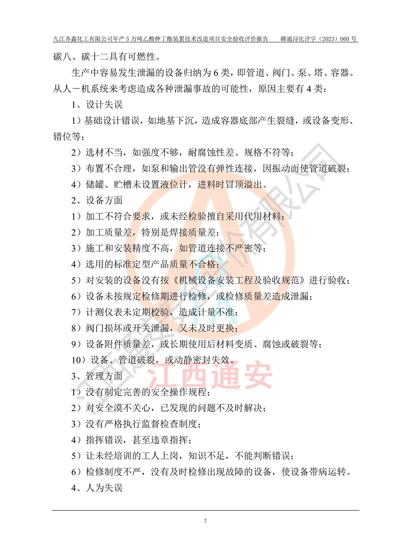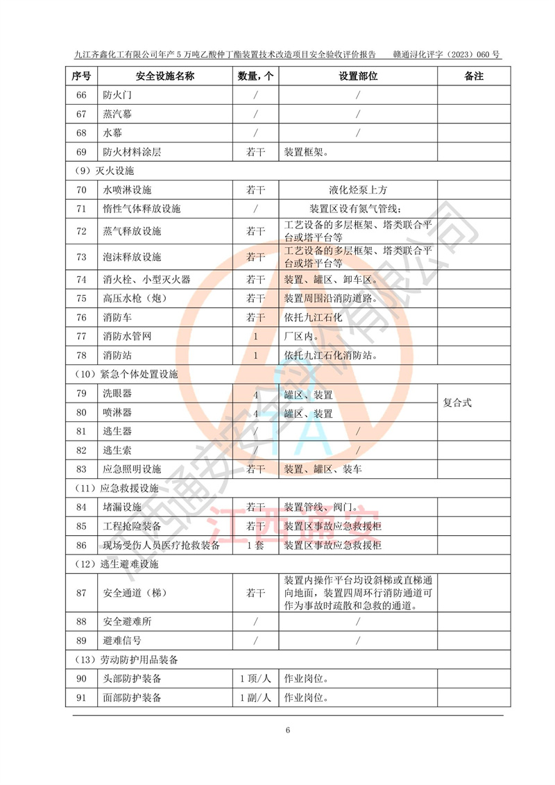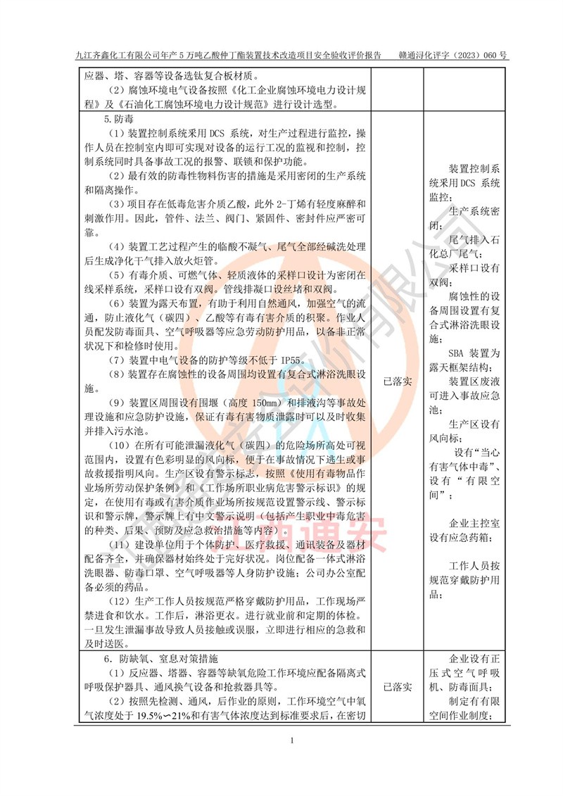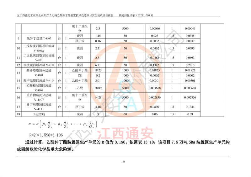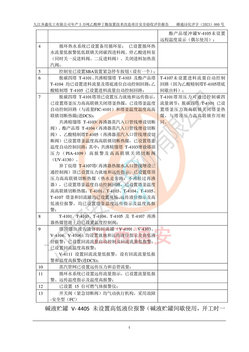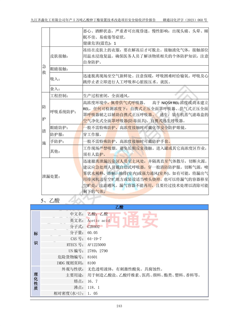 評(píng)價(jià)報(bào)告名稱 | 九江齊鑫化工有限公司年產(chǎn)5萬噸乙酸仲丁酯裝置技術(shù)改造項(xiàng)目安全驗(yàn)收評(píng)價(jià)報(bào)告 | ||||