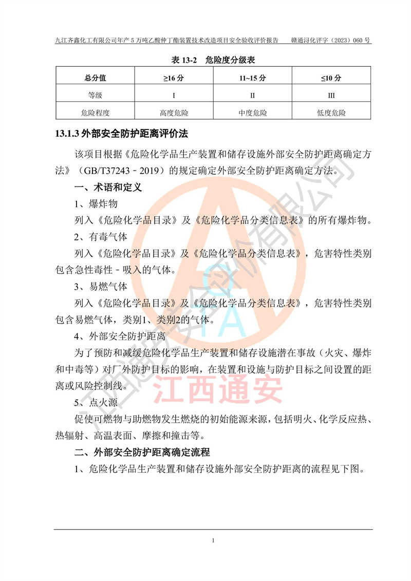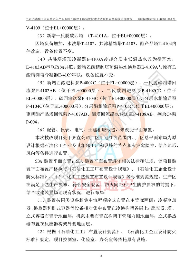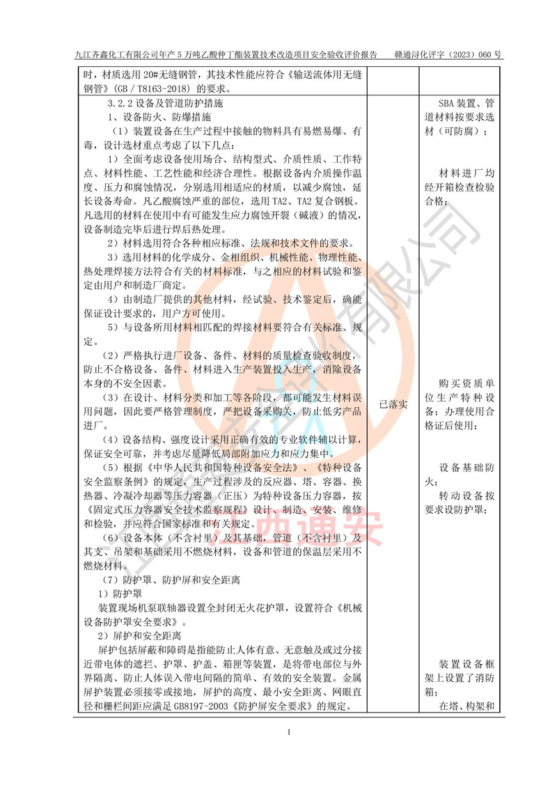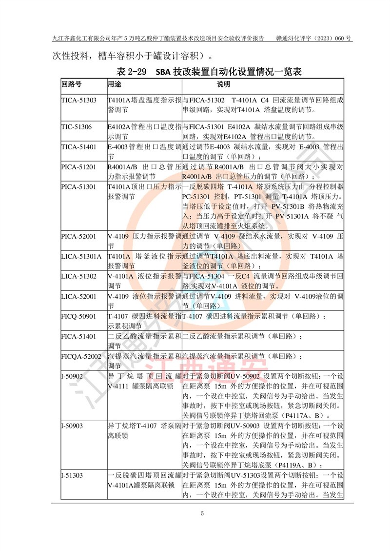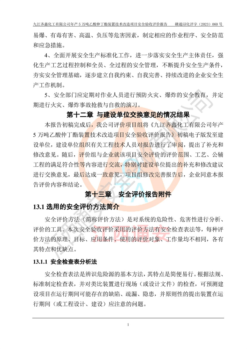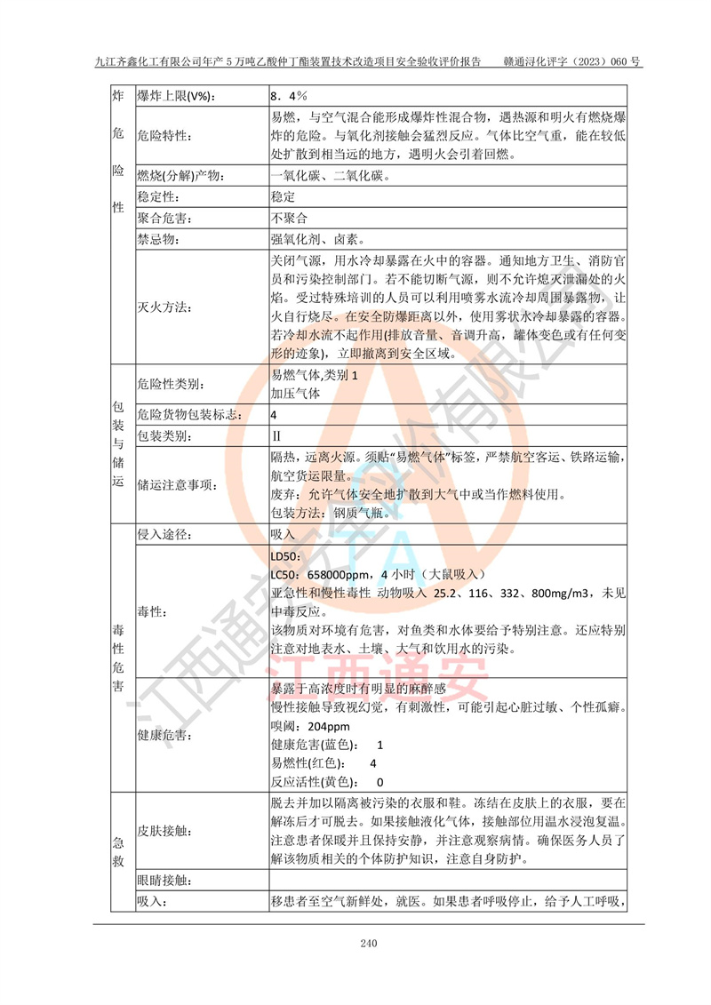 評(píng)價(jià)報(bào)告名稱 | 九江齊鑫化工有限公司年產(chǎn)5萬噸乙酸仲丁酯裝置技術(shù)改造項(xiàng)目安全驗(yàn)收評(píng)價(jià)報(bào)告 | ||||