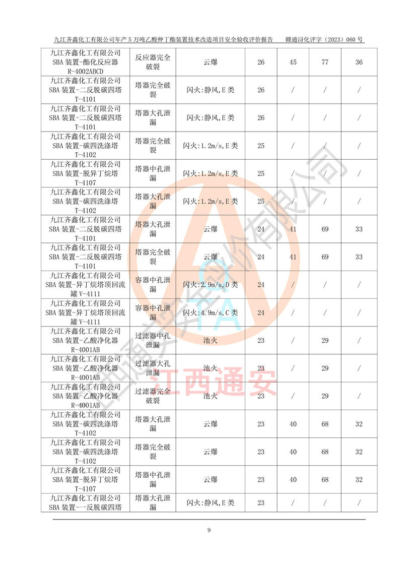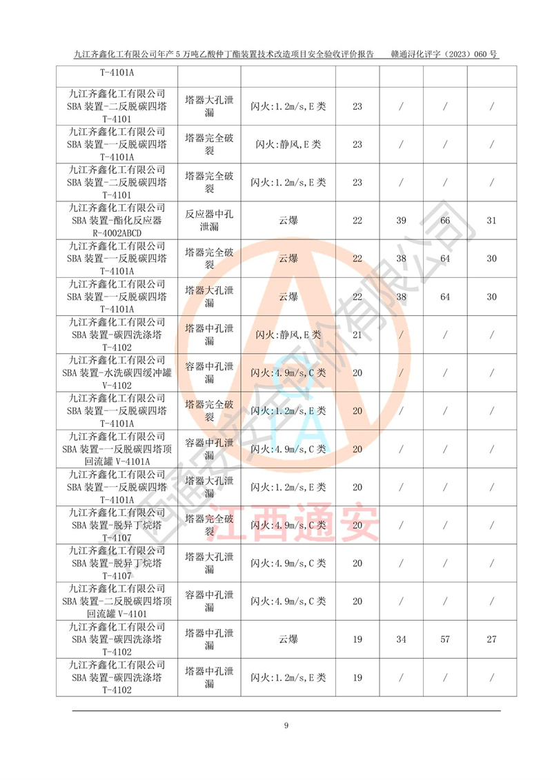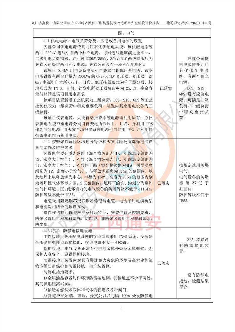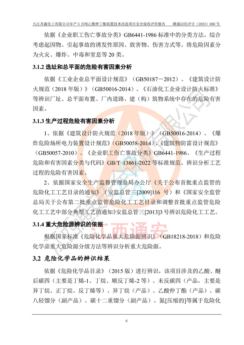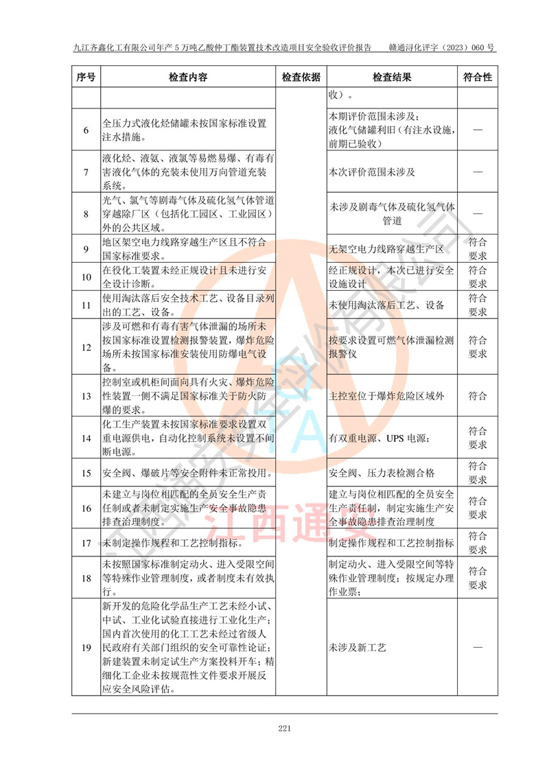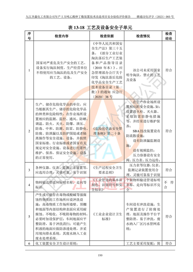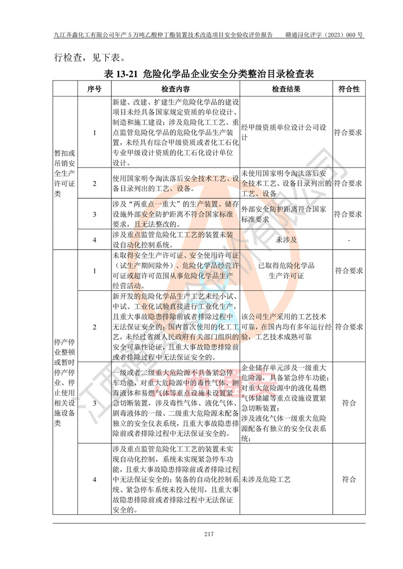 評(píng)價(jià)報(bào)告名稱 | 九江齊鑫化工有限公司年產(chǎn)5萬噸乙酸仲丁酯裝置技術(shù)改造項(xiàng)目安全驗(yàn)收評(píng)價(jià)報(bào)告 | ||||