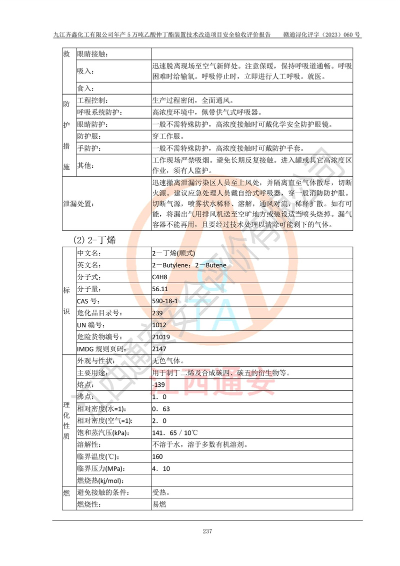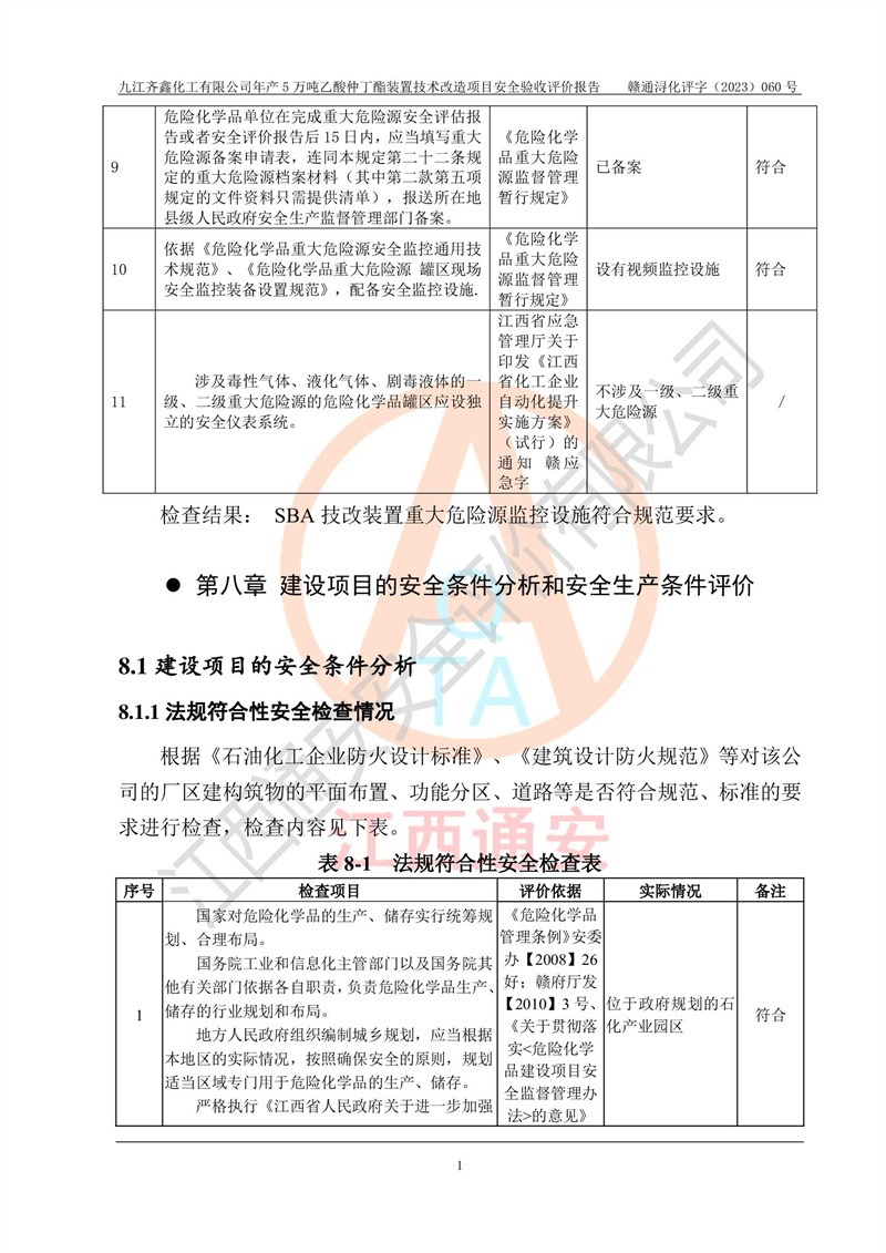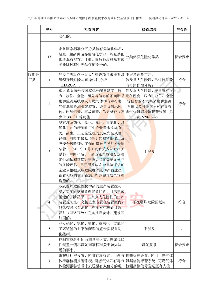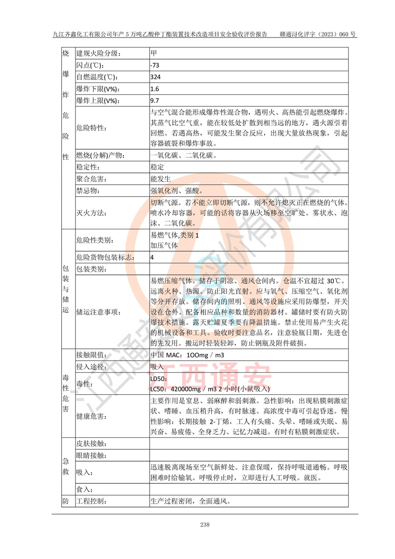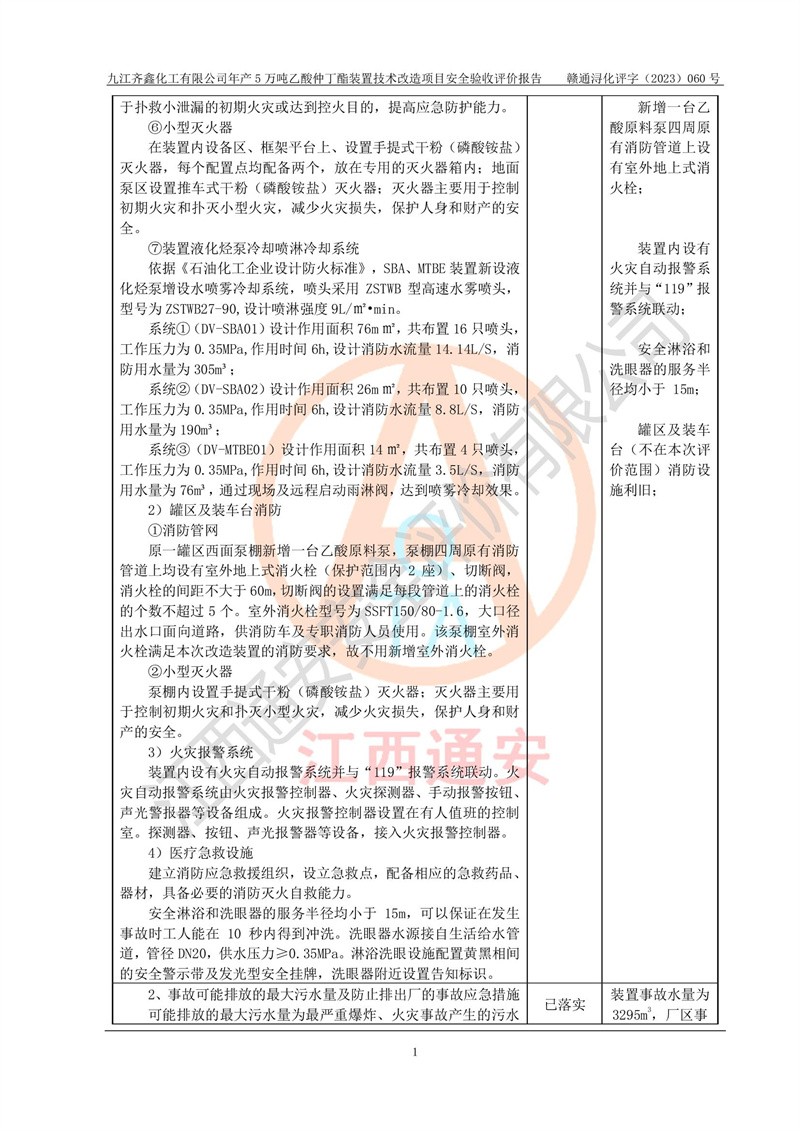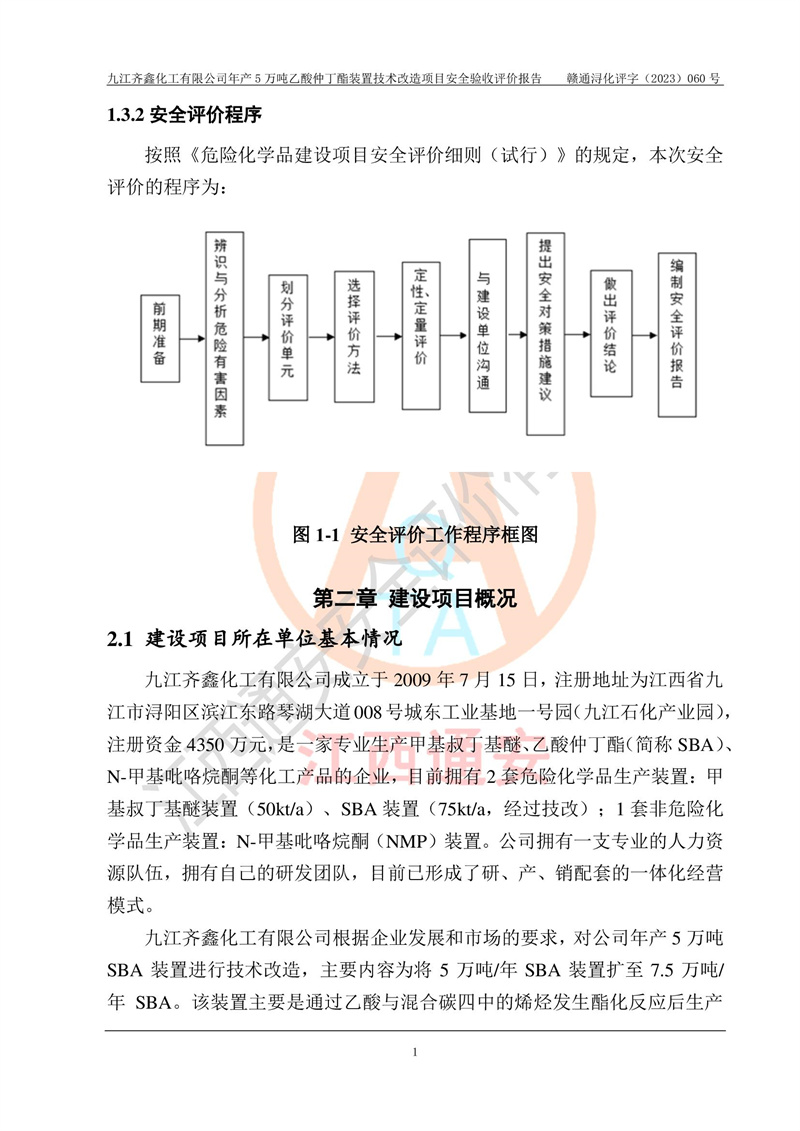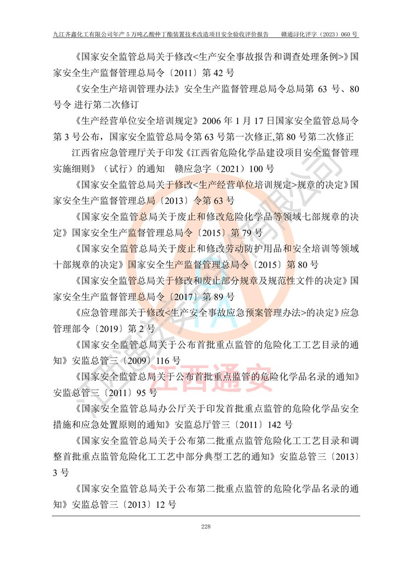 評(píng)價(jià)報(bào)告名稱 | 九江齊鑫化工有限公司年產(chǎn)5萬噸乙酸仲丁酯裝置技術(shù)改造項(xiàng)目安全驗(yàn)收評(píng)價(jià)報(bào)告 | ||||